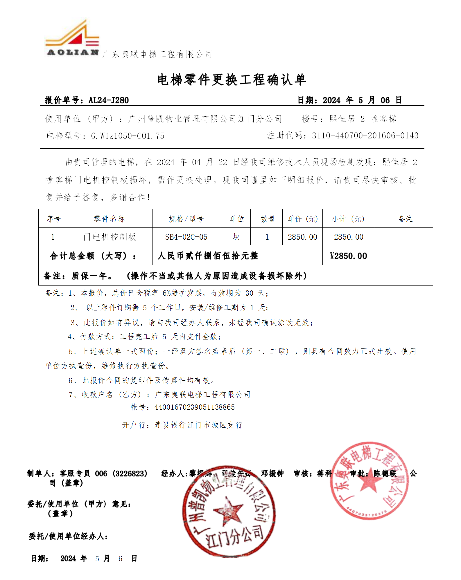 <td VALIGN="top" VALUES="" STYLE="border-width:0" BINDTYPE="0" ROWSPAN="19" COLSPAN="7" DATASOURCE="投票结果" ><font style="font-size:14pt;"><p style="white-space: normal; font-family: 宋体; line-height: 1.75em;">江海区君汇熙庭江海区君汇熙庭熙佳居2幢全体业主:</p><p style="white-space: normal; font-family: 宋体; line-height: 1.75em; text-indent: 2em;">本小区关于江海区君汇熙庭熙佳居 2 栋电梯更换门电机控制板的投票已表决结束,询异时间从2024年08月01日开始,投票询异公示期间,业主可通过微信查询自己的表决情况或可凭身份证件申请查询自己的表决情况;如公示的业主表决情况与查询的本人表决意见不一致的,可以以书面形式向投票组织机构申诉,投票组织机构予以纠正并重新公示表决结果。异议提出人对投票组织机构的处理仍有异议的,可以向街道办事处(镇人民政府)反映处理,涉及住宅专项维修资金的,可向属地住宅专项维修资金管理中心反映处理。</p><p style="white-space: normal;"><br/></p><p style="white-space: normal; font-family: 宋体; line-height: 1.75em;"><strong>附件:</strong></p><p style="white-space: normal; font-family: 宋体; line-height: 1.75em;"><strong>一、投票范围</strong></p><p style="white-space: normal; font-family: 宋体; line-height: 1.75em; text-indent: 2em;">江海区君汇熙庭江海区君汇熙庭熙佳居2幢</p><p style="white-space: normal; font-family: 宋体; line-height: 1.75em; text-indent: 2em;">总人数(专有部分人数之和):115</p><p style="white-space: normal; font-family: 宋体; line-height: 1.75em; text-indent: 2em;"><span style="font-family: 宋体, SimSun;"><span style="font-family: 宋体; text-indent: 32px;"><span style="font-family: 宋体; text-indent: 32px;">总户数:115</span></span></span></p><p style="white-space: normal; font-family: 宋体; line-height: 1.75em; text-indent: 2em;">建筑物总面积(专有部分面积之和):9046.07㎡</p><p style="white-space: normal; font-family: 宋体; line-height: 1.75em;"><strong>二、询异公示起止时间</strong></p><p dir="ltr" style="white-space: normal; font-family: 宋体; line-height: 1.75em; text-indent: 2em;"><span style="text-indent: 36px;">2024年08月01日至2024年08月07日</span></p><p style="white-space: normal; font-family: 宋体; line-height: 1.75em;"><strong>三、投票详细描述</strong></p><p style="white-space: normal; font-family: 宋体; line-height: 1.75em; text-indent: 2em;"><p>本小区12幢的货梯日常运行时无反应,经检查,是由于客梯门电机控制板损坏,电梯不能正常运行,已过保修期。现需申请使用维修资金对12幢货梯进行维修,工程维修预算金额为2850元,项目最终费用以施工合同签订金额为准。维修费用的分摊标准为 按建筑面积分摊每平方约0.315元,详见公示附件。如业主手机不能正常通过微信投票,请联系物业公司进行线下纸质投票,物业电话:0750-3825113</p></p><p style="white-space: normal; font-family: 宋体; line-height: 1.75em;"><strong>四、计票规则</strong></p><p style="white-space: normal; font-family: 宋体; line-height: 1.75em; text-indent: 2em;">表决事项:使用建筑物及其附属设施的维修资金<br /><p style='text-align: left; font-family: 宋体; font-size: 16px; line-height: 1.75em; text-indent: 2em;'>计票规则:弃权票不并入其它项 未表决票不并入其它项</p></p><p style="white-space: normal; font-family: 宋体; line-height: 1.75em;"><strong>五、通过规则</strong></p><p style="white-space: normal; font-family: 宋体; line-height: 1.75em;"><strong><strong style="white-space: normal;"><span style="font-family: 宋体, SimSun;"> 根据《中华人民共和国民法典》第二百七十八条规定:业主共同决定事项,应当由专有部分面积占比三分之二以上的业主且人数占比三分之二以上的业主参与表决。</span></strong></strong></p><p style="white-space: normal; font-family: 宋体; line-height: 1.75em; text-indent: 2em;">表决事项:使用建筑物及其附属设施的维修资金<br /><p style='text-align: left; font-family: 宋体; font-size: 16px; line-height: 1.75em; text-indent: 2em;'>通过规则:双2/3以上参与表决,参与表决双过半同意</p></p><p style="white-space: normal; font-family: 宋体; line-height: 1.75em;"><strong>六、投票结果</strong></p><p style="white-space: normal; font-family: 宋体; line-height: 1.75em; text-indent: 2em;"><div id='resultTable'><table style='table-layout: fixed; font-size:12px; margin-top:10px' width='100%' border='0' cellspacing='0' cellpadding='0'><tr><td height='28' colspan='10' align='center' style='border: 1px solid #666'><strong style='font-size: 14px;'> 使用建筑物及其附属设施的维修资金</strong></td> </tr><tr id='trfirst'><td height='28' colspan='4' style='border-left: 1px solid #666; border-bottom: 1px solid #666'><strong> 申报单位:</strong> 广州普凯物业管理有限公司江门分公司</td><td colspan='3' style='border-left: 1px solid #666; border-bottom: 1px solid #666'><strong> 联系方式:</strong> </td><td colspan='3' style='border-left: 1px solid #666; border-bottom: 1px solid #666; border-right: 1px solid #666'><strong> 申报日期:</strong> 2024年5月24日 </td></tr><tr> <td height='28' colspan='5' style='border-left: 1px solid #666; border-bottom: 1px solid #666'><strong> 总人数(专有部分人数之和):</strong>115人 </td><td colspan='5' style='border-left: 1px solid #666; border-bottom: 1px solid #666; border-right: 1px solid #666'><strong> 建筑物总面积(专有部分面积之和):</strong>9046.07㎡ </td> </tr><tr><td height='28' colspan='10' bgcolor='#F3F3F3' style='border-left: 1px solid #666;border-bottom: 1px solid #666;border-right: 1px solid #666'><strong> 参与人数及面积统计</strong></td></tr><tr><td height='28' colspan='5' style='bord
