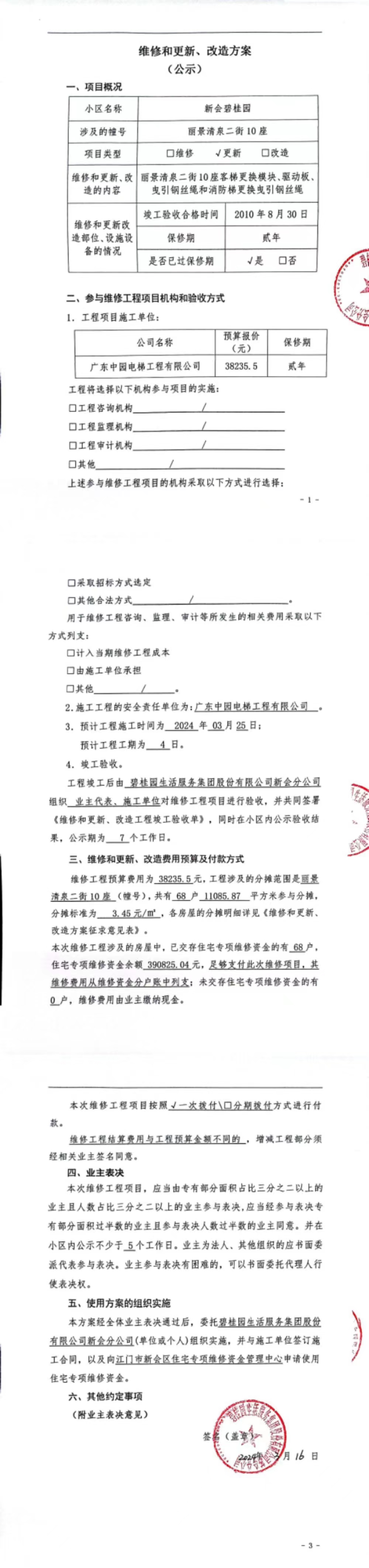 <td VALIGN="top" VALUES="" STYLE="border-width:0" BINDTYPE="0" ROWSPAN="19" COLSPAN="7" DATASOURCE="投票结果" ><font style="font-size:14pt;"><p style="white-space: normal; font-family: 宋体; line-height: 1.75em;">新会碧桂园丽景清泉二街10座全体业主:</p><p style="white-space: normal; font-family: 宋体; line-height: 1.75em; text-indent: 2em;">本小区关于新会碧桂园丽景清泉二街10座客梯和消防梯(梯粤JX5032、5017)更换模块、驱动器、曳引钢丝绳使用维修资金的投票的投票已表决结束,询异时间从2024年03月28日开始,投票询异公示期间,业主可通过微信查询自己的表决情况或可凭身份证件申请查询自己的表决情况;如公示的业主表决情况与查询的本人表决意见不一致的,可以以书面形式向投票组织机构申诉,投票组织机构予以纠正并重新公示表决结果。异议提出人对投票组织机构的处理仍有异议的,可以向街道办事处(镇人民政府)反映处理,涉及住宅专项维修资金的,可向属地住宅专项维修资金管理中心反映处理。</p><p style="white-space: normal;"><br/></p><p style="white-space: normal; font-family: 宋体; line-height: 1.75em;"><strong>附件:</strong></p><p style="white-space: normal; font-family: 宋体; line-height: 1.75em;"><strong>一、投票范围</strong></p><p style="white-space: normal; font-family: 宋体; line-height: 1.75em; text-indent: 2em;">新会碧桂园丽景清泉二街10座</p><p style="white-space: normal; font-family: 宋体; line-height: 1.75em; text-indent: 2em;">总人数(专有部分人数之和):67</p><p style="white-space: normal; font-family: 宋体; line-height: 1.75em; text-indent: 2em;"><span style="font-family: 宋体, SimSun;"><span style="font-family: 宋体; text-indent: 32px;"><span style="font-family: 宋体; text-indent: 32px;">总户数:68</span></span></span></p><p style="white-space: normal; font-family: 宋体; line-height: 1.75em; text-indent: 2em;">建筑物总面积(专有部分面积之和):11085.87㎡</p><p style="white-space: normal; font-family: 宋体; line-height: 1.75em;"><strong>二、询异公示起止时间</strong></p><p dir="ltr" style="white-space: normal; font-family: 宋体; line-height: 1.75em; text-indent: 2em;"><span style="text-indent: 36px;">2024年03月28日至2024年04月03日</span></p><p style="white-space: normal; font-family: 宋体; line-height: 1.75em;"><strong>三、投票详细描述</strong></p><p style="white-space: normal; font-family: 宋体; line-height: 1.75em; text-indent: 2em;"><p><span style="font-size: 14px; font-family: 宋体, SimSun;">新会碧桂园<span style="font-size: 14px; color: rgb(51, 51, 51); background-color: rgb(255, 255, 255);">丽景清泉二街10座客梯模块和驱动器损坏、曳引钢丝绳磨损严重已停机等待维修,<span style="font-size: 14px; color: rgb(51, 51, 51); background-color: rgb(255, 255, 255);">消防梯曳引钢丝绳</span>也检查出磨损严重建议一齐维修。<span style="font-size: 14px; background-color: rgb(255, 255, 255);">已过保修期,现申请使用维修资金对新会碧桂园<span style="font-size: 14px; color: rgb(51, 51, 51); background-color: rgb(255, 255, 255);">丽景清泉二街10座客梯模块和驱动器、<span style="font-size: 14px; color: rgb(51, 51, 51); background-color: rgb(255, 255, 255);">曳引钢丝绳</span></span>,消防梯<span style="color: rgb(51, 51, 51); font-family: 宋体, SimSun; font-size: 14px; background-color: rgb(255, 255, 255);">曳引</span><span style="color: rgb(51, 51, 51); font-family: 宋体, SimSun; font-size: 14px; background-color: rgb(255, 255, 255);">钢丝绳<span style="color: rgb(51, 51, 51); font-family: 宋体, SimSun; font-size: 14px; background-color: rgb(255, 255, 255);">进行</span></span>更换,工程维修预算约38235.5元,项目最终费用以施工合同签订为准,维修费用的分摊标准按建筑面积分摊,每平方约3.45元,详见公示,如果有业主手机不能正常通过微信投票的,请联系物业公司进行线下纸质投票,物业电话18088896992</span></span></span></p></p><p style="white-space: normal; font-family: 宋体; line-height: 1.75em;"><strong>四、计票规则</strong></p><p style="white-space: normal; font-family: 宋体; line-height: 1.75em; text-indent: 2em;">表决事项:使用建筑物及其附属设施的维修资金<br /><p style='text-align: left; font-family: 宋体; font-size: 16px; line-height: 1.75em; text-indent: 2em;'>计票规则:弃权票不并入其它项 未表决票不并入其它项</p></p><p style="white-space: normal; font-family: 宋体; line-height: 1.75em;"><strong>五、通过规则</strong></p><p style="white-space: normal; font-family: 宋体; line-height: 1.75em;"><strong><strong style="white-space: normal;"><span style="font-family: 宋体, SimSun;"> 根据《中华人民共和国民法典》第二百七十八条规定:业主共同决定事项,应当由专有部分面积占比三分之二以上的业主且人数占比三分之二以上的业主参与表决。</span></strong></strong></p><p style="white-space: normal; font-family: 宋体; line-height: 1.75em; text-indent: 2em;">表决事项:使用建筑物及其附属设施的维修资金<br /><p style='text-align: left; font-family: 宋体; font-size: 16px; line-height: 1.75em; text-indent: 2em;'>通过规则:双2/3以上参与表决,参与表决双过半同意</p></p><p style="white-space: normal; font-family: 宋体; line-height: 1.75em;"><strong>六、投票结果</strong></p><p style="white-space: normal; font-family: 宋体; line-height: 1.75em; text-indent: 2em;"><div id='resultTable'><table style='table-layout: fixed; font-size:12px; margin-top:10px' width='100%' border='0' cellspacing='0' cellpadding='0'><tr><td height='28' colspan='10' align='center' style='border: 1px solid #666'><strong style='font-size: 14px;'> 使用建筑物及其附属设施的维修资金</stro