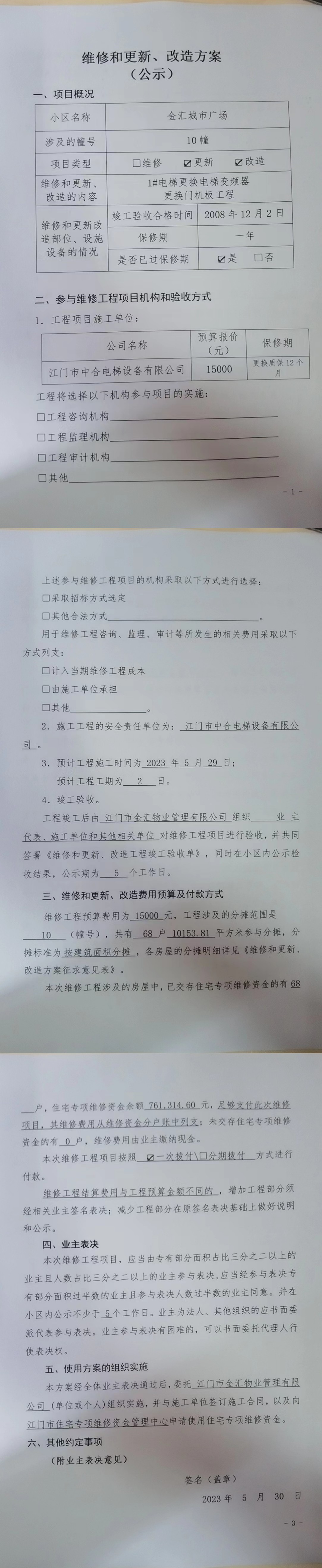 <td valign="top" values="" style="border-width:0" bindtype="0" rowspan="17" colspan="7" datasource="投票结果"><font style=" font-family:方正小标宋简体;font-size:14pt;"><p style="line-height: 1.75em;"><span style="font-family: 宋体, SimSun;">各位尊敬的业主:</span><br></p><p style="text-indent: 2em; line-height: 1.75em;"><span style="font-family: 宋体, SimSun;">根据法律法规的规定,本小区业主利用“物业公共事务决策系统”已对本小区公共事务决策事项进行了表决,在经过7日的询异公示期后,未收到业主有效的异议。现将投票结果公告,并就产生的法律效力说明如下:</span></p><p style="line-height: 1.75em; text-indent: 0em;"><strong style="text-indent: 2em;"><span style="font-family: 宋体, SimSun;">一、投票范围</span></strong></p><p style="text-indent: 2em; line-height: 1.75em;"><span style="font-family: 宋体, SimSun;">金汇城市广场金汇城市广场10栋</span></p><p style="text-indent: 2em; line-height: 1.75em;"><span style="font-family: 宋体, SimSun;">总人数(专有部分人数之和):67</span></p><p style="text-indent: 2em; line-height: 1.75em;"><span style="font-family: 宋体, SimSun;"><span style="font-family: 宋体, SimSun; text-indent: 32px;">总户数:68</span></span></p><p style="text-indent: 2em; line-height: 1.75em;"><span style="font-family: 宋体, SimSun;">建筑物总面积(专有部分面积之和):10153.81㎡</span></p><p style="line-height: 1.75em;"><strong><span style="font-family: 宋体, SimSun;">二、投票起止时间</span></strong></p><p style="text-indent: 2em; line-height: 1.75em;"><span style="font-family: 宋体, SimSun;">投票表决时间:从2023年06月01日到2023年06月30日止</span></p><p style="text-indent: 2em; line-height: 1.75em;"><span style="font-family: 宋体, SimSun;">投票询异公示时间:从2023年07月01日开始</span></p><p style="text-indent: 2em; line-height: 1.75em;"><span style="font-family: 宋体, SimSun;">投票结果通知公告时间:从2023年07月08日开始</span></p><p style="line-height: 1.75em;"><strong><span style="font-family: 宋体, SimSun;">三、计票规则</span></strong></p><p style="text-indent: 2em; line-height: 1.75em;"><span style="font-family: 宋体, SimSun;">表决事项:使用建筑物及其附属设施的维修资金<br></span></p><p style="font-family: 宋体, SimSun;line-height: 1.75em; text-indent: 2em;">计票规则:弃权票不并入其它项 未表决票不并入其它项</p><p></p><p style="line-height: 1.75em;"><strong><span style="font-family: 宋体, SimSun;">四、通过规则</span></strong></p><p style="text-indent: 2em; line-height: 1.75em;"><span style="font-family: 宋体, SimSun;"><span style="font-family: 宋体, SimSun; text-indent: 32px;">表决事项:使用建筑物及其附属设施的维修资金<br></span></span></p><p style="font-family: 宋体, SimSun;line-height: 1.75em; text-indent: 2em;">通过规则:参与表决专有部分面积过半数的业主且参与表决人数过半数的业主同意</p><p></p><p style="line-height: 1.75em;"><strong><span style="font-family: 宋体, SimSun;">五、投票结果</span></strong></p><p style="line-height: 1.75em; text-indent: 2em;"><span style="font-family: 宋体, SimSun; text-indent: 2em;"></span></p><div id="resultTable"><table style="table-layout: fixed; font-size:12px; margin-top:10px" width="100%" border="0" cellspacing="0" cellpadding="0"><tbody><tr><td height="28" colspan="10" align="center" style="border: 1px solid #666"><strong style="font-size: 14px;"> 使用建筑物及其附属设施的维修资金</strong></td> </tr><tr id="trfirst"><td height="28" colspan="4" style="border-left: 1px solid #666; border-bottom: 1px solid #666"><strong> 申报单位:</strong> 江门市金汇物业管理有限公司</td><td colspan="3" style="border-left: 1px solid #666; border-bottom: 1px solid #666"><strong> 联系方式:</strong> 3929093 </td><td colspan="3" style="border-left: 1px solid #666; border-bottom: 1px solid #666; border-right: 1px solid #666"><strong> 申报日期:</strong> 2023年5月29日 </td></tr><tr> <td height="28" colspan="5" style="border-left: 1px solid #666; border-bottom: 1px solid #666"><strong> 总人数(专有部分人数之和):</strong>67人 </td><td colspan="5" style="border-left: 1px solid #666; border-bottom: 1px solid #666; border-right: 1px solid #666"><strong> 建筑物总面积(专有部分面积之和):</strong>10153.81㎡ </td> </tr><tr><td height="28" colspan="10" bgcolor="#F3F3F3" style="border-left: 1px solid #666;border-bottom: 1px solid #666;border-right: 1px solid #666"><strong> 参与人数及面积统计</strong></td></tr><tr><td height="28" colspan="5" style="border-left: 1px solid #666; border-bottom: 1px solid #666"><strong> 参与表决专有部分人数之和:</strong>52人</td><td colspan="5" style="border-left: 1px solid #666; border-bottom: 1px solid #666; border-right: 1px solid #666"><strong> 参与表决占有表决权总人数比例:</strong>77.61%</td></tr><tr><td height="28" colspan="5" style="border-left: 1px solid #666; border-bottom: 1px solid #666"><strong> 参与表决专有部分面积之和:</strong>7828.82㎡</td><td colspan="5" style="border-left: 1px solid #666; border-bottom: 1px solid #666; border-right: 1px solid #666"><strong> 参与表决占有表决权总面积比例:</strong>77.10%</td></tr><tr><td height="28" colspan="10" bgcolor="#F3F3F3" style="border-left: 1px solid #666; border-bottom: 1px solid #666;border-right: 1px solid #666"> <strong> 未参与人数及面积统计</strong></td> </tr><tr><td height="28" colspan="5" style="border-left: 1px solid #666; border-bottom: 1px solid #666"><strong> 未参与表决专有部分人数之和:</strong>15人 </td><td colspan="5" style="border-left: 1px solid #666; border-bottom: 1px solid #666; border-right: 1px solid #666"><strong> 未参与表决占有表决权总人数比例:</strong>22.39%</td></tr><tr><td hei