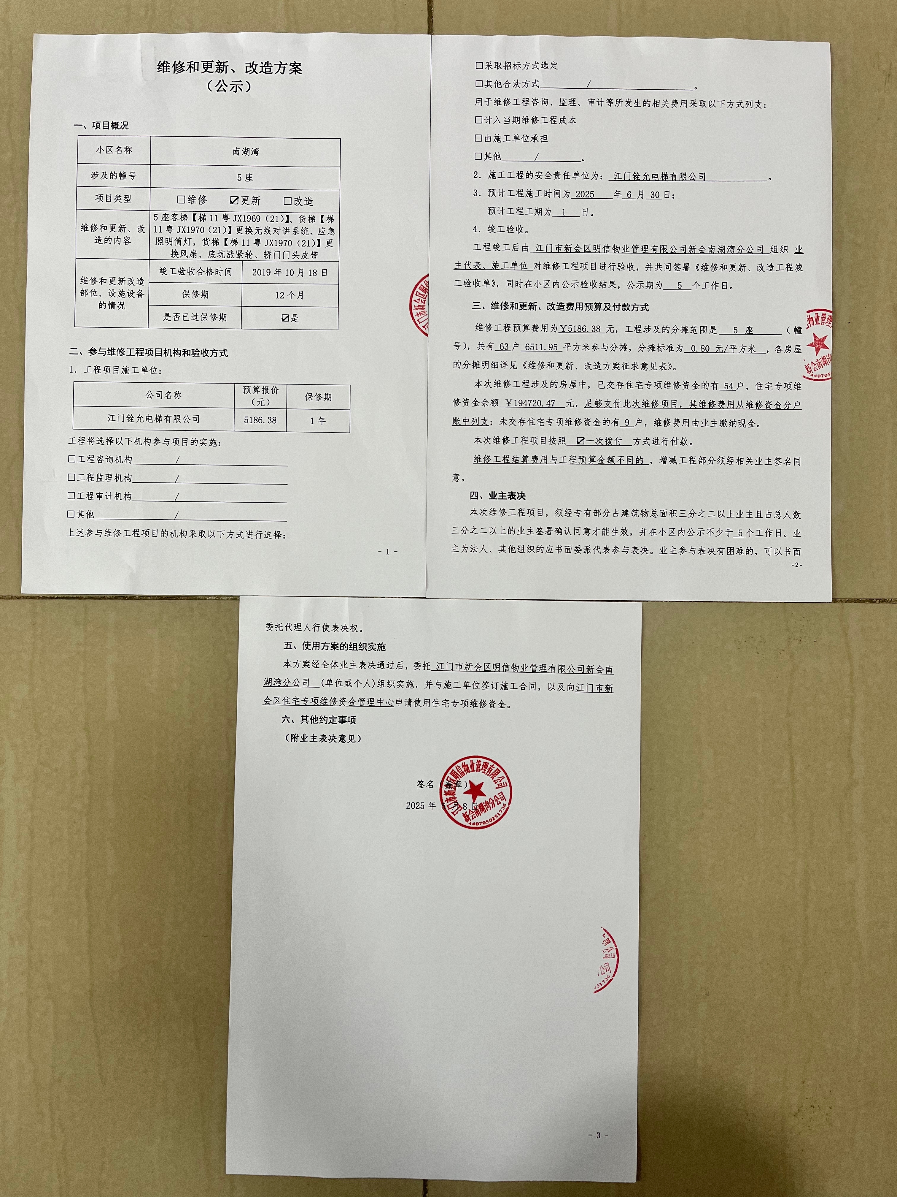 <td VALIGN="top" VALUES="" STYLE="border-width:0" BINDTYPE="0" ROWSPAN="19" COLSPAN="7" DATASOURCE="投票结果" ><font style="font-size:14pt;"><p style="white-space: normal; font-family: 宋体; line-height: 1.75em;">南湖湾会城民和北路1号5座全体业主:</p><p style="white-space: normal; font-family: 宋体; line-height: 1.75em; text-indent: 2em;">本小区关于南湖湾5座客梯货梯更换无线对讲系统、应急照明筒灯,货梯更换风扇、底坑涨紧轮、轿门门头皮带使用维修资金的投票的投票已表决结束,询异时间从2025年05月13日开始,投票询异公示期间,业主可通过微信查询自己的表决情况或可凭身份证件申请查询自己的表决情况;如公示的业主表决情况与查询的本人表决意见不一致的,可以以书面形式向投票组织机构申诉,投票组织机构予以纠正并重新公示表决结果。异议提出人对投票组织机构的处理仍有异议的,可以向街道办事处(镇人民政府)反映处理,涉及住宅专项维修资金的,可向属地住宅专项维修资金管理中心反映处理。</p><p style="white-space: normal;"><br/></p><p style="white-space: normal; font-family: 宋体; line-height: 1.75em;"><strong>附件:</strong></p><p style="white-space: normal; font-family: 宋体; line-height: 1.75em;"><strong>一、投票范围</strong></p><p style="white-space: normal; font-family: 宋体; line-height: 1.75em; text-indent: 2em;">南湖湾会城民和北路1号5座</p><p style="white-space: normal; font-family: 宋体; line-height: 1.75em; text-indent: 2em;">总人数(专有部分人数之和):62</p><p style="white-space: normal; font-family: 宋体; line-height: 1.75em; text-indent: 2em;"><span style="font-family: 宋体, SimSun;"><span style="font-family: 宋体; text-indent: 32px;"><span style="font-family: 宋体; text-indent: 32px;">总户数:63</span></span></span></p><p style="white-space: normal; font-family: 宋体; line-height: 1.75em; text-indent: 2em;">建筑物总面积(专有部分面积之和):6511.95㎡</p><p style="white-space: normal; font-family: 宋体; line-height: 1.75em;"><strong>二、询异公示起止时间</strong></p><p dir="ltr" style="white-space: normal; font-family: 宋体; line-height: 1.75em; text-indent: 2em;"><span style="text-indent: 36px;">2025年05月13日至2025年05月23日</span></p><p style="white-space: normal; font-family: 宋体; line-height: 1.75em;"><strong>三、投票详细描述</strong></p><p style="white-space: normal; font-family: 宋体; line-height: 1.75em; text-indent: 2em;"><p style="margin-top:5px;margin-right:0;margin-bottom:5px;margin-left:0"><span style=";font-family:宋体;letter-spacing:0;font-size:14px"><span style="font-family:宋体">小区</span><span style="font-family:宋体">5座客梯【梯11粤JX1969(21)】、货梯【梯11粤JX1970(21)】安装使用多年,原来的三方通话系统老化,较多电梯轿厢不能呼叫监控中心,存在通话不清晰,杂音大等原因,若电梯内出现突发性安全情况,轿厢内的人员将无法第一时间与外界取得联系。在电梯公司的日常维保过程中,还发现客梯、货梯应急照明筒灯故障,货梯轿厢风扇、底坑涨紧轮运行异响、轿门门头皮带断裂(日常使用自然故障损坏),已影响电梯的正常运行,为确保电梯安全运行,需更换通话清晰、信号强的无线对讲系统及更换风扇、应急照明筒灯、底坑涨紧轮、轿门门头皮带。</span></span></p><p style="margin-top:5px;margin-right:0;margin-bottom:5px;margin-left:0"><span style=";font-family:宋体;letter-spacing:0;font-size:14px"> 现对5座</span><span style=";font-family:宋体;font-size:14px">客梯、货梯更换无线对讲系统、故障的应急照明筒灯</span><span style=";font-family:宋体;letter-spacing:0;font-size:14px">,货梯更换磨损异响的风扇、运行异响的底坑涨紧轮、断裂的轿门门头皮带,工程总的预算金额是¥</span><span style=";font-family:Calibri;letter-spacing:0;font-size:14px">5186.38</span><span style=";font-family:宋体;letter-spacing:0;font-size:14px"><span style="font-family:宋体">元,项目最终费用以施工合同签订金额为准。因已过保修期,维修费用由样关业主按建筑面积分摊,每平方约¥</span><span style="font-family:宋体">0.80元,详见公示附件。如业主手机不能正常通过微信投票,请联系物业服务中心进行线下纸质投票,物业服务中心电话:0750-6682293。</span></span></p></p><p style="white-space: normal; font-family: 宋体; line-height: 1.75em;"><strong>四、计票规则</strong></p><p style="white-space: normal; font-family: 宋体; line-height: 1.75em; text-indent: 2em;">表决事项:使用建筑物及其附属设施的维修资金<br /><p style='text-align: left; font-family: 宋体; font-size: 16px; line-height: 1.75em; text-indent: 2em;'>计票规则:弃权票不并入其它项 未表决票不并入其它项</p></p><p style="white-space: normal; font-family: 宋体; line-height: 1.75em;"><strong>五、通过规则</strong></p><p style="white-space: normal; font-family: 宋体; line-height: 1.75em;"><strong><strong style="white-space: normal;"><span style="font-family: 宋体, SimSun;"> 根据《中华人民共和国民法典》第二百七十八条规定:业主共同决定事项,应当由专有部分面积占比三分之二以上的业主且人数占比三分之二以上的业主参与表决。</span></strong></strong></p><p style="white-space: normal; font-family: 宋体; line-height: 1.75em; text-indent: 2em;">表决事项:使用建筑物及其附属设施的维修资金<br /><p style='text-align: left; font-family: 宋体; font-size: 16px; line-height: 1.75em; text-indent: 2em;'>通过规则:双2/3以上参与表决,参与表决双过半同意</p></p><p style="white-space: normal; font-family: 宋体; line-height: 1.75em;"><strong>六、投票结果</strong></p><p style="white-spa