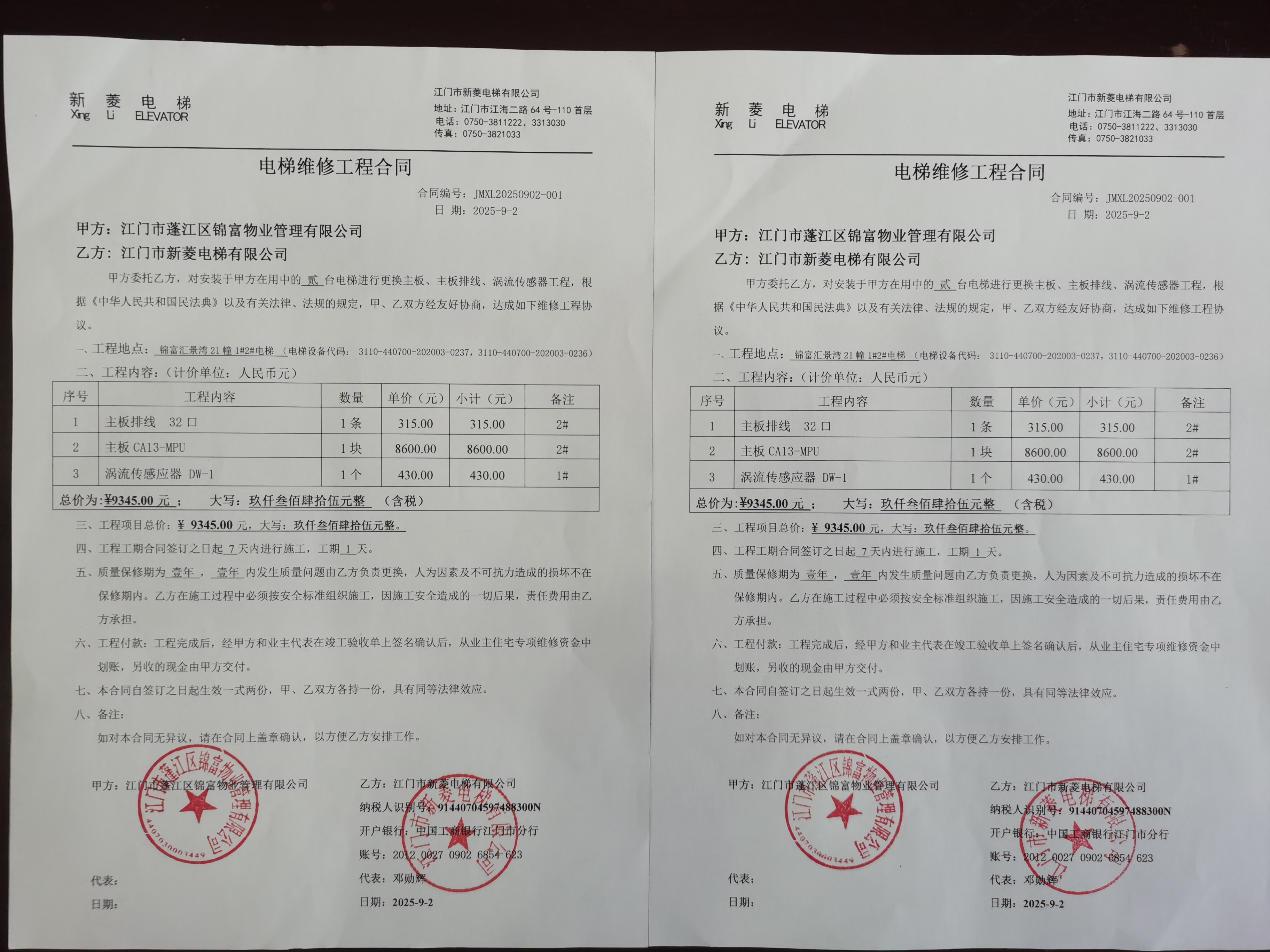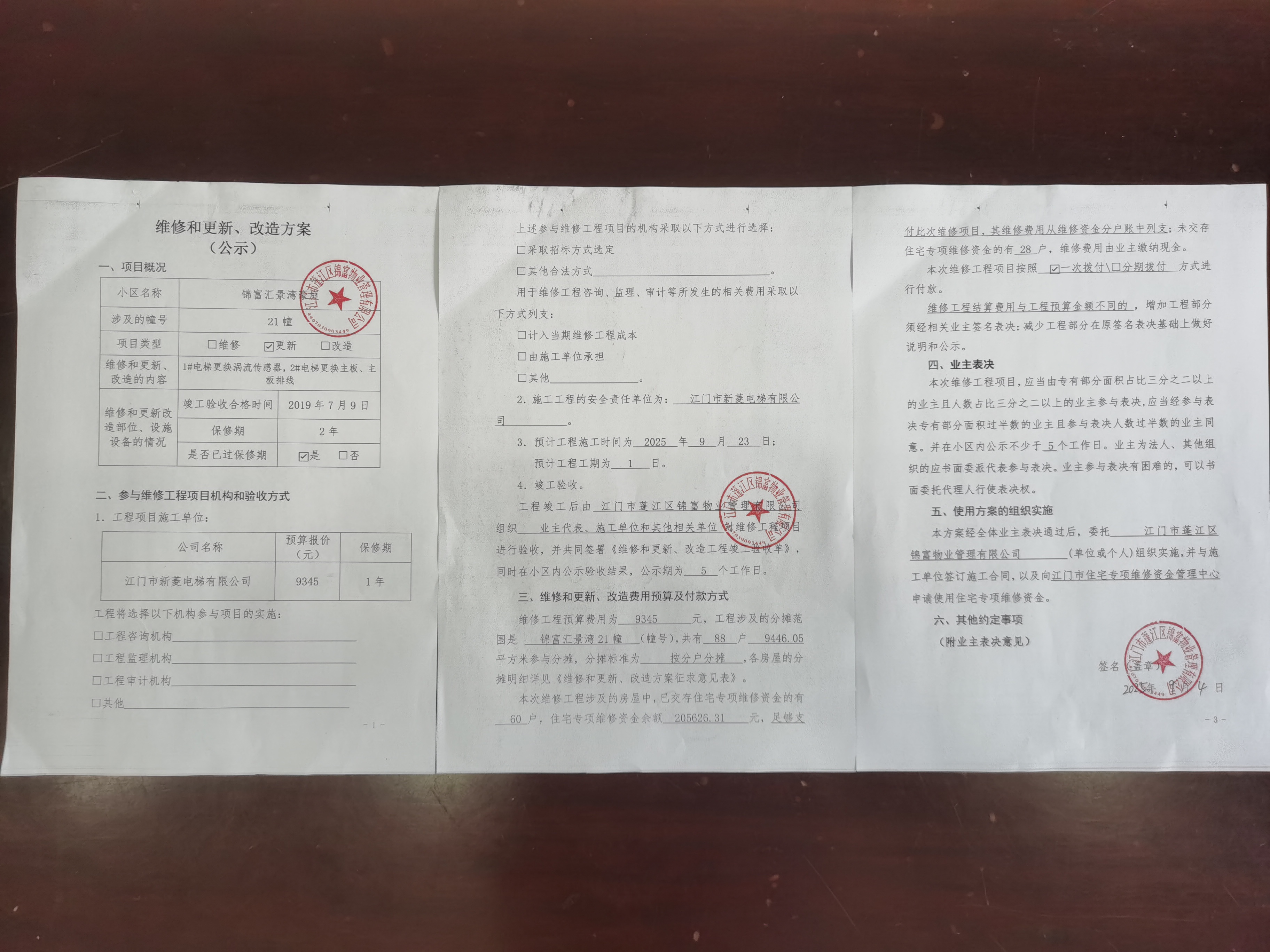 <td VALIGN="top" VALUES="" STYLE="border-width:0" BINDTYPE="0" ROWSPAN="19" COLSPAN="7" DATASOURCE="投票结果" ><font style="font-size:14pt;"><p style="white-space: normal; font-family: 宋体; line-height: 1.75em;">江门市蓬江区锦富汇景湾豪庭蓬江区棠下镇锦富汇景湾豪庭21幢全体业主:</p><p style="white-space: normal; font-family: 宋体; line-height: 1.75em; text-indent: 2em;">本小区关于锦富汇景湾21幢1#电梯更换涡流传感器,2#电梯更换主板、主板排线使用维修资金的投票的投票已表决结束,询异时间从2025年10月15日开始,投票询异公示期间,业主可通过微信查询自己的表决情况或可凭身份证件申请查询自己的表决情况;如公示的业主表决情况与查询的本人表决意见不一致的,可以以书面形式向投票组织机构申诉,投票组织机构予以纠正并重新公示表决结果。异议提出人对投票组织机构的处理仍有异议的,可以向街道办事处(镇人民政府)反映处理,涉及住宅专项维修资金的,可向属地住宅专项维修资金管理中心反映处理。</p><p style="white-space: normal;"><br/></p><p style="white-space: normal; font-family: 宋体; line-height: 1.75em;"><strong>附件:</strong></p><p style="white-space: normal; font-family: 宋体; line-height: 1.75em;"><strong>一、投票范围</strong></p><p style="white-space: normal; font-family: 宋体; line-height: 1.75em; text-indent: 2em;">江门市蓬江区锦富汇景湾豪庭蓬江区棠下镇锦富汇景湾豪庭21幢</p><p style="white-space: normal; font-family: 宋体; line-height: 1.75em; text-indent: 2em;">总人数(专有部分人数之和):85</p><p style="white-space: normal; font-family: 宋体; line-height: 1.75em; text-indent: 2em;"><span style="font-family: 宋体, SimSun;"><span style="font-family: 宋体; text-indent: 32px;"><span style="font-family: 宋体; text-indent: 32px;">总户数:88</span></span></span></p><p style="white-space: normal; font-family: 宋体; line-height: 1.75em; text-indent: 2em;">建筑物总面积(专有部分面积之和):9446.05㎡</p><p style="white-space: normal; font-family: 宋体; line-height: 1.75em;"><strong>二、询异公示起止时间</strong></p><p dir="ltr" style="white-space: normal; font-family: 宋体; line-height: 1.75em; text-indent: 2em;"><span style="text-indent: 36px;">2025年10月15日至2025年10月25日</span></p><p style="white-space: normal; font-family: 宋体; line-height: 1.75em;"><strong>三、投票详细描述</strong></p><p style="white-space: normal; font-family: 宋体; line-height: 1.75em; text-indent: 2em;"><p style="font-family: "Helvetica Neue", Helvetica, Arial, sans-serif; font-size: 14px; text-wrap-mode: wrap; background-color: rgb(255, 255, 255);"><span style="letter-spacing: 0px; background-image: initial; background-position: initial; background-size: initial; background-repeat: initial; background-attachment: initial; background-origin: initial; background-clip: initial; font-family: 宋体;">小区21</span><span style="letter-spacing: 0px; background: rgb(255, 255, 0); font-family: 宋体;">幢</span><span style="letter-spacing: 0px; background-image: initial; background-position: initial; background-size: initial; background-repeat: initial; background-attachment: initial; background-origin: initial; background-clip: initial; font-family: 宋体;">的电</span><span style="letter-spacing: 0px; background: rgb(255, 255, 0); font-family: 宋体;">梯日常维</span><span style="letter-spacing: 0px; background: rgb(255, 255, 0); font-family: 宋体;">保期间,维保发现1#电梯涡流传感器损坏,2#电梯主板、主板排线出现故障不能正常运行。</span></p><p style="font-family: "Helvetica Neue", Helvetica, Arial, sans-serif; font-size: 14px; text-wrap-mode: wrap; background-color: rgb(255, 255, 255);"><span style="letter-spacing: 0px; font-family: 宋体; background-image: initial; background-position: initial; background-size: initial; background-repeat: initial; background-attachment: initial; background-origin: initial; background-clip: initial;"> 现对21</span><span style="letter-spacing: 0px; background: rgb(255, 255, 0); font-family: 宋体;">幢1#2#电梯进行维修</span><span style="letter-spacing: 0px; background-image: initial; background-position: initial; background-size: initial; background-repeat: initial; background-attachment: initial; background-origin: initial; background-clip: initial; font-family: 宋体;">,工程维修预算金额为9345</span><span style="letter-spacing: 0px; background: rgb(255, 255, 0); font-family: 宋体;">元</span><span style="letter-spacing: 0px; background-image: initial; background-position: initial; background-size: initial; background-repeat: initial; background-attachment: initial; background-origin: initial; background-clip: initial; font-family: 宋体;">,项目最终费用以施工合同签订金额为准。因已过保修期,维修费用由相关业主</span><span style="letter-spacing: 0px; background: rgb(255, 255, 0); font-family: 宋体;">按分户</span><span style="letter-spacing: 0px; background-image: initial; background-position: initial; background-size: initial; background-repeat: initial; background-attachment: initial; background-origin: initial; background-clip: initial; font-family: 宋体;">分摊,</span><span style="letter-spacing: 0px; background-image: initial; background-position: initial; background-size: initial; background-repeat: initial; background-attachment: initial; background-origin: initial; background-clip: initial; font-family: 宋体;">详见公示附件。如业主手机不能正常通过微信投票,请联系物业公司进行线下纸质投票,物业电话</span><span style="letter-spacing: 0px; background: rgb(255, 255, 0); font-family: 宋体;">:</span><span style="letter-spacing: 0px; font-family: Calibri; background: rgb(255, 255, 0);">0750-3598316 <span style="font-family: