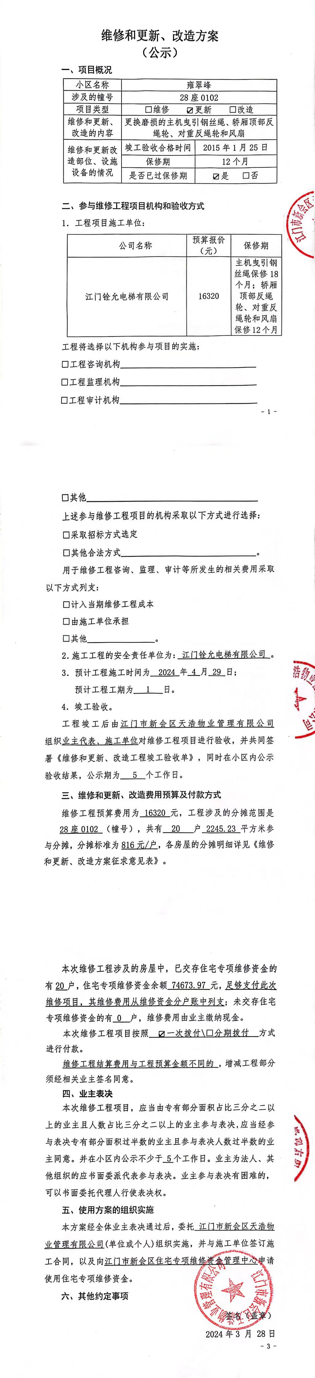 <td VALIGN="top" VALUES="" STYLE="border-width:0" BINDTYPE="0" ROWSPAN="17" COLSPAN="7" DATASOURCE="投票结果" ><font style=" font-family:方正小标宋简体;font-size:14pt;"><p style="line-height: 1.75em;"><span style="font-family: 宋体, SimSun;">各位尊敬的业主:</span><br/></p><p style="text-indent: 2em; line-height: 1.75em;"><span style="font-family: 宋体, SimSun;">根据法律法规的规定,本小区业主利用“江门市物业事项表决管理系统”已对本小区公共事务决策事项进行了表决,在经过7日的询异公示期后,未收到业主有效的异议。现将投票结果公告,并就产生的法律效力说明如下:</span></p><p style="line-height: 1.75em; text-indent: 0em;"><strong style="text-indent: 2em;"><span style="font-family: 宋体, SimSun;">一、投票范围</span></strong></p><p style="text-indent: 2em; line-height: 1.75em;"><span style="font-family: 宋体, SimSun;">雍翠峰雍翠峰28座</span></p><p style="text-indent: 2em; line-height: 1.75em;"><span style="font-family: 宋体, SimSun;">总人数(专有部分人数之和):20</span></p><p style="text-indent: 2em; line-height: 1.75em;"><span style="font-family: 宋体, SimSun;"><span style="font-family: 宋体, SimSun; text-indent: 32px;"><span style="font-family: 宋体; text-indent: 32px;"><span style="font-family: 宋体; text-indent: 32px;">总户数:20</span></span></span></span></p><p style="text-indent: 2em; line-height: 1.75em;"><span style="font-family: 宋体, SimSun;">建筑物总面积(专有部分面积之和):2245.23㎡</span></p><p style="line-height: 1.75em;"><strong><span style="font-family: 宋体, SimSun;">二、投票结果公告时间</span></strong></p><p style="text-indent: 2em; line-height: 1.75em;"><span style="font-family: 宋体, SimSun;">从2024年04月15日开始</span></p><p style="line-height: 1.75em;"><strong><span style="font-family: 宋体, SimSun;">三、计票规则</span></strong></p><p style="text-indent: 2em; line-height: 1.75em;"><span style="font-family: 宋体, SimSun;">表决事项:使用建筑物及其附属设施的维修资金<br /><p style='font-family: 宋体, SimSun;line-height: 1.75em; text-indent: 2em;'>计票规则:弃权票不并入其它项&nbsp;&nbsp;&nbsp;&nbsp;未表决票不并入其它项</p></span></p><p style="line-height: 1.75em;"><strong><span style="font-family: 宋体, SimSun;">四、通过规则</span></strong></p><p style="line-height: 1.75em;"><strong><span style="font-family: 宋体, SimSun;">&nbsp; 根据《中华人民共和国民法典》第二百七十八条规定:业主共同决定事项,应当由专有部分面积占比三分之二以上的业主且人数占比三分之二以上的业主参与表决。</span></strong></p><p style="text-indent: 2em; line-height: 1.75em;"><span style="font-family: 宋体, SimSun;"><span style="font-family: 宋体, SimSun; text-indent: 32px;">表决事项:使用建筑物及其附属设施的维修资金<br /><p style='font-family: 宋体, SimSun;line-height: 1.75em; text-indent: 2em;'>通过规则:双2/3以上参与表决,参与表决双过半同意</p></span></span></p><p style="line-height: 1.75em;"><strong><span style="font-family: 宋体, SimSun;">五、投票结果</span></strong></p><p style="line-height: 1.75em; text-indent: 2em;"><span style="font-family: 宋体, SimSun; text-indent: 2em;"><div id='resultTable'><table style='table-layout: fixed; font-size:12px; margin-top:10px' width='100%' border='0' cellspacing='0' cellpadding='0'><tr><td height='28' colspan='10' align='center' style='border: 1px solid #666'><strong style='font-size: 14px;'> 使用建筑物及其附属设施的维修资金</strong></td> </tr><tr id='trfirst'><td height='28' colspan='4' style='border-left: 1px solid #666; border-bottom: 1px solid #666'><strong>&nbsp;申报单位:</strong> 江门市新会区天浩物业管理有限公司</td><td colspan='3' style='border-left: 1px solid #666; border-bottom: 1px solid #666'><strong>&nbsp;联系方式:</strong> </td><td colspan='3' style='border-left: 1px solid #666; border-bottom: 1px solid #666; border-right: 1px solid #666'><strong>&nbsp;申报日期:</strong> 2024年3月28日 </td></tr><tr> <td height='28' colspan='5' style='border-left: 1px solid #666; border-bottom: 1px solid #666'><strong>&nbsp;列支总人数(专有部分人数之和):</strong>20人 </td><td colspan='5' style='border-left: 1px solid #666; border-bottom: 1px solid #666; border-right: 1px solid #666'><strong>&nbsp;列支建筑物总面积(专有部分面积之和):</strong>2245.23㎡ </td> </tr><tr><td height='28' colspan='10' bgcolor='#F3F3F3' style='border-left: 1px solid #666;border-bottom: 1px solid #666;border-right: 1px solid #666'><strong>&nbsp;参与表决人数及面积统计</strong></td></tr><tr><td height='28' colspan='5' style='border-left: 1px solid #666; border-bottom: 1px solid #666'><strong>&nbsp;参与表决人数:</strong>15人</td><td colspan='5' style='border-left: 1px solid #666; border-bottom: 1px solid #666; border-right: 1px solid #666'><strong>&nbsp;参与表决人数占总人数比例:</strong>75.00%</td></tr><tr><td height='28' colspan='5' style='border-left: 1px solid #666; border-bottom: 1px solid #666'><strong>&nbsp;参与表决面积:</strong>1714.65㎡</td><td colspan='5' style='border-left: 1px solid #666; border-bottom: 1px solid #666; border-right: 1px solid #666'><strong>&nbsp;参与表决面积占总面积比例:</strong>76.37%</td></tr><tr><td height='28' colspan='10' bgcolor='#F3F3F3' style='border-left: 1px solid #666; border-bottom: 1px solid #666;border-right: 1px solid #666'> <strong>&nbsp;参与表决同意人数及面积统计</strong></td> </tr><tr><td height='28' colspan='5' style='border-left: 1px solid #666; border-bottom: 1px solid #666'><strong>&nbsp;参与表决同意人数:</strong>13人 </td><td colspan='5' style='border-left: 1px solid #666; border-bottom: 1px solid #666; border-right: 1px solid #666'><strong>&nbsp;参与表