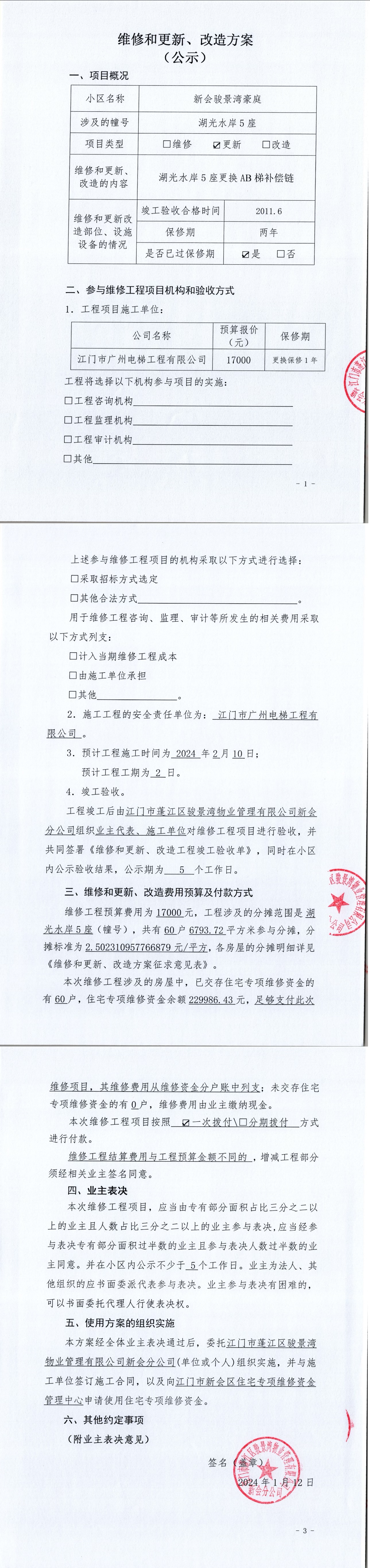 <td valign="top" values="" style="border-width:0" bindtype="0" rowspan="17" colspan="7" datasource="投票结果"><font style=" font-family:方正小标宋简体;font-size:14pt;"><p style="line-height: 1.75em;"><span style="font-family: 宋体, SimSun;">各位尊敬的业主:</span><br></p><p style="text-indent: 2em; line-height: 1.75em;"><span style="font-family: 宋体, SimSun;">根据法律法规的规定,本小区业主利用“江门市物业事项表决管理系统”已对本小区公共事务决策事项进行了表决,在经过7日的询异公示期后,未收到业主有效的异议。现将投票结果公告,并就产生的法律效力说明如下:</span></p><p style="line-height: 1.75em; text-indent: 0em;"><strong style="text-indent: 2em;"><span style="font-family: 宋体, SimSun;">一、投票范围</span></strong></p><p style="text-indent: 2em; line-height: 1.75em;"><span style="font-family: 宋体, SimSun;">新会骏景湾豪庭湖光水岸5座</span></p><p style="text-indent: 2em; line-height: 1.75em;"><span style="font-family: 宋体, SimSun;">总人数(专有部分人数之和):60</span></p><p style="text-indent: 2em; line-height: 1.75em;"><span style="font-family: 宋体, SimSun;"><span style="font-family: 宋体, SimSun; text-indent: 32px;"><span style="font-family: 宋体; text-indent: 32px;"><span style="font-family: 宋体; text-indent: 32px;">总户数:60</span></span></span></span></p><p style="text-indent: 2em; line-height: 1.75em;"><span style="font-family: 宋体, SimSun;">建筑物总面积(专有部分面积之和):6793.72㎡</span></p><p style="line-height: 1.75em;"><strong><span style="font-family: 宋体, SimSun;">二、投票结果公告时间</span></strong></p><p style="text-indent: 2em; line-height: 1.75em;"><span style="font-family: 宋体, SimSun;">从2024年02月24日开始</span></p><p style="line-height: 1.75em;"><strong><span style="font-family: 宋体, SimSun;">三、计票规则</span></strong></p><p style="text-indent: 2em; line-height: 1.75em;"><span style="font-family: 宋体, SimSun;">表决事项:使用建筑物及其附属设施的维修资金<br></span></p><p style="font-family: 宋体, SimSun;line-height: 1.75em; text-indent: 2em;">计票规则:弃权票不并入其它项 未表决票不并入其它项</p><p></p><p style="line-height: 1.75em;"><strong><span style="font-family: 宋体, SimSun;">四、通过规则</span></strong></p><p style="line-height: 1.75em;"><strong><span style="font-family: 宋体, SimSun;"> 根据《中华人民共和国民法典》第二百七十八条规定:业主共同决定事项,应当由专有部分面积占比三分之二以上的业主且人数占比三分之二以上的业主参与表决。</span></strong></p><p style="text-indent: 2em; line-height: 1.75em;"><span style="font-family: 宋体, SimSun;"><span style="font-family: 宋体, SimSun; text-indent: 32px;">表决事项:使用建筑物及其附属设施的维修资金<br></span></span></p><p style="font-family: 宋体, SimSun;line-height: 1.75em; text-indent: 2em;">通过规则:双2/3以上参与表决,参与表决双过半同意</p><p></p><p style="line-height: 1.75em;"><strong><span style="font-family: 宋体, SimSun;">五、投票结果</span></strong></p><p style="line-height: 1.75em; text-indent: 2em;"><span style="font-family: 宋体, SimSun; text-indent: 2em;"></span></p><div id="resultTable"><table style="table-layout: fixed; font-size:12px; margin-top:10px" width="100%" border="0" cellspacing="0" cellpadding="0"><tbody><tr><td height="28" colspan="10" align="center" style="border: 1px solid #666"><strong style="font-size: 14px;"> 使用建筑物及其附属设施的维修资金</strong></td> </tr><tr id="trfirst"><td height="28" colspan="4" style="border-left: 1px solid #666; border-bottom: 1px solid #666"><strong> 申报单位:</strong> 江门市蓬江区骏景湾物业管理有限公司新会分公司</td><td colspan="3" style="border-left: 1px solid #666; border-bottom: 1px solid #666"><strong> 联系方式:</strong> </td><td colspan="3" style="border-left: 1px solid #666; border-bottom: 1px solid #666; border-right: 1px solid #666"><strong> 申报日期:</strong> 2024年1月13日 </td></tr><tr> <td height="28" colspan="5" style="border-left: 1px solid #666; border-bottom: 1px solid #666"><strong> 总人数(专有部分人数之和):</strong>60人 </td><td colspan="5" style="border-left: 1px solid #666; border-bottom: 1px solid #666; border-right: 1px solid #666"><strong> 建筑物总面积(专有部分面积之和):</strong>6793.72㎡ </td> </tr><tr><td height="28" colspan="10" bgcolor="#F3F3F3" style="border-left: 1px solid #666;border-bottom: 1px solid #666;border-right: 1px solid #666"><strong> 参与表决人数及面积统计</strong></td></tr><tr><td height="28" colspan="5" style="border-left: 1px solid #666; border-bottom: 1px solid #666"><strong> 参与表决人数:</strong>6人</td><td colspan="5" style="border-left: 1px solid #666; border-bottom: 1px solid #666; border-right: 1px solid #666"><strong> 参与表决人数占总人数比例:</strong>10.00%</td></tr><tr><td height="28" colspan="5" style="border-left: 1px solid #666; border-bottom: 1px solid #666"><strong> 参与表决面积:</strong>648.24㎡</td><td colspan="5" style="border-left: 1px solid #666; border-bottom: 1px solid #666; border-right: 1px solid #666"><strong> 参与表决面积占总面积比例:</strong>9.54%</td></tr><tr><td height="28" colspan="10" bgcolor="#F3F3F3" style="border-left: 1px solid #666; border-bottom: 1px solid #666;border-right: 1px solid #666"> <strong> 参与表决同意人数及面积统计</strong></td> </tr><tr><td height="28" colspan="5" style="border-left: 1px solid #666; border-bottom: 1px solid #666"><strong> 参与表决同意人数:</strong>6人 </td><td colspan="5" style="border-left: 1px solid #666; border-bottom: 1px solid #666; border-right: 1px solid #666"><strong> 参与表决同意人数占参与表决人数比例:</strong>