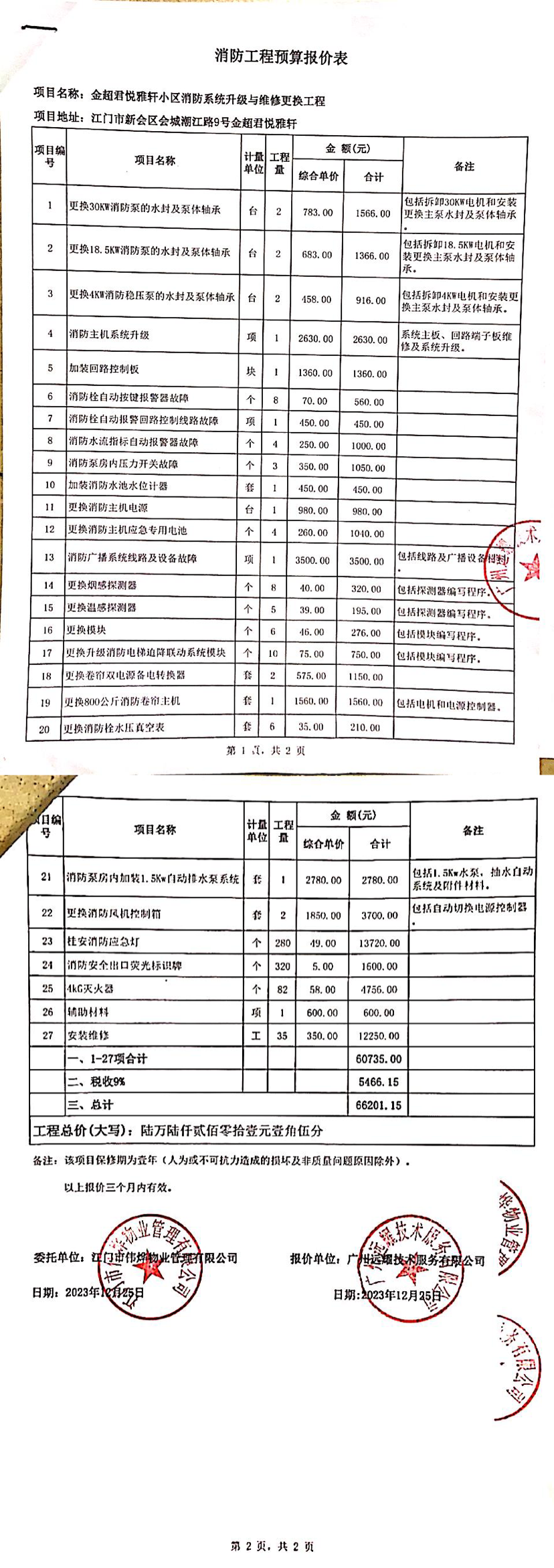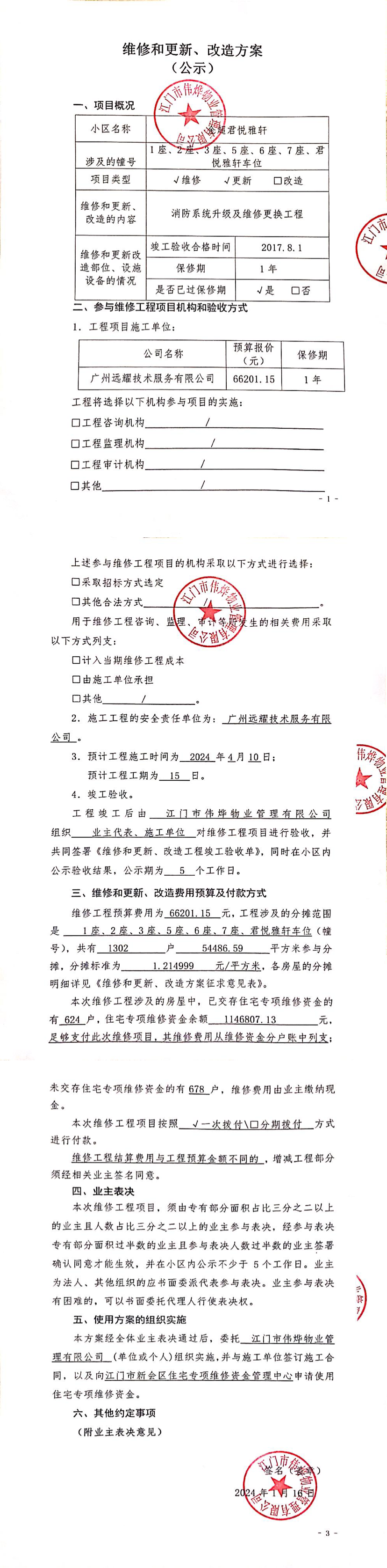 <td VALIGN="top" VALUES="" STYLE="border-width:0" BINDTYPE="0" ROWSPAN="19" COLSPAN="7" DATASOURCE="投票结果" ><font style="font-size:14pt;"><p style="white-space: normal; font-family: 宋体; line-height: 1.75em;">金超君悦雅轩1座、2座、3座、5座、6座、7座、君悦雅轩车位全体业主:</p><p style="white-space: normal; font-family: 宋体; line-height: 1.75em; text-indent: 2em;">本小区关于金超君悦雅轩消防系统升级及维修更换工程使用维修资金的投票的投票已表决结束,询异时间从2025年01月03日开始,投票询异公示期间,业主可通过微信查询自己的表决情况或可凭身份证件申请查询自己的表决情况;如公示的业主表决情况与查询的本人表决意见不一致的,可以以书面形式向投票组织机构申诉,投票组织机构予以纠正并重新公示表决结果。异议提出人对投票组织机构的处理仍有异议的,可以向街道办事处(镇人民政府)反映处理,涉及住宅专项维修资金的,可向属地住宅专项维修资金管理中心反映处理。</p><p style="white-space: normal;"><br/></p><p style="white-space: normal; font-family: 宋体; line-height: 1.75em;"><strong>附件:</strong></p><p style="white-space: normal; font-family: 宋体; line-height: 1.75em;"><strong>一、投票范围</strong></p><p style="white-space: normal; font-family: 宋体; line-height: 1.75em; text-indent: 2em;">金超君悦雅轩1座、2座、3座、5座、6座、7座、君悦雅轩车位</p><p style="white-space: normal; font-family: 宋体; line-height: 1.75em; text-indent: 2em;">总人数(专有部分人数之和):461</p><p style="white-space: normal; font-family: 宋体; line-height: 1.75em; text-indent: 2em;"><span style="font-family: 宋体, SimSun;"><span style="font-family: 宋体; text-indent: 32px;"><span style="font-family: 宋体; text-indent: 32px;">总户数:1302</span></span></span></p><p style="white-space: normal; font-family: 宋体; line-height: 1.75em; text-indent: 2em;">建筑物总面积(专有部分面积之和):54486.59㎡</p><p style="white-space: normal; font-family: 宋体; line-height: 1.75em;"><strong>二、询异公示起止时间</strong></p><p dir="ltr" style="white-space: normal; font-family: 宋体; line-height: 1.75em; text-indent: 2em;"><span style="text-indent: 36px;">2025年01月03日至2025年01月13日</span></p><p style="white-space: normal; font-family: 宋体; line-height: 1.75em;"><strong>三、投票详细描述</strong></p><p style="white-space: normal; font-family: 宋体; line-height: 1.75em; text-indent: 2em;"><p><span style="font-size: 14px; background-color: rgb(255, 255, 255); font-family: 宋体;"> 小区</span><span style="font-size: 14px; background-color: rgb(255, 255, 255); font-family: 宋体;">消防公共设施设备于日常中检查发现消防主机故障码及其他消防设施设备故障问题,经检查,有部分设备故障和损</span><span style="font-size: 14px; background-color: rgb(255, 255, 255); font-family: 宋体;">坏,导致部分消防设施设备无法正常运作,</span><span style="font-size: 14px; background-color: rgb(255, 255, 255); font-family: 宋体;">现对小区消防系统升级及维修更换,工程维修预算金额为66201.15元,项目最终费用以施工合同签订金额为准。因已过保修期,维修费用由相关业主按建筑面积分摊,每平方约1.214999元,详见公示附件。如业主手机不能正常通过微信投票,请联系物业公司进行线下纸质投</span><span style="font-size: 14px; background-color: rgb(255, 255, 255); font-family: 宋体;">票,物业电话:0750-6122009</span><span style="font-size: 14px; background-color: rgb(255, 255, 255); font-family: 宋体;">。</span><span style="font-family: "Helvetica Neue", Helvetica, Arial, sans-serif; font-size: 14px; background-color: rgb(255, 255, 255);"></span></p></p><p style="white-space: normal; font-family: 宋体; line-height: 1.75em;"><strong>四、计票规则</strong></p><p style="white-space: normal; font-family: 宋体; line-height: 1.75em; text-indent: 2em;">表决事项:使用建筑物及其附属设施的维修资金<br /><p style='text-align: left; font-family: 宋体; font-size: 16px; line-height: 1.75em; text-indent: 2em;'>计票规则:弃权票不并入其它项 未表决票不并入其它项</p></p><p style="white-space: normal; font-family: 宋体; line-height: 1.75em;"><strong>五、通过规则</strong></p><p style="white-space: normal; font-family: 宋体; line-height: 1.75em;"><strong><strong style="white-space: normal;"><span style="font-family: 宋体, SimSun;"> 根据《中华人民共和国民法典》第二百七十八条规定:业主共同决定事项,应当由专有部分面积占比三分之二以上的业主且人数占比三分之二以上的业主参与表决。</span></strong></strong></p><p style="white-space: normal; font-family: 宋体; line-height: 1.75em; text-indent: 2em;">表决事项:使用建筑物及其附属设施的维修资金<br /><p style='text-align: left; font-family: 宋体; font-size: 16px; line-height: 1.75em; text-indent: 2em;'>通过规则:双2/3以上参与表决,参与表决双过半同意</p></p><p style="white-space: normal; font-family: 宋体; line-height: 1.75em;"><strong>六、投票结果</strong></p><p style="white-space: normal; font-family: 宋体; line-height: 1.75em; text-indent: 2em;"><div id='resultTable'><table style='table-layout: fixed; font-size:12px; margin-top:10px' width='100%' border='0' cellspacing='0' cellpadding='0'><tr><td height='28' colspan='10' align='center' style='border: 1px solid #666'><strong style='font-size: 14px;'> 使用建筑物及其附属设施的维修资金</strong></td> </tr><tr id='trfirst'><td height='28' colspan='4' style='border-left: 1px solid #666; border-bottom: 1px solid #666'><strong> 申报单位:</strong> 江门市伟烨物业管理有限公司</td><td colspan='3' style='border-left: 1px solid #