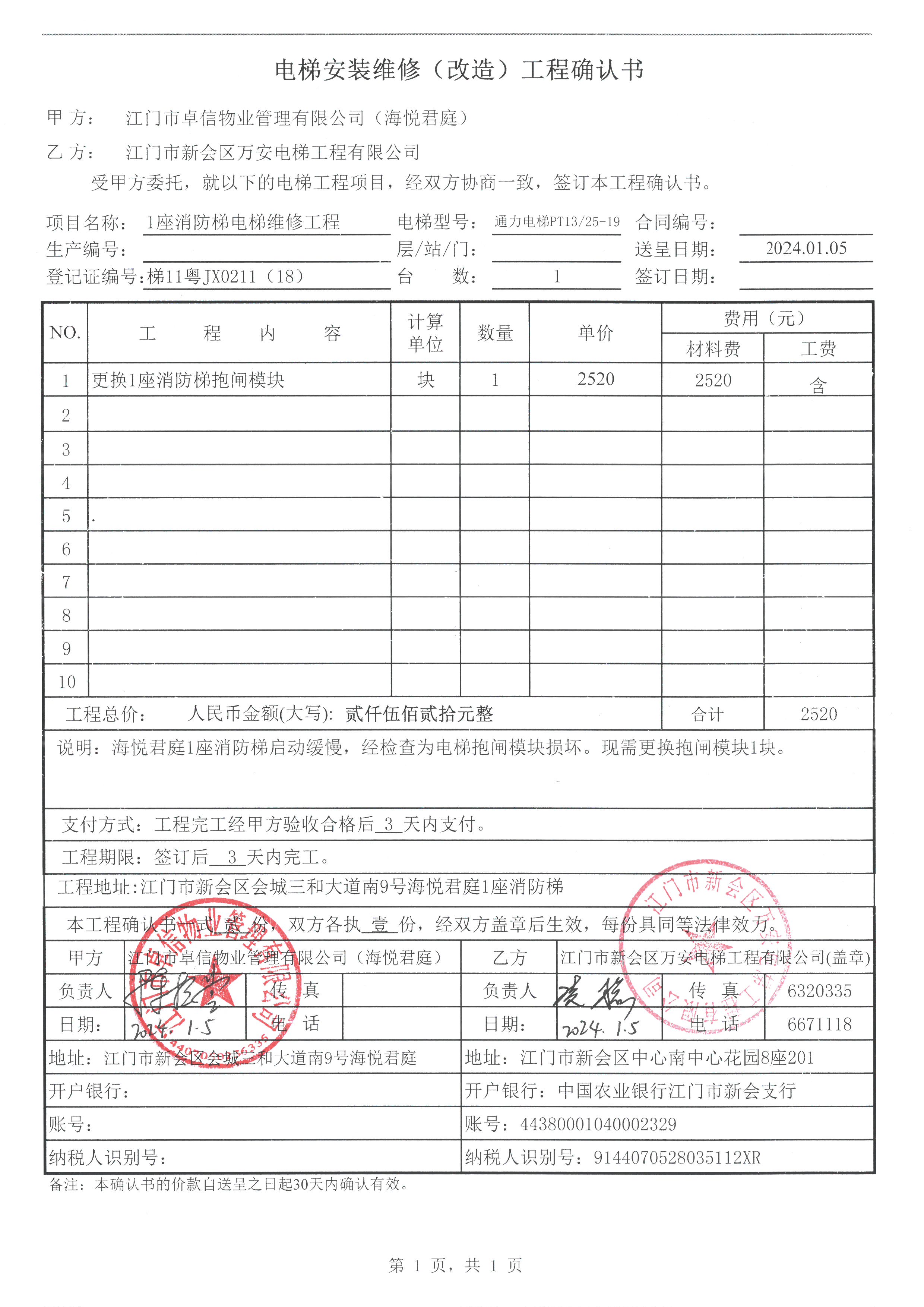 <td VALIGN="top" VALUES="" STYLE="border-width:0" BINDTYPE="0" ROWSPAN="19" COLSPAN="7" DATASOURCE="投票结果" ><font style="font-size:14pt;"><p style="white-space: normal; font-family: 宋体; line-height: 1.75em;">海悦君庭1座全体业主:</p><p style="white-space: normal; font-family: 宋体; line-height: 1.75em; text-indent: 2em;">本小区关于海悦君庭1座电梯(梯11粤JX0211(18) )更换抱闸模块使用维修资金的投票的投票已表决结束,询异时间从2024年01月23日开始,投票询异公示期间,业主可通过微信查询自己的表决情况或可凭身份证件申请查询自己的表决情况;如公示的业主表决情况与查询的本人表决意见不一致的,可以以书面形式向投票组织机构申诉,投票组织机构予以纠正并重新公示表决结果。异议提出人对投票组织机构的处理仍有异议的,可以向街道办事处(镇人民政府)反映处理,涉及住宅专项维修资金的,可向属地住宅专项维修资金管理中心反映处理。</p><p style="white-space: normal;"><br/></p><p style="white-space: normal; font-family: 宋体; line-height: 1.75em;"><strong>附件:</strong></p><p style="white-space: normal; font-family: 宋体; line-height: 1.75em;"><strong>一、投票范围</strong></p><p style="white-space: normal; font-family: 宋体; line-height: 1.75em; text-indent: 2em;">海悦君庭1座</p><p style="white-space: normal; font-family: 宋体; line-height: 1.75em; text-indent: 2em;">总人数(专有部分人数之和):116</p><p style="white-space: normal; font-family: 宋体; line-height: 1.75em; text-indent: 2em;"><span style="font-family: 宋体, SimSun;"><span style="font-family: 宋体; text-indent: 32px;"><span style="font-family: 宋体; text-indent: 32px;">总户数:116</span></span></span></p><p style="white-space: normal; font-family: 宋体; line-height: 1.75em; text-indent: 2em;">建筑物总面积(专有部分面积之和):12814.06㎡</p><p style="white-space: normal; font-family: 宋体; line-height: 1.75em;"><strong>二、询异公示起止时间</strong></p><p dir="ltr" style="white-space: normal; font-family: 宋体; line-height: 1.75em; text-indent: 2em;"><span style="text-indent: 36px;">2024年01月23日至2024年01月29日</span></p><p style="white-space: normal; font-family: 宋体; line-height: 1.75em;"><strong>三、投票详细描述</strong></p><p style="white-space: normal; font-family: 宋体; line-height: 1.75em; text-indent: 2em;"><p><span style=";font-family:Helvetica;letter-spacing:0;font-size:14px">本小区</span><span style=";font-family:Helvetica;letter-spacing:0;font-size:14px">1座的电梯(</span><span style=";font-family:Helvetica;letter-spacing:0;font-size:14px">梯</span><span style=";font-family:Helvetica;letter-spacing:0;font-size:14px">11粤JX0211(18)</span><span style=";font-family:Helvetica;letter-spacing:0;font-size:14px">)显示停止服务,经检查,是由于电梯启动缓慢,电梯抱闸模块损坏而不能正常运行,现需更换新的电梯抱闸模块。现对1座电梯(</span><span style=";font-family:Helvetica;letter-spacing:0;font-size:14px">梯</span><span style=";font-family:Helvetica;letter-spacing:0;font-size:14px">11粤JX0211(18)</span><span style=";font-family:Helvetica;letter-spacing:0;font-size:14px">)进行维修,工程维修预算金额为2520元,项目最终费用以施工合同签订金额为准。因已过保修期,维修费用由相关业主按建筑面积分摊,每平方约0.20元,详见公示附件。如有业主手机不能正常通过微信投票,请联系物业公司进行线下纸质投票,物业电话:0750-6667066。</span></p><p><br/></p></p><p style="white-space: normal; font-family: 宋体; line-height: 1.75em;"><strong>四、计票规则</strong></p><p style="white-space: normal; font-family: 宋体; line-height: 1.75em; text-indent: 2em;">表决事项:使用建筑物及其附属设施的维修资金<br /><p style='text-align: left; font-family: 宋体; font-size: 16px; line-height: 1.75em; text-indent: 2em;'>计票规则:弃权票不并入其它项 未表决票不并入其它项</p></p><p style="white-space: normal; font-family: 宋体; line-height: 1.75em;"><strong>五、通过规则</strong></p><p style="white-space: normal; font-family: 宋体; line-height: 1.75em;"><strong><strong style="white-space: normal;"><span style="font-family: 宋体, SimSun;"> 根据《中华人民共和国民法典》第二百七十八条规定:业主共同决定事项,应当由专有部分面积占比三分之二以上的业主且人数占比三分之二以上的业主参与表决。</span></strong></strong></p><p style="white-space: normal; font-family: 宋体; line-height: 1.75em; text-indent: 2em;">表决事项:使用建筑物及其附属设施的维修资金<br /><p style='text-align: left; font-family: 宋体; font-size: 16px; line-height: 1.75em; text-indent: 2em;'>通过规则:双2/3以上参与表决,参与表决双过半同意</p></p><p style="white-space: normal; font-family: 宋体; line-height: 1.75em;"><strong>六、投票结果</strong></p><p style="white-space: normal; font-family: 宋体; line-height: 1.75em; text-indent: 2em;"><div id='resultTable'><table style='table-layout: fixed; font-size:12px; margin-top:10px' width='100%' border='0' cellspacing='0' cellpadding='0'><tr><td height='28' colspan='10' align='center' style='border: 1px solid #666'><strong style='font-size: 14px;'> 使用建筑物及其附属设施的维修资金</strong></td> </tr><tr id='trfirst'><td height='28' colspan='4' style='border-left: 1px solid #666; border-bottom: 1px solid #666'><strong> 申报单位:</strong> 江门市卓信物业管理有限公司</td><td colspan='3' style='border-left: 1px solid #666; border-bottom: 1px solid #666'><strong> 联系方式:</strong> 7506170181 </td><td colspan='3' style='border-left: 1px solid #666; border-bottom: 1px solid #666; border-right: 1px solid #666'><strong> 申报日期:</strong> 2024年1月13