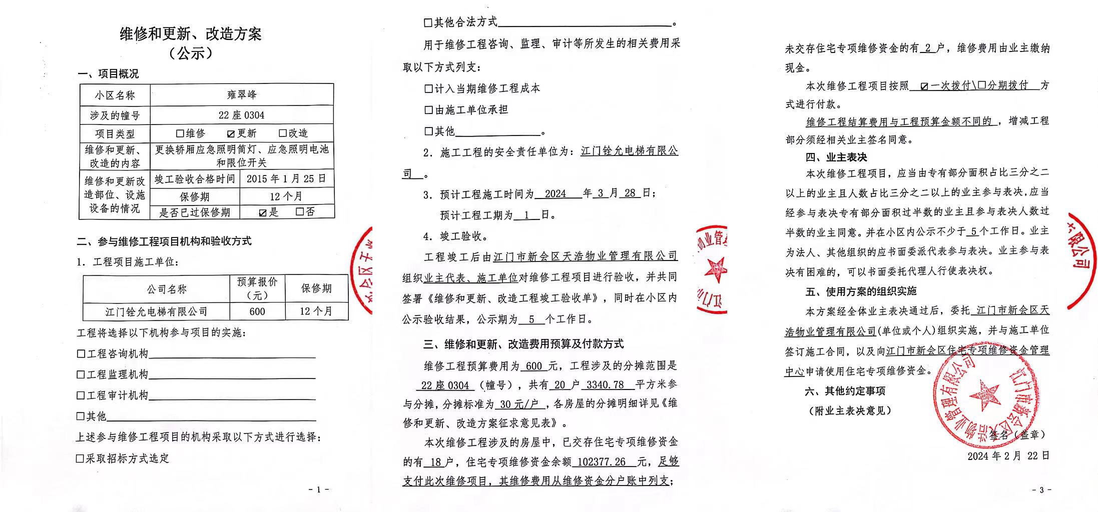 <td VALIGN="top" VALUES="" STYLE="border-width:0" BINDTYPE="0" ROWSPAN="19" COLSPAN="7" DATASOURCE="投票结果" ><font style="font-size:14pt;"><p style="white-space: normal; font-family: 宋体; line-height: 1.75em;">雍翠峰雍翠峰22座全体业主:</p><p style="white-space: normal; font-family: 宋体; line-height: 1.75em; text-indent: 2em;">本小区关于雍翠峰22座0304电梯【梯粤JX4554】更换轿厢应急照明筒灯、应急照明电池和限位开关使用维修资金的投票的投票已表决结束,询异时间从2024年03月21日开始,投票询异公示期间,业主可通过微信查询自己的表决情况或可凭身份证件申请查询自己的表决情况;如公示的业主表决情况与查询的本人表决意见不一致的,可以以书面形式向投票组织机构申诉,投票组织机构予以纠正并重新公示表决结果。异议提出人对投票组织机构的处理仍有异议的,可以向街道办事处(镇人民政府)反映处理,涉及住宅专项维修资金的,可向属地住宅专项维修资金管理中心反映处理。</p><p style="white-space: normal;"><br/></p><p style="white-space: normal; font-family: 宋体; line-height: 1.75em;"><strong>附件:</strong></p><p style="white-space: normal; font-family: 宋体; line-height: 1.75em;"><strong>一、投票范围</strong></p><p style="white-space: normal; font-family: 宋体; line-height: 1.75em; text-indent: 2em;">雍翠峰雍翠峰22座</p><p style="white-space: normal; font-family: 宋体; line-height: 1.75em; text-indent: 2em;">总人数(专有部分人数之和):19</p><p style="white-space: normal; font-family: 宋体; line-height: 1.75em; text-indent: 2em;"><span style="font-family: 宋体, SimSun;"><span style="font-family: 宋体; text-indent: 32px;"><span style="font-family: 宋体; text-indent: 32px;">总户数:20</span></span></span></p><p style="white-space: normal; font-family: 宋体; line-height: 1.75em; text-indent: 2em;">建筑物总面积(专有部分面积之和):3340.78㎡</p><p style="white-space: normal; font-family: 宋体; line-height: 1.75em;"><strong>二、询异公示起止时间</strong></p><p dir="ltr" style="white-space: normal; font-family: 宋体; line-height: 1.75em; text-indent: 2em;"><span style="text-indent: 36px;">2024年03月21日至2024年03月27日</span></p><p style="white-space: normal; font-family: 宋体; line-height: 1.75em;"><strong>三、投票详细描述</strong></p><p style="white-space: normal; font-family: 宋体; line-height: 1.75em; text-indent: 2em;"><p><span style="font-family: 宋体, SimSun;"> 小区22座0304电梯【梯粤JX4554】年检检查发现,轿厢筒灯老化灯光暗沉、应急电池故障失效(遇突发情况停电时提供照明,存在安全隐患),底坑限位开关锈蚀损坏,日常使用时间较长,自然磨损损坏导致。 现对22座0304电梯【梯粤JX4554】进行维修,工程维修预算金额为600元,项目最终费用以施工合同签订金额为准。因已过保修期,维修费用由相关业主按分户分摊,每户30元,详见公示附件。如业主手机不能正常通过微信投票,请联系物业公司进行线下纸质投票,物业电话:0750-6125500。</span></p></p><p style="white-space: normal; font-family: 宋体; line-height: 1.75em;"><strong>四、计票规则</strong></p><p style="white-space: normal; font-family: 宋体; line-height: 1.75em; text-indent: 2em;">表决事项:使用建筑物及其附属设施的维修资金<br /><p style='text-align: left; font-family: 宋体; font-size: 16px; line-height: 1.75em; text-indent: 2em;'>计票规则:弃权票不并入其它项 未表决票不并入其它项</p></p><p style="white-space: normal; font-family: 宋体; line-height: 1.75em;"><strong>五、通过规则</strong></p><p style="white-space: normal; font-family: 宋体; line-height: 1.75em;"><strong><strong style="white-space: normal;"><span style="font-family: 宋体, SimSun;"> 根据《中华人民共和国民法典》第二百七十八条规定:业主共同决定事项,应当由专有部分面积占比三分之二以上的业主且人数占比三分之二以上的业主参与表决。</span></strong></strong></p><p style="white-space: normal; font-family: 宋体; line-height: 1.75em; text-indent: 2em;">表决事项:使用建筑物及其附属设施的维修资金<br /><p style='text-align: left; font-family: 宋体; font-size: 16px; line-height: 1.75em; text-indent: 2em;'>通过规则:双2/3以上参与表决,参与表决双过半同意</p></p><p style="white-space: normal; font-family: 宋体; line-height: 1.75em;"><strong>六、投票结果</strong></p><p style="white-space: normal; font-family: 宋体; line-height: 1.75em; text-indent: 2em;"><div id='resultTable'><table style='table-layout: fixed; font-size:12px; margin-top:10px' width='100%' border='0' cellspacing='0' cellpadding='0'><tr><td height='28' colspan='10' align='center' style='border: 1px solid #666'><strong style='font-size: 14px;'> 使用建筑物及其附属设施的维修资金</strong></td> </tr><tr id='trfirst'><td height='28' colspan='4' style='border-left: 1px solid #666; border-bottom: 1px solid #666'><strong> 申报单位:</strong> 江门市新会区天浩物业管理有限公司</td><td colspan='3' style='border-left: 1px solid #666; border-bottom: 1px solid #666'><strong> 联系方式:</strong> </td><td colspan='3' style='border-left: 1px solid #666; border-bottom: 1px solid #666; border-right: 1px solid #666'><strong> 申报日期:</strong> 2024年2月22日 </td></tr><tr> <td height='28' colspan='5' style='border-left: 1px solid #666; border-bottom: 1px solid #666'><strong> 总人数(专有部分人数之和):</strong>19人 </td><td colspan='5' style='border-left: 1px solid #666; border-bottom: 1px solid #666; border-right: 1px solid #666'><strong> 建筑物总面积(专有部分面积之和):</strong>3340.78㎡ </td> </tr><tr><td height='28' colspan='10' bgcolor='#F3F3F3' style='border-left: 1px solid