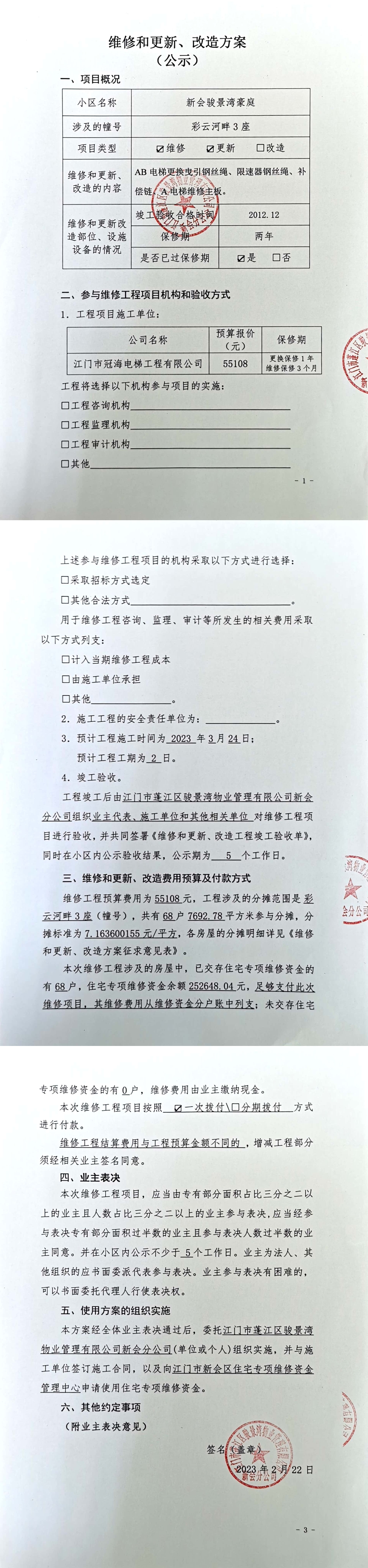<td VALIGN="top" VALUES="" STYLE="border-width:0" BINDTYPE="0" ROWSPAN="19" COLSPAN="7" DATASOURCE="投票结果" ><font style="font-size:14pt;"><p style="white-space: normal; font-family: 宋体; line-height: 1.75em;">新会骏景湾豪庭彩云河畔3座全体业主:</p><p style="white-space: normal; font-family: 宋体; line-height: 1.75em; text-indent: 2em;">本小区关于新会骏景湾豪庭小区彩云河畔3座AB电梯更换限速器钢丝绳、曳引式钢丝绳、补偿链、A电梯维修主板使用维修资金投票的投票已表决结束,询异时间从2023年03月14日开始,投票询异公示期间,业主可通过微信查询自己的表决情况或可凭身份证件申请查询自己的表决情况;如公示的业主表决情况与查询的本人表决意见不一致的,可以以书面形式向投票组织机构申诉,投票组织机构予以纠正并重新公示表决结果。异议提出人对投票组织机构的处理仍有异议的,可以向街道办事处(镇人民政府)反映处理,涉及住宅专项维修资金的,可向属地住宅专项维修资金管理中心反映处理。</p><p style="white-space: normal;"><br/></p><p style="white-space: normal; font-family: 宋体; line-height: 1.75em;"><strong>附件:</strong></p><p style="white-space: normal; font-family: 宋体; line-height: 1.75em;"><strong>一、投票范围</strong></p><p style="white-space: normal; font-family: 宋体; line-height: 1.75em; text-indent: 2em;">新会骏景湾豪庭彩云河畔3座</p><p style="white-space: normal; font-family: 宋体; line-height: 1.75em; text-indent: 2em;">总人数(专有部分人数之和):68</p><p style="white-space: normal; font-family: 宋体; line-height: 1.75em; text-indent: 2em;"><span style="font-family: 宋体, SimSun;">总户数:68</span></p><p style="white-space: normal; font-family: 宋体; line-height: 1.75em; text-indent: 2em;">建筑物总面积(专有部分面积之和):7692.78㎡</p><p style="white-space: normal; font-family: 宋体; line-height: 1.75em;"><strong>二、询异公示起止时间</strong></p><p dir="ltr" style="white-space: normal; font-family: 宋体; line-height: 1.75em; text-indent: 2em;"><span style="text-indent: 36px;">2023年03月14日至2023年03月20日</span></p><p style="white-space: normal; font-family: 宋体; line-height: 1.75em;"><strong>三、投票详细描述</strong></p><p style="white-space: normal; font-family: 宋体; line-height: 1.75em; text-indent: 2em;"><p>小区彩云河畔3座的AB电梯日常运行时出现同上同落、异响、上下时有轻微晃动,是由于A电梯主板故障,因使用时间较长,AB电梯曳引式钢丝绳部分生锈、限速器钢丝绳部分断股、补偿链出现磨损老化而存在安全隐患已过保修期。</p><p>现需申请使用维修基金对彩云河畔3座AB电梯进行维修,工程维修预算金额为55108元,项目最终费用以施工合同签订金额为准,维修费用的分摊标准为建筑面积分摊,每平方约:7.163600155元,详见公示附件。如业主手机不能正常通过微信投票,请联系物业公司进行线下纸质投票,物业电话:0750-6179992</p><p><br style="white-space: normal;"/></p><p><br/></p></p><p style="white-space: normal; font-family: 宋体; line-height: 1.75em;"><strong>四、计票规则</strong></p><p style="white-space: normal; font-family: 宋体; line-height: 1.75em; text-indent: 2em;">表决事项:使用建筑物及其附属设施的维修资金<br /><p style='text-align: left; font-family: 宋体; font-size: 16px; line-height: 1.75em; text-indent: 2em;'>计票规则:弃权票不并入其它项 未表决票不并入其它项</p></p><p style="white-space: normal; font-family: 宋体; line-height: 1.75em;"><strong>五、通过规则</strong></p><p style="white-space: normal; font-family: 宋体; line-height: 1.75em; text-indent: 2em;">表决事项:使用建筑物及其附属设施的维修资金<br /><p style='text-align: left; font-family: 宋体; font-size: 16px; line-height: 1.75em; text-indent: 2em;'>通过规则:参与表决专有部分面积过半数的业主且参与表决人数过半数的业主同意</p></p><p style="white-space: normal; font-family: 宋体; line-height: 1.75em;"><strong>六、投票结果</strong></p><p style="white-space: normal; font-family: 宋体; line-height: 1.75em; text-indent: 2em;"><div id='resultTable'><table style='table-layout: fixed; font-size:12px; margin-top:10px' width='100%' border='0' cellspacing='0' cellpadding='0'><tr><td height='28' colspan='10' align='center' style='border: 1px solid #666'><strong style='font-size: 14px;'> 使用建筑物及其附属设施的维修资金</strong></td> </tr><tr id='trfirst'><td height='28' colspan='4' style='border-left: 1px solid #666; border-bottom: 1px solid #666'><strong> 申报单位:</strong> 江门市蓬江区骏景湾物业管理有限公司新会分公司</td><td colspan='3' style='border-left: 1px solid #666; border-bottom: 1px solid #666'><strong> 联系方式:</strong> </td><td colspan='3' style='border-left: 1px solid #666; border-bottom: 1px solid #666; border-right: 1px solid #666'><strong> 申报日期:</strong> 2023年2月23日 </td></tr><tr> <td height='28' colspan='5' style='border-left: 1px solid #666; border-bottom: 1px solid #666'><strong> 总人数(专有部分人数之和):</strong>68人 </td><td colspan='5' style='border-left: 1px solid #666; border-bottom: 1px solid #666; border-right: 1px solid #666'><strong> 建筑物总面积(专有部分面积之和):</strong>7692.78㎡ </td> </tr><tr><td height='28' colspan='10' bgcolor='#F3F3F3' style='border-left: 1px solid #666;border-bottom: 1px solid #666;border-right: 1px solid #666'><strong> 参与人数及面积统计</strong></td></tr><tr><td height='28' colspan='5' style='border-left: 1px solid #666; border-bottom: 1px solid #666'><strong> 参与表决专有部分人数之和:</strong>52人</td><td colspan='5' style='border-left: 1px solid #666; border-bottom: 1px 