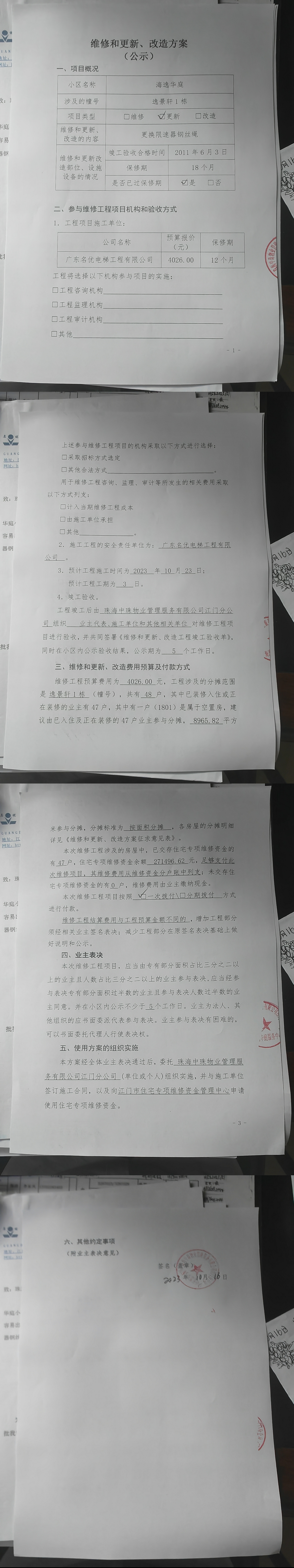 <td VALIGN="top" VALUES="" STYLE="border-width:0" BINDTYPE="0" ROWSPAN="19" COLSPAN="7" DATASOURCE="投票结果" ><font style="font-size:14pt;"><p style="white-space: normal; font-family: 宋体; line-height: 1.75em;">海逸华庭江海区外海海逸华庭逸景轩1幢全体业主:</p><p style="white-space: normal; font-family: 宋体; line-height: 1.75em; text-indent: 2em;">本小区关于海逸华庭逸景轩1栋客、货梯更换限速器钢丝绳的投票已表决结束,询异时间从2023年11月11日开始,投票询异公示期间,业主可通过微信查询自己的表决情况或可凭身份证件申请查询自己的表决情况;如公示的业主表决情况与查询的本人表决意见不一致的,可以以书面形式向投票组织机构申诉,投票组织机构予以纠正并重新公示表决结果。异议提出人对投票组织机构的处理仍有异议的,可以向街道办事处(镇人民政府)反映处理,涉及住宅专项维修资金的,可向属地住宅专项维修资金管理中心反映处理。</p><p style="white-space: normal;"><br/></p><p style="white-space: normal; font-family: 宋体; line-height: 1.75em;"><strong>附件:</strong></p><p style="white-space: normal; font-family: 宋体; line-height: 1.75em;"><strong>一、投票范围</strong></p><p style="white-space: normal; font-family: 宋体; line-height: 1.75em; text-indent: 2em;">海逸华庭江海区外海海逸华庭逸景轩1幢</p><p style="white-space: normal; font-family: 宋体; line-height: 1.75em; text-indent: 2em;">总人数(专有部分人数之和):47</p><p style="white-space: normal; font-family: 宋体; line-height: 1.75em; text-indent: 2em;"><span style="font-family: 宋体, SimSun;">总户数:47</span></p><p style="white-space: normal; font-family: 宋体; line-height: 1.75em; text-indent: 2em;">建筑物总面积(专有部分面积之和):8965.82㎡</p><p style="white-space: normal; font-family: 宋体; line-height: 1.75em;"><strong>二、询异公示起止时间</strong></p><p dir="ltr" style="white-space: normal; font-family: 宋体; line-height: 1.75em; text-indent: 2em;"><span style="text-indent: 36px;">2023年11月11日至2023年11月17日</span></p><p style="white-space: normal; font-family: 宋体; line-height: 1.75em;"><strong>三、投票详细描述</strong></p><p style="white-space: normal; font-family: 宋体; line-height: 1.75em; text-indent: 2em;"><p>本小区海逸华庭逸景轩1栋的客、货梯,在电梯日常检查中,发现该栋楼两部电梯限速器钢丝绳严重锈蚀现象,造成钢丝绳容易打滑,继续发展下去容易引发脆性断裂,需对该栋两部电梯限速器钢丝绳进行更换,已过保修期。现需申请使用维修资金对海逸华庭逸景轩1栋客、货梯维修,工程维修预算金额为4026元,项目最终费用以施工合同签订金额为准,维修费用的分摊标准为按建筑面积分摊,每平方约:0.45元,详细公示附件。如业主手机不能通过正常的微信投票,请联系物业服务中心进行线下或短信投票,物业服务中心电话:0750-3776333。</p></p><p style="white-space: normal; font-family: 宋体; line-height: 1.75em;"><strong>四、计票规则</strong></p><p style="white-space: normal; font-family: 宋体; line-height: 1.75em; text-indent: 2em;">表决事项:使用建筑物及其附属设施的维修资金<br /><p style='text-align: left; font-family: 宋体; font-size: 16px; line-height: 1.75em; text-indent: 2em;'>计票规则:弃权票不并入其它项 未表决票不并入其它项</p></p><p style="white-space: normal; font-family: 宋体; line-height: 1.75em;"><strong>五、通过规则</strong></p><p style="white-space: normal; font-family: 宋体; line-height: 1.75em;"><strong><strong style="white-space: normal;"><span style="font-family: 宋体, SimSun;">&nbsp; 根据《中华人民共和国民法典》第二百七十八条规定:业主共同决定事项,应当由专有部分面积占比三分之二以上的业主且人数占比三分之二以上的业主参与表决。</span></strong></strong></p><p style="white-space: normal; font-family: 宋体; line-height: 1.75em; text-indent: 2em;">表决事项:使用建筑物及其附属设施的维修资金<br /><p style='text-align: left; font-family: 宋体; font-size: 16px; line-height: 1.75em; text-indent: 2em;'>通过规则:参与表决专有部分面积过半数的业主且参与表决人数过半数的业主同意</p></p><p style="white-space: normal; font-family: 宋体; line-height: 1.75em;"><strong>六、投票结果</strong></p><p style="white-space: normal; font-family: 宋体; line-height: 1.75em; text-indent: 2em;"><div id='resultTable'><table style='table-layout: fixed; font-size:12px; margin-top:10px' width='100%' border='0' cellspacing='0' cellpadding='0'><tr><td height='28' colspan='10' align='center' style='border: 1px solid #666'><strong style='font-size: 14px;'> 使用建筑物及其附属设施的维修资金</strong></td> </tr><tr id='trfirst'><td height='28' colspan='4' style='border-left: 1px solid #666; border-bottom: 1px solid #666'><strong> 申报单位:</strong> 珠海中珠物业管理服务有限公司江门分公司</td><td colspan='3' style='border-left: 1px solid #666; border-bottom: 1px solid #666'><strong> 联系方式:</strong> 3181899 </td><td colspan='3' style='border-left: 1px solid #666; border-bottom: 1px solid #666; border-right: 1px solid #666'><strong> 申报日期:</strong> 2023年10月16日 </td></tr><tr> <td height='28' colspan='5' style='border-left: 1px solid #666; border-bottom: 1px solid #666'><strong> 总人数(专有部分人数之和):</strong>47人 </td><td colspan='5' style='border-left: 1px solid #666; border-bottom: 1px solid #666; border-right: 1px solid #666'><strong> 建筑物总面积(专有部分面积之和):</strong>8965.82㎡ </td> </tr><tr><td height='28' colspan='10' bgcolor='#F3F3F3' style='border-left: 1px solid #666;border-bottom: 1px solid #666;border-right: 1