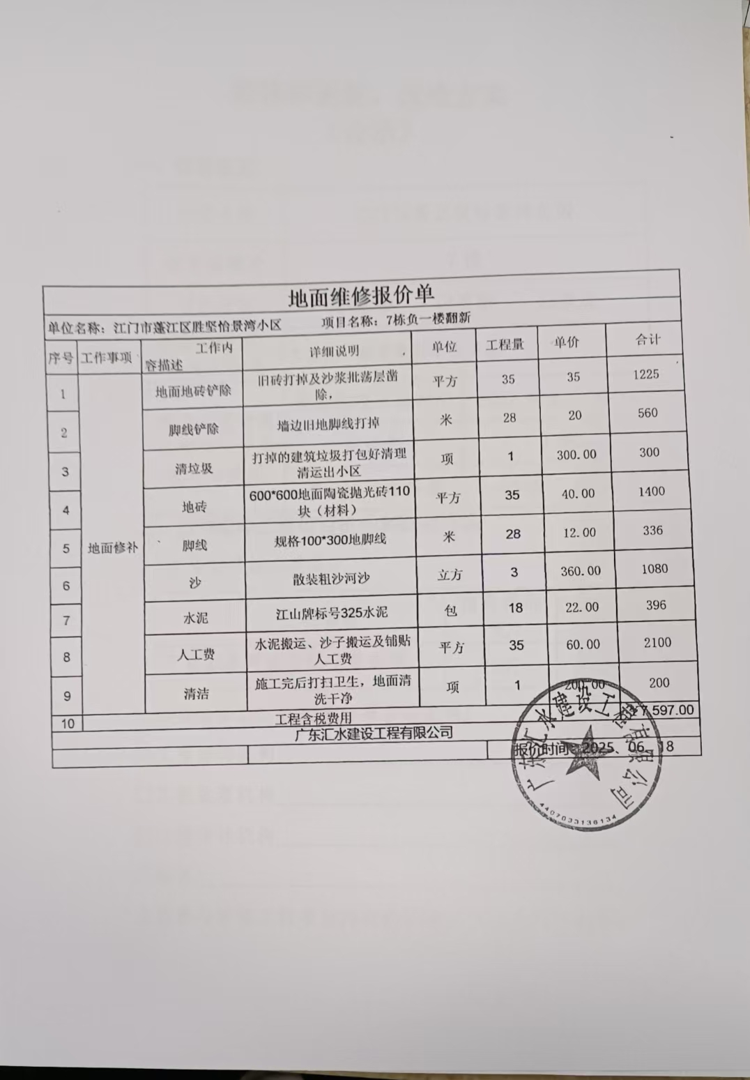 <td VALIGN="top" VALUES="" STYLE="border-width:0" BINDTYPE="0" ROWSPAN="17" COLSPAN="7" DATASOURCE="投票结果" ><font style=" font-family:方正小标宋简体;font-size:14pt;"><p style="line-height: 1.75em;"><span style="font-family: 宋体, SimSun;">各位尊敬的业主:</span><br/></p><p style="text-indent: 2em; line-height: 1.75em;"><span style="font-family: 宋体, SimSun;">根据法律法规的规定,本小区业主利用“江门市物业事项表决管理系统”已对本小区公共事务决策事项(<span style="font-family: 宋体; text-indent: 32px;">蓬江区怡景湾7幢负一地面翻新维修工程使用维修资金的投票</span>)进行了表决,在经过7日的询异公示期后,未收到业主有效的异议。现将投票结果公告,并就产生的法律效力说明如下:</span></p><p style="line-height: 1.75em; text-indent: 0em;"><strong style="text-indent: 2em;"><span style="font-family: 宋体, SimSun;">一、投票范围</span></strong></p><p style="text-indent: 2em; line-height: 1.75em;"><span style="font-family: 宋体, SimSun;">蓬江区怡景湾蓬江区怡景湾花园7幢</span></p><p style="text-indent: 2em; line-height: 1.75em;"><span style="font-family: 宋体, SimSun;">总人数(专有部分人数之和):67</span></p><p style="text-indent: 2em; line-height: 1.75em;"><span style="font-family: 宋体, SimSun;"><span style="font-family: 宋体, SimSun; text-indent: 32px;"><span style="font-family: 宋体; text-indent: 32px;"><span style="font-family: 宋体; text-indent: 32px;">总户数:67</span></span></span></span></p><p style="text-indent: 2em; line-height: 1.75em;"><span style="font-family: 宋体, SimSun;">建筑物总面积(专有部分面积之和):8028.61㎡</span></p><p style="line-height: 1.75em;"><strong><span style="font-family: 宋体, SimSun;">二、投票结果公告时间</span></strong></p><p style="text-indent: 2em; line-height: 1.75em;"><span style="font-family: 宋体, SimSun;"><span style="font-family: 宋体, SimSun; text-indent: 32px;">从2025年08月10日开始</span></span></p><p style="line-height: 1.75em;"><strong><span style="font-family: 宋体, SimSun;">三、计票规则</span></strong></p><p style="text-indent: 2em; line-height: 1.75em;"><span style="font-family: 宋体, SimSun;">表决事项:使用建筑物及其附属设施的维修资金<br /><p style='font-family: 宋体, SimSun;line-height: 1.75em; text-indent: 2em;'>计票规则:弃权票不并入其它项&nbsp;&nbsp;&nbsp;&nbsp;未表决票不并入其它项</p></span></p><p style="line-height: 1.75em;"><strong><span style="font-family: 宋体, SimSun;">四、通过规则</span></strong></p><p style="line-height: 1.75em;"><strong><span style="font-family: 宋体, SimSun;">&nbsp; 根据《中华人民共和国民法典》第二百七十八条规定:业主共同决定事项,应当由专有部分面积占比三分之二以上的业主且人数占比三分之二以上的业主参与表决。</span></strong></p><p style="text-indent: 2em; line-height: 1.75em;"><span style="font-family: 宋体, SimSun;"><span style="font-family: 宋体, SimSun; text-indent: 32px;">表决事项:使用建筑物及其附属设施的维修资金<br /><p style='font-family: 宋体, SimSun;line-height: 1.75em; text-indent: 2em;'>通过规则:双2/3以上参与表决,参与表决双过半同意</p></span></span></p><p style="line-height: 1.75em;"><strong><span style="font-family: 宋体, SimSun;">五、投票结果</span></strong></p><p style="line-height: 1.75em; text-indent: 2em;"><span style="font-family: 宋体, SimSun; text-indent: 2em;"><div id='resultTable'><table style='table-layout: fixed; font-size:12px; margin-top:10px' width='100%' border='0' cellspacing='0' cellpadding='0'><tr><td height='28' colspan='10' align='center' style='border: 1px solid #666'><strong style='font-size: 14px;'> 使用建筑物及其附属设施的维修资金</strong></td> </tr><tr id='trfirst'><td height='28' colspan='4' style='border-left: 1px solid #666; border-bottom: 1px solid #666'><strong>&nbsp;申报单位:</strong> 江门市灏宇物业管理有限公司</td><td colspan='3' style='border-left: 1px solid #666; border-bottom: 1px solid #666'><strong>&nbsp;联系方式:</strong> </td><td colspan='3' style='border-left: 1px solid #666; border-bottom: 1px solid #666; border-right: 1px solid #666'><strong>&nbsp;申报日期:</strong> 2025年7月8日 </td></tr><tr> <td height='28' colspan='5' style='border-left: 1px solid #666; border-bottom: 1px solid #666'><strong>&nbsp;列支总人数(专有部分人数之和):</strong>67人 </td><td colspan='5' style='border-left: 1px solid #666; border-bottom: 1px solid #666; border-right: 1px solid #666'><strong>&nbsp;列支建筑物总面积(专有部分面积之和):</strong>8028.61㎡ </td> </tr><tr><td height='28' colspan='10' bgcolor='#F3F3F3' style='border-left: 1px solid #666;border-bottom: 1px solid #666;border-right: 1px solid #666'><strong>&nbsp;参与表决人数及面积统计</strong></td></tr><tr><td height='28' colspan='5' style='border-left: 1px solid #666; border-bottom: 1px solid #666'><strong>&nbsp;参与表决人数:</strong>51人</td><td colspan='5' style='border-left: 1px solid #666; border-bottom: 1px solid #666; border-right: 1px solid #666'><strong>&nbsp;参与表决人数占总人数比例:</strong>76.12%</td></tr><tr><td height='28' colspan='5' style='border-left: 1px solid #666; border-bottom: 1px solid #666'><strong>&nbsp;参与表决面积:</strong>6088.97㎡</td><td colspan='5' style='border-left: 1px solid #666; border-bottom: 1px solid #666; border-right: 1px solid #666'><strong>&nbsp;参与表决面积占总面积比例:</strong>75.84%</td></tr><tr><td height='28' colspan='10' bgcolor='#F3F3F3' style='border-left: 1px solid #666; border-bottom: 1px solid #666;border-right: 1px solid #666'> <strong>&nbsp;参与表决同意人数及面积统计</strong></td> </tr><tr><td height='28' colspan='5' style='border-left: 1px solid #666; bo