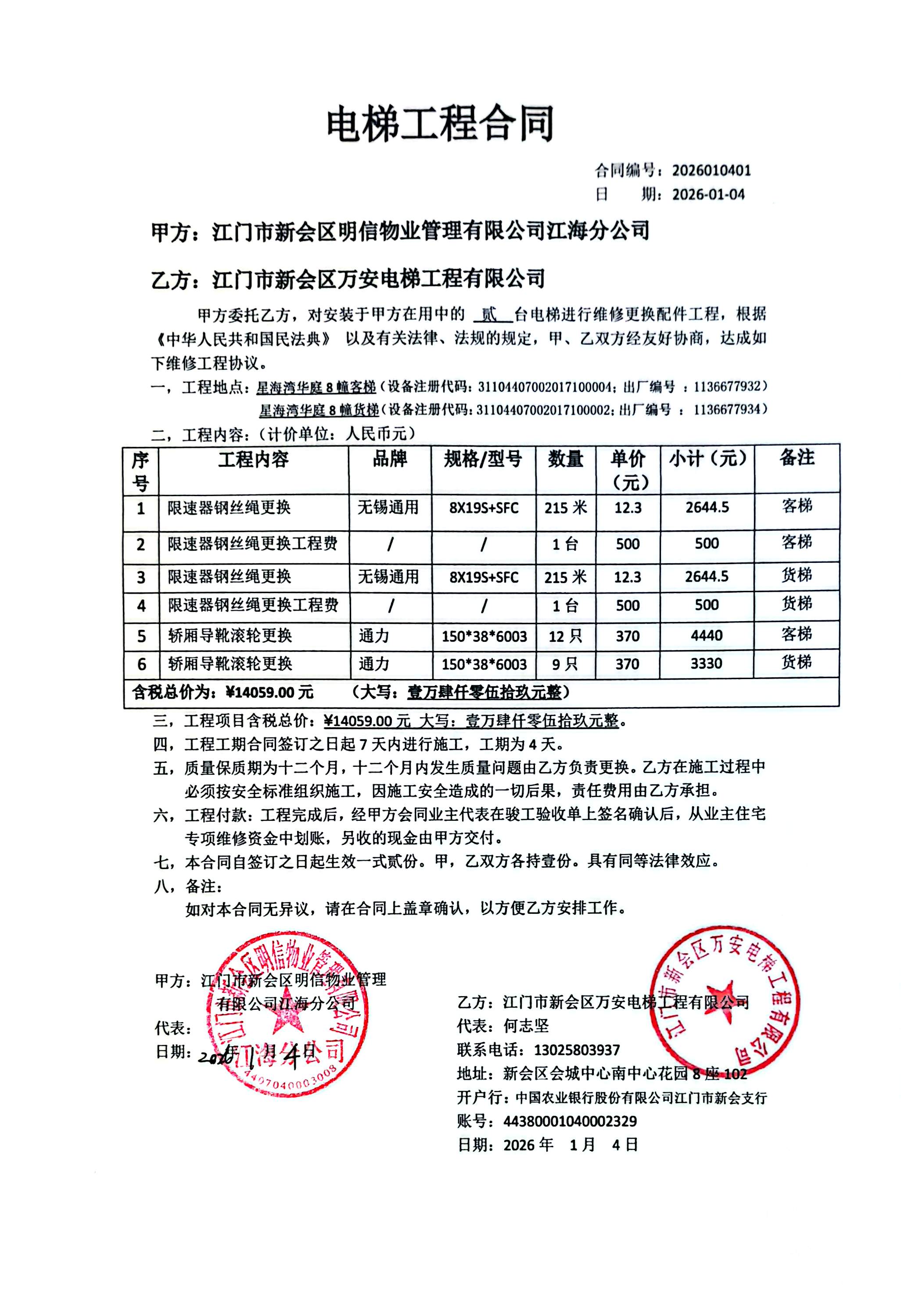 <td VALIGN="top" VALUES="" STYLE="border-width:0" BINDTYPE="0" ROWSPAN="19" COLSPAN="7" DATASOURCE="投票结果" ><font style="font-size:14pt;"><p style="white-space: normal; font-family: 宋体; line-height: 1.75em;">星海湾华庭江海区星海湾华庭8幢全体业主:</p><p style="white-space: normal; font-family: 宋体; line-height: 1.75em; text-indent: 2em;">本小区关于星海湾华庭小区8栋客梯、货梯更换限速器钢丝绳、轿厢导靴滚轮申请住宅专项维修资金的投票的投票已表决结束,询异时间从2026年02月14日开始,投票询异公示期间,业主可通过微信查询自己的表决情况或可凭身份证件申请查询自己的表决情况;如公示的业主表决情况与查询的本人表决意见不一致的,可以以书面形式向投票组织机构申诉,投票组织机构予以纠正并重新公示表决结果。异议提出人对投票组织机构的处理仍有异议的,可以向街道办事处(镇人民政府)反映处理,涉及住宅专项维修资金的,可向属地住宅专项维修资金管理中心反映处理。</p><p style="white-space: normal;"><br/></p><p style="white-space: normal; font-family: 宋体; line-height: 1.75em;"><strong>附件:</strong></p><p style="white-space: normal; font-family: 宋体; line-height: 1.75em;"><strong>一、投票范围</strong></p><p style="white-space: normal; font-family: 宋体; line-height: 1.75em; text-indent: 2em;">星海湾华庭江海区星海湾华庭8幢</p><p style="white-space: normal; font-family: 宋体; line-height: 1.75em; text-indent: 2em;">总人数(专有部分人数之和):132</p><p style="white-space: normal; font-family: 宋体; line-height: 1.75em; text-indent: 2em;"><span style="font-family: 宋体, SimSun;"><span style="font-family: 宋体; text-indent: 32px;"><span style="font-family: 宋体; text-indent: 32px;">总户数:132</span></span></span></p><p style="white-space: normal; font-family: 宋体; line-height: 1.75em; text-indent: 2em;">建筑物总面积(专有部分面积之和):12728.66㎡</p><p style="white-space: normal; font-family: 宋体; line-height: 1.75em;"><strong>二、询异公示起止时间</strong></p><p dir="ltr" style="white-space: normal; font-family: 宋体; line-height: 1.75em; text-indent: 2em;"><span style="text-indent: 36px;">2026年02月14日至2026年02月21日</span></p><p style="white-space: normal; font-family: 宋体; line-height: 1.75em;"><strong>三、投票详细描述</strong></p><p style="white-space: normal; font-family: 宋体; line-height: 1.75em; text-indent: 2em;"><p> 2026年1月4日<span style="font-size: 14px; text-wrap-mode: wrap; background-color: rgb(255, 255, 255); font-family: 宋体;">小区</span>8幢电梯进行年度检测:两台电梯限速器钢丝绳已磨损较严重,客梯、货梯轿厢导靴滚轮老化,须及时更换两台限速器钢丝绳、轿厢导靴滚轮,为了消除安全隐患,尽快更换上述部件,避免造成电梯检测不合格停用。<br/> 现对小区8幢客梯、货梯进行维修,工程维修预算金额为14059元,项目最终费用以施工合同签订金额为准。因已过保修期,维修费用由相关业主按自定义分摊,详见公示附件。如业主手机不能正常通过微信投票,请联系物业公司进行线下纸质投票,物业电话:0750-3899108。</p></p><p style="white-space: normal; font-family: 宋体; line-height: 1.75em;"><strong>四、计票规则</strong></p><p style="white-space: normal; font-family: 宋体; line-height: 1.75em; text-indent: 2em;">表决事项:使用建筑物及其附属设施的维修资金<br /><p style='text-align: left; font-family: 宋体; font-size: 16px; line-height: 1.75em; text-indent: 2em;'>计票规则:弃权票不并入其它项 未表决票不并入其它项</p></p><p style="white-space: normal; font-family: 宋体; line-height: 1.75em;"><strong>五、通过规则</strong></p><p style="white-space: normal; font-family: 宋体; line-height: 1.75em;"><strong><strong style="white-space: normal;"><span style="font-family: 宋体, SimSun;"> 根据《中华人民共和国民法典》第二百七十八条规定:业主共同决定事项,应当由专有部分面积占比三分之二以上的业主且人数占比三分之二以上的业主参与表决。</span></strong></strong></p><p style="white-space: normal; font-family: 宋体; line-height: 1.75em; text-indent: 2em;">表决事项:使用建筑物及其附属设施的维修资金<br /><p style='text-align: left; font-family: 宋体; font-size: 16px; line-height: 1.75em; text-indent: 2em;'>通过规则:双2/3以上参与表决,参与表决双过半同意</p></p><p style="white-space: normal; font-family: 宋体; line-height: 1.75em;"><strong>六、投票结果</strong></p><p style="white-space: normal; font-family: 宋体; line-height: 1.75em; text-indent: 2em;"><div id='resultTable'><table style='table-layout: fixed; font-size:12px; margin-top:10px' width='100%' border='0' cellspacing='0' cellpadding='0'><tr><td height='28' colspan='10' align='center' style='border: 1px solid #666'><strong style='font-size: 14px;'> 使用建筑物及其附属设施的维修资金</strong></td> </tr><tr id='trfirst'><td height='28' colspan='4' style='border-left: 1px solid #666; border-bottom: 1px solid #666'><strong> 申报单位:</strong> 江门市新会区明信物业管理有限公司</td><td colspan='3' style='border-left: 1px solid #666; border-bottom: 1px solid #666'><strong> 联系方式:</strong> </td><td colspan='3' style='border-left: 1px solid #666; border-bottom: 1px solid #666; border-right: 1px solid #666'><strong> 申报日期:</strong> 2026年1月9日 </td></tr><tr> <td height='28' colspan='5' style='border-left: 1px solid #666; border-bottom: 1px solid #666'><strong> 总人数(专有部分人数之和):</strong>132人 </td><td colspan='5' style='border-left: 1px solid #666; border-bottom: 1px solid #666; border-right: 1px solid #666'><strong> 建筑物总面积(专有部