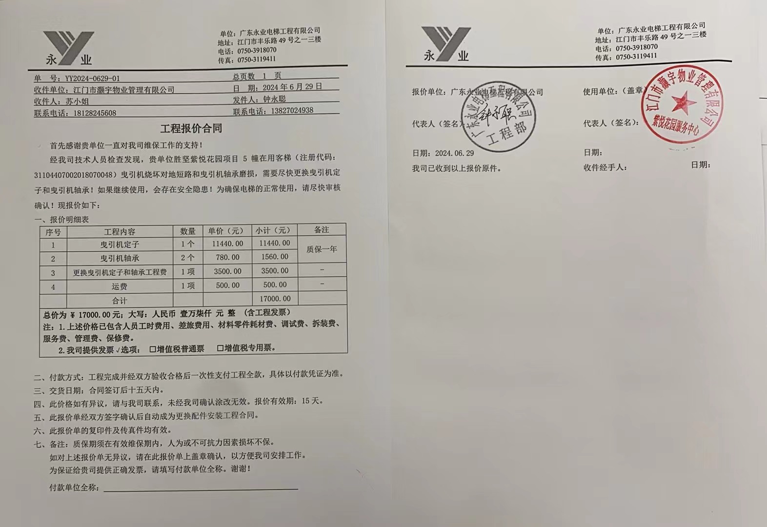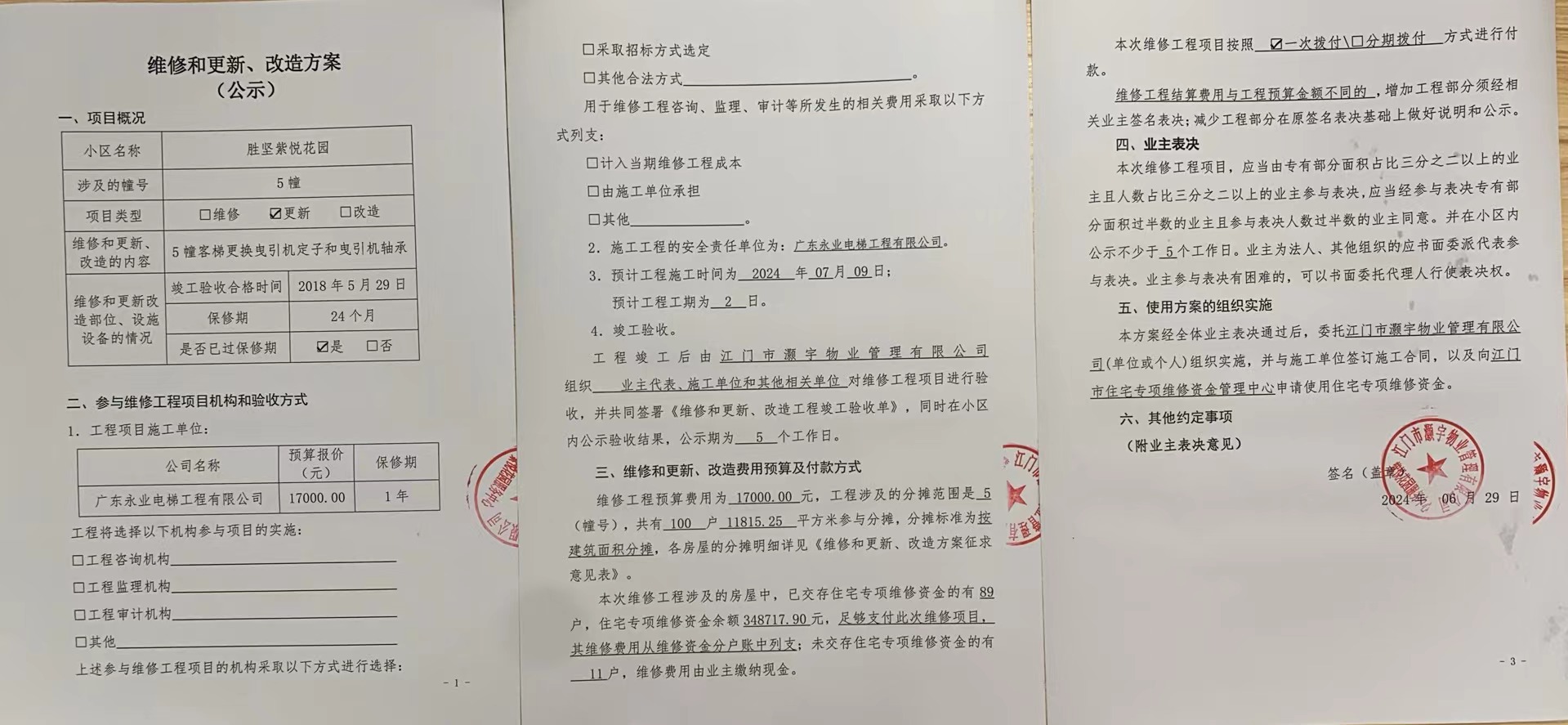 <td VALIGN="top" VALUES="" STYLE="border-width:0" BINDTYPE="0" ROWSPAN="19" COLSPAN="7" DATASOURCE="投票结果" ><font style="font-size:14pt;"><p style="white-space: normal; font-family: 宋体; line-height: 1.75em;">蓬江区胜坚紫悦花园蓬江区胜坚紫悦花园5幢全体业主:</p><p style="white-space: normal; font-family: 宋体; line-height: 1.75em; text-indent: 2em;">本小区关于蓬江区胜坚紫悦花园5幢客梯更换曳引机定子和曳引机轴承使用维修资金的投票的投票已表决结束,询异时间从2024年07月11日开始,投票询异公示期间,业主可通过微信查询自己的表决情况或可凭身份证件申请查询自己的表决情况;如公示的业主表决情况与查询的本人表决意见不一致的,可以以书面形式向投票组织机构申诉,投票组织机构予以纠正并重新公示表决结果。异议提出人对投票组织机构的处理仍有异议的,可以向街道办事处(镇人民政府)反映处理,涉及住宅专项维修资金的,可向属地住宅专项维修资金管理中心反映处理。</p><p style="white-space: normal;"><br/></p><p style="white-space: normal; font-family: 宋体; line-height: 1.75em;"><strong>附件:</strong></p><p style="white-space: normal; font-family: 宋体; line-height: 1.75em;"><strong>一、投票范围</strong></p><p style="white-space: normal; font-family: 宋体; line-height: 1.75em; text-indent: 2em;">蓬江区胜坚紫悦花园蓬江区胜坚紫悦花园5幢</p><p style="white-space: normal; font-family: 宋体; line-height: 1.75em; text-indent: 2em;">总人数(专有部分人数之和):97</p><p style="white-space: normal; font-family: 宋体; line-height: 1.75em; text-indent: 2em;"><span style="font-family: 宋体, SimSun;"><span style="font-family: 宋体; text-indent: 32px;"><span style="font-family: 宋体; text-indent: 32px;">总户数:100</span></span></span></p><p style="white-space: normal; font-family: 宋体; line-height: 1.75em; text-indent: 2em;">建筑物总面积(专有部分面积之和):11815.25㎡</p><p style="white-space: normal; font-family: 宋体; line-height: 1.75em;"><strong>二、询异公示起止时间</strong></p><p dir="ltr" style="white-space: normal; font-family: 宋体; line-height: 1.75em; text-indent: 2em;"><span style="text-indent: 36px;">2024年07月11日至2024年07月17日</span></p><p style="white-space: normal; font-family: 宋体; line-height: 1.75em;"><strong>三、投票详细描述</strong></p><p style="white-space: normal; font-family: 宋体; line-height: 1.75em; text-indent: 2em;"><p><span style="font-family: "Helvetica Neue", Helvetica, Arial, sans-serif; font-size: 14px; text-wrap: wrap; background-color: rgb(255, 255, 255);">本小区5幢客梯曳引机定子和曳引机轴承故障,现无法正常使用。现需申请使用维修资金对5幢客梯进行维修,更换金额为:17000.00元,项目最终费用以报价合同签订金额为准。因已过保修期,维修费用由相关业主按建筑面积分摊,每平方约1.44元,详见公示附件。如业主手机不能正常通过微信投票,请联系物业公司进行线下纸质投票,物业电话:0750-3339221。</span></p></p><p style="white-space: normal; font-family: 宋体; line-height: 1.75em;"><strong>四、计票规则</strong></p><p style="white-space: normal; font-family: 宋体; line-height: 1.75em; text-indent: 2em;">表决事项:使用建筑物及其附属设施的维修资金<br /><p style='text-align: left; font-family: 宋体; font-size: 16px; line-height: 1.75em; text-indent: 2em;'>计票规则:弃权票不并入其它项 未表决票不并入其它项</p></p><p style="white-space: normal; font-family: 宋体; line-height: 1.75em;"><strong>五、通过规则</strong></p><p style="white-space: normal; font-family: 宋体; line-height: 1.75em;"><strong><strong style="white-space: normal;"><span style="font-family: 宋体, SimSun;"> 根据《中华人民共和国民法典》第二百七十八条规定:业主共同决定事项,应当由专有部分面积占比三分之二以上的业主且人数占比三分之二以上的业主参与表决。</span></strong></strong></p><p style="white-space: normal; font-family: 宋体; line-height: 1.75em; text-indent: 2em;">表决事项:使用建筑物及其附属设施的维修资金<br /><p style='text-align: left; font-family: 宋体; font-size: 16px; line-height: 1.75em; text-indent: 2em;'>通过规则:双2/3以上参与表决,参与表决双过半同意</p></p><p style="white-space: normal; font-family: 宋体; line-height: 1.75em;"><strong>六、投票结果</strong></p><p style="white-space: normal; font-family: 宋体; line-height: 1.75em; text-indent: 2em;"><div id='resultTable'><table style='table-layout: fixed; font-size:12px; margin-top:10px' width='100%' border='0' cellspacing='0' cellpadding='0'><tr><td height='28' colspan='10' align='center' style='border: 1px solid #666'><strong style='font-size: 14px;'> 使用建筑物及其附属设施的维修资金</strong></td> </tr><tr id='trfirst'><td height='28' colspan='4' style='border-left: 1px solid #666; border-bottom: 1px solid #666'><strong> 申报单位:</strong> 江门市灏宇物业管理有限公司</td><td colspan='3' style='border-left: 1px solid #666; border-bottom: 1px solid #666'><strong> 联系方式:</strong> </td><td colspan='3' style='border-left: 1px solid #666; border-bottom: 1px solid #666; border-right: 1px solid #666'><strong> 申报日期:</strong> 2024年6月30日 </td></tr><tr> <td height='28' colspan='5' style='border-left: 1px solid #666; border-bottom: 1px solid #666'><strong> 总人数(专有部分人数之和):</strong>97人 </td><td colspan='5' style='border-left: 1px solid #666; border-bottom: 1px solid #666; border-right: 1px solid #666'><strong> 建筑物总面积(专有部分面积之和):</strong>11815.25㎡ </td> </tr><tr><td height='28' colspan='10' bgcolor='#F3F3F3' style='border-left: 1px solid #666;border-bottom: 1px so