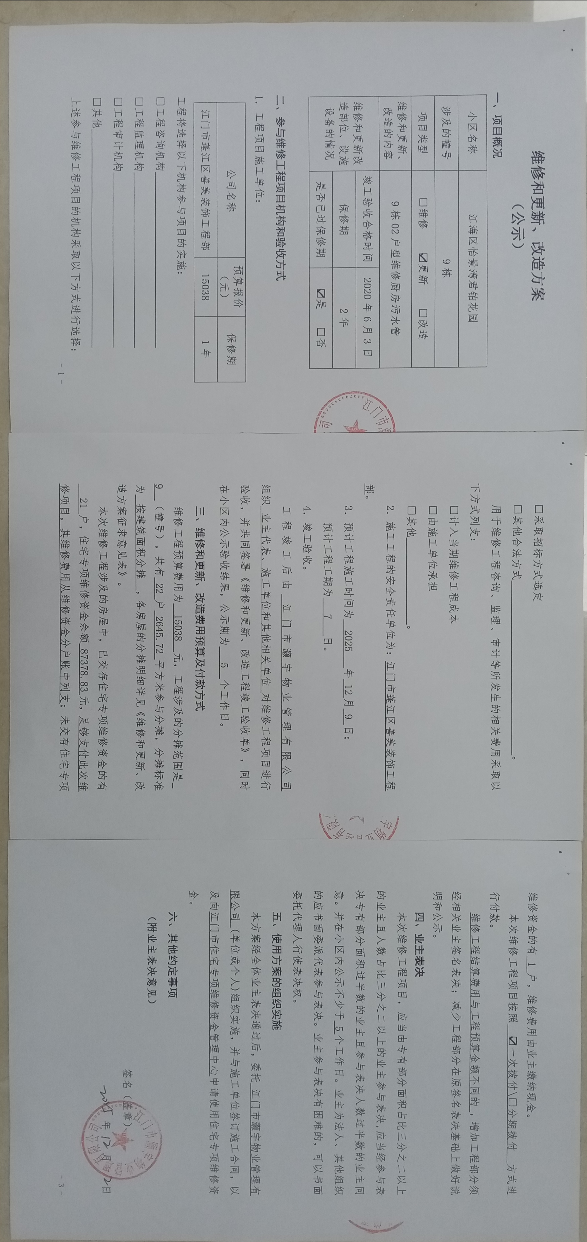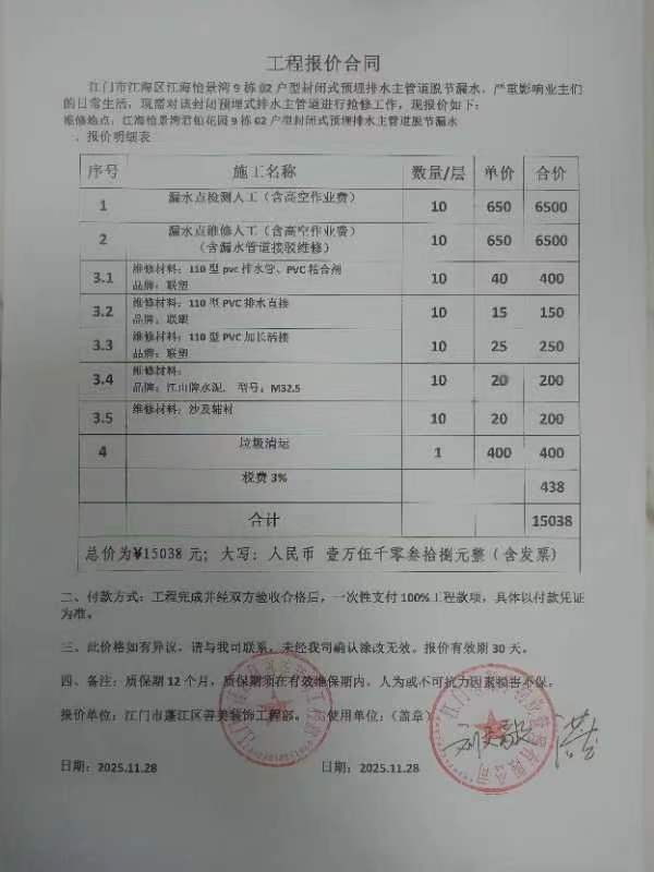 <td VALIGN="top" VALUES="" STYLE="border-width:0" BINDTYPE="0" ROWSPAN="17" COLSPAN="7" DATASOURCE="投票结果" ><font style=" font-family:方正小标宋简体;font-size:14pt;"><p style="line-height: 1.75em;"><span style="font-family: 宋体, SimSun;">各位尊敬的业主:</span><br/></p><p style="text-indent: 2em; line-height: 1.75em;"><span style="font-family: 宋体, SimSun;">根据法律法规的规定,本小区业主利用“江门市物业事项表决管理系统”已对本小区公共事务决策事项(<span style="font-family: 宋体; text-indent: 32px;">江海怡景湾君铂花园9栋02户型维修厨房污水管使用维修资金的投票</span>)进行了表决,在经过7日的询异公示期后,未收到业主有效的异议。现将投票结果公告,并就产生的法律效力说明如下:</span></p><p style="line-height: 1.75em; text-indent: 0em;"><strong style="text-indent: 2em;"><span style="font-family: 宋体, SimSun;">一、投票范围</span></strong></p><p style="text-indent: 2em; line-height: 1.75em;"><span style="font-family: 宋体, SimSun;">江门市江海区怡景湾君铂花园江门市江海区怡景湾君铂花园9栋</span></p><p style="text-indent: 2em; line-height: 1.75em;"><span style="font-family: 宋体, SimSun;">总人数(专有部分人数之和):22</span></p><p style="text-indent: 2em; line-height: 1.75em;"><span style="font-family: 宋体, SimSun;"><span style="font-family: 宋体, SimSun; text-indent: 32px;"><span style="font-family: 宋体; text-indent: 32px;"><span style="font-family: 宋体; text-indent: 32px;">总户数:22</span></span></span></span></p><p style="text-indent: 2em; line-height: 1.75em;"><span style="font-family: 宋体, SimSun;">建筑物总面积(专有部分面积之和):2645.72㎡</span></p><p style="line-height: 1.75em;"><strong><span style="font-family: 宋体, SimSun;">二、投票结果公告时间</span></strong></p><p style="text-indent: 2em; line-height: 1.75em;"><span style="font-family: 宋体, SimSun;"><span style="font-family: 宋体, SimSun; text-indent: 32px;">从2025年12月22日开始</span></span></p><p style="line-height: 1.75em;"><strong><span style="font-family: 宋体, SimSun;">三、计票规则</span></strong></p><p style="text-indent: 2em; line-height: 1.75em;"><span style="font-family: 宋体, SimSun;">表决事项:使用建筑物及其附属设施的维修资金<br /><p style='font-family: 宋体, SimSun;line-height: 1.75em; text-indent: 2em;'>计票规则:弃权票不并入其它项&nbsp;&nbsp;&nbsp;&nbsp;未表决票不并入其它项</p></span></p><p style="line-height: 1.75em;"><strong><span style="font-family: 宋体, SimSun;">四、通过规则</span></strong></p><p style="line-height: 1.75em;"><strong><span style="font-family: 宋体, SimSun;">&nbsp; 根据《中华人民共和国民法典》第二百七十八条规定:业主共同决定事项,应当由专有部分面积占比三分之二以上的业主且人数占比三分之二以上的业主参与表决。</span></strong></p><p style="text-indent: 2em; line-height: 1.75em;"><span style="font-family: 宋体, SimSun;"><span style="font-family: 宋体, SimSun; text-indent: 32px;">表决事项:使用建筑物及其附属设施的维修资金<br /><p style='font-family: 宋体, SimSun;line-height: 1.75em; text-indent: 2em;'>通过规则:双2/3以上参与表决,参与表决双过半同意</p></span></span></p><p style="line-height: 1.75em;"><strong><span style="font-family: 宋体, SimSun;">五、投票结果</span></strong></p><p style="line-height: 1.75em; text-indent: 2em;"><span style="font-family: 宋体, SimSun; text-indent: 2em;"><div id='resultTable'><table style='table-layout: fixed; font-size:12px; margin-top:10px' width='100%' border='0' cellspacing='0' cellpadding='0'><tr><td height='28' colspan='10' align='center' style='border: 1px solid #666'><strong style='font-size: 14px;'> 使用建筑物及其附属设施的维修资金</strong></td> </tr><tr id='trfirst'><td height='28' colspan='4' style='border-left: 1px solid #666; border-bottom: 1px solid #666'><strong>&nbsp;申报单位:</strong> 江门市灏宇物业管理有限公司</td><td colspan='3' style='border-left: 1px solid #666; border-bottom: 1px solid #666'><strong>&nbsp;联系方式:</strong> </td><td colspan='3' style='border-left: 1px solid #666; border-bottom: 1px solid #666; border-right: 1px solid #666'><strong>&nbsp;申报日期:</strong> 2025年11月25日 </td></tr><tr> <td height='28' colspan='5' style='border-left: 1px solid #666; border-bottom: 1px solid #666'><strong>&nbsp;列支总人数(专有部分人数之和):</strong>22人 </td><td colspan='5' style='border-left: 1px solid #666; border-bottom: 1px solid #666; border-right: 1px solid #666'><strong>&nbsp;列支建筑物总面积(专有部分面积之和):</strong>2645.72㎡ </td> </tr><tr><td height='28' colspan='10' bgcolor='#F3F3F3' style='border-left: 1px solid #666;border-bottom: 1px solid #666;border-right: 1px solid #666'><strong>&nbsp;参与表决人数及面积统计</strong></td></tr><tr><td height='28' colspan='5' style='border-left: 1px solid #666; border-bottom: 1px solid #666'><strong>&nbsp;参与表决人数:</strong>16人</td><td colspan='5' style='border-left: 1px solid #666; border-bottom: 1px solid #666; border-right: 1px solid #666'><strong>&nbsp;参与表决人数占总人数比例:</strong>72.73%</td></tr><tr><td height='28' colspan='5' style='border-left: 1px solid #666; border-bottom: 1px solid #666'><strong>&nbsp;参与表决面积:</strong>1924.16㎡</td><td colspan='5' style='border-left: 1px solid #666; border-bottom: 1px solid #666; border-right: 1px solid #666'><strong>&nbsp;参与表决面积占总面积比例:</strong>72.73%</td></tr><tr><td height='28' colspan='10' bgcolor='#F3F3F3' style='border-left: 1px solid #666; border-bottom: 1px solid #666;border-right: 1px solid #666'> <strong>&nbsp;参与表决同意人数及面积统计</strong></td> </tr><tr><td height='28' cols