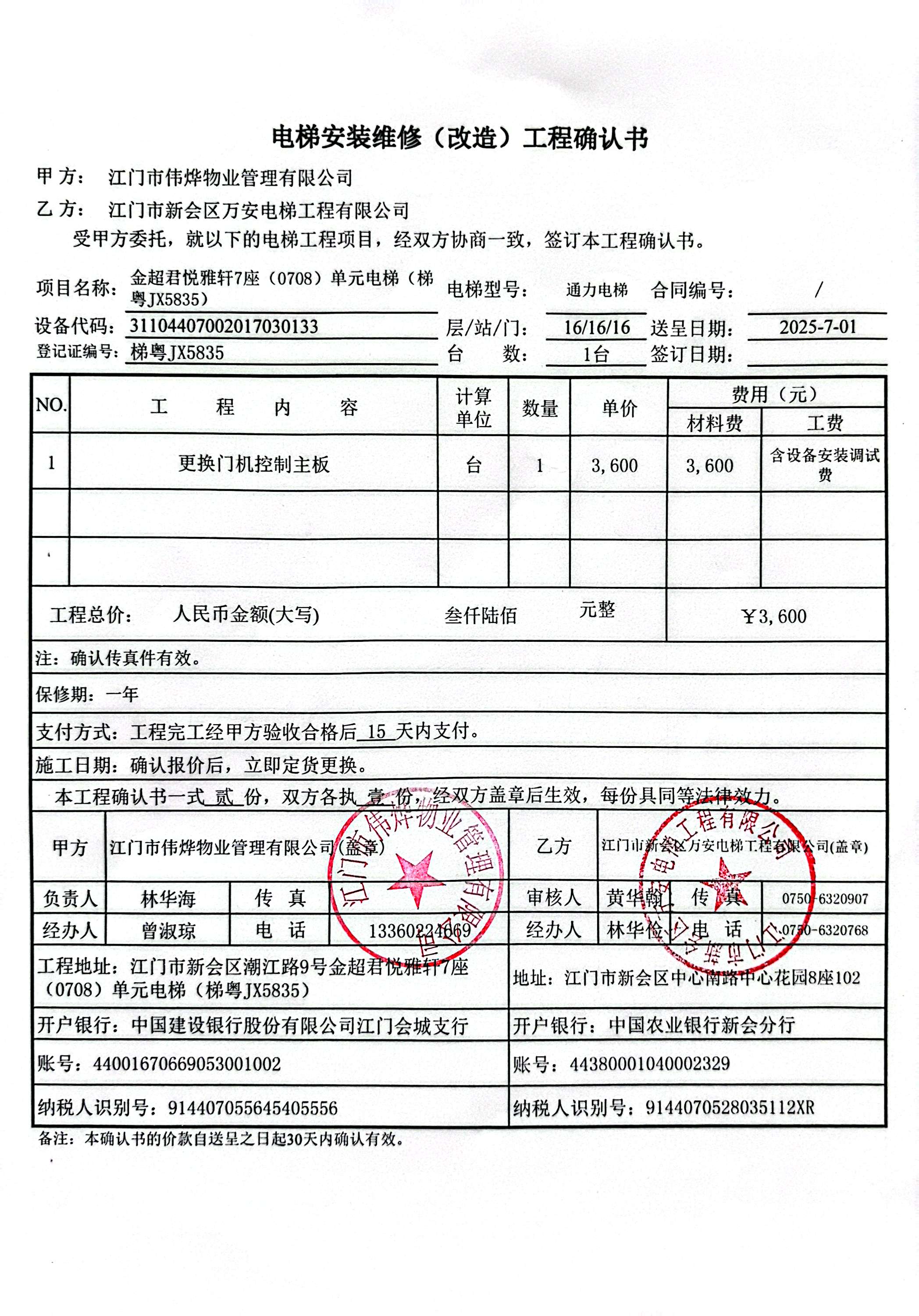 <td VALIGN="top" VALUES="" STYLE="border-width:0" BINDTYPE="0" ROWSPAN="19" COLSPAN="7" DATASOURCE="投票结果" ><font style="font-size:14pt;"><p style="white-space: normal; font-family: 宋体; line-height: 1.75em;">金超君悦雅轩7座全体业主:</p><p style="white-space: normal; font-family: 宋体; line-height: 1.75em; text-indent: 2em;">本小区关于金超君悦雅轩7座0708电梯(梯粤JX5835)更换门机控制主板使用维修资金的投票的投票已表决结束,询异时间从2025年07月30日开始,投票询异公示期间,业主可通过微信查询自己的表决情况或可凭身份证件申请查询自己的表决情况;如公示的业主表决情况与查询的本人表决意见不一致的,可以以书面形式向投票组织机构申诉,投票组织机构予以纠正并重新公示表决结果。异议提出人对投票组织机构的处理仍有异议的,可以向街道办事处(镇人民政府)反映处理,涉及住宅专项维修资金的,可向属地住宅专项维修资金管理中心反映处理。</p><p style="white-space: normal;"><br/></p><p style="white-space: normal; font-family: 宋体; line-height: 1.75em;"><strong>附件:</strong></p><p style="white-space: normal; font-family: 宋体; line-height: 1.75em;"><strong>一、投票范围</strong></p><p style="white-space: normal; font-family: 宋体; line-height: 1.75em; text-indent: 2em;">金超君悦雅轩7座</p><p style="white-space: normal; font-family: 宋体; line-height: 1.75em; text-indent: 2em;">总人数(专有部分人数之和):28</p><p style="white-space: normal; font-family: 宋体; line-height: 1.75em; text-indent: 2em;"><span style="font-family: 宋体, SimSun;"><span style="font-family: 宋体; text-indent: 32px;"><span style="font-family: 宋体; text-indent: 32px;">总户数:28</span></span></span></p><p style="white-space: normal; font-family: 宋体; line-height: 1.75em; text-indent: 2em;">建筑物总面积(专有部分面积之和):4087.66㎡</p><p style="white-space: normal; font-family: 宋体; line-height: 1.75em;"><strong>二、询异公示起止时间</strong></p><p dir="ltr" style="white-space: normal; font-family: 宋体; line-height: 1.75em; text-indent: 2em;"><span style="text-indent: 36px;">2025年07月30日至2025年08月09日</span></p><p style="white-space: normal; font-family: 宋体; line-height: 1.75em;"><strong>三、投票详细描述</strong></p><p style="white-space: normal; font-family: 宋体; line-height: 1.75em; text-indent: 2em;"><p>金超君悦雅轩7座0708电梯(梯粤JX5835)出现故障导致关门延时,经检查,是由于电梯门机控制主板故障导致,因使用时间较长,电梯门机控制主板出现故障不能正常运行。现对<span style="text-wrap-mode: wrap;">7座0708电梯(梯粤JX5835)</span>的门机控制主板进行更换,工程维修预算金额为3600元,项目最终费用以施工合同签订金额为准。因已过保修期,维修费用由相关业主按户分摊,每户分摊约128.57元,详见公示附件。如业主手机不能正常通过微信投票,请联系物业公司进行线下纸质投票,物业电话:0750-6122009。</p></p><p style="white-space: normal; font-family: 宋体; line-height: 1.75em;"><strong>四、计票规则</strong></p><p style="white-space: normal; font-family: 宋体; line-height: 1.75em; text-indent: 2em;">表决事项:使用建筑物及其附属设施的维修资金<br /><p style='text-align: left; font-family: 宋体; font-size: 16px; line-height: 1.75em; text-indent: 2em;'>计票规则:弃权票不并入其它项 未表决票不并入其它项</p></p><p style="white-space: normal; font-family: 宋体; line-height: 1.75em;"><strong>五、通过规则</strong></p><p style="white-space: normal; font-family: 宋体; line-height: 1.75em;"><strong><strong style="white-space: normal;"><span style="font-family: 宋体, SimSun;"> 根据《中华人民共和国民法典》第二百七十八条规定:业主共同决定事项,应当由专有部分面积占比三分之二以上的业主且人数占比三分之二以上的业主参与表决。</span></strong></strong></p><p style="white-space: normal; font-family: 宋体; line-height: 1.75em; text-indent: 2em;">表决事项:使用建筑物及其附属设施的维修资金<br /><p style='text-align: left; font-family: 宋体; font-size: 16px; line-height: 1.75em; text-indent: 2em;'>通过规则:双2/3以上参与表决,参与表决双过半同意</p></p><p style="white-space: normal; font-family: 宋体; line-height: 1.75em;"><strong>六、投票结果</strong></p><p style="white-space: normal; font-family: 宋体; line-height: 1.75em; text-indent: 2em;"><div id='resultTable'><table style='table-layout: fixed; font-size:12px; margin-top:10px' width='100%' border='0' cellspacing='0' cellpadding='0'><tr><td height='28' colspan='10' align='center' style='border: 1px solid #666'><strong style='font-size: 14px;'> 使用建筑物及其附属设施的维修资金</strong></td> </tr><tr id='trfirst'><td height='28' colspan='4' style='border-left: 1px solid #666; border-bottom: 1px solid #666'><strong> 申报单位:</strong> 江门市伟烨物业管理有限公司</td><td colspan='3' style='border-left: 1px solid #666; border-bottom: 1px solid #666'><strong> 联系方式:</strong> 0750-6123828 </td><td colspan='3' style='border-left: 1px solid #666; border-bottom: 1px solid #666; border-right: 1px solid #666'><strong> 申报日期:</strong> 2025年7月12日 </td></tr><tr> <td height='28' colspan='5' style='border-left: 1px solid #666; border-bottom: 1px solid #666'><strong> 总人数(专有部分人数之和):</strong>28人 </td><td colspan='5' style='border-left: 1px solid #666; border-bottom: 1px solid #666; border-right: 1px solid #666'><strong> 建筑物总面积(专有部分面积之和):</strong>4087.66㎡ </td> </tr><tr><td height='28' colspan='10' bgcolor='#F3F3F3' style='border-left: 1px solid #666;border-bottom: 1px solid #666;border-right: 1px solid #6