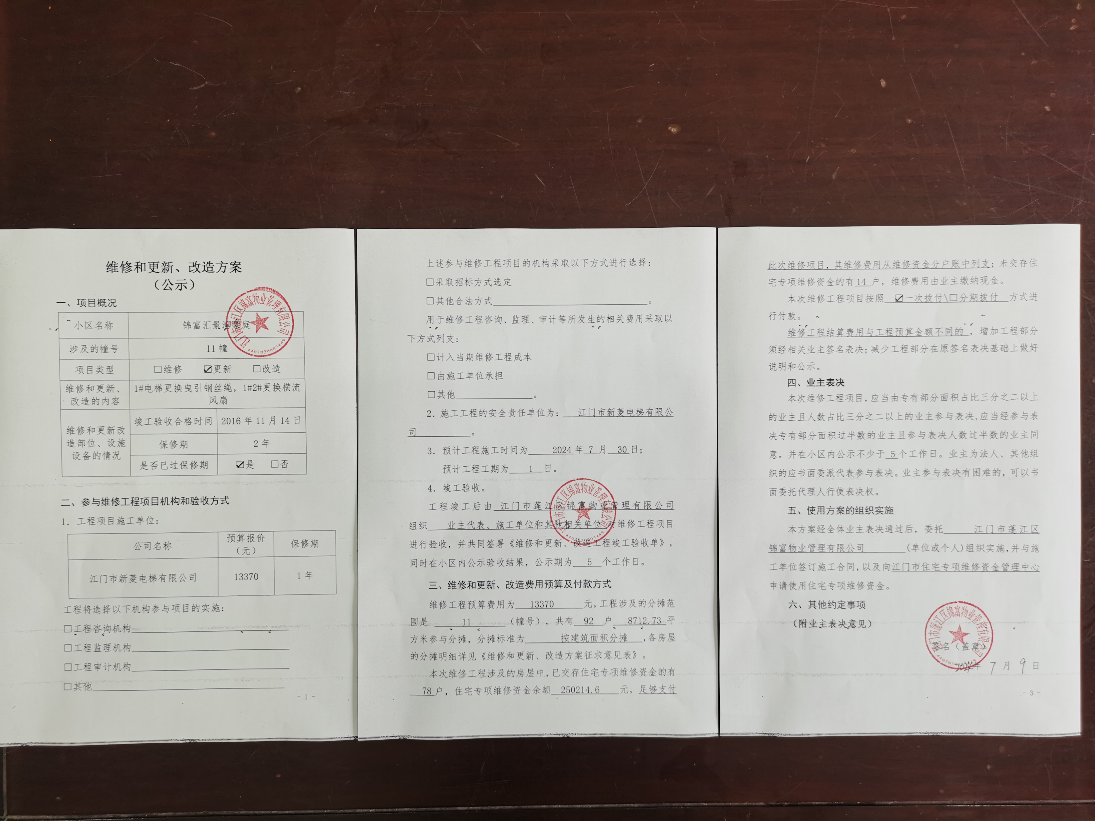 <td VALIGN="top" VALUES="" STYLE="border-width:0" BINDTYPE="0" ROWSPAN="17" COLSPAN="7" DATASOURCE="投票结果" ><font style=" font-family:方正小标宋简体;font-size:14pt;"><p style="line-height: 1.75em;"><span style="font-family: 宋体, SimSun;">各位尊敬的业主:</span><br/></p><p style="text-indent: 2em; line-height: 1.75em;"><span style="font-family: 宋体, SimSun;">根据法律法规的规定,本小区业主利用“江门市物业事项表决管理系统”已对本小区公共事务决策事项进行了表决,在经过7日的询异公示期后,未收到业主有效的异议。现将投票结果公告,并就产生的法律效力说明如下:</span></p><p style="line-height: 1.75em; text-indent: 0em;"><strong style="text-indent: 2em;"><span style="font-family: 宋体, SimSun;">一、投票范围</span></strong></p><p style="text-indent: 2em; line-height: 1.75em;"><span style="font-family: 宋体, SimSun;">江门市蓬江区锦富汇景湾豪庭蓬江区棠下镇锦富汇景湾豪庭11幢</span></p><p style="text-indent: 2em; line-height: 1.75em;"><span style="font-family: 宋体, SimSun;">总人数(专有部分人数之和):91</span></p><p style="text-indent: 2em; line-height: 1.75em;"><span style="font-family: 宋体, SimSun;"><span style="font-family: 宋体, SimSun; text-indent: 32px;"><span style="font-family: 宋体; text-indent: 32px;"><span style="font-family: 宋体; text-indent: 32px;">总户数:92</span></span></span></span></p><p style="text-indent: 2em; line-height: 1.75em;"><span style="font-family: 宋体, SimSun;">建筑物总面积(专有部分面积之和):8712.73㎡</span></p><p style="line-height: 1.75em;"><strong><span style="font-family: 宋体, SimSun;">二、投票结果公告时间</span></strong></p><p style="text-indent: 2em; line-height: 1.75em;"><span style="font-family: 宋体, SimSun;"><span style="font-family: 宋体, SimSun; text-indent: 32px;">从2024年08月08日开始</span></span></p><p style="line-height: 1.75em;"><strong><span style="font-family: 宋体, SimSun;">三、计票规则</span></strong></p><p style="text-indent: 2em; line-height: 1.75em;"><span style="font-family: 宋体, SimSun;">表决事项:使用建筑物及其附属设施的维修资金<br /><p style='font-family: 宋体, SimSun;line-height: 1.75em; text-indent: 2em;'>计票规则:弃权票不并入其它项&nbsp;&nbsp;&nbsp;&nbsp;未表决票不并入其它项</p></span></p><p style="line-height: 1.75em;"><strong><span style="font-family: 宋体, SimSun;">四、通过规则</span></strong></p><p style="line-height: 1.75em;"><strong><span style="font-family: 宋体, SimSun;">&nbsp; 根据《中华人民共和国民法典》第二百七十八条规定:业主共同决定事项,应当由专有部分面积占比三分之二以上的业主且人数占比三分之二以上的业主参与表决。</span></strong></p><p style="text-indent: 2em; line-height: 1.75em;"><span style="font-family: 宋体, SimSun;"><span style="font-family: 宋体, SimSun; text-indent: 32px;">表决事项:使用建筑物及其附属设施的维修资金<br /><p style='font-family: 宋体, SimSun;line-height: 1.75em; text-indent: 2em;'>通过规则:双2/3以上参与表决,参与表决双过半同意</p></span></span></p><p style="line-height: 1.75em;"><strong><span style="font-family: 宋体, SimSun;">五、投票结果</span></strong></p><p style="line-height: 1.75em; text-indent: 2em;"><span style="font-family: 宋体, SimSun; text-indent: 2em;"><div id='resultTable'><table style='table-layout: fixed; font-size:12px; margin-top:10px' width='100%' border='0' cellspacing='0' cellpadding='0'><tr><td height='28' colspan='10' align='center' style='border: 1px solid #666'><strong style='font-size: 14px;'> 使用建筑物及其附属设施的维修资金</strong></td> </tr><tr id='trfirst'><td height='28' colspan='4' style='border-left: 1px solid #666; border-bottom: 1px solid #666'><strong>&nbsp;申报单位:</strong> 江门市蓬江区锦富物业管理有限公司</td><td colspan='3' style='border-left: 1px solid #666; border-bottom: 1px solid #666'><strong>&nbsp;联系方式:</strong> 3598316 </td><td colspan='3' style='border-left: 1px solid #666; border-bottom: 1px solid #666; border-right: 1px solid #666'><strong>&nbsp;申报日期:</strong> 2024年7月23日 </td></tr><tr> <td height='28' colspan='5' style='border-left: 1px solid #666; border-bottom: 1px solid #666'><strong>&nbsp;总人数(专有部分人数之和):</strong>91人 </td><td colspan='5' style='border-left: 1px solid #666; border-bottom: 1px solid #666; border-right: 1px solid #666'><strong>&nbsp;建筑物总面积(专有部分面积之和):</strong>8712.73㎡ </td> </tr><tr><td height='28' colspan='10' bgcolor='#F3F3F3' style='border-left: 1px solid #666;border-bottom: 1px solid #666;border-right: 1px solid #666'><strong>&nbsp;参与表决人数及面积统计</strong></td></tr><tr><td height='28' colspan='5' style='border-left: 1px solid #666; border-bottom: 1px solid #666'><strong>&nbsp;参与表决人数:</strong>68人</td><td colspan='5' style='border-left: 1px solid #666; border-bottom: 1px solid #666; border-right: 1px solid #666'><strong>&nbsp;参与表决人数占总人数比例:</strong>74.73%</td></tr><tr><td height='28' colspan='5' style='border-left: 1px solid #666; border-bottom: 1px solid #666'><strong>&nbsp;参与表决面积:</strong>6530.05㎡</td><td colspan='5' style='border-left: 1px solid #666; border-bottom: 1px solid #666; border-right: 1px solid #666'><strong>&nbsp;参与表决面积占总面积比例:</strong>74.95%</td></tr><tr><td height='28' colspan='10' bgcolor='#F3F3F3' style='border-left: 1px solid #666; border-bottom: 1px solid #666;border-right: 1px solid #666'> <strong>&nbsp;参与表决同意人数及面积统计</strong></td> </tr><tr><td height='28' colspan='5' style='border-left: 1px solid #666; border-bottom: 1px solid #666'><strong>&nbsp;参与表决同意人数:</strong>68人 </td><td colspan