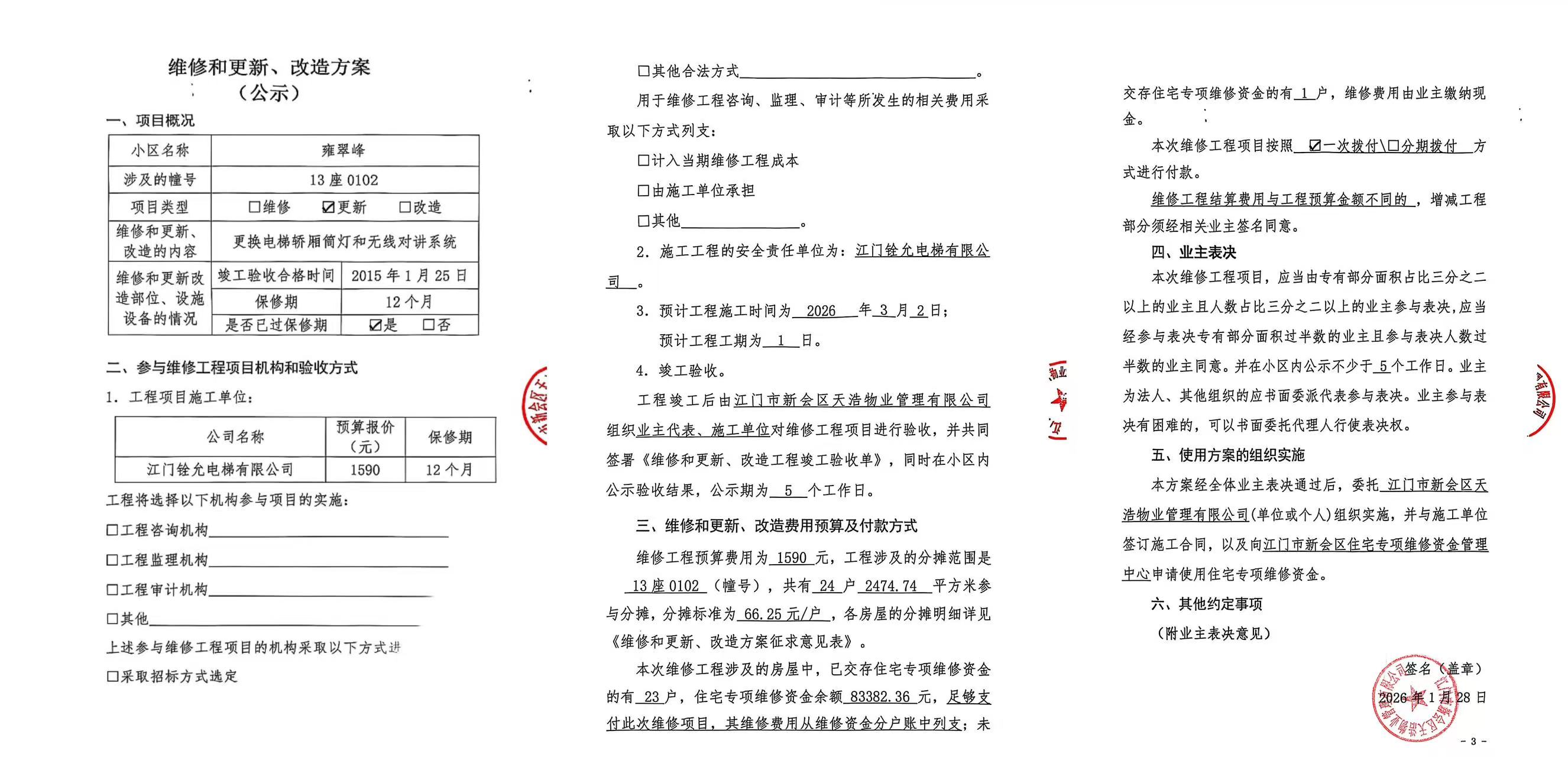 <td VALIGN="top" VALUES="" STYLE="border-width:0" BINDTYPE="0" ROWSPAN="19" COLSPAN="7" DATASOURCE="投票结果" ><font style="font-size:14pt;"><p style="white-space: normal; font-family: 宋体; line-height: 1.75em;">雍翠峰雍翠峰13座全体业主:</p><p style="white-space: normal; font-family: 宋体; line-height: 1.75em; text-indent: 2em;">本小区关于雍翠峰13座01-02单元电梯【梯粤JX4551】更换轿厢筒灯和无线对讲系统使用维修资金的投票的投票已表决结束,询异时间从2026年02月02日开始,投票询异公示期间,业主可通过微信查询自己的表决情况或可凭身份证件申请查询自己的表决情况;如公示的业主表决情况与查询的本人表决意见不一致的,可以以书面形式向投票组织机构申诉,投票组织机构予以纠正并重新公示表决结果。异议提出人对投票组织机构的处理仍有异议的,可以向街道办事处(镇人民政府)反映处理,涉及住宅专项维修资金的,可向属地住宅专项维修资金管理中心反映处理。</p><p style="white-space: normal;"><br/></p><p style="white-space: normal; font-family: 宋体; line-height: 1.75em;"><strong>附件:</strong></p><p style="white-space: normal; font-family: 宋体; line-height: 1.75em;"><strong>一、投票范围</strong></p><p style="white-space: normal; font-family: 宋体; line-height: 1.75em; text-indent: 2em;">雍翠峰雍翠峰13座</p><p style="white-space: normal; font-family: 宋体; line-height: 1.75em; text-indent: 2em;">总人数(专有部分人数之和):24</p><p style="white-space: normal; font-family: 宋体; line-height: 1.75em; text-indent: 2em;"><span style="font-family: 宋体, SimSun;"><span style="font-family: 宋体; text-indent: 32px;"><span style="font-family: 宋体; text-indent: 32px;">总户数:24</span></span></span></p><p style="white-space: normal; font-family: 宋体; line-height: 1.75em; text-indent: 2em;">建筑物总面积(专有部分面积之和):2474.74㎡</p><p style="white-space: normal; font-family: 宋体; line-height: 1.75em;"><strong>二、询异公示起止时间</strong></p><p dir="ltr" style="white-space: normal; font-family: 宋体; line-height: 1.75em; text-indent: 2em;"><span style="text-indent: 36px;">2026年02月02日至2026年02月12日</span></p><p style="white-space: normal; font-family: 宋体; line-height: 1.75em;"><strong>三、投票详细描述</strong></p><p style="white-space: normal; font-family: 宋体; line-height: 1.75em; text-indent: 2em;"><p> 雍翠峰13座01-02单元电梯【梯粤JX4551】,电梯上报筒灯不亮和三方通话接听声音不清晰,经检查确认为电梯轿厢筒灯故障损坏和原三方通话系统老化故障,配件日常使用自然损坏,已过保修期。</p><p> 现需申请使用维修资金对13座01-02单元电梯【梯粤JX4551】进行维修,工程维修预算金额为1590元,项目最终费用以施工合同签订金额为准。维修费用的分摊标准为按分户分摊,每户分摊66.25元,详见公示附件。如业主不能正常通过微信投票,请联系物业公司进行线下纸质投票,物业电话:0750-6125500</p><p><br/></p></p><p style="white-space: normal; font-family: 宋体; line-height: 1.75em;"><strong>四、计票规则</strong></p><p style="white-space: normal; font-family: 宋体; line-height: 1.75em; text-indent: 2em;">表决事项:使用建筑物及其附属设施的维修资金<br /><p style='text-align: left; font-family: 宋体; font-size: 16px; line-height: 1.75em; text-indent: 2em;'>计票规则:弃权票不并入其它项 未表决票不并入其它项</p></p><p style="white-space: normal; font-family: 宋体; line-height: 1.75em;"><strong>五、通过规则</strong></p><p style="white-space: normal; font-family: 宋体; line-height: 1.75em;"><strong><strong style="white-space: normal;"><span style="font-family: 宋体, SimSun;"> 根据《中华人民共和国民法典》第二百七十八条规定:业主共同决定事项,应当由专有部分面积占比三分之二以上的业主且人数占比三分之二以上的业主参与表决。</span></strong></strong></p><p style="white-space: normal; font-family: 宋体; line-height: 1.75em; text-indent: 2em;">表决事项:使用建筑物及其附属设施的维修资金<br /><p style='text-align: left; font-family: 宋体; font-size: 16px; line-height: 1.75em; text-indent: 2em;'>通过规则:双2/3以上参与表决,参与表决双过半同意</p></p><p style="white-space: normal; font-family: 宋体; line-height: 1.75em;"><strong>六、投票结果</strong></p><p style="white-space: normal; font-family: 宋体; line-height: 1.75em; text-indent: 2em;"><div id='resultTable'><table style='table-layout: fixed; font-size:12px; margin-top:10px' width='100%' border='0' cellspacing='0' cellpadding='0'><tr><td height='28' colspan='10' align='center' style='border: 1px solid #666'><strong style='font-size: 14px;'> 使用建筑物及其附属设施的维修资金</strong></td> </tr><tr id='trfirst'><td height='28' colspan='4' style='border-left: 1px solid #666; border-bottom: 1px solid #666'><strong> 申报单位:</strong> 江门市新会区天浩物业管理有限公司</td><td colspan='3' style='border-left: 1px solid #666; border-bottom: 1px solid #666'><strong> 联系方式:</strong> </td><td colspan='3' style='border-left: 1px solid #666; border-bottom: 1px solid #666; border-right: 1px solid #666'><strong> 申报日期:</strong> 2026年1月28日 </td></tr><tr> <td height='28' colspan='5' style='border-left: 1px solid #666; border-bottom: 1px solid #666'><strong> 总人数(专有部分人数之和):</strong>24人 </td><td colspan='5' style='border-left: 1px solid #666; border-bottom: 1px solid #666; border-right: 1px solid #666'><strong> 建筑物总面积(专有部分面积之和):</strong>2474.74㎡ </td> </tr><tr><td height='28' colspan='10' bgcolor='#F3F3F3' style='border-left: 1px solid #666;border-bottom: 1px solid #666;border-