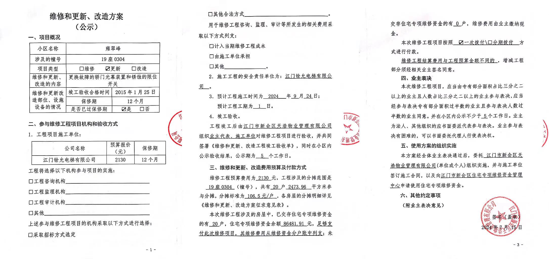<td VALIGN="top" VALUES="" STYLE="border-width:0" BINDTYPE="0" ROWSPAN="19" COLSPAN="7" DATASOURCE="投票结果" ><font style="font-size:14pt;"><p style="white-space: normal; font-family: 宋体; line-height: 1.75em;">雍翠峰雍翠峰19座全体业主:</p><p style="white-space: normal; font-family: 宋体; line-height: 1.75em; text-indent: 2em;">本小区关于雍翠峰19座0304【梯粤JX4630】更换光幕装置和限位开关使用维修资金的投票的投票已表决结束,询异时间从2024年07月17日开始,投票询异公示期间,业主可通过微信查询自己的表决情况或可凭身份证件申请查询自己的表决情况;如公示的业主表决情况与查询的本人表决意见不一致的,可以以书面形式向投票组织机构申诉,投票组织机构予以纠正并重新公示表决结果。异议提出人对投票组织机构的处理仍有异议的,可以向街道办事处(镇人民政府)反映处理,涉及住宅专项维修资金的,可向属地住宅专项维修资金管理中心反映处理。</p><p style="white-space: normal;"><br/></p><p style="white-space: normal; font-family: 宋体; line-height: 1.75em;"><strong>附件:</strong></p><p style="white-space: normal; font-family: 宋体; line-height: 1.75em;"><strong>一、投票范围</strong></p><p style="white-space: normal; font-family: 宋体; line-height: 1.75em; text-indent: 2em;">雍翠峰雍翠峰19座</p><p style="white-space: normal; font-family: 宋体; line-height: 1.75em; text-indent: 2em;">总人数(专有部分人数之和):20</p><p style="white-space: normal; font-family: 宋体; line-height: 1.75em; text-indent: 2em;"><span style="font-family: 宋体, SimSun;"><span style="font-family: 宋体; text-indent: 32px;"><span style="font-family: 宋体; text-indent: 32px;">总户数:20</span></span></span></p><p style="white-space: normal; font-family: 宋体; line-height: 1.75em; text-indent: 2em;">建筑物总面积(专有部分面积之和):2473.96㎡</p><p style="white-space: normal; font-family: 宋体; line-height: 1.75em;"><strong>二、询异公示起止时间</strong></p><p dir="ltr" style="white-space: normal; font-family: 宋体; line-height: 1.75em; text-indent: 2em;"><span style="text-indent: 36px;">2024年07月17日至2024年07月23日</span></p><p style="white-space: normal; font-family: 宋体; line-height: 1.75em;"><strong>三、投票详细描述</strong></p><p style="white-space: normal; font-family: 宋体; line-height: 1.75em; text-indent: 2em;"><p> 雍翠峰19座0304电梯【梯粤JX4630】电梯停在负一楼关不了门,经检查确认为电梯光幕装置故障和底坑限位开关氧化锈蚀,日常使用自然磨损损坏,已过保修期。现需申请使用维修资金对19座0304电梯【梯粤JX4630】进行维修,工程维修预算金额为2130元,项目最终费用以施工合同签订金额为准。维修费用的分摊标准为按分户分摊,每户分摊106.5元,详见公示附件。如业主不能正常通过微信投票,请联系物业公司进行线下纸质投票,物业电话:0750-6125500</p></p><p style="white-space: normal; font-family: 宋体; line-height: 1.75em;"><strong>四、计票规则</strong></p><p style="white-space: normal; font-family: 宋体; line-height: 1.75em; text-indent: 2em;">表决事项:使用建筑物及其附属设施的维修资金<br /><p style='text-align: left; font-family: 宋体; font-size: 16px; line-height: 1.75em; text-indent: 2em;'>计票规则:弃权票不并入其它项 未表决票不并入其它项</p></p><p style="white-space: normal; font-family: 宋体; line-height: 1.75em;"><strong>五、通过规则</strong></p><p style="white-space: normal; font-family: 宋体; line-height: 1.75em;"><strong><strong style="white-space: normal;"><span style="font-family: 宋体, SimSun;"> 根据《中华人民共和国民法典》第二百七十八条规定:业主共同决定事项,应当由专有部分面积占比三分之二以上的业主且人数占比三分之二以上的业主参与表决。</span></strong></strong></p><p style="white-space: normal; font-family: 宋体; line-height: 1.75em; text-indent: 2em;">表决事项:使用建筑物及其附属设施的维修资金<br /><p style='text-align: left; font-family: 宋体; font-size: 16px; line-height: 1.75em; text-indent: 2em;'>通过规则:双2/3以上参与表决,参与表决双过半同意</p></p><p style="white-space: normal; font-family: 宋体; line-height: 1.75em;"><strong>六、投票结果</strong></p><p style="white-space: normal; font-family: 宋体; line-height: 1.75em; text-indent: 2em;"><div id='resultTable'><table style='table-layout: fixed; font-size:12px; margin-top:10px' width='100%' border='0' cellspacing='0' cellpadding='0'><tr><td height='28' colspan='10' align='center' style='border: 1px solid #666'><strong style='font-size: 14px;'> 使用建筑物及其附属设施的维修资金</strong></td> </tr><tr id='trfirst'><td height='28' colspan='4' style='border-left: 1px solid #666; border-bottom: 1px solid #666'><strong> 申报单位:</strong> 江门市新会区天浩物业管理有限公司</td><td colspan='3' style='border-left: 1px solid #666; border-bottom: 1px solid #666'><strong> 联系方式:</strong> </td><td colspan='3' style='border-left: 1px solid #666; border-bottom: 1px solid #666; border-right: 1px solid #666'><strong> 申报日期:</strong> 2024年7月15日 </td></tr><tr> <td height='28' colspan='5' style='border-left: 1px solid #666; border-bottom: 1px solid #666'><strong> 总人数(专有部分人数之和):</strong>20人 </td><td colspan='5' style='border-left: 1px solid #666; border-bottom: 1px solid #666; border-right: 1px solid #666'><strong> 建筑物总面积(专有部分面积之和):</strong>2473.96㎡ </td> </tr><tr><td height='28' colspan='10' bgcolor='#F3F3F3' style='border-left: 1px solid #666;border-bottom: 1px solid #666;border-right: 1px solid #666'><strong> 参与人数及面积统计</strong></td></tr><tr><td heig