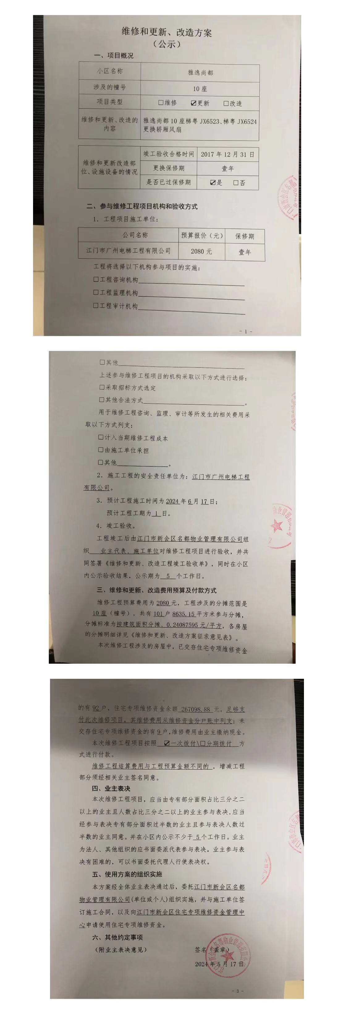 <td VALIGN="top" VALUES="" STYLE="border-width:0" BINDTYPE="0" ROWSPAN="19" COLSPAN="7" DATASOURCE="投票结果" ><font style="font-size:14pt;"><p style="white-space: normal; font-family: 宋体; line-height: 1.75em;">雅逸尚都雅逸尚都10座全体业主:</p><p style="white-space: normal; font-family: 宋体; line-height: 1.75em; text-indent: 2em;">本小区关于雅逸尚都10座梯粤JX6523、梯粤JX6524更换轿厢风扇使用维修资金的投票的投票已表决结束,询异时间从2024年07月02日开始,投票询异公示期间,业主可通过微信查询自己的表决情况或可凭身份证件申请查询自己的表决情况;如公示的业主表决情况与查询的本人表决意见不一致的,可以以书面形式向投票组织机构申诉,投票组织机构予以纠正并重新公示表决结果。异议提出人对投票组织机构的处理仍有异议的,可以向街道办事处(镇人民政府)反映处理,涉及住宅专项维修资金的,可向属地住宅专项维修资金管理中心反映处理。</p><p style="white-space: normal;"><br/></p><p style="white-space: normal; font-family: 宋体; line-height: 1.75em;"><strong>附件:</strong></p><p style="white-space: normal; font-family: 宋体; line-height: 1.75em;"><strong>一、投票范围</strong></p><p style="white-space: normal; font-family: 宋体; line-height: 1.75em; text-indent: 2em;">雅逸尚都雅逸尚都10座</p><p style="white-space: normal; font-family: 宋体; line-height: 1.75em; text-indent: 2em;">总人数(专有部分人数之和):101</p><p style="white-space: normal; font-family: 宋体; line-height: 1.75em; text-indent: 2em;"><span style="font-family: 宋体, SimSun;"><span style="font-family: 宋体; text-indent: 32px;"><span style="font-family: 宋体; text-indent: 32px;">总户数:101</span></span></span></p><p style="white-space: normal; font-family: 宋体; line-height: 1.75em; text-indent: 2em;">建筑物总面积(专有部分面积之和):8635.15㎡</p><p style="white-space: normal; font-family: 宋体; line-height: 1.75em;"><strong>二、询异公示起止时间</strong></p><p dir="ltr" style="white-space: normal; font-family: 宋体; line-height: 1.75em; text-indent: 2em;"><span style="text-indent: 36px;">2024年07月02日至2024年07月08日</span></p><p style="white-space: normal; font-family: 宋体; line-height: 1.75em;"><strong>三、投票详细描述</strong></p><p style="white-space: normal; font-family: 宋体; line-height: 1.75em; text-indent: 2em;"><p><span style="text-wrap: wrap;">本小区10座电梯(梯粤JX6523、梯粤JX6524)发现轿厢风扇自然损坏,需要更换。现需申请使用维修资金对</span><span style="text-wrap: wrap;">10座</span><span style="text-wrap: wrap;">电梯进行维修更换,工程维修预算金额为2080元,项目最终费用以施工合同签订金额为准。维修费用的分摊标准为按建筑面积分摊,每平方约0.24087595元详见公示附件。如业主手机不能正常通过微信投票,请联系物业公司进行线下纸质投票,物业电话:0750-6609908。</span></p></p><p style="white-space: normal; font-family: 宋体; line-height: 1.75em;"><strong>四、计票规则</strong></p><p style="white-space: normal; font-family: 宋体; line-height: 1.75em; text-indent: 2em;">表决事项:使用建筑物及其附属设施的维修资金<br /><p style='text-align: left; font-family: 宋体; font-size: 16px; line-height: 1.75em; text-indent: 2em;'>计票规则:弃权票不并入其它项 未表决票不并入其它项</p></p><p style="white-space: normal; font-family: 宋体; line-height: 1.75em;"><strong>五、通过规则</strong></p><p style="white-space: normal; font-family: 宋体; line-height: 1.75em;"><strong><strong style="white-space: normal;"><span style="font-family: 宋体, SimSun;"> 根据《中华人民共和国民法典》第二百七十八条规定:业主共同决定事项,应当由专有部分面积占比三分之二以上的业主且人数占比三分之二以上的业主参与表决。</span></strong></strong></p><p style="white-space: normal; font-family: 宋体; line-height: 1.75em; text-indent: 2em;">表决事项:使用建筑物及其附属设施的维修资金<br /><p style='text-align: left; font-family: 宋体; font-size: 16px; line-height: 1.75em; text-indent: 2em;'>通过规则:双2/3以上参与表决,参与表决双过半同意</p></p><p style="white-space: normal; font-family: 宋体; line-height: 1.75em;"><strong>六、投票结果</strong></p><p style="white-space: normal; font-family: 宋体; line-height: 1.75em; text-indent: 2em;"><div id='resultTable'><table style='table-layout: fixed; font-size:12px; margin-top:10px' width='100%' border='0' cellspacing='0' cellpadding='0'><tr><td height='28' colspan='10' align='center' style='border: 1px solid #666'><strong style='font-size: 14px;'> 使用建筑物及其附属设施的维修资金</strong></td> </tr><tr id='trfirst'><td height='28' colspan='4' style='border-left: 1px solid #666; border-bottom: 1px solid #666'><strong> 申报单位:</strong> 江门市新会区名都物业管理有限公司</td><td colspan='3' style='border-left: 1px solid #666; border-bottom: 1px solid #666'><strong> 联系方式:</strong> 6609908 </td><td colspan='3' style='border-left: 1px solid #666; border-bottom: 1px solid #666; border-right: 1px solid #666'><strong> 申报日期:</strong> 2024年5月18日 </td></tr><tr> <td height='28' colspan='5' style='border-left: 1px solid #666; border-bottom: 1px solid #666'><strong> 总人数(专有部分人数之和):</strong>101人 </td><td colspan='5' style='border-left: 1px solid #666; border-bottom: 1px solid #666; border-right: 1px solid #666'><strong> 建筑物总面积(专有部分面积之和):</strong>8635.15㎡ </td> </tr><tr><td height='28' colspan='10' bgcolor='#F3F3F3' style='border-left: 1px solid #666;border-bottom: 1px solid #666;border-right: 1px solid #666'><strong> 参与人数及面积统计</str
