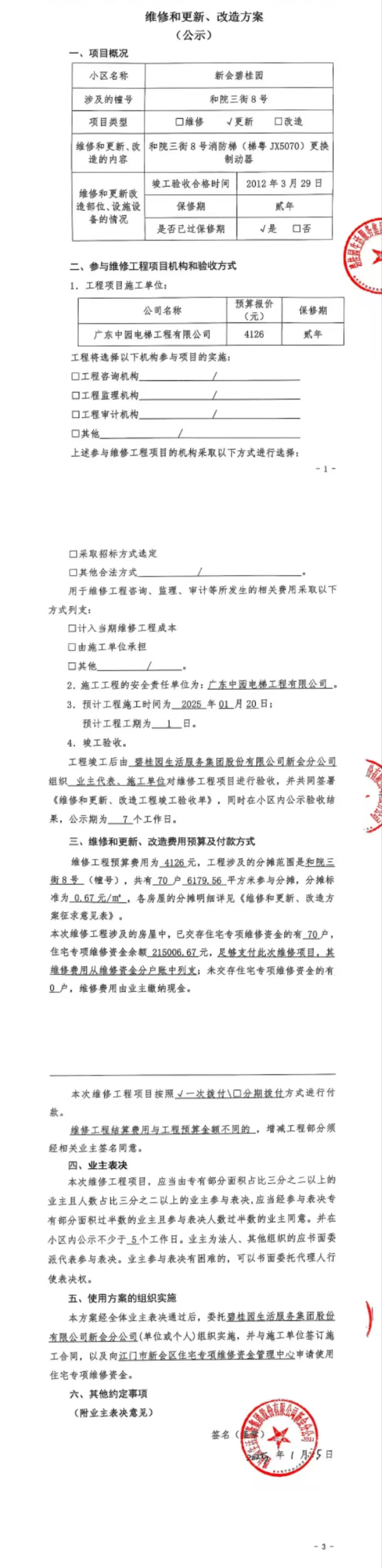 <td VALIGN="top" VALUES="" STYLE="border-width:0" BINDTYPE="0" ROWSPAN="19" COLSPAN="7" DATASOURCE="投票结果" ><font style="font-size:14pt;"><p style="white-space: normal; font-family: 宋体; line-height: 1.75em;">新会碧桂园和院三街8号全体业主:</p><p style="white-space: normal; font-family: 宋体; line-height: 1.75em; text-indent: 2em;">本小区关于新会碧桂园和院三街8号消防梯(梯粤JX5070)更换制动器使用维修资金的投票的投票已表决结束,询异时间从2025年01月22日开始,投票询异公示期间,业主可通过微信查询自己的表决情况或可凭身份证件申请查询自己的表决情况;如公示的业主表决情况与查询的本人表决意见不一致的,可以以书面形式向投票组织机构申诉,投票组织机构予以纠正并重新公示表决结果。异议提出人对投票组织机构的处理仍有异议的,可以向街道办事处(镇人民政府)反映处理,涉及住宅专项维修资金的,可向属地住宅专项维修资金管理中心反映处理。</p><p style="white-space: normal;"><br/></p><p style="white-space: normal; font-family: 宋体; line-height: 1.75em;"><strong>附件:</strong></p><p style="white-space: normal; font-family: 宋体; line-height: 1.75em;"><strong>一、投票范围</strong></p><p style="white-space: normal; font-family: 宋体; line-height: 1.75em; text-indent: 2em;">新会碧桂园和院三街8号</p><p style="white-space: normal; font-family: 宋体; line-height: 1.75em; text-indent: 2em;">总人数(专有部分人数之和):68</p><p style="white-space: normal; font-family: 宋体; line-height: 1.75em; text-indent: 2em;"><span style="font-family: 宋体, SimSun;"><span style="font-family: 宋体; text-indent: 32px;"><span style="font-family: 宋体; text-indent: 32px;">总户数:70</span></span></span></p><p style="white-space: normal; font-family: 宋体; line-height: 1.75em; text-indent: 2em;">建筑物总面积(专有部分面积之和):6179.56㎡</p><p style="white-space: normal; font-family: 宋体; line-height: 1.75em;"><strong>二、询异公示起止时间</strong></p><p dir="ltr" style="white-space: normal; font-family: 宋体; line-height: 1.75em; text-indent: 2em;"><span style="text-indent: 36px;">2025年01月22日至2025年02月01日</span></p><p style="white-space: normal; font-family: 宋体; line-height: 1.75em;"><strong>三、投票详细描述</strong></p><p style="white-space: normal; font-family: 宋体; line-height: 1.75em; text-indent: 2em;"><p><span style="font-family: "Helvetica Neue", Helvetica, Arial, sans-serif; font-size: 14px; text-wrap-mode: wrap; background-color: rgb(255, 255, 255);">新会碧桂园和院三街8号消防梯(梯粤JX5070)出现异常,突然停梯。经检查,是消防梯制动器损坏</span><span style="font-family: "Helvetica Neue", Helvetica, Arial, sans-serif; font-size: 14px; text-wrap-mode: wrap; background-color: rgb(255, 255, 255);">,已过保修期。现申请使用维修资金对新会碧桂园</span><span style="font-family: "Helvetica Neue", Helvetica, Arial, sans-serif; font-size: 14px; text-wrap-mode: wrap; background-color: rgb(255, 255, 255);"></span>和院三街8号消防梯制动器进行更换<span style="font-family: "Helvetica Neue", Helvetica, Arial, sans-serif; font-size: 14px; text-wrap-mode: wrap; background-color: rgb(255, 255, 255);">,工程维修预算约4126元,项目最终费用以施工合同签订为准,维修费用的分摊标准按建筑面积分摊,每平方约0.67元,详见公示,如果有业主手机不能正常通过微信投票的,请联系物业公司进行线下纸质投票,物业电话17308202891李雪玲.</span></p></p><p style="white-space: normal; font-family: 宋体; line-height: 1.75em;"><strong>四、计票规则</strong></p><p style="white-space: normal; font-family: 宋体; line-height: 1.75em; text-indent: 2em;">表决事项:使用建筑物及其附属设施的维修资金<br /><p style='text-align: left; font-family: 宋体; font-size: 16px; line-height: 1.75em; text-indent: 2em;'>计票规则:弃权票不并入其它项 未表决票不并入其它项</p></p><p style="white-space: normal; font-family: 宋体; line-height: 1.75em;"><strong>五、通过规则</strong></p><p style="white-space: normal; font-family: 宋体; line-height: 1.75em;"><strong><strong style="white-space: normal;"><span style="font-family: 宋体, SimSun;"> 根据《中华人民共和国民法典》第二百七十八条规定:业主共同决定事项,应当由专有部分面积占比三分之二以上的业主且人数占比三分之二以上的业主参与表决。</span></strong></strong></p><p style="white-space: normal; font-family: 宋体; line-height: 1.75em; text-indent: 2em;">表决事项:使用建筑物及其附属设施的维修资金<br /><p style='text-align: left; font-family: 宋体; font-size: 16px; line-height: 1.75em; text-indent: 2em;'>通过规则:双2/3以上参与表决,参与表决双过半同意</p></p><p style="white-space: normal; font-family: 宋体; line-height: 1.75em;"><strong>六、投票结果</strong></p><p style="white-space: normal; font-family: 宋体; line-height: 1.75em; text-indent: 2em;"><div id='resultTable'><table style='table-layout: fixed; font-size:12px; margin-top:10px' width='100%' border='0' cellspacing='0' cellpadding='0'><tr><td height='28' colspan='10' align='center' style='border: 1px solid #666'><strong style='font-size: 14px;'> 使用建筑物及其附属设施的维修资金</strong></td> </tr><tr id='trfirst'><td height='28' colspan='4' style='border-left: 1px solid #666; border-bottom: 1px solid #666'><strong> 申报单位:</strong> 碧桂园生活服务集团股份有限公司新会分公司</td><td colspan='3' style='border-left: 1px solid #666; border-bottom: 1px solid #666'><strong> 联系方式:</strong> </td><td colspan='3' style='border-left: 1px solid #666; border-bottom: 1px solid #666; border-right: 1px solid #666'><strong> 申报日