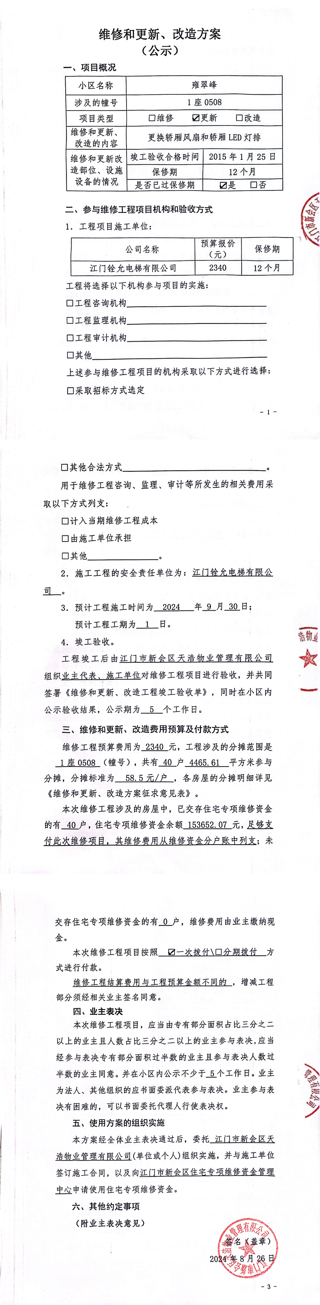 <td VALIGN="top" VALUES="" STYLE="border-width:0" BINDTYPE="0" ROWSPAN="19" COLSPAN="7" DATASOURCE="投票结果" ><font style="font-size:14pt;"><p style="white-space: normal; font-family: 宋体; line-height: 1.75em;">雍翠峰雍翠峰1座全体业主:</p><p style="white-space: normal; font-family: 宋体; line-height: 1.75em; text-indent: 2em;">本小区关于雍翠峰1座05-08电梯【梯粤JX4434】更换轿厢风扇和轿厢灯排使用维修资金的投票的投票已表决结束,询异时间从2024年09月26日开始,投票询异公示期间,业主可通过微信查询自己的表决情况或可凭身份证件申请查询自己的表决情况;如公示的业主表决情况与查询的本人表决意见不一致的,可以以书面形式向投票组织机构申诉,投票组织机构予以纠正并重新公示表决结果。异议提出人对投票组织机构的处理仍有异议的,可以向街道办事处(镇人民政府)反映处理,涉及住宅专项维修资金的,可向属地住宅专项维修资金管理中心反映处理。</p><p style="white-space: normal;"><br/></p><p style="white-space: normal; font-family: 宋体; line-height: 1.75em;"><strong>附件:</strong></p><p style="white-space: normal; font-family: 宋体; line-height: 1.75em;"><strong>一、投票范围</strong></p><p style="white-space: normal; font-family: 宋体; line-height: 1.75em; text-indent: 2em;">雍翠峰雍翠峰1座</p><p style="white-space: normal; font-family: 宋体; line-height: 1.75em; text-indent: 2em;">总人数(专有部分人数之和):40</p><p style="white-space: normal; font-family: 宋体; line-height: 1.75em; text-indent: 2em;"><span style="font-family: 宋体, SimSun;"><span style="font-family: 宋体; text-indent: 32px;"><span style="font-family: 宋体; text-indent: 32px;">总户数:40</span></span></span></p><p style="white-space: normal; font-family: 宋体; line-height: 1.75em; text-indent: 2em;">建筑物总面积(专有部分面积之和):4465.61㎡</p><p style="white-space: normal; font-family: 宋体; line-height: 1.75em;"><strong>二、询异公示起止时间</strong></p><p dir="ltr" style="white-space: normal; font-family: 宋体; line-height: 1.75em; text-indent: 2em;"><span style="text-indent: 36px;">2024年09月26日至2024年10月02日</span></p><p style="white-space: normal; font-family: 宋体; line-height: 1.75em;"><strong>三、投票详细描述</strong></p><p style="white-space: normal; font-family: 宋体; line-height: 1.75em; text-indent: 2em;"><p> <span style="font-family: "Helvetica Neue", Helvetica, Arial, sans-serif; font-size: 14px; text-wrap: wrap; background-color: rgb(255, 255, 255);">雍翠峰1座05-08电梯【梯粤JX4434】电梯有异响、轿厢照明灯光昏暗,经检查确认为轿厢风扇损坏,轿厢LED灯排老化,日常使用自然损坏,存在安全隐患,已过保修期。</span></p><p><span style="font-family: "Helvetica Neue", Helvetica, Arial, sans-serif; font-size: 14px; text-wrap: wrap; background-color: rgb(255, 255, 255);"> 现需申请使用维修资金对1座05-08电梯【梯粤JX4434】进行维修,工程维修预算金额为2340元,项目最终费用以施工合同签订金额为准。维修费用的分摊标准为按分户分摊,每户分摊58.5元,详见公示附件。如业主不能正常通过微信投票,请联系物业公司进行线下纸质投票,物业电话:0750-6125500</span></p></p><p style="white-space: normal; font-family: 宋体; line-height: 1.75em;"><strong>四、计票规则</strong></p><p style="white-space: normal; font-family: 宋体; line-height: 1.75em; text-indent: 2em;">表决事项:使用建筑物及其附属设施的维修资金<br /><p style='text-align: left; font-family: 宋体; font-size: 16px; line-height: 1.75em; text-indent: 2em;'>计票规则:弃权票不并入其它项 未表决票不并入其它项</p></p><p style="white-space: normal; font-family: 宋体; line-height: 1.75em;"><strong>五、通过规则</strong></p><p style="white-space: normal; font-family: 宋体; line-height: 1.75em;"><strong><strong style="white-space: normal;"><span style="font-family: 宋体, SimSun;"> 根据《中华人民共和国民法典》第二百七十八条规定:业主共同决定事项,应当由专有部分面积占比三分之二以上的业主且人数占比三分之二以上的业主参与表决。</span></strong></strong></p><p style="white-space: normal; font-family: 宋体; line-height: 1.75em; text-indent: 2em;">表决事项:使用建筑物及其附属设施的维修资金<br /><p style='text-align: left; font-family: 宋体; font-size: 16px; line-height: 1.75em; text-indent: 2em;'>通过规则:双2/3以上参与表决,参与表决双过半同意</p></p><p style="white-space: normal; font-family: 宋体; line-height: 1.75em;"><strong>六、投票结果</strong></p><p style="white-space: normal; font-family: 宋体; line-height: 1.75em; text-indent: 2em;"><div id='resultTable'><table style='table-layout: fixed; font-size:12px; margin-top:10px' width='100%' border='0' cellspacing='0' cellpadding='0'><tr><td height='28' colspan='10' align='center' style='border: 1px solid #666'><strong style='font-size: 14px;'> 使用建筑物及其附属设施的维修资金</strong></td> </tr><tr id='trfirst'><td height='28' colspan='4' style='border-left: 1px solid #666; border-bottom: 1px solid #666'><strong> 申报单位:</strong> 江门市新会区天浩物业管理有限公司</td><td colspan='3' style='border-left: 1px solid #666; border-bottom: 1px solid #666'><strong> 联系方式:</strong> </td><td colspan='3' style='border-left: 1px solid #666; border-bottom: 1px solid #666; border-right: 1px solid #666'><strong> 申报日期:</strong> 2024年8月26日 </td></tr><tr> <td height='28' colspan='5' style='border-left: 1px solid #666; border-bottom: 1px solid #666'><strong> 总人数(专有部分人数之和):</strong>40人 </td><td colspan='5' style='border-left: 1px solid #666; border-bottom: 1px solid #666; bord