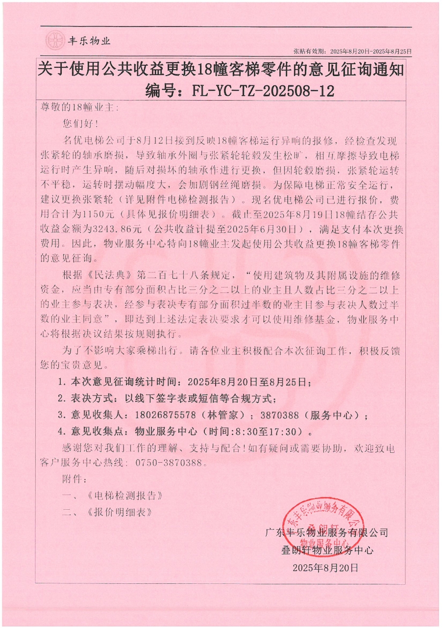 <td VALIGN="top" VALUES="" STYLE="border-width:0" BINDTYPE="0" ROWSPAN="19" COLSPAN="7" DATASOURCE="投票结果" ><font style="font-size:14pt;"><p style="text-align: left; font-family: 宋体; font-size: 16px; line-height: 1.75em;"><span style="font-family: 宋体;">凤山水岸花园蓬江区凤山水岸花园叠朗轩18幢全体业主:</span></p><p style="text-align: left; font-family: 宋体; font-size: 16px; line-height: 1.75em; text-indent: 2em;">本小区关于叠朗轩18幢客梯使用公共收益更换张紧轮的投票已表决结束,询异时间从2025年08月29日开始,投票询异公示期间,业主可通过微信查询自己的表决情况或可凭身份证件申请查询自己的表决情况;如公示的业主表决情况与查询的本人表决意见不一致的,可以以书面形式向投票组织机构申诉,投票组织机构予以纠正并重新公示表决结果。异议提出人对投票组织机构的处理仍有异议的,可以向街道办事处(镇人民政府)反映处理,涉及住宅专项维修资金的,可向属地住宅专项维修资金管理中心反映处理。</p><p><br/></p><p style="text-align: left; font-family: 宋体; font-size: 16px; line-height: 1.75em;"><strong><span style="font-family: 宋体">附件:</span></strong></p><p style="text-align: left; font-family: 宋体; font-size: 16px; line-height: 1.75em;"><strong>一、投票范围</strong></p><p style="text-align: left; font-family: 宋体; font-size: 16px; line-height: 1.75em; text-indent: 2em;">凤山水岸花园蓬江区凤山水岸花园叠朗轩18幢</p><p style="text-align: left; font-family: 宋体; font-size: 16px; line-height: 1.75em; text-indent: 2em;">总人数(专有部分人数之和):108</p><p style="text-align: left; font-family: 宋体; font-size: 16px; line-height: 1.75em; text-indent: 2em;"><span style="font-family: 宋体, SimSun; text-indent: 32px;"><span style="font-family: 宋体; text-indent: 32px;">总户数:110</span></span></p><p style="text-align: left; font-family: 宋体; font-size: 16px; line-height: 1.75em; text-indent: 2em;">建筑物总面积(专有部分面积之和):12993.40㎡</p><p style="text-align: left; font-family: 宋体; font-size: 16px; line-height: 1.75em;"><strong>二、询异公示起止时间</strong></p><p dir="ltr" style="text-align: left; font-family: 宋体; font-size: 16px; line-height: 1.75em; text-indent: 2em;"><span style="font-family: 宋体; text-indent: 36px;">2025年08月29日至2025年09月08日</span></p><p style="text-align: left; font-family: 宋体; font-size: 16px; line-height: 1.75em;"><strong>三、投票详细描述</strong></p><p style="text-align: left; font-family: 宋体; font-size: 16px; line-height: 1.75em; text-indent: 2em;"><p>叠朗轩18幢客梯运行异响,经检查发现是张紧轮的轴承磨损,导致轴承外圈与张紧轮轮毂发生松旷,相互摩擦导致电梯运行时产生异响。现需申请使用公共收益对18幢客梯进行更换张紧轮,工程维修预算金额为1150元,详见公示附件,如业主手机不能正常通过微信投票,请联系物业公司进行线下纸质投票,物业电话:0750-3870388</p></p><p style="text-align: left; font-family: 宋体; font-size: 16px; line-height: 1.75em;"><strong>四、计票规则</strong></p><p style="text-align: left; font-family: 宋体; font-size: 16px; line-height: 1.75em; text-indent: 2em;">表决事项:利用共用部位、共用设施设备合法经营,管理和使用经营收益<br /><p style='text-align: left; font-family: 宋体; font-size: 16px; line-height: 1.75em; text-indent: 2em;'>计票规则:弃权票不并入其它项 未表决票不并入其它项</p></p><p style="text-align: left; font-family: 宋体; font-size: 16px; line-height: 1.75em;"><strong>五、通过规则</strong></p><p style="text-align: left; font-family: 宋体; font-size: 16px; line-height: 1.75em;"><strong><strong style="font-family: 宋体; white-space: normal;"> 根据《中华人民共和国民法典》第二百七十八条规定:业主共同决定事项,应当由专有部分面积占比三分之二以上的业主且人数占比三分之二以上的业主参与表决。</strong></strong></p><p style="text-align: left; font-family: 宋体; font-size: 16px; line-height: 1.75em; text-indent: 2em;"><span style="font-family: 宋体; text-indent: 32px;"></span><span style="font-family: 宋体, SimSun; text-indent: 32px;">表决事项:利用共用部位、共用设施设备合法经营,管理和使用经营收益<br /><p style='text-align: left; font-family: 宋体; font-size: 16px; line-height: 1.75em; text-indent: 2em;'>通过规则:双2/3以上参与表决,参与表决双过半同意</p></span><span style="font-family: 宋体; text-indent: 32px;"></span></p><p style="text-align: left; font-family: 宋体; font-size: 16px; line-height: 1.75em;"><strong>六、投票结果</strong></p><p style="text-align: left; font-family: 宋体; font-size: 16px; line-height: 1.75em; text-indent: 2em;"><div id='resultTable'><table style='table-layout: fixed; font-size:12px; margin-top:10px' width='100%' border='0' cellspacing='0' cellpadding='0'><tr><td height='28' colspan='10' align='center' style='border: 1px solid #666'><strong style='font-size: 14px;'> 利用共用部位、共用设施设备合法经营,管理和使用经营收益</strong></td> </tr><tr id='trfirst'><td height='28' colspan='4' style='border-left: 1px solid #666; border-bottom: 1px solid #666'><strong> 申报单位:</strong> 广东丰乐物业服务有限公司</td><td colspan='3' style='border-left: 1px solid #666; border-bottom: 1px solid #666'><strong> 联系方式:</strong> 0750-3236369 </td><td colspan='3' style='border-left: 1px solid #666; border-bottom: 1px solid #666; border-right: 1px solid #666'><strong> 申报日期:</strong> 2025年8月21日 </td></tr><tr> <td height='28' colspan='5' style='border-left: 1px solid #666; border-bottom: 1px solid #666'><strong> 总人数(专有部分人数之和):</s