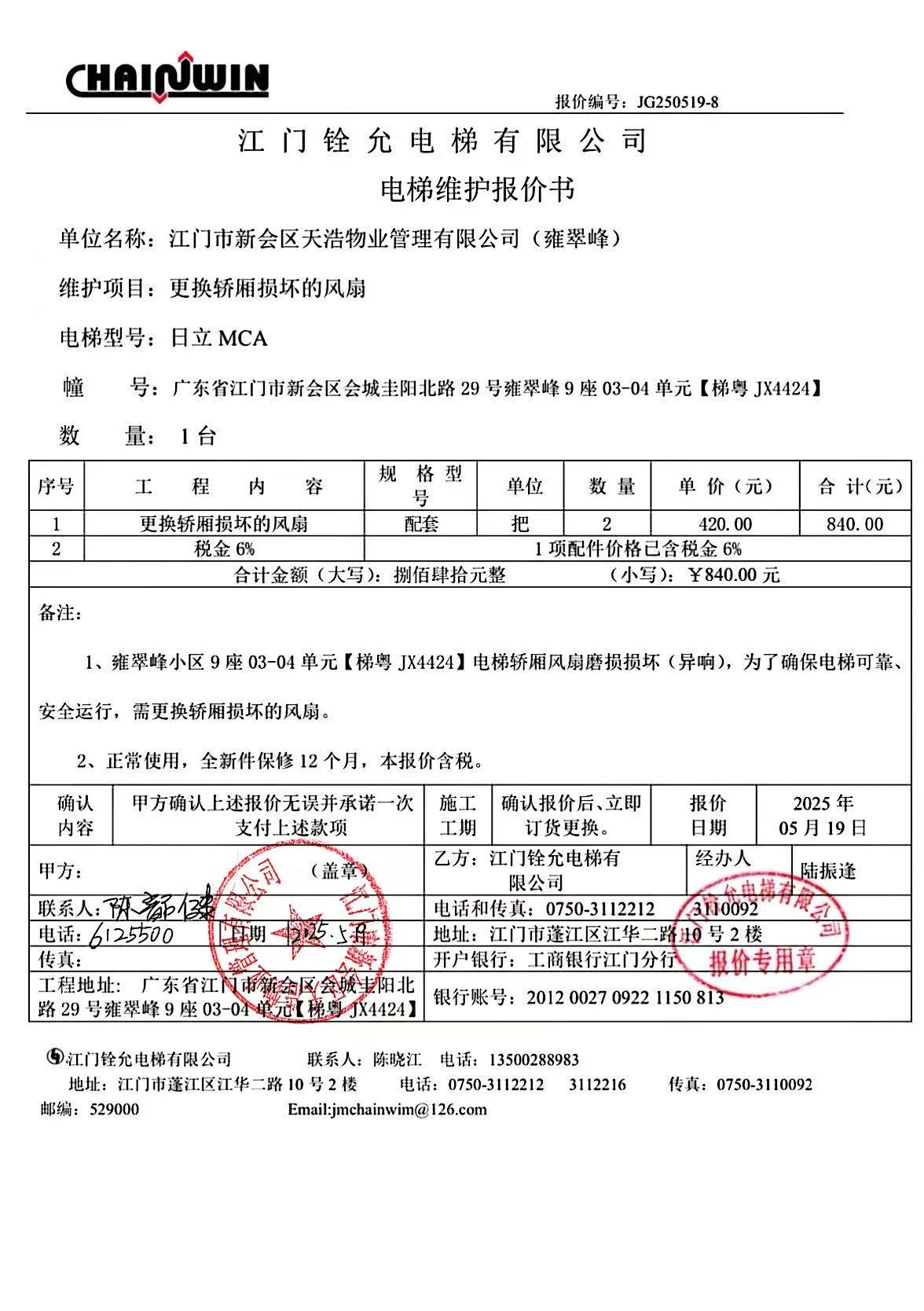 <td VALIGN="top" VALUES="" STYLE="border-width:0" BINDTYPE="0" ROWSPAN="19" COLSPAN="7" DATASOURCE="投票结果" ><font style="font-size:14pt;"><p style="white-space: normal; font-family: 宋体; line-height: 1.75em;">雍翠峰雍翠峰9座全体业主:</p><p style="white-space: normal; font-family: 宋体; line-height: 1.75em; text-indent: 2em;">本小区关于雍翠峰9座03-04电梯【梯粤JX4424】更换轿厢风扇使用维修资金的投票的投票已表决结束,询异时间从2025年05月28日开始,投票询异公示期间,业主可通过微信查询自己的表决情况或可凭身份证件申请查询自己的表决情况;如公示的业主表决情况与查询的本人表决意见不一致的,可以以书面形式向投票组织机构申诉,投票组织机构予以纠正并重新公示表决结果。异议提出人对投票组织机构的处理仍有异议的,可以向街道办事处(镇人民政府)反映处理,涉及住宅专项维修资金的,可向属地住宅专项维修资金管理中心反映处理。</p><p style="white-space: normal;"><br/></p><p style="white-space: normal; font-family: 宋体; line-height: 1.75em;"><strong>附件:</strong></p><p style="white-space: normal; font-family: 宋体; line-height: 1.75em;"><strong>一、投票范围</strong></p><p style="white-space: normal; font-family: 宋体; line-height: 1.75em; text-indent: 2em;">雍翠峰雍翠峰9座</p><p style="white-space: normal; font-family: 宋体; line-height: 1.75em; text-indent: 2em;">总人数(专有部分人数之和):20</p><p style="white-space: normal; font-family: 宋体; line-height: 1.75em; text-indent: 2em;"><span style="font-family: 宋体, SimSun;"><span style="font-family: 宋体; text-indent: 32px;"><span style="font-family: 宋体; text-indent: 32px;">总户数:20</span></span></span></p><p style="white-space: normal; font-family: 宋体; line-height: 1.75em; text-indent: 2em;">建筑物总面积(专有部分面积之和):2885.34㎡</p><p style="white-space: normal; font-family: 宋体; line-height: 1.75em;"><strong>二、询异公示起止时间</strong></p><p dir="ltr" style="white-space: normal; font-family: 宋体; line-height: 1.75em; text-indent: 2em;"><span style="text-indent: 36px;">2025年05月28日至2025年06月07日</span></p><p style="white-space: normal; font-family: 宋体; line-height: 1.75em;"><strong>三、投票详细描述</strong></p><p style="white-space: normal; font-family: 宋体; line-height: 1.75em; text-indent: 2em;"><p> 雍翠峰9座03-04电梯【梯粤JX4424】电梯异响严重,经检查确认为轿厢损坏的风扇产生异响,日常使用自然磨损损坏造成异响,已过保修期。</p><p> 现需申请使用维修资金对9座03-04电梯【梯粤JX4424】进行更换轿厢风扇,工程维修预算金额为840元,项目最终费用以施工合同签订金额为准。维修费用的分摊标准为按分户分摊,每户分摊42元,详见公示附件。如业主不能正常通过微信投票,请联系物业公司进行线下纸质投票,物业电话:0750-6125500</p><p><br/></p></p><p style="white-space: normal; font-family: 宋体; line-height: 1.75em;"><strong>四、计票规则</strong></p><p style="white-space: normal; font-family: 宋体; line-height: 1.75em; text-indent: 2em;">表决事项:使用建筑物及其附属设施的维修资金<br /><p style='text-align: left; font-family: 宋体; font-size: 16px; line-height: 1.75em; text-indent: 2em;'>计票规则:弃权票不并入其它项 未表决票不并入其它项</p></p><p style="white-space: normal; font-family: 宋体; line-height: 1.75em;"><strong>五、通过规则</strong></p><p style="white-space: normal; font-family: 宋体; line-height: 1.75em;"><strong><strong style="white-space: normal;"><span style="font-family: 宋体, SimSun;"> 根据《中华人民共和国民法典》第二百七十八条规定:业主共同决定事项,应当由专有部分面积占比三分之二以上的业主且人数占比三分之二以上的业主参与表决。</span></strong></strong></p><p style="white-space: normal; font-family: 宋体; line-height: 1.75em; text-indent: 2em;">表决事项:使用建筑物及其附属设施的维修资金<br /><p style='text-align: left; font-family: 宋体; font-size: 16px; line-height: 1.75em; text-indent: 2em;'>通过规则:双2/3以上参与表决,参与表决双过半同意</p></p><p style="white-space: normal; font-family: 宋体; line-height: 1.75em;"><strong>六、投票结果</strong></p><p style="white-space: normal; font-family: 宋体; line-height: 1.75em; text-indent: 2em;"><div id='resultTable'><table style='table-layout: fixed; font-size:12px; margin-top:10px' width='100%' border='0' cellspacing='0' cellpadding='0'><tr><td height='28' colspan='10' align='center' style='border: 1px solid #666'><strong style='font-size: 14px;'> 使用建筑物及其附属设施的维修资金</strong></td> </tr><tr id='trfirst'><td height='28' colspan='4' style='border-left: 1px solid #666; border-bottom: 1px solid #666'><strong> 申报单位:</strong> 江门市新会区天浩物业管理有限公司</td><td colspan='3' style='border-left: 1px solid #666; border-bottom: 1px solid #666'><strong> 联系方式:</strong> </td><td colspan='3' style='border-left: 1px solid #666; border-bottom: 1px solid #666; border-right: 1px solid #666'><strong> 申报日期:</strong> 2025年5月19日 </td></tr><tr> <td height='28' colspan='5' style='border-left: 1px solid #666; border-bottom: 1px solid #666'><strong> 总人数(专有部分人数之和):</strong>20人 </td><td colspan='5' style='border-left: 1px solid #666; border-bottom: 1px solid #666; border-right: 1px solid #666'><strong> 建筑物总面积(专有部分面积之和):</strong>2885.34㎡ </td> </tr><tr><td height='28' colspan='10' bgcolor='#F3F3F3' style='border-left: 1px solid #666;border-bottom: 1px solid #666;border-right: 1px solid #666'><strong> 参与人数及面积统计</strong></td></tr><tr><td height='28' co