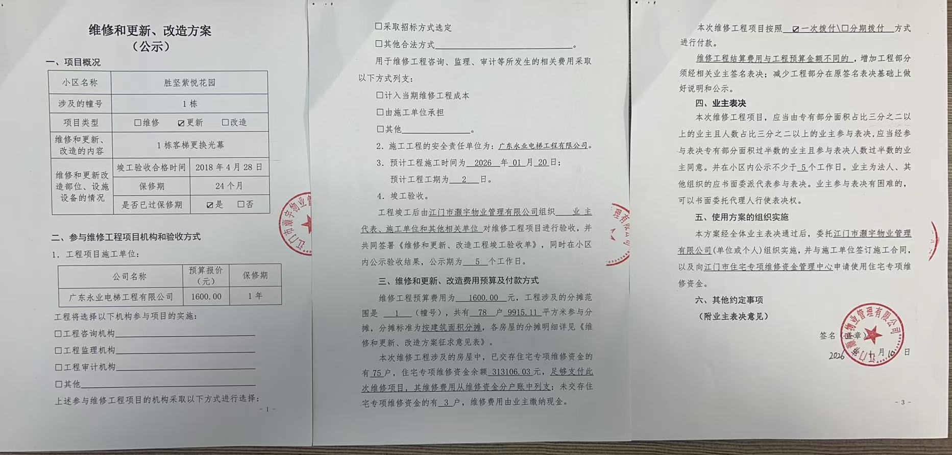 <td VALIGN="top" VALUES="" STYLE="border-width:0" BINDTYPE="0" ROWSPAN="19" COLSPAN="7" DATASOURCE="投票结果" ><font style="font-size:14pt;"><p style="white-space: normal; font-family: 宋体; line-height: 1.75em;">蓬江区胜坚紫悦花园蓬江区胜坚紫悦花园1幢全体业主:</p><p style="white-space: normal; font-family: 宋体; line-height: 1.75em; text-indent: 2em;">本小区关于蓬江区胜坚紫悦花园1栋客梯更换光幕使用维修资金的投票的投票已表决结束,询异时间从2026年02月05日开始,投票询异公示期间,业主可通过微信查询自己的表决情况或可凭身份证件申请查询自己的表决情况;如公示的业主表决情况与查询的本人表决意见不一致的,可以以书面形式向投票组织机构申诉,投票组织机构予以纠正并重新公示表决结果。异议提出人对投票组织机构的处理仍有异议的,可以向街道办事处(镇人民政府)反映处理,涉及住宅专项维修资金的,可向属地住宅专项维修资金管理中心反映处理。</p><p style="white-space: normal;"><br/></p><p style="white-space: normal; font-family: 宋体; line-height: 1.75em;"><strong>附件:</strong></p><p style="white-space: normal; font-family: 宋体; line-height: 1.75em;"><strong>一、投票范围</strong></p><p style="white-space: normal; font-family: 宋体; line-height: 1.75em; text-indent: 2em;">蓬江区胜坚紫悦花园蓬江区胜坚紫悦花园1幢</p><p style="white-space: normal; font-family: 宋体; line-height: 1.75em; text-indent: 2em;">总人数(专有部分人数之和):78</p><p style="white-space: normal; font-family: 宋体; line-height: 1.75em; text-indent: 2em;"><span style="font-family: 宋体, SimSun;"><span style="font-family: 宋体; text-indent: 32px;"><span style="font-family: 宋体; text-indent: 32px;">总户数:78</span></span></span></p><p style="white-space: normal; font-family: 宋体; line-height: 1.75em; text-indent: 2em;">建筑物总面积(专有部分面积之和):9915.11㎡</p><p style="white-space: normal; font-family: 宋体; line-height: 1.75em;"><strong>二、询异公示起止时间</strong></p><p dir="ltr" style="white-space: normal; font-family: 宋体; line-height: 1.75em; text-indent: 2em;"><span style="text-indent: 36px;">2026年02月05日至2026年02月12日</span></p><p style="white-space: normal; font-family: 宋体; line-height: 1.75em;"><strong>三、投票详细描述</strong></p><p style="white-space: normal; font-family: 宋体; line-height: 1.75em; text-indent: 2em;"><p><span style="font-family: 宋体, SimSun; font-size: 12px;"> 本小区1栋客梯光幕损坏导致轿门无法闭合,需要尽快更换光幕,存在安全隐患,不能正常运行。</span></p><p><span style="font-family: 宋体, SimSun; font-size: 12px;"> 现对1栋客梯进行维修,工程维修预算金额为1600元,项目最终费用以施工合同签订金额为准。因已过保修期,维修费用由相关业主按建筑面积公摊,每平方约0.16元,详见公示附件。如业主手机不能正常通过微信投票,请联系物业公司进行线下纸质投票,物业电话:0750-3339221。</span></p></p><p style="white-space: normal; font-family: 宋体; line-height: 1.75em;"><strong>四、计票规则</strong></p><p style="white-space: normal; font-family: 宋体; line-height: 1.75em; text-indent: 2em;">表决事项:使用建筑物及其附属设施的维修资金<br /><p style='text-align: left; font-family: 宋体; font-size: 16px; line-height: 1.75em; text-indent: 2em;'>计票规则:弃权票不并入其它项 未表决票不并入其它项</p></p><p style="white-space: normal; font-family: 宋体; line-height: 1.75em;"><strong>五、通过规则</strong></p><p style="white-space: normal; font-family: 宋体; line-height: 1.75em;"><strong><strong style="white-space: normal;"><span style="font-family: 宋体, SimSun;"> 根据《中华人民共和国民法典》第二百七十八条规定:业主共同决定事项,应当由专有部分面积占比三分之二以上的业主且人数占比三分之二以上的业主参与表决。</span></strong></strong></p><p style="white-space: normal; font-family: 宋体; line-height: 1.75em; text-indent: 2em;">表决事项:使用建筑物及其附属设施的维修资金<br /><p style='text-align: left; font-family: 宋体; font-size: 16px; line-height: 1.75em; text-indent: 2em;'>通过规则:双2/3以上参与表决,参与表决双过半同意</p></p><p style="white-space: normal; font-family: 宋体; line-height: 1.75em;"><strong>六、投票结果</strong></p><p style="white-space: normal; font-family: 宋体; line-height: 1.75em; text-indent: 2em;"><div id='resultTable'><table style='table-layout: fixed; font-size:12px; margin-top:10px' width='100%' border='0' cellspacing='0' cellpadding='0'><tr><td height='28' colspan='10' align='center' style='border: 1px solid #666'><strong style='font-size: 14px;'> 使用建筑物及其附属设施的维修资金</strong></td> </tr><tr id='trfirst'><td height='28' colspan='4' style='border-left: 1px solid #666; border-bottom: 1px solid #666'><strong> 申报单位:</strong> 江门市灏宇物业管理有限公司</td><td colspan='3' style='border-left: 1px solid #666; border-bottom: 1px solid #666'><strong> 联系方式:</strong> </td><td colspan='3' style='border-left: 1px solid #666; border-bottom: 1px solid #666; border-right: 1px solid #666'><strong> 申报日期:</strong> 2026年1月12日 </td></tr><tr> <td height='28' colspan='5' style='border-left: 1px solid #666; border-bottom: 1px solid #666'><strong> 总人数(专有部分人数之和):</strong>78人 </td><td colspan='5' style='border-left: 1px solid #666; border-bottom: 1px solid #666; border-right: 1px solid #666'><strong> 建筑物总面积(专有部分面积之和):</strong>9915.11㎡ </td> </tr><tr><td height='28' colspan='10' bgcolor='#F3F3F3' style='border-left: 1px solid #666;border-bottom: 1px solid #666;border-right: 