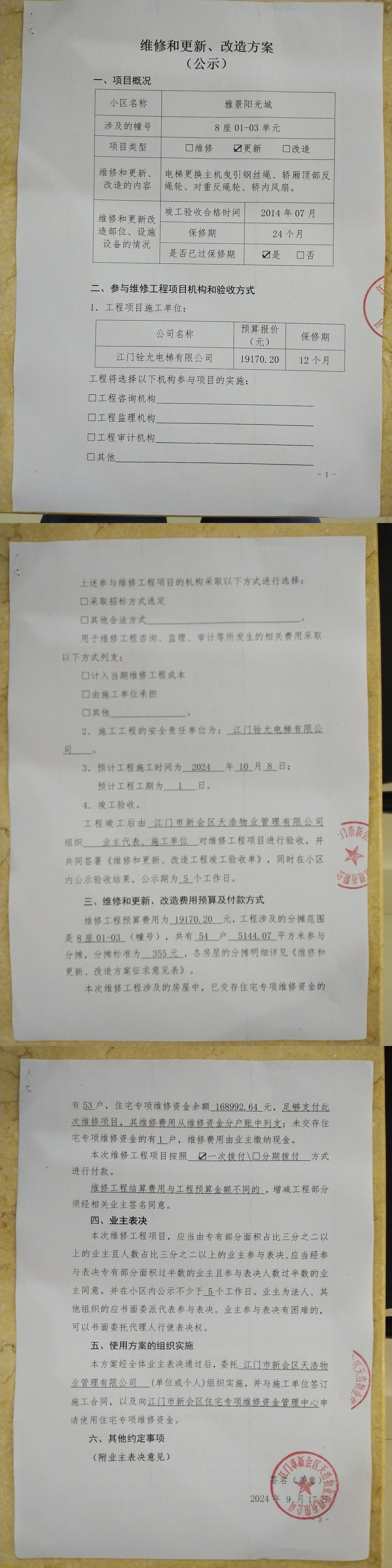 <td valign="top" values="" style="border-width:0" bindtype="0" rowspan="17" colspan="7" datasource="投票结果"><font style=" font-family:方正小标宋简体;font-size:14pt;"><p style="line-height: 1.75em;"><span style="font-family: 宋体, SimSun;">各位尊敬的业主:</span><br></p><p style="text-indent: 2em; line-height: 1.75em;"><span style="font-family: 宋体, SimSun;">根据法律法规的规定,本小区业主利用“江门市物业事项表决管理系统”已对本小区公共事务决策事项进行了表决,在经过7日的询异公示期后,未收到业主有效的异议。现将投票结果公告,并就产生的法律效力说明如下:</span></p><p style="line-height: 1.75em; text-indent: 0em;"><strong style="text-indent: 2em;"><span style="font-family: 宋体, SimSun;">一、投票范围</span></strong></p><p style="text-indent: 2em; line-height: 1.75em;"><span style="font-family: 宋体, SimSun;">雅景阳光城8座</span></p><p style="text-indent: 2em; line-height: 1.75em;"><span style="font-family: 宋体, SimSun;">总人数(专有部分人数之和):54</span></p><p style="text-indent: 2em; line-height: 1.75em;"><span style="font-family: 宋体, SimSun;"><span style="font-family: 宋体, SimSun; text-indent: 32px;"><span style="font-family: 宋体; text-indent: 32px;"><span style="font-family: 宋体; text-indent: 32px;">总户数:54</span></span></span></span></p><p style="text-indent: 2em; line-height: 1.75em;"><span style="font-family: 宋体, SimSun;">建筑物总面积(专有部分面积之和):5144.07㎡</span></p><p style="line-height: 1.75em;"><strong><span style="font-family: 宋体, SimSun;">二、投票结果公告时间</span></strong></p><p style="text-indent: 2em; line-height: 1.75em;"><span style="font-family: 宋体, SimSun;"><span style="font-family: 宋体, SimSun; text-indent: 32px;">从2024年10月16日开始</span></span></p><p style="line-height: 1.75em;"><strong><span style="font-family: 宋体, SimSun;">三、计票规则</span></strong></p><p style="text-indent: 2em; line-height: 1.75em;"><span style="font-family: 宋体, SimSun;">表决事项:使用建筑物及其附属设施的维修资金<br></span></p><p style="font-family: 宋体, SimSun;line-height: 1.75em; text-indent: 2em;">计票规则:弃权票不并入其它项 未表决票不并入其它项</p><p></p><p style="line-height: 1.75em;"><strong><span style="font-family: 宋体, SimSun;">四、通过规则</span></strong></p><p style="line-height: 1.75em;"><strong><span style="font-family: 宋体, SimSun;"> 根据《中华人民共和国民法典》第二百七十八条规定:业主共同决定事项,应当由专有部分面积占比三分之二以上的业主且人数占比三分之二以上的业主参与表决。</span></strong></p><p style="text-indent: 2em; line-height: 1.75em;"><span style="font-family: 宋体, SimSun;"><span style="font-family: 宋体, SimSun; text-indent: 32px;">表决事项:使用建筑物及其附属设施的维修资金<br></span></span></p><p style="font-family: 宋体, SimSun;line-height: 1.75em; text-indent: 2em;">通过规则:双2/3以上参与表决,参与表决双过半同意</p><p></p><p style="line-height: 1.75em;"><strong><span style="font-family: 宋体, SimSun;">五、投票结果</span></strong></p><p style="line-height: 1.75em; text-indent: 2em;"><span style="font-family: 宋体, SimSun; text-indent: 2em;"></span></p><div id="resultTable"><table style="table-layout: fixed; font-size:12px; margin-top:10px" width="100%" border="0" cellspacing="0" cellpadding="0"><tbody><tr><td height="28" colspan="10" align="center" style="border: 1px solid #666"><strong style="font-size: 14px;"> 使用建筑物及其附属设施的维修资金</strong></td> </tr><tr id="trfirst"><td height="28" colspan="4" style="border-left: 1px solid #666; border-bottom: 1px solid #666"><strong> 申报单位:</strong> 江门市新会区天浩物业管理有限公司</td><td colspan="3" style="border-left: 1px solid #666; border-bottom: 1px solid #666"><strong> 联系方式:</strong> </td><td colspan="3" style="border-left: 1px solid #666; border-bottom: 1px solid #666; border-right: 1px solid #666"><strong> 申报日期:</strong> 2024年9月20日 </td></tr><tr> <td height="28" colspan="5" style="border-left: 1px solid #666; border-bottom: 1px solid #666"><strong> 列支总人数(专有部分人数之和):</strong>54人 </td><td colspan="5" style="border-left: 1px solid #666; border-bottom: 1px solid #666; border-right: 1px solid #666"><strong> 列支建筑物总面积(专有部分面积之和):</strong>5144.07㎡ </td> </tr><tr><td height="28" colspan="10" bgcolor="#F3F3F3" style="border-left: 1px solid #666;border-bottom: 1px solid #666;border-right: 1px solid #666"><strong> 参与表决人数及面积统计</strong></td></tr><tr><td height="28" colspan="5" style="border-left: 1px solid #666; border-bottom: 1px solid #666"><strong> 参与表决人数:</strong>37人</td><td colspan="5" style="border-left: 1px solid #666; border-bottom: 1px solid #666; border-right: 1px solid #666"><strong> 参与表决人数占总人数比例:</strong>68.52%</td></tr><tr><td height="28" colspan="5" style="border-left: 1px solid #666; border-bottom: 1px solid #666"><strong> 参与表决面积:</strong>3589.20㎡</td><td colspan="5" style="border-left: 1px solid #666; border-bottom: 1px solid #666; border-right: 1px solid #666"><strong> 参与表决面积占总面积比例:</strong>69.77%</td></tr><tr><td height="28" colspan="10" bgcolor="#F3F3F3" style="border-left: 1px solid #666; border-bottom: 1px solid #666;border-right: 1px solid #666"> <strong> 参与表决同意人数及面积统计</strong></td> </tr><tr><td height="28" colspan="5" style="border-left: 1px solid #666; border-bottom: 1px solid #666"><strong> 参与表决同意人数:</strong>37人 </td><td colspan="5" style="border-left: 1px solid #666; border-bottom: 1px solid #666; border-right: 1px solid #666"><strong> 参与表决