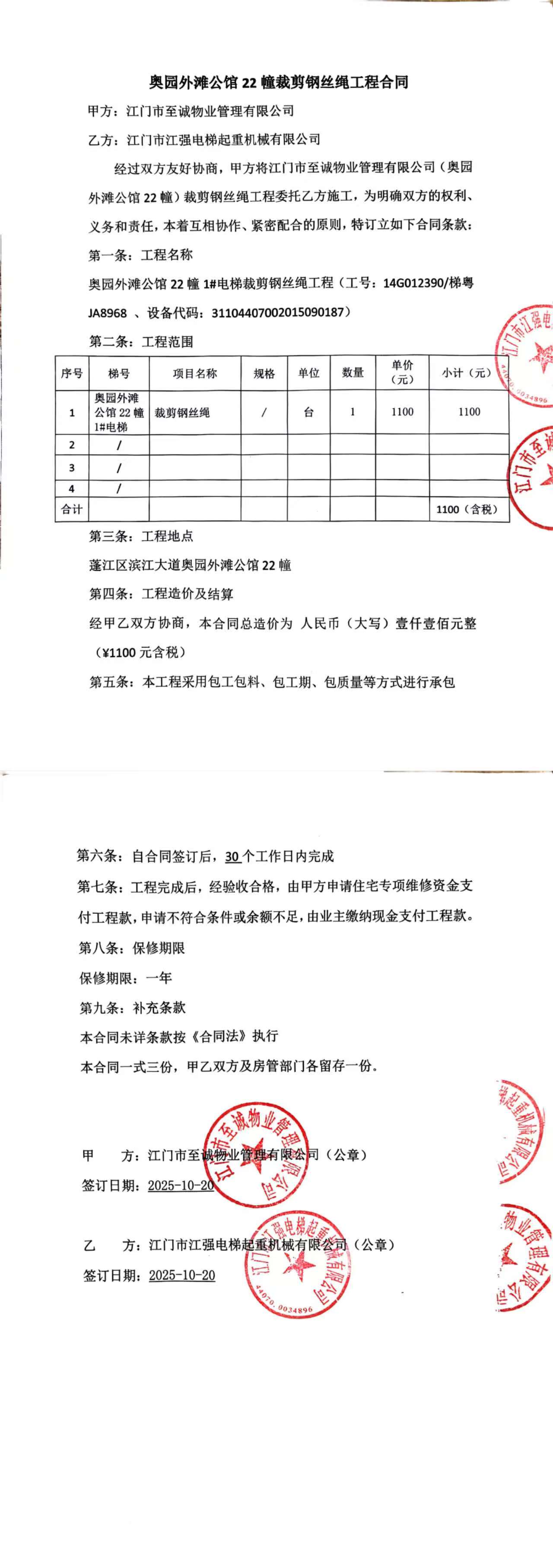 <td VALIGN="top" VALUES="" STYLE="border-width:0" BINDTYPE="0" ROWSPAN="19" COLSPAN="7" DATASOURCE="投票结果" ><font style="font-size:14pt;"><p style="white-space: normal; font-family: 宋体; line-height: 1.75em;">奥园外滩公馆蓬江区棠下镇奥园外滩公馆22幢全体业主:</p><p style="white-space: normal; font-family: 宋体; line-height: 1.75em; text-indent: 2em;">本小区关于奥园外滩公馆22幢1#电梯裁剪钢丝绳使用维修资金的投票的投票已表决结束,询异时间从2025年11月12日开始,投票询异公示期间,业主可通过微信查询自己的表决情况或可凭身份证件申请查询自己的表决情况;如公示的业主表决情况与查询的本人表决意见不一致的,可以以书面形式向投票组织机构申诉,投票组织机构予以纠正并重新公示表决结果。异议提出人对投票组织机构的处理仍有异议的,可以向街道办事处(镇人民政府)反映处理,涉及住宅专项维修资金的,可向属地住宅专项维修资金管理中心反映处理。</p><p style="white-space: normal;"><br/></p><p style="white-space: normal; font-family: 宋体; line-height: 1.75em;"><strong>附件:</strong></p><p style="white-space: normal; font-family: 宋体; line-height: 1.75em;"><strong>一、投票范围</strong></p><p style="white-space: normal; font-family: 宋体; line-height: 1.75em; text-indent: 2em;">奥园外滩公馆蓬江区棠下镇奥园外滩公馆22幢</p><p style="white-space: normal; font-family: 宋体; line-height: 1.75em; text-indent: 2em;">总人数(专有部分人数之和):55</p><p style="white-space: normal; font-family: 宋体; line-height: 1.75em; text-indent: 2em;"><span style="font-family: 宋体, SimSun;"><span style="font-family: 宋体; text-indent: 32px;"><span style="font-family: 宋体; text-indent: 32px;">总户数:56</span></span></span></p><p style="white-space: normal; font-family: 宋体; line-height: 1.75em; text-indent: 2em;">建筑物总面积(专有部分面积之和):10887.72㎡</p><p style="white-space: normal; font-family: 宋体; line-height: 1.75em;"><strong>二、询异公示起止时间</strong></p><p dir="ltr" style="white-space: normal; font-family: 宋体; line-height: 1.75em; text-indent: 2em;"><span style="text-indent: 36px;">2025年11月12日至2025年11月22日</span></p><p style="white-space: normal; font-family: 宋体; line-height: 1.75em;"><strong>三、投票详细描述</strong></p><p style="white-space: normal; font-family: 宋体; line-height: 1.75em; text-indent: 2em;"><p>小区22幢的电梯日常维保期间,维保发现1#电梯限速器钢丝绳老化,钢丝绳拉长严重,因使用时间较长,不能正常运行。</p><p> 现对22幢1#电梯进行维修,工程维修预算金额为1100元,项目最终费用以施工合同签订金额为准。因已过保修期,维修费用由相关业主按建筑面积分摊,每平方约0.1元,详见公示附件。如业主手机不能正常通过微信投票,请联系物业公司进行线下纸质投票,物业电话:0750-3851968。</p><p><br/></p></p><p style="white-space: normal; font-family: 宋体; line-height: 1.75em;"><strong>四、计票规则</strong></p><p style="white-space: normal; font-family: 宋体; line-height: 1.75em; text-indent: 2em;">表决事项:使用建筑物及其附属设施的维修资金<br /><p style='text-align: left; font-family: 宋体; font-size: 16px; line-height: 1.75em; text-indent: 2em;'>计票规则:弃权票不并入其它项 未表决票不并入其它项</p></p><p style="white-space: normal; font-family: 宋体; line-height: 1.75em;"><strong>五、通过规则</strong></p><p style="white-space: normal; font-family: 宋体; line-height: 1.75em;"><strong><strong style="white-space: normal;"><span style="font-family: 宋体, SimSun;"> 根据《中华人民共和国民法典》第二百七十八条规定:业主共同决定事项,应当由专有部分面积占比三分之二以上的业主且人数占比三分之二以上的业主参与表决。</span></strong></strong></p><p style="white-space: normal; font-family: 宋体; line-height: 1.75em; text-indent: 2em;">表决事项:使用建筑物及其附属设施的维修资金<br /><p style='text-align: left; font-family: 宋体; font-size: 16px; line-height: 1.75em; text-indent: 2em;'>通过规则:双2/3以上参与表决,参与表决双过半同意</p></p><p style="white-space: normal; font-family: 宋体; line-height: 1.75em;"><strong>六、投票结果</strong></p><p style="white-space: normal; font-family: 宋体; line-height: 1.75em; text-indent: 2em;"><div id='resultTable'><table style='table-layout: fixed; font-size:12px; margin-top:10px' width='100%' border='0' cellspacing='0' cellpadding='0'><tr><td height='28' colspan='10' align='center' style='border: 1px solid #666'><strong style='font-size: 14px;'> 使用建筑物及其附属设施的维修资金</strong></td> </tr><tr id='trfirst'><td height='28' colspan='4' style='border-left: 1px solid #666; border-bottom: 1px solid #666'><strong> 申报单位:</strong> 江门市至诚物业管理有限公司</td><td colspan='3' style='border-left: 1px solid #666; border-bottom: 1px solid #666'><strong> 联系方式:</strong> 3851968 </td><td colspan='3' style='border-left: 1px solid #666; border-bottom: 1px solid #666; border-right: 1px solid #666'><strong> 申报日期:</strong> 2025年10月24日 </td></tr><tr> <td height='28' colspan='5' style='border-left: 1px solid #666; border-bottom: 1px solid #666'><strong> 总人数(专有部分人数之和):</strong>55人 </td><td colspan='5' style='border-left: 1px solid #666; border-bottom: 1px solid #666; border-right: 1px solid #666'><strong> 建筑物总面积(专有部分面积之和):</strong>10887.72㎡ </td> </tr><tr><td height='28' colspan='10' bgcolor='#F3F3F3' style='border-left: 1px solid #666;border-bottom: 1px solid #666;border-right: 1px solid #666'><strong> 参与人数及面积统计</strong></td></tr><tr><td heig