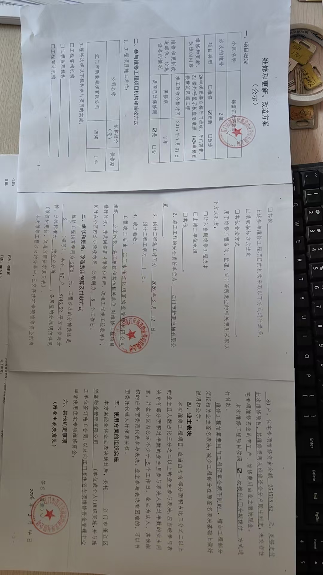 <td VALIGN="top" VALUES="" STYLE="border-width:0" BINDTYPE="0" ROWSPAN="19" COLSPAN="7" DATASOURCE="投票结果" ><font style="font-size:14pt;"><p style="white-space: normal; font-family: 宋体; line-height: 1.75em;">江门市蓬江区锦富汇景湾豪庭蓬江区棠下镇锦富汇景湾豪庭2幢全体业主:</p><p style="white-space: normal; font-family: 宋体; line-height: 1.75em; text-indent: 2em;">本小区关于锦富汇景湾豪庭2幢2#电梯更换8楼厅门挂板、厅门弹簧、22楼外呼显示板、应急电源 1#2#电梯更换横流风扇工程使用维修资金的投票的投票已表决结束,询异时间从2026年03月16日开始,投票询异公示期间,业主可通过微信查询自己的表决情况或可凭身份证件申请查询自己的表决情况;如公示的业主表决情况与查询的本人表决意见不一致的,可以以书面形式向投票组织机构申诉,投票组织机构予以纠正并重新公示表决结果。异议提出人对投票组织机构的处理仍有异议的,可以向街道办事处(镇人民政府)反映处理,涉及住宅专项维修资金的,可向属地住宅专项维修资金管理中心反映处理。</p><p style="white-space: normal;"><br/></p><p style="white-space: normal; font-family: 宋体; line-height: 1.75em;"><strong>附件:</strong></p><p style="white-space: normal; font-family: 宋体; line-height: 1.75em;"><strong>一、投票范围</strong></p><p style="white-space: normal; font-family: 宋体; line-height: 1.75em; text-indent: 2em;">江门市蓬江区锦富汇景湾豪庭蓬江区棠下镇锦富汇景湾豪庭2幢</p><p style="white-space: normal; font-family: 宋体; line-height: 1.75em; text-indent: 2em;">总人数(专有部分人数之和):84</p><p style="white-space: normal; font-family: 宋体; line-height: 1.75em; text-indent: 2em;"><span style="font-family: 宋体, SimSun;"><span style="font-family: 宋体; text-indent: 32px;"><span style="font-family: 宋体; text-indent: 32px;">总户数:87</span></span></span></p><p style="white-space: normal; font-family: 宋体; line-height: 1.75em; text-indent: 2em;">建筑物总面积(专有部分面积之和):8746.52㎡</p><p style="white-space: normal; font-family: 宋体; line-height: 1.75em;"><strong>二、询异公示起止时间</strong></p><p dir="ltr" style="white-space: normal; font-family: 宋体; line-height: 1.75em; text-indent: 2em;"><span style="text-indent: 36px;">2026年03月16日至2026年03月23日</span></p><p style="white-space: normal; font-family: 宋体; line-height: 1.75em;"><strong>三、投票详细描述</strong></p><p style="white-space: normal; font-family: 宋体; line-height: 1.75em; text-indent: 2em;"><p>小区2幢的电梯日常维保期间,维保发现2#电梯更换8楼厅门挂板老化、厅门弹簧老化、22楼外呼显示板故障、应急电源故障 1#2#电梯更换横流风扇老化,需要维修方能正常运行使用。</p><p> 现对2幢1#2#电梯进行维修,工程维修预算金额为2950元,项目最终费用以施工合同签订金额为准。因已过保修期,维修费用由相关业主按分户分摊,每户约33.91元,详见公示附件。如业主手机不能正常通过微信投票,请联系物业公司进行线下纸质投票,物业电话:0750-3598316 管理员:15088116809。</p><p><br/></p></p><p style="white-space: normal; font-family: 宋体; line-height: 1.75em;"><strong>四、计票规则</strong></p><p style="white-space: normal; font-family: 宋体; line-height: 1.75em; text-indent: 2em;">表决事项:使用建筑物及其附属设施的维修资金<br /><p style='text-align: left; font-family: 宋体; font-size: 16px; line-height: 1.75em; text-indent: 2em;'>计票规则:弃权票不并入其它项 未表决票不并入其它项</p></p><p style="white-space: normal; font-family: 宋体; line-height: 1.75em;"><strong>五、通过规则</strong></p><p style="white-space: normal; font-family: 宋体; line-height: 1.75em;"><strong><strong style="white-space: normal;"><span style="font-family: 宋体, SimSun;"> 根据《中华人民共和国民法典》第二百七十八条规定:业主共同决定事项,应当由专有部分面积占比三分之二以上的业主且人数占比三分之二以上的业主参与表决。</span></strong></strong></p><p style="white-space: normal; font-family: 宋体; line-height: 1.75em; text-indent: 2em;">表决事项:使用建筑物及其附属设施的维修资金<br /><p style='text-align: left; font-family: 宋体; font-size: 16px; line-height: 1.75em; text-indent: 2em;'>通过规则:双2/3以上参与表决,参与表决双过半同意</p></p><p style="white-space: normal; font-family: 宋体; line-height: 1.75em;"><strong>六、投票结果</strong></p><p style="white-space: normal; font-family: 宋体; line-height: 1.75em; text-indent: 2em;"><div id='resultTable'><table style='table-layout: fixed; font-size:12px; margin-top:10px' width='100%' border='0' cellspacing='0' cellpadding='0'><tr><td height='28' colspan='10' align='center' style='border: 1px solid #666'><strong style='font-size: 14px;'> 使用建筑物及其附属设施的维修资金</strong></td> </tr><tr id='trfirst'><td height='28' colspan='4' style='border-left: 1px solid #666; border-bottom: 1px solid #666'><strong> 申报单位:</strong> 江门市蓬江区锦富物业管理有限公司</td><td colspan='3' style='border-left: 1px solid #666; border-bottom: 1px solid #666'><strong> 联系方式:</strong> 3598316 </td><td colspan='3' style='border-left: 1px solid #666; border-bottom: 1px solid #666; border-right: 1px solid #666'><strong> 申报日期:</strong> 2026年2月5日 </td></tr><tr> <td height='28' colspan='5' style='border-left: 1px solid #666; border-bottom: 1px solid #666'><strong> 总人数(专有部分人数之和):</strong>84人 </td><td colspan='5' style='border-left: 1px solid #666; border-bottom: 1px solid #666; border-right: 1px solid #666'><strong> 建筑物总面积(专有部分面积之