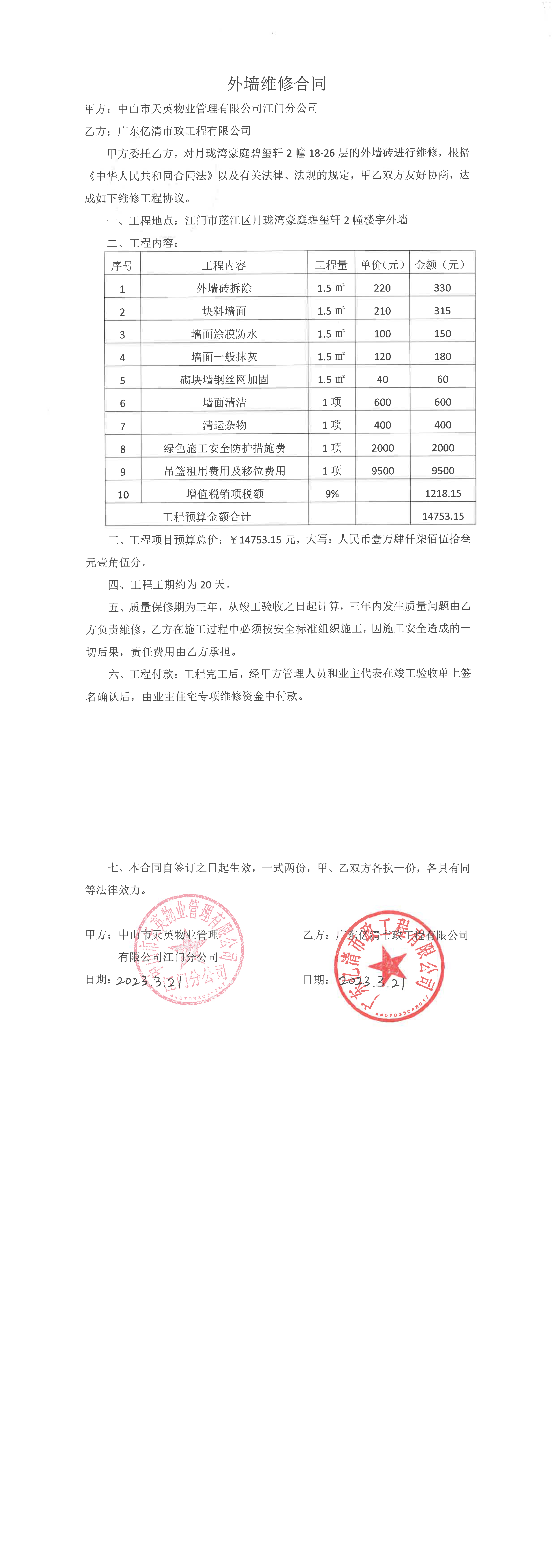 <td valign="top" values="" style="border-width:0" bindtype="0" rowspan="17" colspan="7" datasource="投票结果"><font style=" font-family:方正小标宋简体;font-size:14pt;"><p style="line-height: 1.75em;"><span style="font-family: 宋体, SimSun;">各位尊敬的业主:</span><br></p><p style="text-indent: 2em; line-height: 1.75em;"><span style="font-family: 宋体, SimSun;">根据法律法规的规定,本小区业主利用“物业公共事务决策系统”已对本小区公共事务决策事项进行了表决,在经过7日的询异公示期后,未收到业主有效的异议。现将投票结果公告,并就产生的法律效力说明如下:</span></p><p style="line-height: 1.75em; text-indent: 0em;"><strong style="text-indent: 2em;"><span style="font-family: 宋体, SimSun;">一、投票范围</span></strong></p><p style="text-indent: 2em; line-height: 1.75em;"><span style="font-family: 宋体, SimSun;">蓬江区月珑湾豪庭蓬江区月珑湾豪庭碧玺轩2幢</span></p><p style="text-indent: 2em; line-height: 1.75em;"><span style="font-family: 宋体, SimSun;">总人数(专有部分人数之和):56</span></p><p style="text-indent: 2em; line-height: 1.75em;"><span style="font-family: 宋体, SimSun;"><span style="font-family: 宋体, SimSun; text-indent: 32px;">总户数:97</span></span></p><p style="text-indent: 2em; line-height: 1.75em;"><span style="font-family: 宋体, SimSun;">建筑物总面积(专有部分面积之和):11259.53㎡</span></p><p style="line-height: 1.75em;"><strong><span style="font-family: 宋体, SimSun;">二、投票起止时间</span></strong></p><p style="text-indent: 2em; line-height: 1.75em;"><span style="font-family: 宋体, SimSun;">投票表决时间:从2023年03月25日到2023年05月09日止</span></p><p style="text-indent: 2em; line-height: 1.75em;"><span style="font-family: 宋体, SimSun;">投票询异公示时间:从2023年05月10日开始</span></p><p style="text-indent: 2em; line-height: 1.75em;"><span style="font-family: 宋体, SimSun;">投票结果通知公告时间:从2023年05月17日开始</span></p><p style="line-height: 1.75em;"><strong><span style="font-family: 宋体, SimSun;">三、计票规则</span></strong></p><p style="text-indent: 2em; line-height: 1.75em;"><span style="font-family: 宋体, SimSun;">表决事项:使用建筑物及其附属设施的维修资金<br></span></p><p style="font-family: 宋体, SimSun;line-height: 1.75em; text-indent: 2em;">计票规则:弃权票不并入其它项 未表决票不并入其它项</p><p></p><p style="line-height: 1.75em;"><strong><span style="font-family: 宋体, SimSun;">四、通过规则</span></strong></p><p style="text-indent: 2em; line-height: 1.75em;"><span style="font-family: 宋体, SimSun;"><span style="font-family: 宋体, SimSun; text-indent: 32px;">表决事项:使用建筑物及其附属设施的维修资金<br></span></span></p><p style="font-family: 宋体, SimSun;line-height: 1.75em; text-indent: 2em;">通过规则:参与表决专有部分面积过半数的业主且参与表决人数过半数的业主同意</p><p></p><p style="line-height: 1.75em;"><strong><span style="font-family: 宋体, SimSun;">五、投票结果</span></strong></p><p style="line-height: 1.75em; text-indent: 2em;"><span style="font-family: 宋体, SimSun; text-indent: 2em;"></span></p><div id="resultTable"><table style="table-layout: fixed; font-size:12px; margin-top:10px" width="100%" border="0" cellspacing="0" cellpadding="0"><tbody><tr><td height="28" colspan="10" align="center" style="border: 1px solid #666"><strong style="font-size: 14px;"> 使用建筑物及其附属设施的维修资金</strong></td> </tr><tr id="trfirst"><td height="28" colspan="4" style="border-left: 1px solid #666; border-bottom: 1px solid #666"><strong> 申报单位:</strong> 中山市天英物业管理有限公司江门分公司</td><td colspan="3" style="border-left: 1px solid #666; border-bottom: 1px solid #666"><strong> 联系方式:</strong> 2037899 </td><td colspan="3" style="border-left: 1px solid #666; border-bottom: 1px solid #666; border-right: 1px solid #666"><strong> 申报日期:</strong> 2023年3月22日 </td></tr><tr> <td height="28" colspan="5" style="border-left: 1px solid #666; border-bottom: 1px solid #666"><strong> 总人数(专有部分人数之和):</strong>56人 </td><td colspan="5" style="border-left: 1px solid #666; border-bottom: 1px solid #666; border-right: 1px solid #666"><strong> 建筑物总面积(专有部分面积之和):</strong>11259.53㎡ </td> </tr><tr><td height="28" colspan="10" bgcolor="#F3F3F3" style="border-left: 1px solid #666;border-bottom: 1px solid #666;border-right: 1px solid #666"><strong> 参与人数及面积统计</strong></td></tr><tr><td height="28" colspan="5" style="border-left: 1px solid #666; border-bottom: 1px solid #666"><strong> 参与表决专有部分人数之和:</strong>43人</td><td colspan="5" style="border-left: 1px solid #666; border-bottom: 1px solid #666; border-right: 1px solid #666"><strong> 参与表决占有表决权总人数比例:</strong>76.79%</td></tr><tr><td height="28" colspan="5" style="border-left: 1px solid #666; border-bottom: 1px solid #666"><strong> 参与表决专有部分面积之和:</strong>7746.63㎡</td><td colspan="5" style="border-left: 1px solid #666; border-bottom: 1px solid #666; border-right: 1px solid #666"><strong> 参与表决占有表决权总面积比例:</strong>68.80%</td></tr><tr><td height="28" colspan="10" bgcolor="#F3F3F3" style="border-left: 1px solid #666; border-bottom: 1px solid #666;border-right: 1px solid #666"> <strong> 未参与人数及面积统计</strong></td> </tr><tr><td height="28" colspan="5" style="border-left: 1px solid #666; border-bottom: 1px solid #666"><strong> 未参与表决专有部分人数之和:</strong>13人 </td><td colspan="5" style="border-left: 1px solid #666; border-bottom: 1px solid #666; border-right: 1px solid #666"><strong> 未参与表决占有表决权总人数比例:<