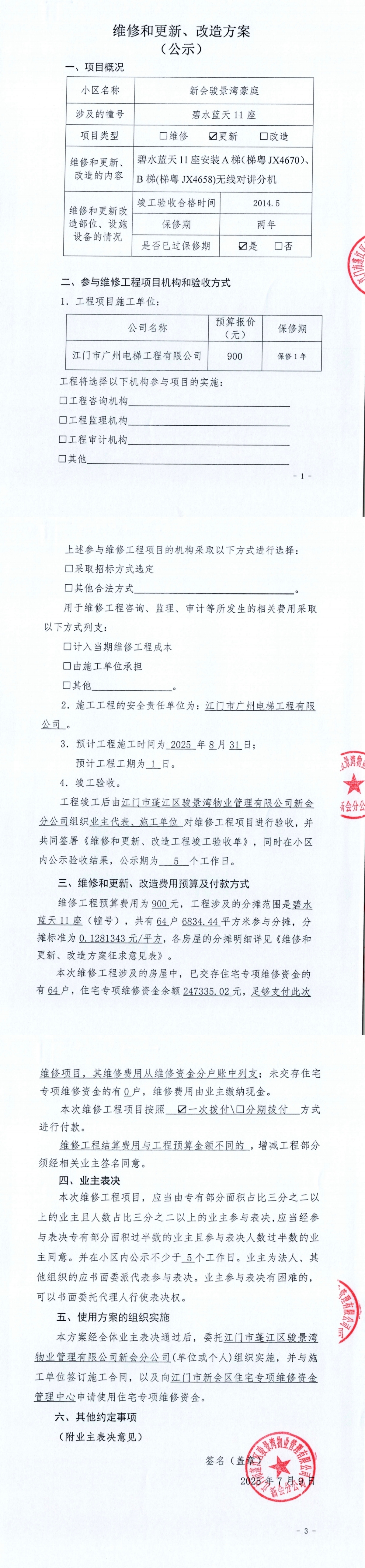 <td VALIGN="top" VALUES="" STYLE="border-width:0" BINDTYPE="0" ROWSPAN="19" COLSPAN="7" DATASOURCE="投票结果" ><font style="font-size:14pt;"><p style="white-space: normal; font-family: 宋体; line-height: 1.75em;">新会骏景湾豪庭碧水蓝天11座全体业主:</p><p style="white-space: normal; font-family: 宋体; line-height: 1.75em; text-indent: 2em;">本小区关于新会骏景湾豪庭碧水蓝天11座A梯(梯粤JX4670)、B梯(梯粤JX4658)安装无线对讲分机使用维修资金的投票的投票已表决结束,询异时间从2025年07月28日开始,投票询异公示期间,业主可通过微信查询自己的表决情况或可凭身份证件申请查询自己的表决情况;如公示的业主表决情况与查询的本人表决意见不一致的,可以以书面形式向投票组织机构申诉,投票组织机构予以纠正并重新公示表决结果。异议提出人对投票组织机构的处理仍有异议的,可以向街道办事处(镇人民政府)反映处理,涉及住宅专项维修资金的,可向属地住宅专项维修资金管理中心反映处理。</p><p style="white-space: normal;"><br/></p><p style="white-space: normal; font-family: 宋体; line-height: 1.75em;"><strong>附件:</strong></p><p style="white-space: normal; font-family: 宋体; line-height: 1.75em;"><strong>一、投票范围</strong></p><p style="white-space: normal; font-family: 宋体; line-height: 1.75em; text-indent: 2em;">新会骏景湾豪庭碧水蓝天11座</p><p style="white-space: normal; font-family: 宋体; line-height: 1.75em; text-indent: 2em;">总人数(专有部分人数之和):63</p><p style="white-space: normal; font-family: 宋体; line-height: 1.75em; text-indent: 2em;"><span style="font-family: 宋体, SimSun;"><span style="font-family: 宋体; text-indent: 32px;"><span style="font-family: 宋体; text-indent: 32px;">总户数:64</span></span></span></p><p style="white-space: normal; font-family: 宋体; line-height: 1.75em; text-indent: 2em;">建筑物总面积(专有部分面积之和):6834.44㎡</p><p style="white-space: normal; font-family: 宋体; line-height: 1.75em;"><strong>二、询异公示起止时间</strong></p><p dir="ltr" style="white-space: normal; font-family: 宋体; line-height: 1.75em; text-indent: 2em;"><span style="text-indent: 36px;">2025年07月28日至2025年08月07日</span></p><p style="white-space: normal; font-family: 宋体; line-height: 1.75em;"><strong>三、投票详细描述</strong></p><p style="white-space: normal; font-family: 宋体; line-height: 1.75em; text-indent: 2em;"><p>新会骏景湾豪庭碧水蓝天11座A梯(梯粤JX4670)、B梯(梯粤JX4658)检查时五方通话出现故障,为确保电梯五方通话能正常对讲,需要安装AB梯无线对讲分机。</p><p>现对碧水蓝天11座A梯(梯粤JX4670)、B梯(梯粤JX4658)进行维修,工程维修预算金额为900元,项目最终费用以施工合同签订金额为准。因已过保修期,维修费用由相关业主按建筑面积分摊,每平方约0.1281343元,详见公示附件。如业主手机不能正常通过微信投票,请联系物业公司进行线下纸质投票,物业电话:0750-6179992。 </p></p><p style="white-space: normal; font-family: 宋体; line-height: 1.75em;"><strong>四、计票规则</strong></p><p style="white-space: normal; font-family: 宋体; line-height: 1.75em; text-indent: 2em;">表决事项:使用建筑物及其附属设施的维修资金<br /><p style='text-align: left; font-family: 宋体; font-size: 16px; line-height: 1.75em; text-indent: 2em;'>计票规则:弃权票不并入其它项 未表决票不并入其它项</p></p><p style="white-space: normal; font-family: 宋体; line-height: 1.75em;"><strong>五、通过规则</strong></p><p style="white-space: normal; font-family: 宋体; line-height: 1.75em;"><strong><strong style="white-space: normal;"><span style="font-family: 宋体, SimSun;"> 根据《中华人民共和国民法典》第二百七十八条规定:业主共同决定事项,应当由专有部分面积占比三分之二以上的业主且人数占比三分之二以上的业主参与表决。</span></strong></strong></p><p style="white-space: normal; font-family: 宋体; line-height: 1.75em; text-indent: 2em;">表决事项:使用建筑物及其附属设施的维修资金<br /><p style='text-align: left; font-family: 宋体; font-size: 16px; line-height: 1.75em; text-indent: 2em;'>通过规则:双2/3以上参与表决,参与表决双过半同意</p></p><p style="white-space: normal; font-family: 宋体; line-height: 1.75em;"><strong>六、投票结果</strong></p><p style="white-space: normal; font-family: 宋体; line-height: 1.75em; text-indent: 2em;"><div id='resultTable'><table style='table-layout: fixed; font-size:12px; margin-top:10px' width='100%' border='0' cellspacing='0' cellpadding='0'><tr><td height='28' colspan='10' align='center' style='border: 1px solid #666'><strong style='font-size: 14px;'> 使用建筑物及其附属设施的维修资金</strong></td> </tr><tr id='trfirst'><td height='28' colspan='4' style='border-left: 1px solid #666; border-bottom: 1px solid #666'><strong> 申报单位:</strong> 江门市蓬江区骏景湾物业管理有限公司新会分公司</td><td colspan='3' style='border-left: 1px solid #666; border-bottom: 1px solid #666'><strong> 联系方式:</strong> </td><td colspan='3' style='border-left: 1px solid #666; border-bottom: 1px solid #666; border-right: 1px solid #666'><strong> 申报日期:</strong> 2025年7月15日 </td></tr><tr> <td height='28' colspan='5' style='border-left: 1px solid #666; border-bottom: 1px solid #666'><strong> 总人数(专有部分人数之和):</strong>63人 </td><td colspan='5' style='border-left: 1px solid #666; border-bottom: 1px solid #666; border-right: 1px solid #666'><strong> 建筑物总面积(专有部分面积之和):</strong>6834.44㎡ </td> </tr><tr><td height='28' colspan='10' bgcolor='#F3F3F3' style='border-left: 1px solid #666;border-bottom: 1px 