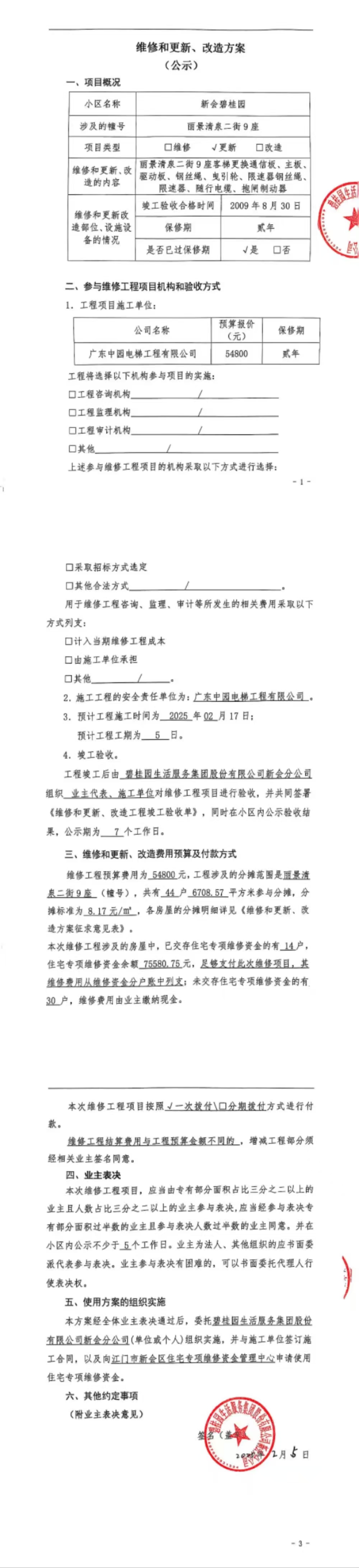 <td VALIGN="top" VALUES="" STYLE="border-width:0" BINDTYPE="0" ROWSPAN="19" COLSPAN="7" DATASOURCE="投票结果" ><font style="font-size:14pt;"><p style="white-space: normal; font-family: 宋体; line-height: 1.75em;">新会碧桂园丽景清泉二街9座全体业主:</p><p style="white-space: normal; font-family: 宋体; line-height: 1.75em; text-indent: 2em;">本小区关于新会碧桂园丽景清泉二街9座客梯(梯粤JX5033)更换通信板、主板、驱动板、钢丝绳等配件使用维修资金的投票的投票已表决结束,询异时间从2025年02月20日开始,投票询异公示期间,业主可通过微信查询自己的表决情况或可凭身份证件申请查询自己的表决情况;如公示的业主表决情况与查询的本人表决意见不一致的,可以以书面形式向投票组织机构申诉,投票组织机构予以纠正并重新公示表决结果。异议提出人对投票组织机构的处理仍有异议的,可以向街道办事处(镇人民政府)反映处理,涉及住宅专项维修资金的,可向属地住宅专项维修资金管理中心反映处理。</p><p style="white-space: normal;"><br/></p><p style="white-space: normal; font-family: 宋体; line-height: 1.75em;"><strong>附件:</strong></p><p style="white-space: normal; font-family: 宋体; line-height: 1.75em;"><strong>一、投票范围</strong></p><p style="white-space: normal; font-family: 宋体; line-height: 1.75em; text-indent: 2em;">新会碧桂园丽景清泉二街9座</p><p style="white-space: normal; font-family: 宋体; line-height: 1.75em; text-indent: 2em;">总人数(专有部分人数之和):36</p><p style="white-space: normal; font-family: 宋体; line-height: 1.75em; text-indent: 2em;"><span style="font-family: 宋体, SimSun;"><span style="font-family: 宋体; text-indent: 32px;"><span style="font-family: 宋体; text-indent: 32px;">总户数:44</span></span></span></p><p style="white-space: normal; font-family: 宋体; line-height: 1.75em; text-indent: 2em;">建筑物总面积(专有部分面积之和):6708.57㎡</p><p style="white-space: normal; font-family: 宋体; line-height: 1.75em;"><strong>二、询异公示起止时间</strong></p><p dir="ltr" style="white-space: normal; font-family: 宋体; line-height: 1.75em; text-indent: 2em;"><span style="text-indent: 36px;">2025年02月20日至2025年03月02日</span></p><p style="white-space: normal; font-family: 宋体; line-height: 1.75em;"><strong>三、投票详细描述</strong></p><p style="white-space: normal; font-family: 宋体; line-height: 1.75em; text-indent: 2em;"><p><span style="text-wrap: wrap;">新会碧桂园丽景清泉二街9座客梯(梯粤JX5033)运行时出现异常,经检查,是由于电梯线路问题导致电梯主板烧毁,同时波及通讯板和驱动板也烧毁,另外电梯钢丝绳和限速器钢丝绳出现红尘粉,曳引轮和抱闸开关磨损老化严重,随行电缆出现线路老化导致电梯无法正常启动,已停梯一段时间。 现对新会碧桂园丽景清泉二街9座客梯(</span><span style="text-wrap: wrap;">梯粤</span><span style="text-wrap: wrap;">JX5033)通信板、主板、驱动板、钢丝绳、曳引轮、限速器钢丝绳、限速器、随行电缆、抱闸制动器等配件进行更换,工程维修预算约54800元,项目最终费用以施工合同签订为准。因已过保修期,维修费用由相关业主按建筑面积分摊,每平方约8.17元,详见公示附件,如业主手机不能正常通过微信投票,请联系物业公司进行线下纸质投票,物业电话:17308202880梁锦强管家.</span></p></p><p style="white-space: normal; font-family: 宋体; line-height: 1.75em;"><strong>四、计票规则</strong></p><p style="white-space: normal; font-family: 宋体; line-height: 1.75em; text-indent: 2em;">表决事项:使用建筑物及其附属设施的维修资金<br /><p style='text-align: left; font-family: 宋体; font-size: 16px; line-height: 1.75em; text-indent: 2em;'>计票规则:弃权票不并入其它项 未表决票不并入其它项</p></p><p style="white-space: normal; font-family: 宋体; line-height: 1.75em;"><strong>五、通过规则</strong></p><p style="white-space: normal; font-family: 宋体; line-height: 1.75em;"><strong><strong style="white-space: normal;"><span style="font-family: 宋体, SimSun;"> 根据《中华人民共和国民法典》第二百七十八条规定:业主共同决定事项,应当由专有部分面积占比三分之二以上的业主且人数占比三分之二以上的业主参与表决。</span></strong></strong></p><p style="white-space: normal; font-family: 宋体; line-height: 1.75em; text-indent: 2em;">表决事项:使用建筑物及其附属设施的维修资金<br /><p style='text-align: left; font-family: 宋体; font-size: 16px; line-height: 1.75em; text-indent: 2em;'>通过规则:双2/3以上参与表决,参与表决双过半同意</p></p><p style="white-space: normal; font-family: 宋体; line-height: 1.75em;"><strong>六、投票结果</strong></p><p style="white-space: normal; font-family: 宋体; line-height: 1.75em; text-indent: 2em;"><div id='resultTable'><table style='table-layout: fixed; font-size:12px; margin-top:10px' width='100%' border='0' cellspacing='0' cellpadding='0'><tr><td height='28' colspan='10' align='center' style='border: 1px solid #666'><strong style='font-size: 14px;'> 使用建筑物及其附属设施的维修资金</strong></td> </tr><tr id='trfirst'><td height='28' colspan='4' style='border-left: 1px solid #666; border-bottom: 1px solid #666'><strong> 申报单位:</strong> 碧桂园生活服务集团股份有限公司新会分公司</td><td colspan='3' style='border-left: 1px solid #666; border-bottom: 1px solid #666'><strong> 联系方式:</strong> </td><td colspan='3' style='border-left: 1px solid #666; border-bottom: 1px solid #666; border-right: 1px solid #666'><strong> 申报日期:</strong> 2025年2月7日 </td></tr><tr> <td height='28' colspan='5' style='border-left: 1