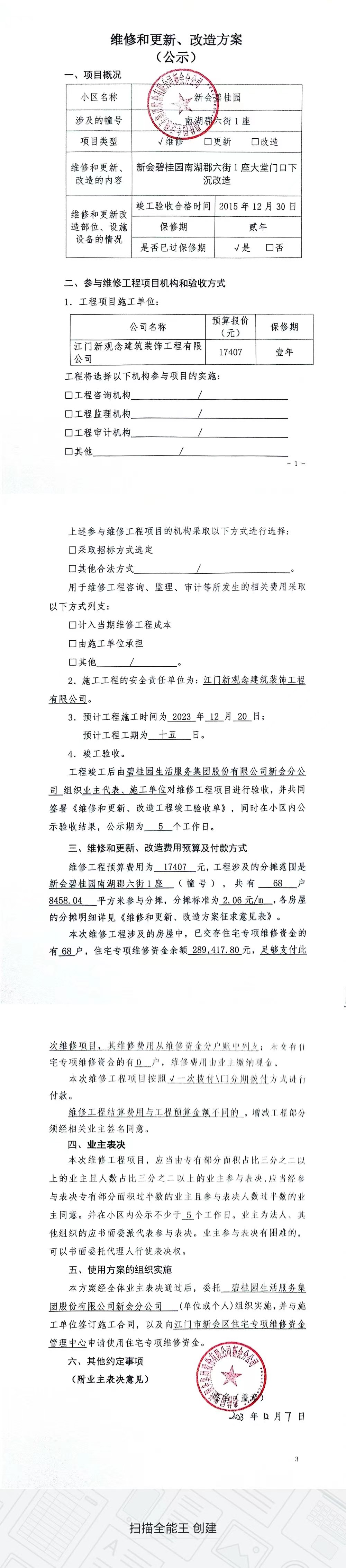 <td VALIGN="top" VALUES="" STYLE="border-width:0" BINDTYPE="0" ROWSPAN="19" COLSPAN="7" DATASOURCE="投票结果" ><font style="font-size:14pt;"><p style="white-space: normal; font-family: 宋体; line-height: 1.75em;">新会碧桂园南湖郡六街1座全体业主:</p><p style="white-space: normal; font-family: 宋体; line-height: 1.75em; text-indent: 2em;">本小区关于新会碧桂园南湖郡六街1座大堂门口下沉改造使用维修资金的投票的投票已表决结束,询异时间从2024年11月11日开始,投票询异公示期间,业主可通过微信查询自己的表决情况或可凭身份证件申请查询自己的表决情况;如公示的业主表决情况与查询的本人表决意见不一致的,可以以书面形式向投票组织机构申诉,投票组织机构予以纠正并重新公示表决结果。异议提出人对投票组织机构的处理仍有异议的,可以向街道办事处(镇人民政府)反映处理,涉及住宅专项维修资金的,可向属地住宅专项维修资金管理中心反映处理。</p><p style="white-space: normal;"><br/></p><p style="white-space: normal; font-family: 宋体; line-height: 1.75em;"><strong>附件:</strong></p><p style="white-space: normal; font-family: 宋体; line-height: 1.75em;"><strong>一、投票范围</strong></p><p style="white-space: normal; font-family: 宋体; line-height: 1.75em; text-indent: 2em;">新会碧桂园南湖郡六街1座</p><p style="white-space: normal; font-family: 宋体; line-height: 1.75em; text-indent: 2em;">总人数(专有部分人数之和):67</p><p style="white-space: normal; font-family: 宋体; line-height: 1.75em; text-indent: 2em;"><span style="font-family: 宋体, SimSun;"><span style="font-family: 宋体; text-indent: 32px;"><span style="font-family: 宋体; text-indent: 32px;">总户数:68</span></span></span></p><p style="white-space: normal; font-family: 宋体; line-height: 1.75em; text-indent: 2em;">建筑物总面积(专有部分面积之和):8458.04㎡</p><p style="white-space: normal; font-family: 宋体; line-height: 1.75em;"><strong>二、询异公示起止时间</strong></p><p dir="ltr" style="white-space: normal; font-family: 宋体; line-height: 1.75em; text-indent: 2em;"><span style="text-indent: 36px;">2024年11月11日至2024年11月14日</span></p><p style="white-space: normal; font-family: 宋体; line-height: 1.75em;"><strong>三、投票详细描述</strong></p><p style="white-space: normal; font-family: 宋体; line-height: 1.75em; text-indent: 2em;"><p>新会碧桂园南湖郡六街1座大堂门口下沉导致存在安全隐患,经检查需打凿重新铺楼梯。现申请使用维修资金对新会碧桂园南湖郡六街1座大堂门口下沉进行维修,工程维修预算约17407元,项目最终费用以施工合同签订为准,维修费用的分摊标准按建筑面积分摊,每平方约2.06元,详见公示,如果有业主手机不能正常通过微信投票的,请联系物业公司进行线下纸质投票,物业电话17308202894.</p></p><p style="white-space: normal; font-family: 宋体; line-height: 1.75em;"><strong>四、计票规则</strong></p><p style="white-space: normal; font-family: 宋体; line-height: 1.75em; text-indent: 2em;">表决事项:使用建筑物及其附属设施的维修资金<br /><p style='text-align: left; font-family: 宋体; font-size: 16px; line-height: 1.75em; text-indent: 2em;'>计票规则:弃权票不并入其它项 未表决票不并入其它项</p></p><p style="white-space: normal; font-family: 宋体; line-height: 1.75em;"><strong>五、通过规则</strong></p><p style="white-space: normal; font-family: 宋体; line-height: 1.75em;"><strong><strong style="white-space: normal;"><span style="font-family: 宋体, SimSun;"> 根据《中华人民共和国民法典》第二百七十八条规定:业主共同决定事项,应当由专有部分面积占比三分之二以上的业主且人数占比三分之二以上的业主参与表决。</span></strong></strong></p><p style="white-space: normal; font-family: 宋体; line-height: 1.75em; text-indent: 2em;">表决事项:使用建筑物及其附属设施的维修资金<br /><p style='text-align: left; font-family: 宋体; font-size: 16px; line-height: 1.75em; text-indent: 2em;'>通过规则:参与表决专有部分面积过半数的业主且参与表决人数过半数的业主同意</p></p><p style="white-space: normal; font-family: 宋体; line-height: 1.75em;"><strong>六、投票结果</strong></p><p style="white-space: normal; font-family: 宋体; line-height: 1.75em; text-indent: 2em;"><div id='resultTable'><table style='table-layout: fixed; font-size:12px; margin-top:10px' width='100%' border='0' cellspacing='0' cellpadding='0'><tr><td height='28' colspan='10' align='center' style='border: 1px solid #666'><strong style='font-size: 14px;'> 使用建筑物及其附属设施的维修资金</strong></td> </tr><tr id='trfirst'><td height='28' colspan='4' style='border-left: 1px solid #666; border-bottom: 1px solid #666'><strong> 申报单位:</strong> 碧桂园生活服务集团股份有限公司新会分公司</td><td colspan='3' style='border-left: 1px solid #666; border-bottom: 1px solid #666'><strong> 联系方式:</strong> </td><td colspan='3' style='border-left: 1px solid #666; border-bottom: 1px solid #666; border-right: 1px solid #666'><strong> 申报日期:</strong> 2023年12月6日 </td></tr><tr> <td height='28' colspan='5' style='border-left: 1px solid #666; border-bottom: 1px solid #666'><strong> 总人数(专有部分人数之和):</strong>67人 </td><td colspan='5' style='border-left: 1px solid #666; border-bottom: 1px solid #666; border-right: 1px solid #666'><strong> 建筑物总面积(专有部分面积之和):</strong>8458.04㎡ </td> </tr><tr><td height='28' colspan='10' bgcolor='#F3F3F3' style='border-left: 1px solid #666;border-bottom: 1px solid #666;border-right: 1px solid #666'><strong> 参与人数及面积统计</strong></td></tr><tr><td height='28' colspa