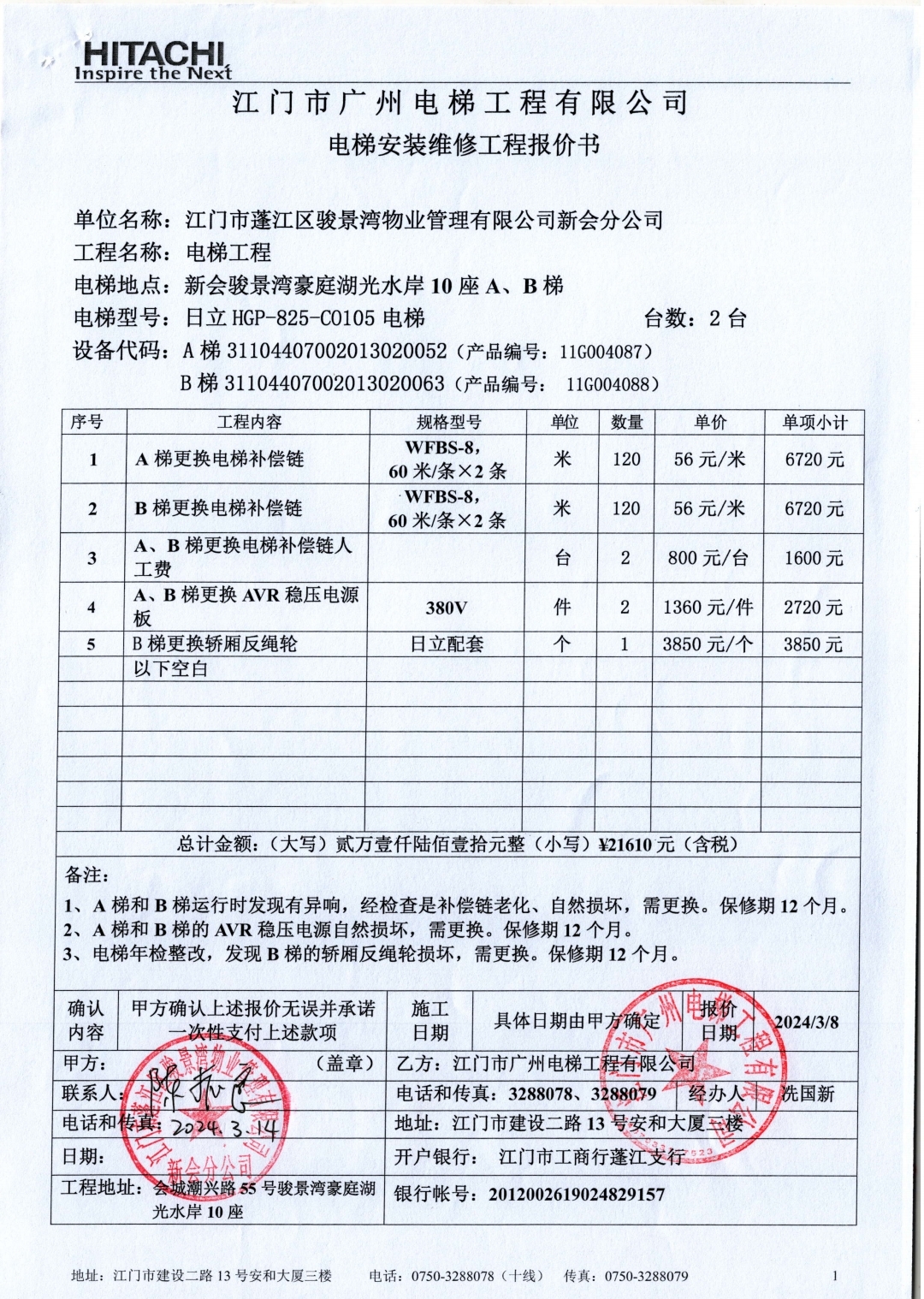 <td VALIGN="top" VALUES="" STYLE="border-width:0" BINDTYPE="0" ROWSPAN="19" COLSPAN="7" DATASOURCE="投票结果" ><font style="font-size:14pt;"><p style="white-space: normal; font-family: 宋体; line-height: 1.75em;">新会骏景湾豪庭湖光水岸10座全体业主:</p><p style="white-space: normal; font-family: 宋体; line-height: 1.75em; text-indent: 2em;">本小区关于新会骏景湾豪庭湖光水岸10座AB梯更换电梯补偿链、AVR稳压电源板;B梯更换轿厢反绳轮使用维修资金的投票的投票已表决结束,询异时间从2024年04月20日开始,投票询异公示期间,业主可通过微信查询自己的表决情况或可凭身份证件申请查询自己的表决情况;如公示的业主表决情况与查询的本人表决意见不一致的,可以以书面形式向投票组织机构申诉,投票组织机构予以纠正并重新公示表决结果。异议提出人对投票组织机构的处理仍有异议的,可以向街道办事处(镇人民政府)反映处理,涉及住宅专项维修资金的,可向属地住宅专项维修资金管理中心反映处理。</p><p style="white-space: normal;"><br/></p><p style="white-space: normal; font-family: 宋体; line-height: 1.75em;"><strong>附件:</strong></p><p style="white-space: normal; font-family: 宋体; line-height: 1.75em;"><strong>一、投票范围</strong></p><p style="white-space: normal; font-family: 宋体; line-height: 1.75em; text-indent: 2em;">新会骏景湾豪庭湖光水岸10座</p><p style="white-space: normal; font-family: 宋体; line-height: 1.75em; text-indent: 2em;">总人数(专有部分人数之和):67</p><p style="white-space: normal; font-family: 宋体; line-height: 1.75em; text-indent: 2em;"><span style="font-family: 宋体, SimSun;"><span style="font-family: 宋体; text-indent: 32px;"><span style="font-family: 宋体; text-indent: 32px;">总户数:68</span></span></span></p><p style="white-space: normal; font-family: 宋体; line-height: 1.75em; text-indent: 2em;">建筑物总面积(专有部分面积之和):7729.75㎡</p><p style="white-space: normal; font-family: 宋体; line-height: 1.75em;"><strong>二、询异公示起止时间</strong></p><p dir="ltr" style="white-space: normal; font-family: 宋体; line-height: 1.75em; text-indent: 2em;"><span style="text-indent: 36px;">2024年04月20日至2024年04月26日</span></p><p style="white-space: normal; font-family: 宋体; line-height: 1.75em;"><strong>三、投票详细描述</strong></p><p style="white-space: normal; font-family: 宋体; line-height: 1.75em; text-indent: 2em;"><p> 新会骏景湾豪庭湖光水岸10座A、B梯运行时发现异响并导致电梯运行异常,经检查,是补偿链老化和AVR稳压电源使用时间较长而自然损坏;B梯年检,经检查,是使用时间较长,轿厢反绳轮损坏,需要更换。</p><p> 现对新会骏景湾豪庭湖光水岸10座A、B进行维修,工程维修预算金额为21610元,项目最终费用以施工合同签订金额为准。因已过保修期,维修费用由相关业主按建筑面积分摊,每平方约2.79569197元,详见公示附件。如业主手机不能正常通过微信投票,请联系物业公司进行线下纸质投票,物业电话:0750-6179992。</p><p><br/></p></p><p style="white-space: normal; font-family: 宋体; line-height: 1.75em;"><strong>四、计票规则</strong></p><p style="white-space: normal; font-family: 宋体; line-height: 1.75em; text-indent: 2em;">表决事项:使用建筑物及其附属设施的维修资金<br /><p style='text-align: left; font-family: 宋体; font-size: 16px; line-height: 1.75em; text-indent: 2em;'>计票规则:弃权票不并入其它项 未表决票不并入其它项</p></p><p style="white-space: normal; font-family: 宋体; line-height: 1.75em;"><strong>五、通过规则</strong></p><p style="white-space: normal; font-family: 宋体; line-height: 1.75em;"><strong><strong style="white-space: normal;"><span style="font-family: 宋体, SimSun;"> 根据《中华人民共和国民法典》第二百七十八条规定:业主共同决定事项,应当由专有部分面积占比三分之二以上的业主且人数占比三分之二以上的业主参与表决。</span></strong></strong></p><p style="white-space: normal; font-family: 宋体; line-height: 1.75em; text-indent: 2em;">表决事项:使用建筑物及其附属设施的维修资金<br /><p style='text-align: left; font-family: 宋体; font-size: 16px; line-height: 1.75em; text-indent: 2em;'>通过规则:双2/3以上参与表决,参与表决双过半同意</p></p><p style="white-space: normal; font-family: 宋体; line-height: 1.75em;"><strong>六、投票结果</strong></p><p style="white-space: normal; font-family: 宋体; line-height: 1.75em; text-indent: 2em;"><div id='resultTable'><table style='table-layout: fixed; font-size:12px; margin-top:10px' width='100%' border='0' cellspacing='0' cellpadding='0'><tr><td height='28' colspan='10' align='center' style='border: 1px solid #666'><strong style='font-size: 14px;'> 使用建筑物及其附属设施的维修资金</strong></td> </tr><tr id='trfirst'><td height='28' colspan='4' style='border-left: 1px solid #666; border-bottom: 1px solid #666'><strong> 申报单位:</strong> 江门市蓬江区骏景湾物业管理有限公司新会分公司</td><td colspan='3' style='border-left: 1px solid #666; border-bottom: 1px solid #666'><strong> 联系方式:</strong> </td><td colspan='3' style='border-left: 1px solid #666; border-bottom: 1px solid #666; border-right: 1px solid #666'><strong> 申报日期:</strong> 2024年3月15日 </td></tr><tr> <td height='28' colspan='5' style='border-left: 1px solid #666; border-bottom: 1px solid #666'><strong> 总人数(专有部分人数之和):</strong>67人 </td><td colspan='5' style='border-left: 1px solid #666; border-bottom: 1px solid #666; border-right: 1px solid #666'><strong> 建筑物总面积(专有部分面积之和):</strong>7729.75㎡ </td> </tr><tr><td height='28' colspan='