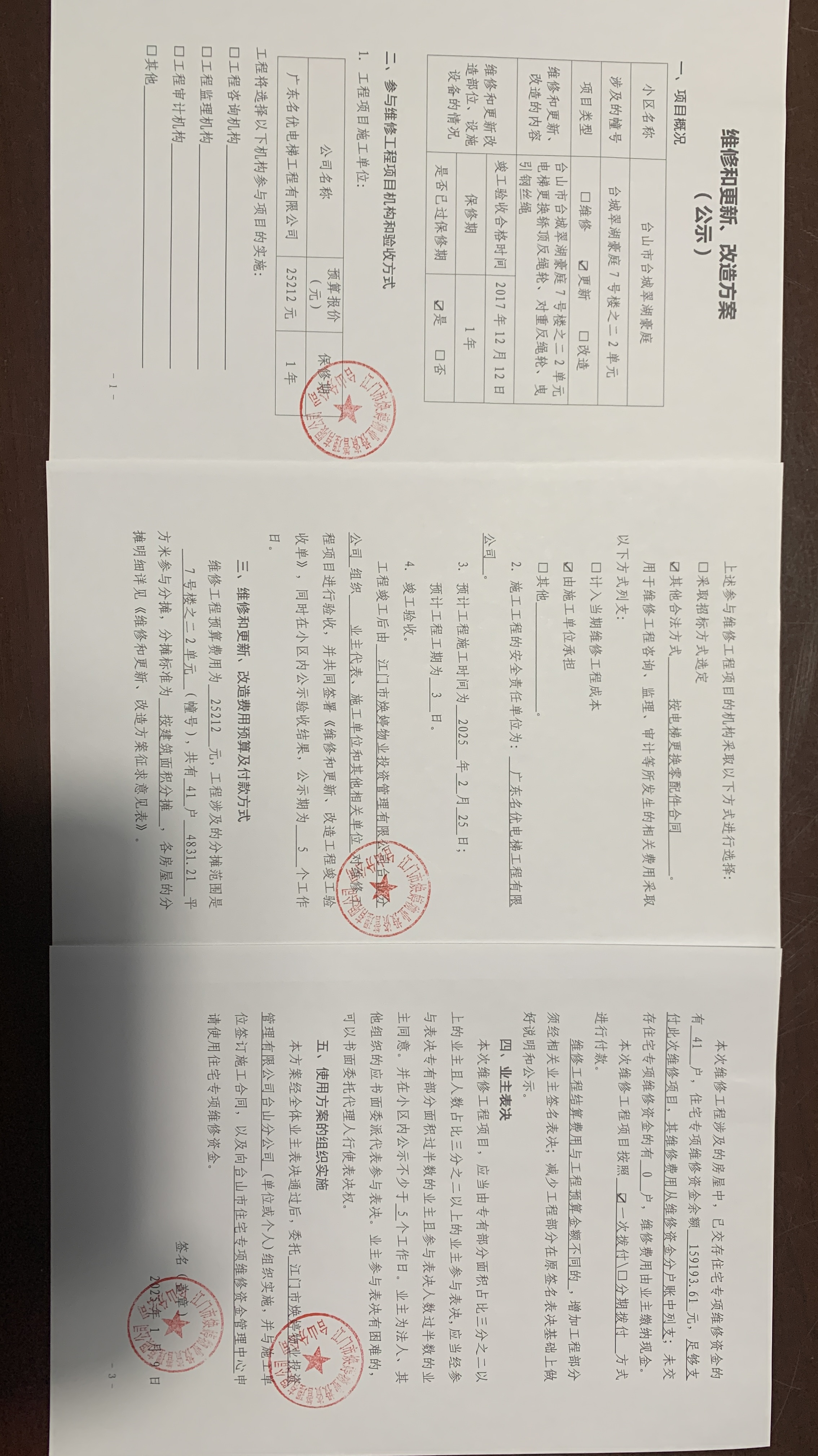 <td VALIGN="top" VALUES="" STYLE="border-width:0" BINDTYPE="0" ROWSPAN="17" COLSPAN="7" DATASOURCE="投票结果" ><font style=" font-family:方正小标宋简体;font-size:14pt;"><p style="line-height: 1.75em;"><span style="font-family: 宋体, SimSun;">各位尊敬的业主:</span><br/></p><p style="text-indent: 2em; line-height: 1.75em;"><span style="font-family: 宋体, SimSun;">根据法律法规的规定,本小区业主利用“江门市物业事项表决管理系统”已对本小区公共事务决策事项进行了表决,在经过7日的询异公示期后,未收到业主有效的异议。现将投票结果公告,并就产生的法律效力说明如下:</span></p><p style="line-height: 1.75em; text-indent: 0em;"><strong style="text-indent: 2em;"><span style="font-family: 宋体, SimSun;">一、投票范围</span></strong></p><p style="text-indent: 2em; line-height: 1.75em;"><span style="font-family: 宋体, SimSun;">台山市台城翠湖豪庭翠湖豪庭7号楼之二</span></p><p style="text-indent: 2em; line-height: 1.75em;"><span style="font-family: 宋体, SimSun;">总人数(专有部分人数之和):41</span></p><p style="text-indent: 2em; line-height: 1.75em;"><span style="font-family: 宋体, SimSun;"><span style="font-family: 宋体, SimSun; text-indent: 32px;"><span style="font-family: 宋体; text-indent: 32px;"><span style="font-family: 宋体; text-indent: 32px;">总户数:41</span></span></span></span></p><p style="text-indent: 2em; line-height: 1.75em;"><span style="font-family: 宋体, SimSun;">建筑物总面积(专有部分面积之和):4831.21㎡</span></p><p style="line-height: 1.75em;"><strong><span style="font-family: 宋体, SimSun;">二、投票结果公告时间</span></strong></p><p style="text-indent: 2em; line-height: 1.75em;"><span style="font-family: 宋体, SimSun;"><span style="font-family: 宋体, SimSun; text-indent: 32px;">从2025年03月19日开始</span></span></p><p style="line-height: 1.75em;"><strong><span style="font-family: 宋体, SimSun;">三、计票规则</span></strong></p><p style="text-indent: 2em; line-height: 1.75em;"><span style="font-family: 宋体, SimSun;">表决事项:使用建筑物及其附属设施的维修资金<br /><p style='font-family: 宋体, SimSun;line-height: 1.75em; text-indent: 2em;'>计票规则:弃权票不并入其它项&nbsp;&nbsp;&nbsp;&nbsp;未表决票不并入其它项</p></span></p><p style="line-height: 1.75em;"><strong><span style="font-family: 宋体, SimSun;">四、通过规则</span></strong></p><p style="line-height: 1.75em;"><strong><span style="font-family: 宋体, SimSun;">&nbsp; 根据《中华人民共和国民法典》第二百七十八条规定:业主共同决定事项,应当由专有部分面积占比三分之二以上的业主且人数占比三分之二以上的业主参与表决。</span></strong></p><p style="text-indent: 2em; line-height: 1.75em;"><span style="font-family: 宋体, SimSun;"><span style="font-family: 宋体, SimSun; text-indent: 32px;">表决事项:使用建筑物及其附属设施的维修资金<br /><p style='font-family: 宋体, SimSun;line-height: 1.75em; text-indent: 2em;'>通过规则:双2/3以上参与表决,参与表决双过半同意</p></span></span></p><p style="line-height: 1.75em;"><strong><span style="font-family: 宋体, SimSun;">五、投票结果</span></strong></p><p style="line-height: 1.75em; text-indent: 2em;"><span style="font-family: 宋体, SimSun; text-indent: 2em;"><div id='resultTable'><table style='table-layout: fixed; font-size:12px; margin-top:10px' width='100%' border='0' cellspacing='0' cellpadding='0'><tr><td height='28' colspan='10' align='center' style='border: 1px solid #666'><strong style='font-size: 14px;'> 使用建筑物及其附属设施的维修资金</strong></td> </tr><tr id='trfirst'><td height='28' colspan='4' style='border-left: 1px solid #666; border-bottom: 1px solid #666'><strong>&nbsp;申报单位:</strong> 江门市焕婷物业投资管理有限公司台山分公司</td><td colspan='3' style='border-left: 1px solid #666; border-bottom: 1px solid #666'><strong>&nbsp;联系方式:</strong> 0750-5555630 </td><td colspan='3' style='border-left: 1px solid #666; border-bottom: 1px solid #666; border-right: 1px solid #666'><strong>&nbsp;申报日期:</strong> 2025年2月11日 </td></tr><tr> <td height='28' colspan='5' style='border-left: 1px solid #666; border-bottom: 1px solid #666'><strong>&nbsp;列支总人数(专有部分人数之和):</strong>41人 </td><td colspan='5' style='border-left: 1px solid #666; border-bottom: 1px solid #666; border-right: 1px solid #666'><strong>&nbsp;列支建筑物总面积(专有部分面积之和):</strong>4831.21㎡ </td> </tr><tr><td height='28' colspan='10' bgcolor='#F3F3F3' style='border-left: 1px solid #666;border-bottom: 1px solid #666;border-right: 1px solid #666'><strong>&nbsp;参与表决人数及面积统计</strong></td></tr><tr><td height='28' colspan='5' style='border-left: 1px solid #666; border-bottom: 1px solid #666'><strong>&nbsp;参与表决人数:</strong>28人</td><td colspan='5' style='border-left: 1px solid #666; border-bottom: 1px solid #666; border-right: 1px solid #666'><strong>&nbsp;参与表决人数占总人数比例:</strong>68.29%</td></tr><tr><td height='28' colspan='5' style='border-left: 1px solid #666; border-bottom: 1px solid #666'><strong>&nbsp;参与表决面积:</strong>3312.11㎡</td><td colspan='5' style='border-left: 1px solid #666; border-bottom: 1px solid #666; border-right: 1px solid #666'><strong>&nbsp;参与表决面积占总面积比例:</strong>68.56%</td></tr><tr><td height='28' colspan='10' bgcolor='#F3F3F3' style='border-left: 1px solid #666; border-bottom: 1px solid #666;border-right: 1px solid #666'> <strong>&nbsp;参与表决同意人数及面积统计</strong></td> </tr><tr><td height='28' colspan='5' style='border-left: 1px solid #666; border-bottom: 1px solid #666'><strong>&nbsp;参与表决同意人数:</strong>25人 </td><td colspan='