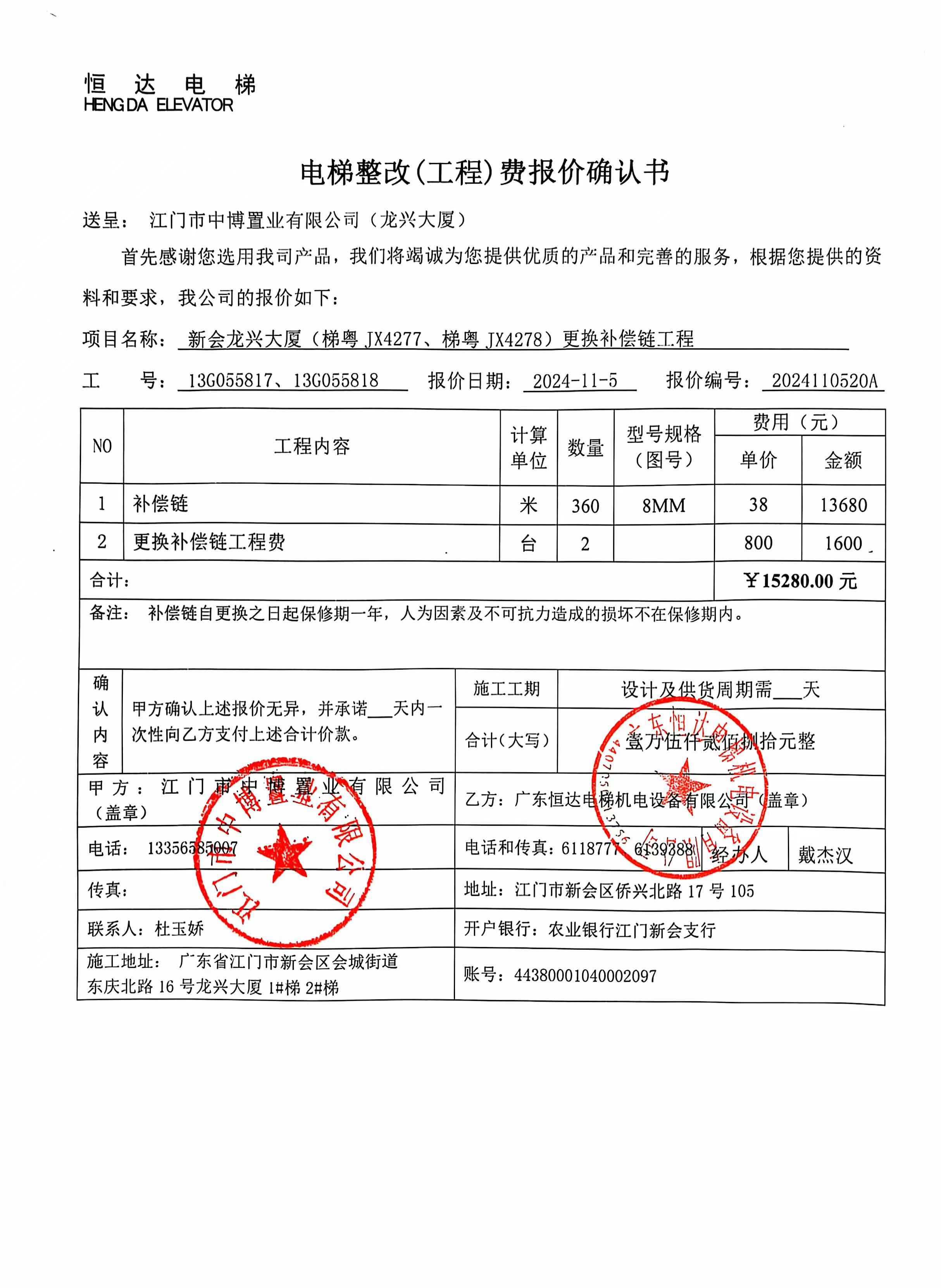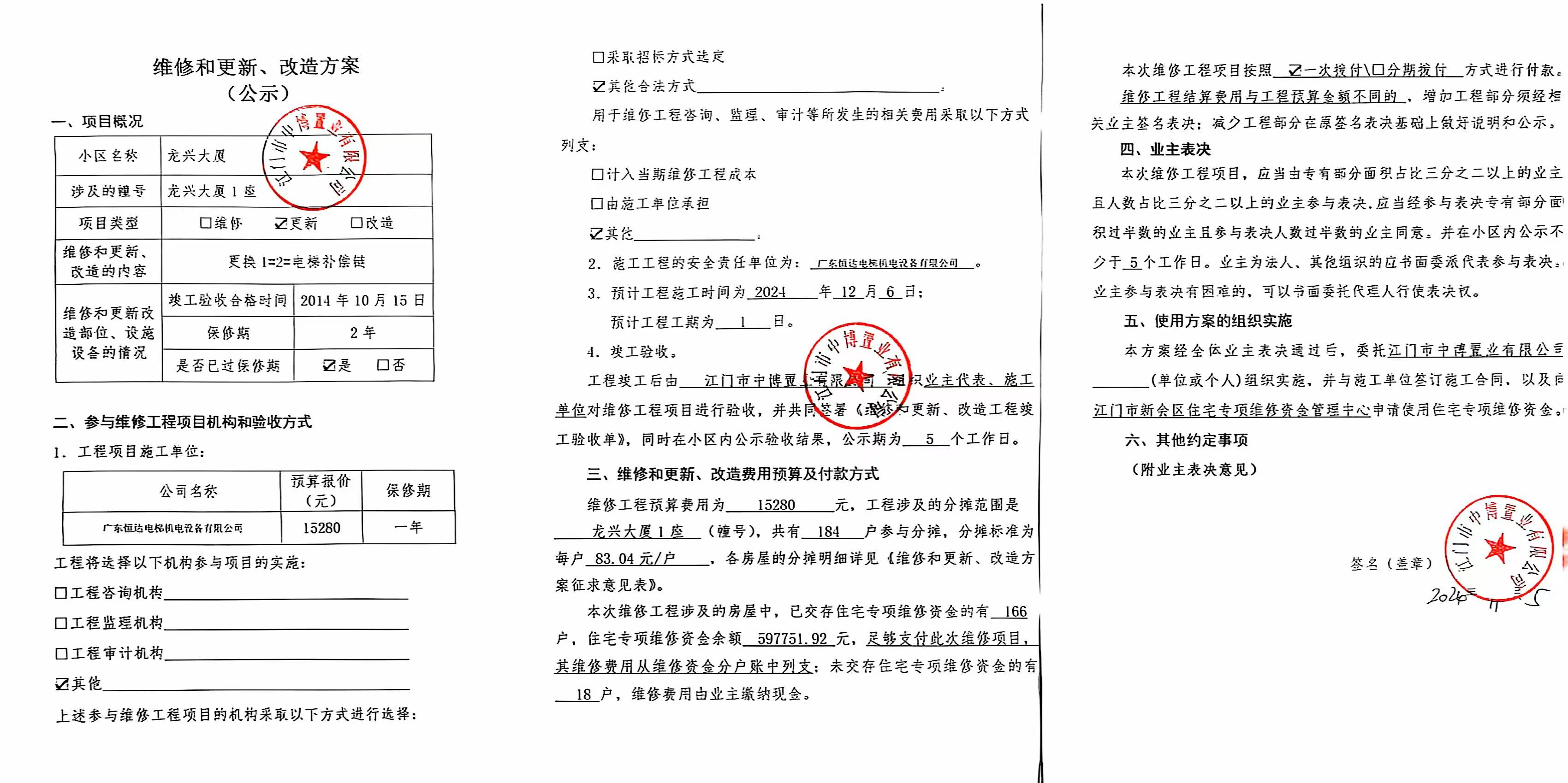 <td VALIGN="top" VALUES="" STYLE="border-width:0" BINDTYPE="0" ROWSPAN="19" COLSPAN="7" DATASOURCE="投票结果" ><font style="font-size:14pt;"><p style="white-space: normal; font-family: 宋体; line-height: 1.75em;">龙兴大厦龙兴大厦1座全体业主:</p><p style="white-space: normal; font-family: 宋体; line-height: 1.75em; text-indent: 2em;">本小区关于龙兴大厦1座1#和2#电梯更换补偿链使用维修资金的投票的投票已表决结束,询异时间从2024年12月04日开始,投票询异公示期间,业主可通过微信查询自己的表决情况或可凭身份证件申请查询自己的表决情况;如公示的业主表决情况与查询的本人表决意见不一致的,可以以书面形式向投票组织机构申诉,投票组织机构予以纠正并重新公示表决结果。异议提出人对投票组织机构的处理仍有异议的,可以向街道办事处(镇人民政府)反映处理,涉及住宅专项维修资金的,可向属地住宅专项维修资金管理中心反映处理。</p><p style="white-space: normal;"><br/></p><p style="white-space: normal; font-family: 宋体; line-height: 1.75em;"><strong>附件:</strong></p><p style="white-space: normal; font-family: 宋体; line-height: 1.75em;"><strong>一、投票范围</strong></p><p style="white-space: normal; font-family: 宋体; line-height: 1.75em; text-indent: 2em;">龙兴大厦龙兴大厦1座</p><p style="white-space: normal; font-family: 宋体; line-height: 1.75em; text-indent: 2em;">总人数(专有部分人数之和):163</p><p style="white-space: normal; font-family: 宋体; line-height: 1.75em; text-indent: 2em;"><span style="font-family: 宋体, SimSun;"><span style="font-family: 宋体; text-indent: 32px;"><span style="font-family: 宋体; text-indent: 32px;">总户数:184</span></span></span></p><p style="white-space: normal; font-family: 宋体; line-height: 1.75em; text-indent: 2em;">建筑物总面积(专有部分面积之和):19346.04㎡</p><p style="white-space: normal; font-family: 宋体; line-height: 1.75em;"><strong>二、询异公示起止时间</strong></p><p dir="ltr" style="white-space: normal; font-family: 宋体; line-height: 1.75em; text-indent: 2em;"><span style="text-indent: 36px;">2024年12月04日至2024年12月14日</span></p><p style="white-space: normal; font-family: 宋体; line-height: 1.75em;"><strong>三、投票详细描述</strong></p><p style="white-space: normal; font-family: 宋体; line-height: 1.75em; text-indent: 2em;"><p dir="ltr" style="margin-top: 0px; margin-bottom: 0px; text-align: left; text-indent: 0em;"><span style="font-family: 宋体, SimSun; font-size: 14px;"> 龙兴大厦1#和2#<span style="font-family: 宋体, SimSun; background: rgb(255, 255, 255);">电梯在日常运行时</span>发出异常响声及运行到一楼时抖动的情况,经过检查电梯补偿链胶套破损,需要更换。</span></p><p style="margin-top:0;margin-right:0;margin-bottom:0;margin-left:0;padding:0 0 0 0 ;background:rgb(255,255,255)"><span style="font-family: 宋体, SimSun; font-size: 14px;"><span style="font-family: 宋体; font-size: 12px;"> </span><span style="font-family: 宋体, SimSun; font-size: 16px;"><span style="font-size: 14px; font-family: 宋体;">因已过保修期,现需申请使用维修资金对</span><span style="font-size: 14px; font-family: Calibri;">1#和2#</span><span style="font-size: 14px; font-family: 宋体;">电梯进行维修,工程维修预算金额为</span><span style="font-size: 14px; font-family: Calibri;">15280</span><span style="font-size: 14px; font-family: 宋体;">元,项目最终费用以施工合同签订金额为准。维修费用由相关业主按户分摊,每户约</span><span style="font-size: 14px; font-family: Calibri;">83.04</span><span style="font-size: 14px; font-family: 宋体;">元/户,详见公示附件。如业主手机不能正常通过微信投票,请联系物业公司进行线下纸质投票,物业电话:</span><span style="font-size: 14px; font-family: Calibri;">0750-6606255。</span></span></span></p><p><br/></p></p><p style="white-space: normal; font-family: 宋体; line-height: 1.75em;"><strong>四、计票规则</strong></p><p style="white-space: normal; font-family: 宋体; line-height: 1.75em; text-indent: 2em;">表决事项:使用建筑物及其附属设施的维修资金<br /><p style='text-align: left; font-family: 宋体; font-size: 16px; line-height: 1.75em; text-indent: 2em;'>计票规则:弃权票不并入其它项 未表决票不并入其它项</p></p><p style="white-space: normal; font-family: 宋体; line-height: 1.75em;"><strong>五、通过规则</strong></p><p style="white-space: normal; font-family: 宋体; line-height: 1.75em;"><strong><strong style="white-space: normal;"><span style="font-family: 宋体, SimSun;"> 根据《中华人民共和国民法典》第二百七十八条规定:业主共同决定事项,应当由专有部分面积占比三分之二以上的业主且人数占比三分之二以上的业主参与表决。</span></strong></strong></p><p style="white-space: normal; font-family: 宋体; line-height: 1.75em; text-indent: 2em;">表决事项:使用建筑物及其附属设施的维修资金<br /><p style='text-align: left; font-family: 宋体; font-size: 16px; line-height: 1.75em; text-indent: 2em;'>通过规则:双2/3以上参与表决,参与表决双过半同意</p></p><p style="white-space: normal; font-family: 宋体; line-height: 1.75em;"><strong>六、投票结果</strong></p><p style="white-space: normal; font-family: 宋体; line-height: 1.75em; text-indent: 2em;"><div id='resultTable'><table style='table-layout: fixed; font-size:12px; margin-top:10px' width='100%' border='0' cellspacing='0' cellpadding='0'><tr><td height='28' colspan='10' align='center' style='border: 1px solid #666'><strong style='font-size: 14px;'> 使用建筑物及其附属设施的维修资金</strong></td> </tr><tr id='trfirst'><td height='28' colspan='4' style='border-left: 1px solid #666; 