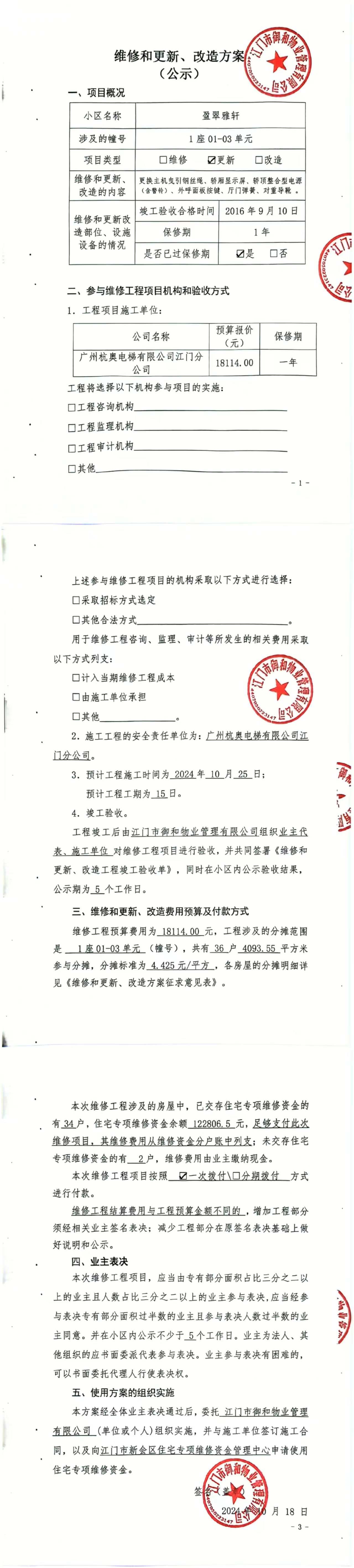 <td VALIGN="top" VALUES="" STYLE="border-width:0" BINDTYPE="0" ROWSPAN="19" COLSPAN="7" DATASOURCE="投票结果" ><font style="font-size:14pt;"><p style="white-space: normal; font-family: 宋体; line-height: 1.75em;">盈翠雅轩盈翠雅轩1座全体业主:</p><p style="white-space: normal; font-family: 宋体; line-height: 1.75em; text-indent: 2em;">本小区关于盈翠雅轩1座01-03单元1#电梯更换主机曳引钢丝绳轿厢显示屏等使用维修资金的投票的投票已表决结束,询异时间从2024年12月23日开始,投票询异公示期间,业主可通过微信查询自己的表决情况或可凭身份证件申请查询自己的表决情况;如公示的业主表决情况与查询的本人表决意见不一致的,可以以书面形式向投票组织机构申诉,投票组织机构予以纠正并重新公示表决结果。异议提出人对投票组织机构的处理仍有异议的,可以向街道办事处(镇人民政府)反映处理,涉及住宅专项维修资金的,可向属地住宅专项维修资金管理中心反映处理。</p><p style="white-space: normal;"><br/></p><p style="white-space: normal; font-family: 宋体; line-height: 1.75em;"><strong>附件:</strong></p><p style="white-space: normal; font-family: 宋体; line-height: 1.75em;"><strong>一、投票范围</strong></p><p style="white-space: normal; font-family: 宋体; line-height: 1.75em; text-indent: 2em;">盈翠雅轩盈翠雅轩1座</p><p style="white-space: normal; font-family: 宋体; line-height: 1.75em; text-indent: 2em;">总人数(专有部分人数之和):36</p><p style="white-space: normal; font-family: 宋体; line-height: 1.75em; text-indent: 2em;"><span style="font-family: 宋体, SimSun;"><span style="font-family: 宋体; text-indent: 32px;"><span style="font-family: 宋体; text-indent: 32px;">总户数:36</span></span></span></p><p style="white-space: normal; font-family: 宋体; line-height: 1.75em; text-indent: 2em;">建筑物总面积(专有部分面积之和):4093.55㎡</p><p style="white-space: normal; font-family: 宋体; line-height: 1.75em;"><strong>二、询异公示起止时间</strong></p><p dir="ltr" style="white-space: normal; font-family: 宋体; line-height: 1.75em; text-indent: 2em;"><span style="text-indent: 36px;">2024年12月23日至2025年01月02日</span></p><p style="white-space: normal; font-family: 宋体; line-height: 1.75em;"><strong>三、投票详细描述</strong></p><p style="white-space: normal; font-family: 宋体; line-height: 1.75em; text-indent: 2em;"><p style="text-wrap: wrap; font-family: "Helvetica Neue", Helvetica, Arial, sans-serif; font-size: 14px; background-color: rgb(255, 255, 255);"><span style="font-family: 宋体, SimSun; font-size: 16px;">小区1座01-03单元1#电梯日常运行出现异响,经检查,是由于主机曳引钢线绳起铁粉、散股磨损严重,有严重安全风险。显示屏、轿顶整合型应急电源总成、外呼面板按键、厅门弹簧、对重导靴已自然老化损坏、无维修价值,需更换新部件。</span></p><p style="text-wrap: wrap; font-family: "Helvetica Neue", Helvetica, Arial, sans-serif; font-size: 14px; background-color: rgb(255, 255, 255);"><span style="font-family: 宋体, SimSun; font-size: 16px;"> <span style="font-family: 宋体, SimSun; font-size: 16px;">现对小区1座01-03单元1#电梯进行维修,工程维修<span style="font-family: 宋体;">预算金额为18114元,项目最终费用以施工合同签订金额为准。因已过保修期,维修费用由相关业主按建筑面积分摊,每平方约4.425元,详见公示附件。如业主手机不能正常通过微信投票,请联系物业公司进行线下纸质投票,物业电话:0750-6693366。</span></span></span></p><p><br/></p></p><p style="white-space: normal; font-family: 宋体; line-height: 1.75em;"><strong>四、计票规则</strong></p><p style="white-space: normal; font-family: 宋体; line-height: 1.75em; text-indent: 2em;">表决事项:使用建筑物及其附属设施的维修资金<br /><p style='text-align: left; font-family: 宋体; font-size: 16px; line-height: 1.75em; text-indent: 2em;'>计票规则:弃权票不并入其它项 未表决票不并入其它项</p></p><p style="white-space: normal; font-family: 宋体; line-height: 1.75em;"><strong>五、通过规则</strong></p><p style="white-space: normal; font-family: 宋体; line-height: 1.75em;"><strong><strong style="white-space: normal;"><span style="font-family: 宋体, SimSun;"> 根据《中华人民共和国民法典》第二百七十八条规定:业主共同决定事项,应当由专有部分面积占比三分之二以上的业主且人数占比三分之二以上的业主参与表决。</span></strong></strong></p><p style="white-space: normal; font-family: 宋体; line-height: 1.75em; text-indent: 2em;">表决事项:使用建筑物及其附属设施的维修资金<br /><p style='text-align: left; font-family: 宋体; font-size: 16px; line-height: 1.75em; text-indent: 2em;'>通过规则:双2/3以上参与表决,参与表决双过半同意</p></p><p style="white-space: normal; font-family: 宋体; line-height: 1.75em;"><strong>六、投票结果</strong></p><p style="white-space: normal; font-family: 宋体; line-height: 1.75em; text-indent: 2em;"><div id='resultTable'><table style='table-layout: fixed; font-size:12px; margin-top:10px' width='100%' border='0' cellspacing='0' cellpadding='0'><tr><td height='28' colspan='10' align='center' style='border: 1px solid #666'><strong style='font-size: 14px;'> 使用建筑物及其附属设施的维修资金</strong></td> </tr><tr id='trfirst'><td height='28' colspan='4' style='border-left: 1px solid #666; border-bottom: 1px solid #666'><strong> 申报单位:</strong> 江门市御和物业管理有限公司</td><td colspan='3' style='border-left: 1px solid #666; border-bottom: 1px solid #666'><strong> 联系方式:</strong> 6693366 </td><td colspan='3' style='border-left: 1px solid #666; border-bottom: 1px solid #