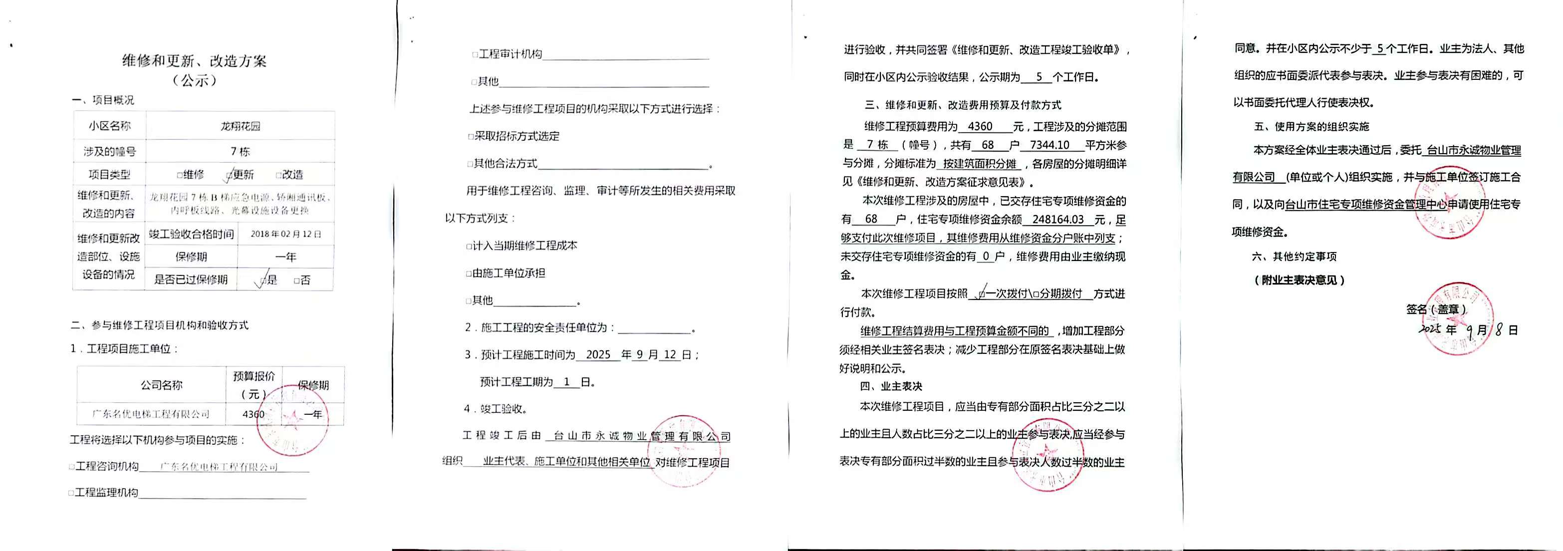 <td valign="top" values="" style="border-width:0" bindtype="0" rowspan="17" colspan="7" datasource="投票结果"><font style=" font-family:方正小标宋简体;font-size:14pt;"><p style="line-height: 1.75em;"><span style="font-family: 宋体, SimSun;">各位尊敬的业主:</span><br></p><p style="text-indent: 2em; line-height: 1.75em;"><span style="font-family: 宋体, SimSun;">根据法律法规的规定,本小区业主利用“江门市物业事项表决管理系统”已对本小区公共事务决策事项(<span style="font-family: 宋体; text-indent: 32px;">龙翔花园7栋B梯更换应急电源、轿厢通讯板、内呼板线路、光幕的使用维修资金投票</span>)进行了表决,在经过7日的询异公示期后,未收到业主有效的异议。现将投票结果公告,并就产生的法律效力说明如下:</span></p><p style="line-height: 1.75em; text-indent: 0em;"><strong style="text-indent: 2em;"><span style="font-family: 宋体, SimSun;">一、投票范围</span></strong></p><p style="text-indent: 2em; line-height: 1.75em;"><span style="font-family: 宋体, SimSun;">龙翔花园7号</span></p><p style="text-indent: 2em; line-height: 1.75em;"><span style="font-family: 宋体, SimSun;">总人数(专有部分人数之和):68</span></p><p style="text-indent: 2em; line-height: 1.75em;"><span style="font-family: 宋体, SimSun;"><span style="font-family: 宋体, SimSun; text-indent: 32px;"><span style="font-family: 宋体; text-indent: 32px;"><span style="font-family: 宋体; text-indent: 32px;">总户数:68</span></span></span></span></p><p style="text-indent: 2em; line-height: 1.75em;"><span style="font-family: 宋体, SimSun;">建筑物总面积(专有部分面积之和):7344.10㎡</span></p><p style="line-height: 1.75em;"><strong><span style="font-family: 宋体, SimSun;">二、投票结果公告时间</span></strong></p><p style="text-indent: 2em; line-height: 1.75em;"><span style="font-family: 宋体, SimSun;"><span style="font-family: 宋体, SimSun; text-indent: 32px;">从2025年10月31日开始</span></span></p><p style="line-height: 1.75em;"><strong><span style="font-family: 宋体, SimSun;">三、计票规则</span></strong></p><p style="text-indent: 2em; line-height: 1.75em;"><span style="font-family: 宋体, SimSun;">表决事项:使用建筑物及其附属设施的维修资金<br></span></p><p style="font-family: 宋体, SimSun;line-height: 1.75em; text-indent: 2em;">计票规则:弃权票不并入其它项 未表决票不并入其它项</p><p></p><p style="line-height: 1.75em;"><strong><span style="font-family: 宋体, SimSun;">四、通过规则</span></strong></p><p style="line-height: 1.75em;"><strong><span style="font-family: 宋体, SimSun;"> 根据《中华人民共和国民法典》第二百七十八条规定:业主共同决定事项,应当由专有部分面积占比三分之二以上的业主且人数占比三分之二以上的业主参与表决。</span></strong></p><p style="text-indent: 2em; line-height: 1.75em;"><span style="font-family: 宋体, SimSun;"><span style="font-family: 宋体, SimSun; text-indent: 32px;">表决事项:使用建筑物及其附属设施的维修资金<br></span></span></p><p style="font-family: 宋体, SimSun;line-height: 1.75em; text-indent: 2em;">通过规则:双2/3以上参与表决,参与表决双过半同意</p><p></p><p style="line-height: 1.75em;"><strong><span style="font-family: 宋体, SimSun;">五、投票结果</span></strong></p><p style="line-height: 1.75em; text-indent: 2em;"><span style="font-family: 宋体, SimSun; text-indent: 2em;"></span></p><div id="resultTable"><table style="table-layout: fixed; font-size:12px; margin-top:10px" width="100%" border="0" cellspacing="0" cellpadding="0"><tbody><tr><td height="28" colspan="10" align="center" style="border: 1px solid #666"><strong style="font-size: 14px;"> 使用建筑物及其附属设施的维修资金</strong></td> </tr><tr id="trfirst"><td height="28" colspan="4" style="border-left: 1px solid #666; border-bottom: 1px solid #666"><strong> 申报单位:</strong> 台山市永诚物业管理有限公司</td><td colspan="3" style="border-left: 1px solid #666; border-bottom: 1px solid #666"><strong> 联系方式:</strong> </td><td colspan="3" style="border-left: 1px solid #666; border-bottom: 1px solid #666; border-right: 1px solid #666"><strong> 申报日期:</strong> 2025年9月7日 </td></tr><tr> <td height="28" colspan="5" style="border-left: 1px solid #666; border-bottom: 1px solid #666"><strong> 列支总人数(专有部分人数之和):</strong>68人 </td><td colspan="5" style="border-left: 1px solid #666; border-bottom: 1px solid #666; border-right: 1px solid #666"><strong> 列支建筑物总面积(专有部分面积之和):</strong>7344.10㎡ </td> </tr><tr><td height="28" colspan="10" bgcolor="#F3F3F3" style="border-left: 1px solid #666;border-bottom: 1px solid #666;border-right: 1px solid #666"><strong> 参与表决人数及面积统计</strong></td></tr><tr><td height="28" colspan="5" style="border-left: 1px solid #666; border-bottom: 1px solid #666"><strong> 参与表决人数:</strong>51人</td><td colspan="5" style="border-left: 1px solid #666; border-bottom: 1px solid #666; border-right: 1px solid #666"><strong> 参与表决人数占总人数比例:</strong>75.00%</td></tr><tr><td height="28" colspan="5" style="border-left: 1px solid #666; border-bottom: 1px solid #666"><strong> 参与表决面积:</strong>5505.26㎡</td><td colspan="5" style="border-left: 1px solid #666; border-bottom: 1px solid #666; border-right: 1px solid #666"><strong> 参与表决面积占总面积比例:</strong>74.96%</td></tr><tr><td height="28" colspan="10" bgcolor="#F3F3F3" style="border-left: 1px solid #666; border-bottom: 1px solid #666;border-right: 1px solid #666"> <strong> 参与表决同意人数及面积统计</strong></td> </tr><tr><td height="28" colspan="5" style="border-left: 1px solid #666; border-bottom: 1px solid #666"><strong> 参与表决同意