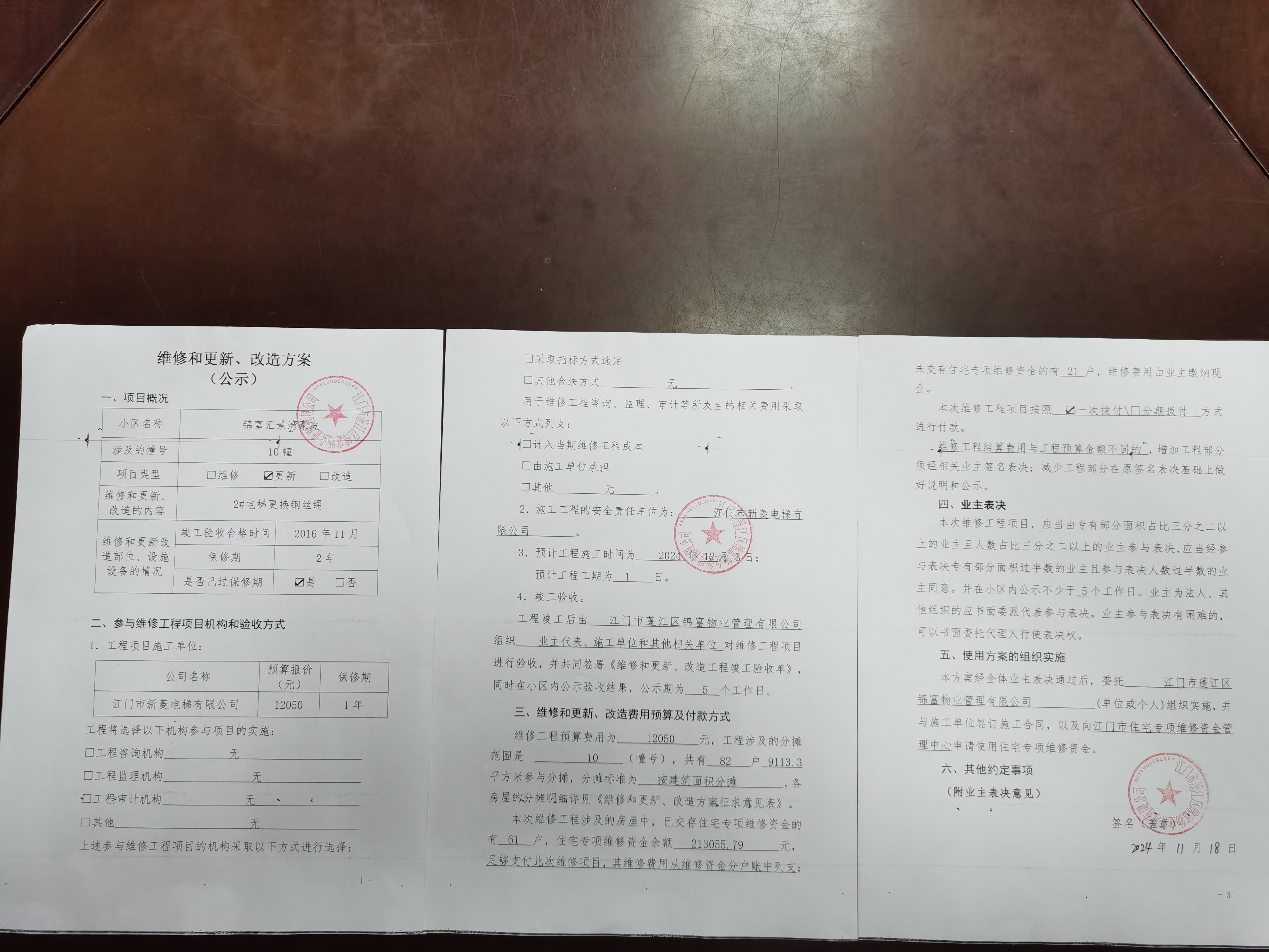 <td VALIGN="top" VALUES="" STYLE="border-width:0" BINDTYPE="0" ROWSPAN="19" COLSPAN="7" DATASOURCE="投票结果" ><font style="font-size:14pt;"><p style="white-space: normal; font-family: 宋体; line-height: 1.75em;">江门市蓬江区锦富汇景湾豪庭蓬江区棠下镇锦富汇景湾豪庭10幢全体业主:</p><p style="white-space: normal; font-family: 宋体; line-height: 1.75em; text-indent: 2em;">本小区关于锦富汇景湾10幢2#电梯更换钢丝绳工程使用维修资金的投票的投票已表决结束,询异时间从2024年12月06日开始,投票询异公示期间,业主可通过微信查询自己的表决情况或可凭身份证件申请查询自己的表决情况;如公示的业主表决情况与查询的本人表决意见不一致的,可以以书面形式向投票组织机构申诉,投票组织机构予以纠正并重新公示表决结果。异议提出人对投票组织机构的处理仍有异议的,可以向街道办事处(镇人民政府)反映处理,涉及住宅专项维修资金的,可向属地住宅专项维修资金管理中心反映处理。</p><p style="white-space: normal;"><br/></p><p style="white-space: normal; font-family: 宋体; line-height: 1.75em;"><strong>附件:</strong></p><p style="white-space: normal; font-family: 宋体; line-height: 1.75em;"><strong>一、投票范围</strong></p><p style="white-space: normal; font-family: 宋体; line-height: 1.75em; text-indent: 2em;">江门市蓬江区锦富汇景湾豪庭蓬江区棠下镇锦富汇景湾豪庭10幢</p><p style="white-space: normal; font-family: 宋体; line-height: 1.75em; text-indent: 2em;">总人数(专有部分人数之和):81</p><p style="white-space: normal; font-family: 宋体; line-height: 1.75em; text-indent: 2em;"><span style="font-family: 宋体, SimSun;"><span style="font-family: 宋体; text-indent: 32px;"><span style="font-family: 宋体; text-indent: 32px;">总户数:82</span></span></span></p><p style="white-space: normal; font-family: 宋体; line-height: 1.75em; text-indent: 2em;">建筑物总面积(专有部分面积之和):9113.30㎡</p><p style="white-space: normal; font-family: 宋体; line-height: 1.75em;"><strong>二、询异公示起止时间</strong></p><p dir="ltr" style="white-space: normal; font-family: 宋体; line-height: 1.75em; text-indent: 2em;"><span style="text-indent: 36px;">2024年12月06日至2024年12月16日</span></p><p style="white-space: normal; font-family: 宋体; line-height: 1.75em;"><strong>三、投票详细描述</strong></p><p style="white-space: normal; font-family: 宋体; line-height: 1.75em; text-indent: 2em;"><p><span style="letter-spacing: 0px; text-wrap: wrap; font-family: 宋体; font-size: 15px; background: rgb(255, 255, 255);">小区</span><span style="letter-spacing: 0px; text-wrap: wrap; font-family: Calibri; font-size: 15px; background: rgb(255, 255, 255);">10</span><span style="letter-spacing: 0px; text-wrap: wrap; font-family: 宋体; font-size: 15px; background: rgb(255, 255, 0);">幢2#电梯</span><span style="letter-spacing: 0px; text-wrap: wrap; font-family: 宋体; font-size: 15px; background: rgb(255, 255, 0);">日常运行时出现异响、跳动,</span><span style="letter-spacing: 0px; text-wrap: wrap; font-family: 宋体; font-size: 15px; background: rgb(255, 255, 255);">经检查,是由于2#电梯</span><span style="letter-spacing: 0px; text-wrap: wrap; font-family: 宋体; font-size: 15px; background: rgb(255, 255, 0);">曳引钢丝绳吐油严重、生锈,因使用时间较长,出现老化而不能正常运行</span><span style="letter-spacing: 0px; text-wrap: wrap; font-family: 宋体; font-size: 15px; background: rgb(255, 255, 255);">。</span><span style="letter-spacing: 0px; text-wrap: wrap; font-family: 宋体; font-size: 15px; background: rgb(255, 255, 255);"><br/></span><span style="letter-spacing: 0px; text-wrap: wrap; font-family: 宋体; font-size: 15px; background: rgb(255, 255, 255);"> 现对</span><span style="letter-spacing: 0px; text-wrap: wrap; font-family: Calibri; font-size: 15px; background: rgb(255, 255, 255);">10</span><span style="letter-spacing: 0px; text-wrap: wrap; font-family: 宋体; font-size: 15px; background: rgb(255, 255, 0);">幢2#电梯进行维修</span><span style="letter-spacing: 0px; text-wrap: wrap; font-family: 宋体; font-size: 15px; background: rgb(255, 255, 255);">,工程维修预算金额为1205</span><span style="letter-spacing: 0px; text-wrap: wrap; font-family: Calibri; font-size: 15px; background: rgb(255, 255, 255);">0</span><span style="letter-spacing: 0px; text-wrap: wrap; font-family: 宋体; font-size: 15px; background: rgb(255, 255, 0);">元</span><span style="letter-spacing: 0px; text-wrap: wrap; font-family: 宋体; font-size: 15px; background: rgb(255, 255, 255);">,项目最终费用以施工合同签订金额为准。因已过保修期,维修费用由相关业主</span><span style="letter-spacing: 0px; text-wrap: wrap; font-family: 宋体; font-size: 15px; background: rgb(255, 255, 0);">按建筑面积</span><span style="letter-spacing: 0px; text-wrap: wrap; font-family: 宋体; font-size: 15px; background: rgb(255, 255, 255);">分摊,</span><span style="letter-spacing: 0px; text-wrap: wrap; font-family: 宋体; font-size: 15px; background: rgb(255, 255, 0);">每平方约</span><span style="letter-spacing: 0px; text-wrap: wrap; font-family: Calibri; font-size: 15px; background: rgb(255, 255, 0);">1.32</span><span style="letter-spacing: 0px; text-wrap: wrap; font-family: 宋体; font-size: 15px; background: rgb(255, 255, 0);">元</span><span style="letter-spacing: 0px; text-wrap: wrap; font-family: 宋体; font-size: 15px; background: rgb(255, 255, 255);">,详见公示附件。如业主手机不能正常通过微信投票,请联系物业公司进行线下纸质投票,物业电话</span><span style="letter-spacing: 0px; text-wrap: wrap; font-family: 宋体; font-size: 15px; background: rgb(255, 255, 0);">:</span><span style="letter-spacing: 0px; text-wrap: