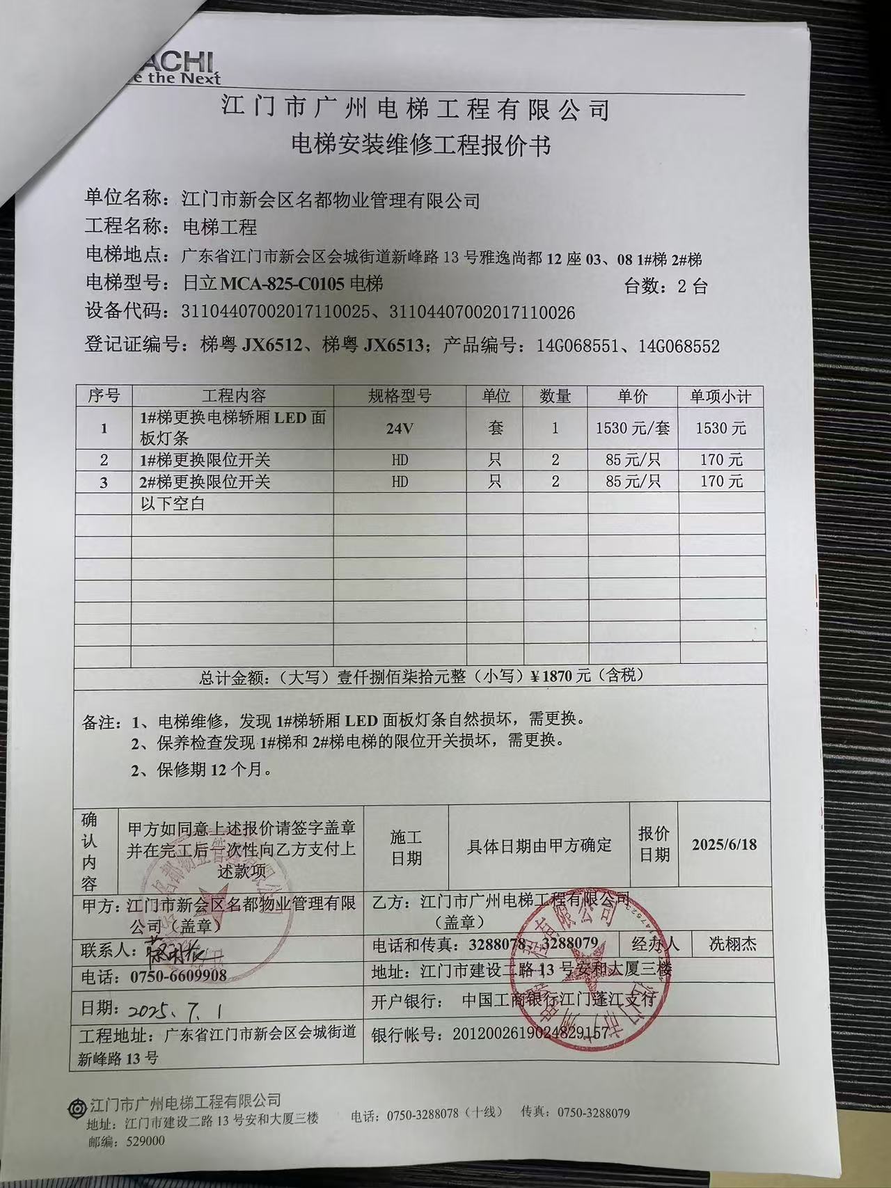 <td VALIGN="top" VALUES="" STYLE="border-width:0" BINDTYPE="0" ROWSPAN="19" COLSPAN="7" DATASOURCE="投票结果" ><font style="font-size:14pt;"><p style="white-space: normal; font-family: 宋体; line-height: 1.75em;">雅逸尚都雅逸尚都12座全体业主:</p><p style="white-space: normal; font-family: 宋体; line-height: 1.75em; text-indent: 2em;">本小区关于雅逸尚都12座03、08单元1#电梯(梯粤JX6512)更换轿厢LED面板灯条、限位开关和2#电梯(梯粤JX6513)更换限位开关使用维修资金的投票的投票已表决结束,询异时间从2025年07月25日开始,投票询异公示期间,业主可通过微信查询自己的表决情况或可凭身份证件申请查询自己的表决情况;如公示的业主表决情况与查询的本人表决意见不一致的,可以以书面形式向投票组织机构申诉,投票组织机构予以纠正并重新公示表决结果。异议提出人对投票组织机构的处理仍有异议的,可以向街道办事处(镇人民政府)反映处理,涉及住宅专项维修资金的,可向属地住宅专项维修资金管理中心反映处理。</p><p style="white-space: normal;"><br/></p><p style="white-space: normal; font-family: 宋体; line-height: 1.75em;"><strong>附件:</strong></p><p style="white-space: normal; font-family: 宋体; line-height: 1.75em;"><strong>一、投票范围</strong></p><p style="white-space: normal; font-family: 宋体; line-height: 1.75em; text-indent: 2em;">雅逸尚都雅逸尚都12座</p><p style="white-space: normal; font-family: 宋体; line-height: 1.75em; text-indent: 2em;">总人数(专有部分人数之和):33</p><p style="white-space: normal; font-family: 宋体; line-height: 1.75em; text-indent: 2em;"><span style="font-family: 宋体, SimSun;"><span style="font-family: 宋体; text-indent: 32px;"><span style="font-family: 宋体; text-indent: 32px;">总户数:33</span></span></span></p><p style="white-space: normal; font-family: 宋体; line-height: 1.75em; text-indent: 2em;">建筑物总面积(专有部分面积之和):4412.75㎡</p><p style="white-space: normal; font-family: 宋体; line-height: 1.75em;"><strong>二、询异公示起止时间</strong></p><p dir="ltr" style="white-space: normal; font-family: 宋体; line-height: 1.75em; text-indent: 2em;"><span style="text-indent: 36px;">2025年07月25日至2025年08月04日</span></p><p style="white-space: normal; font-family: 宋体; line-height: 1.75em;"><strong>三、投票详细描述</strong></p><p style="white-space: normal; font-family: 宋体; line-height: 1.75em; text-indent: 2em;"><p><span style="font-family: arial, helvetica, sans-serif; font-size: 16px;"> 雅逸尚都小区12座03、08单元电梯经常故障,经检查,是由于1#电梯<span style="font-family: arial, helvetica, sans-serif; font-size: 16px; text-wrap-mode: wrap;">(梯粤JX6512)</span>轿厢LED面板灯条、限位开关和2#电梯<span style="font-family: arial, helvetica, sans-serif; font-size: 16px; text-wrap-mode: wrap;">(梯粤JX6513)</span>限位开关自然损坏,需要更换。</span></p><p><span style="background-color: rgb(255, 255, 255); font-family: arial, helvetica, sans-serif; font-size: 16px;"> 现对12座03、08单元1#电梯(梯粤JX6512)、2#电梯(梯粤JX6513)进行维修,工程维修预算金额为1870元,项目最终费用以施工合同签订金额为准。维修费用的分摊标准为按建筑面积分摊,每平方约0.42377202元,详见公示附件。如业主手机不能正常通过微信投票,请联系物业公司进行线下纸质投票,物业电话:0750-6609908。</span></p></p><p style="white-space: normal; font-family: 宋体; line-height: 1.75em;"><strong>四、计票规则</strong></p><p style="white-space: normal; font-family: 宋体; line-height: 1.75em; text-indent: 2em;">表决事项:使用建筑物及其附属设施的维修资金<br /><p style='text-align: left; font-family: 宋体; font-size: 16px; line-height: 1.75em; text-indent: 2em;'>计票规则:弃权票不并入其它项 未表决票不并入其它项</p></p><p style="white-space: normal; font-family: 宋体; line-height: 1.75em;"><strong>五、通过规则</strong></p><p style="white-space: normal; font-family: 宋体; line-height: 1.75em;"><strong><strong style="white-space: normal;"><span style="font-family: 宋体, SimSun;"> 根据《中华人民共和国民法典》第二百七十八条规定:业主共同决定事项,应当由专有部分面积占比三分之二以上的业主且人数占比三分之二以上的业主参与表决。</span></strong></strong></p><p style="white-space: normal; font-family: 宋体; line-height: 1.75em; text-indent: 2em;">表决事项:使用建筑物及其附属设施的维修资金<br /><p style='text-align: left; font-family: 宋体; font-size: 16px; line-height: 1.75em; text-indent: 2em;'>通过规则:双2/3以上参与表决,参与表决双过半同意</p></p><p style="white-space: normal; font-family: 宋体; line-height: 1.75em;"><strong>六、投票结果</strong></p><p style="white-space: normal; font-family: 宋体; line-height: 1.75em; text-indent: 2em;"><div id='resultTable'><table style='table-layout: fixed; font-size:12px; margin-top:10px' width='100%' border='0' cellspacing='0' cellpadding='0'><tr><td height='28' colspan='10' align='center' style='border: 1px solid #666'><strong style='font-size: 14px;'> 使用建筑物及其附属设施的维修资金</strong></td> </tr><tr id='trfirst'><td height='28' colspan='4' style='border-left: 1px solid #666; border-bottom: 1px solid #666'><strong> 申报单位:</strong> 江门市新会区名都物业管理有限公司</td><td colspan='3' style='border-left: 1px solid #666; border-bottom: 1px solid #666'><strong> 联系方式:</strong> 6609908 </td><td colspan='3' style='border-left: 1px solid #666; border-bottom: 1px solid #666; border-right: 1px solid #666'><strong> 申报日期:</strong> 2025年7月3日 </td></tr><tr> <td height='28' colspan='5' style='border-left: 1