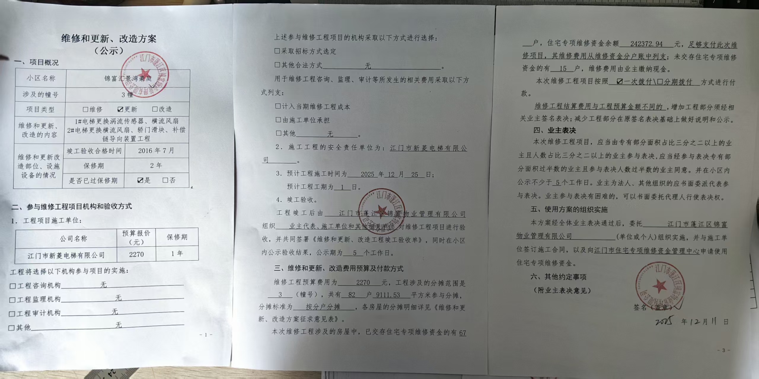 <td VALIGN="top" VALUES="" STYLE="border-width:0" BINDTYPE="0" ROWSPAN="19" COLSPAN="7" DATASOURCE="投票结果" ><font style="font-size:14pt;"><p style="white-space: normal; font-family: 宋体; line-height: 1.75em;">江门市蓬江区锦富汇景湾豪庭蓬江区棠下镇锦富汇景湾豪庭3幢全体业主:</p><p style="white-space: normal; font-family: 宋体; line-height: 1.75em; text-indent: 2em;">本小区关于锦富汇景湾豪庭3幢1#电梯更换涡流传感器、横流风扇2#电梯更换补偿链导向装置、轿门滑块、横流风扇工程使用维修资金的投票的投票已表决结束,询异时间从2026年01月06日开始,投票询异公示期间,业主可通过微信查询自己的表决情况或可凭身份证件申请查询自己的表决情况;如公示的业主表决情况与查询的本人表决意见不一致的,可以以书面形式向投票组织机构申诉,投票组织机构予以纠正并重新公示表决结果。异议提出人对投票组织机构的处理仍有异议的,可以向街道办事处(镇人民政府)反映处理,涉及住宅专项维修资金的,可向属地住宅专项维修资金管理中心反映处理。</p><p style="white-space: normal;"><br/></p><p style="white-space: normal; font-family: 宋体; line-height: 1.75em;"><strong>附件:</strong></p><p style="white-space: normal; font-family: 宋体; line-height: 1.75em;"><strong>一、投票范围</strong></p><p style="white-space: normal; font-family: 宋体; line-height: 1.75em; text-indent: 2em;">江门市蓬江区锦富汇景湾豪庭蓬江区棠下镇锦富汇景湾豪庭3幢</p><p style="white-space: normal; font-family: 宋体; line-height: 1.75em; text-indent: 2em;">总人数(专有部分人数之和):82</p><p style="white-space: normal; font-family: 宋体; line-height: 1.75em; text-indent: 2em;"><span style="font-family: 宋体, SimSun;"><span style="font-family: 宋体; text-indent: 32px;"><span style="font-family: 宋体; text-indent: 32px;">总户数:82</span></span></span></p><p style="white-space: normal; font-family: 宋体; line-height: 1.75em; text-indent: 2em;">建筑物总面积(专有部分面积之和):9111.53㎡</p><p style="white-space: normal; font-family: 宋体; line-height: 1.75em;"><strong>二、询异公示起止时间</strong></p><p dir="ltr" style="white-space: normal; font-family: 宋体; line-height: 1.75em; text-indent: 2em;"><span style="text-indent: 36px;">2026年01月06日至2026年01月13日</span></p><p style="white-space: normal; font-family: 宋体; line-height: 1.75em;"><strong>三、投票详细描述</strong></p><p style="white-space: normal; font-family: 宋体; line-height: 1.75em; text-indent: 2em;"><p>小区3幢的电梯日常维保期间,维保发现1#电梯涡流传感器、横流风扇老化,2#电梯更换补偿链导向装置、轿门滑块、横流风扇,因使用时间较长,不能正常运行。</p><p> 现对3幢1#2#电梯进行维修,工程维修预算金额为2270元,项目最终费用以施工合同签订金额为准。因已过保修期,维修费用由相关业主按分户分摊,<span style="font-family: arial, helvetica, sans-serif;"><span style="font-size: 14px; text-wrap-mode: wrap; background-color: rgb(255, 255, 255);">每户<span style="font-size: 14px; text-wrap-mode: wrap; background-color: rgb(255, 255, 255);"></span>约</span><span style="font-size: 14px; text-wrap-mode: wrap; background-color: rgb(255, 255, 255);">27.69</span><span style="font-size: 14px; text-wrap-mode: wrap; background-color: rgb(255, 255, 255);">元,</span></span>详见公示附件。如业主手机不能正常通过微信投票,请联系物业公司进行线下纸质投票,物业电话:0750-3598316 管理员:15088116809。</p><p><br/></p></p><p style="white-space: normal; font-family: 宋体; line-height: 1.75em;"><strong>四、计票规则</strong></p><p style="white-space: normal; font-family: 宋体; line-height: 1.75em; text-indent: 2em;">表决事项:使用建筑物及其附属设施的维修资金<br /><p style='text-align: left; font-family: 宋体; font-size: 16px; line-height: 1.75em; text-indent: 2em;'>计票规则:弃权票不并入其它项 未表决票不并入其它项</p></p><p style="white-space: normal; font-family: 宋体; line-height: 1.75em;"><strong>五、通过规则</strong></p><p style="white-space: normal; font-family: 宋体; line-height: 1.75em;"><strong><strong style="white-space: normal;"><span style="font-family: 宋体, SimSun;"> 根据《中华人民共和国民法典》第二百七十八条规定:业主共同决定事项,应当由专有部分面积占比三分之二以上的业主且人数占比三分之二以上的业主参与表决。</span></strong></strong></p><p style="white-space: normal; font-family: 宋体; line-height: 1.75em; text-indent: 2em;">表决事项:使用建筑物及其附属设施的维修资金<br /><p style='text-align: left; font-family: 宋体; font-size: 16px; line-height: 1.75em; text-indent: 2em;'>通过规则:双2/3以上参与表决,参与表决双过半同意</p></p><p style="white-space: normal; font-family: 宋体; line-height: 1.75em;"><strong>六、投票结果</strong></p><p style="white-space: normal; font-family: 宋体; line-height: 1.75em; text-indent: 2em;"><div id='resultTable'><table style='table-layout: fixed; font-size:12px; margin-top:10px' width='100%' border='0' cellspacing='0' cellpadding='0'><tr><td height='28' colspan='10' align='center' style='border: 1px solid #666'><strong style='font-size: 14px;'> 使用建筑物及其附属设施的维修资金</strong></td> </tr><tr id='trfirst'><td height='28' colspan='4' style='border-left: 1px solid #666; border-bottom: 1px solid #666'><strong> 申报单位:</strong> 江门市蓬江区锦富物业管理有限公司</td><td colspan='3' style='border-left: 1px solid #666; border-bottom: 1px solid #666'><strong> 联系方式:</strong> 3598316 </td><td colspan='3' style='border-left: 1px solid #666; border-bottom: 1px soli