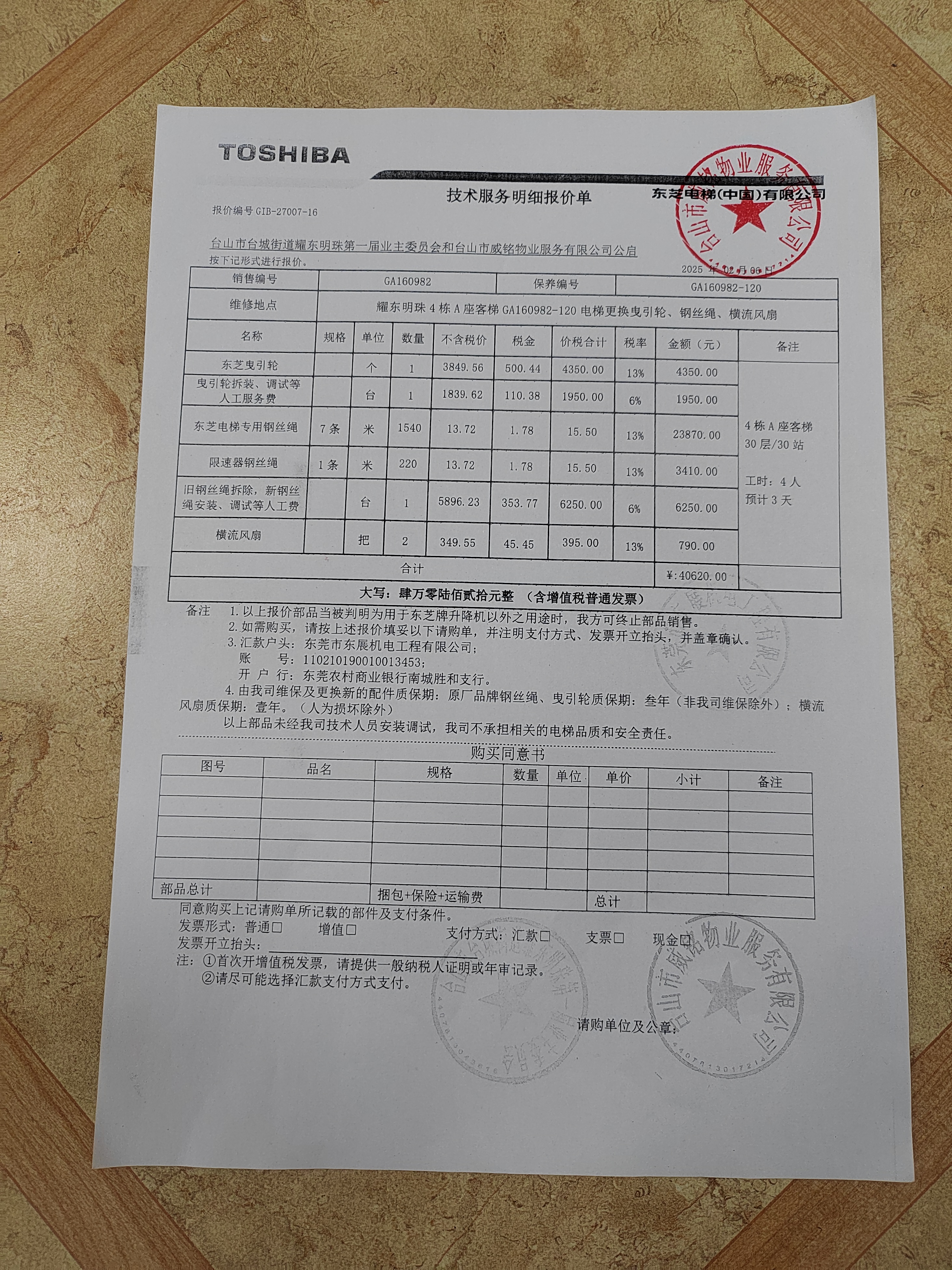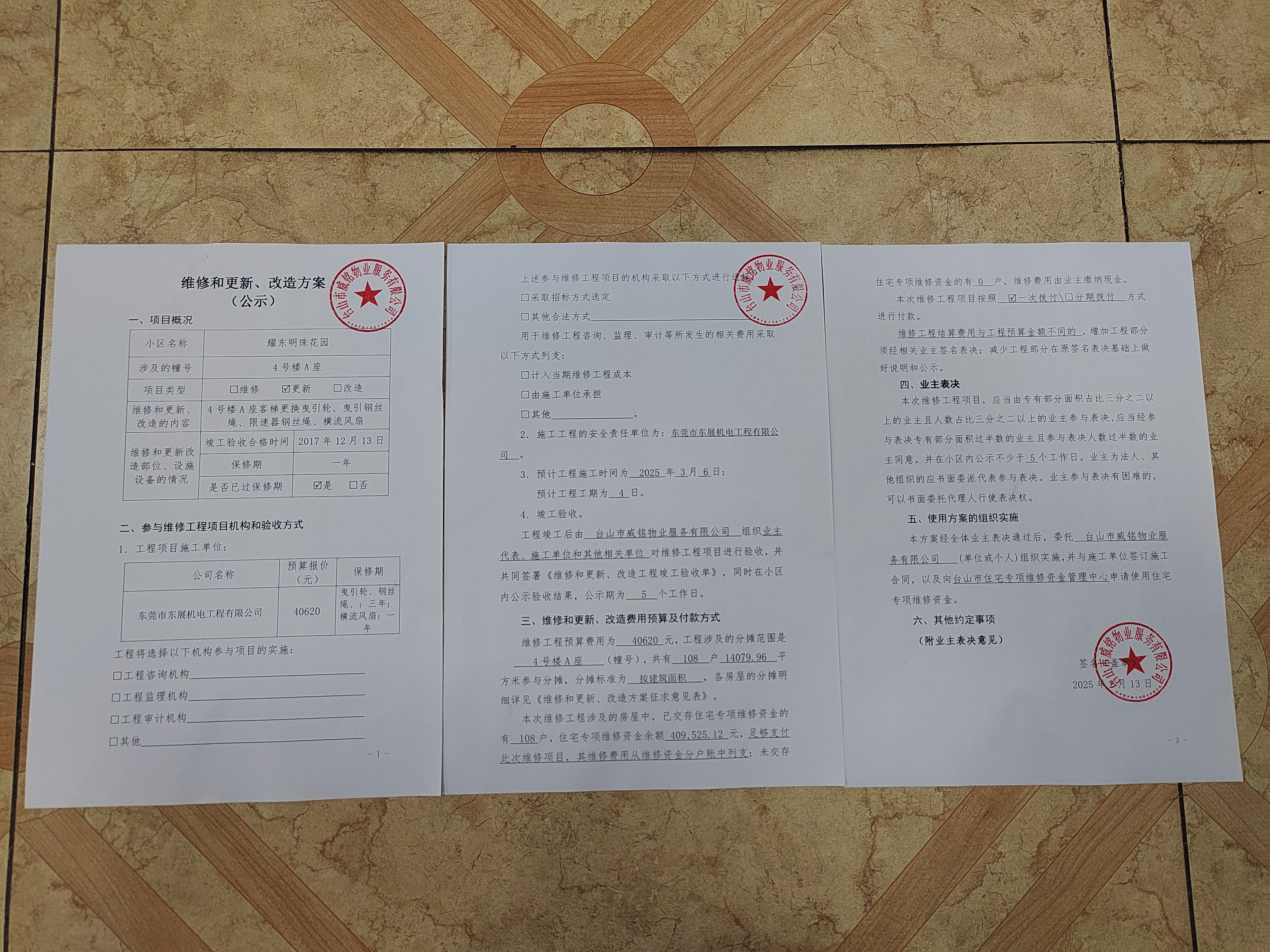 <td VALIGN="top" VALUES="" STYLE="border-width:0" BINDTYPE="0" ROWSPAN="17" COLSPAN="7" DATASOURCE="投票结果" ><font style=" font-family:方正小标宋简体;font-size:14pt;"><p style="line-height: 1.75em;"><span style="font-family: 宋体, SimSun;">各位尊敬的业主:</span><br/></p><p style="text-indent: 2em; line-height: 1.75em;"><span style="font-family: 宋体, SimSun;">根据法律法规的规定,本小区业主利用“江门市物业事项表决管理系统”已对本小区公共事务决策事项(<span style="font-family: 宋体; text-indent: 32px;">耀东明珠花园4号楼A座客梯更换曳引轮、曳引钢丝绳、限速器钢丝绳、横流风扇使用维修资金的投票</span>)进行了表决,在经过7日的询异公示期后,未收到业主有效的异议。现将投票结果公告,并就产生的法律效力说明如下:</span></p><p style="line-height: 1.75em; text-indent: 0em;"><strong style="text-indent: 2em;"><span style="font-family: 宋体, SimSun;">一、投票范围</span></strong></p><p style="text-indent: 2em; line-height: 1.75em;"><span style="font-family: 宋体, SimSun;">耀东明珠花园4号楼A座</span></p><p style="text-indent: 2em; line-height: 1.75em;"><span style="font-family: 宋体, SimSun;">总人数(专有部分人数之和):108</span></p><p style="text-indent: 2em; line-height: 1.75em;"><span style="font-family: 宋体, SimSun;"><span style="font-family: 宋体, SimSun; text-indent: 32px;"><span style="font-family: 宋体; text-indent: 32px;"><span style="font-family: 宋体; text-indent: 32px;">总户数:108</span></span></span></span></p><p style="text-indent: 2em; line-height: 1.75em;"><span style="font-family: 宋体, SimSun;">建筑物总面积(专有部分面积之和):14079.96㎡</span></p><p style="line-height: 1.75em;"><strong><span style="font-family: 宋体, SimSun;">二、投票结果公告时间</span></strong></p><p style="text-indent: 2em; line-height: 1.75em;"><span style="font-family: 宋体, SimSun;"><span style="font-family: 宋体, SimSun; text-indent: 32px;">从2025年05月08日开始</span></span></p><p style="line-height: 1.75em;"><strong><span style="font-family: 宋体, SimSun;">三、计票规则</span></strong></p><p style="text-indent: 2em; line-height: 1.75em;"><span style="font-family: 宋体, SimSun;">表决事项:使用建筑物及其附属设施的维修资金<br /><p style='font-family: 宋体, SimSun;line-height: 1.75em; text-indent: 2em;'>计票规则:弃权票不并入其它项&nbsp;&nbsp;&nbsp;&nbsp;未表决票不并入其它项</p></span></p><p style="line-height: 1.75em;"><strong><span style="font-family: 宋体, SimSun;">四、通过规则</span></strong></p><p style="line-height: 1.75em;"><strong><span style="font-family: 宋体, SimSun;">&nbsp; 根据《中华人民共和国民法典》第二百七十八条规定:业主共同决定事项,应当由专有部分面积占比三分之二以上的业主且人数占比三分之二以上的业主参与表决。</span></strong></p><p style="text-indent: 2em; line-height: 1.75em;"><span style="font-family: 宋体, SimSun;"><span style="font-family: 宋体, SimSun; text-indent: 32px;">表决事项:使用建筑物及其附属设施的维修资金<br /><p style='font-family: 宋体, SimSun;line-height: 1.75em; text-indent: 2em;'>通过规则:双2/3以上参与表决,参与表决双过半同意</p></span></span></p><p style="line-height: 1.75em;"><strong><span style="font-family: 宋体, SimSun;">五、投票结果</span></strong></p><p style="line-height: 1.75em; text-indent: 2em;"><span style="font-family: 宋体, SimSun; text-indent: 2em;"><div id='resultTable'><table style='table-layout: fixed; font-size:12px; margin-top:10px' width='100%' border='0' cellspacing='0' cellpadding='0'><tr><td height='28' colspan='10' align='center' style='border: 1px solid #666'><strong style='font-size: 14px;'> 使用建筑物及其附属设施的维修资金</strong></td> </tr><tr id='trfirst'><td height='28' colspan='4' style='border-left: 1px solid #666; border-bottom: 1px solid #666'><strong>&nbsp;申报单位:</strong> 台山市威铭物业服务有限公司</td><td colspan='3' style='border-left: 1px solid #666; border-bottom: 1px solid #666'><strong>&nbsp;联系方式:</strong> 5586289 </td><td colspan='3' style='border-left: 1px solid #666; border-bottom: 1px solid #666; border-right: 1px solid #666'><strong>&nbsp;申报日期:</strong> 2025年2月13日 </td></tr><tr> <td height='28' colspan='5' style='border-left: 1px solid #666; border-bottom: 1px solid #666'><strong>&nbsp;列支总人数(专有部分人数之和):</strong>108人 </td><td colspan='5' style='border-left: 1px solid #666; border-bottom: 1px solid #666; border-right: 1px solid #666'><strong>&nbsp;列支建筑物总面积(专有部分面积之和):</strong>14079.96㎡ </td> </tr><tr><td height='28' colspan='10' bgcolor='#F3F3F3' style='border-left: 1px solid #666;border-bottom: 1px solid #666;border-right: 1px solid #666'><strong>&nbsp;参与表决人数及面积统计</strong></td></tr><tr><td height='28' colspan='5' style='border-left: 1px solid #666; border-bottom: 1px solid #666'><strong>&nbsp;参与表决人数:</strong>45人</td><td colspan='5' style='border-left: 1px solid #666; border-bottom: 1px solid #666; border-right: 1px solid #666'><strong>&nbsp;参与表决人数占总人数比例:</strong>41.67%</td></tr><tr><td height='28' colspan='5' style='border-left: 1px solid #666; border-bottom: 1px solid #666'><strong>&nbsp;参与表决面积:</strong>5933.73㎡</td><td colspan='5' style='border-left: 1px solid #666; border-bottom: 1px solid #666; border-right: 1px solid #666'><strong>&nbsp;参与表决面积占总面积比例:</strong>42.14%</td></tr><tr><td height='28' colspan='10' bgcolor='#F3F3F3' style='border-left: 1px solid #666; border-bottom: 1px solid #666;border-right: 1px solid #666'> <strong>&nbsp;参与表决同意人数及面积统计</strong></td> </tr><tr><td height='28' c