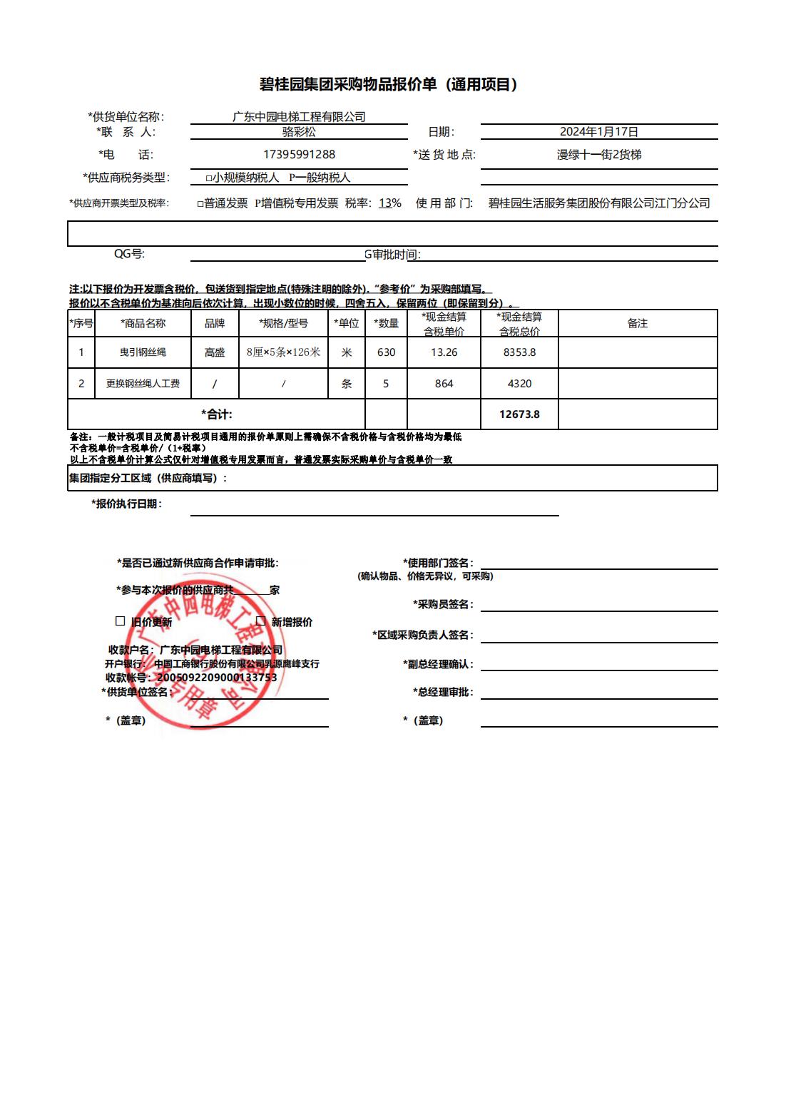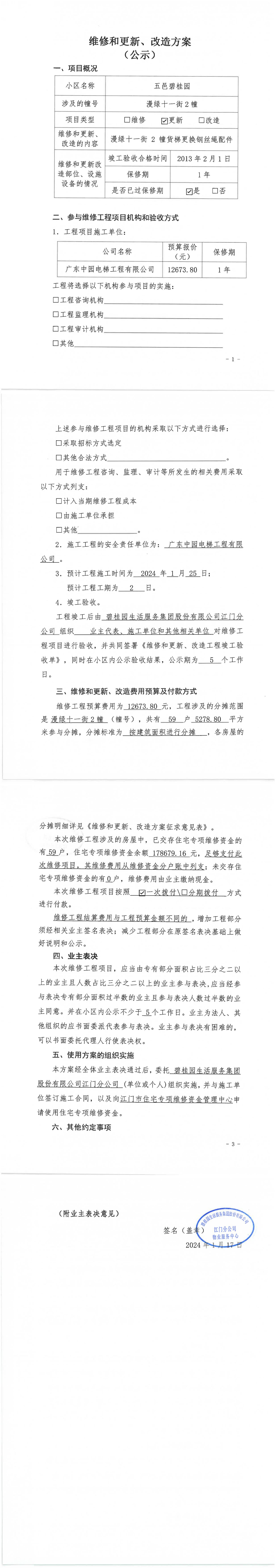 <td VALIGN="top" VALUES="" STYLE="border-width:0" BINDTYPE="0" ROWSPAN="19" COLSPAN="7" DATASOURCE="投票结果" ><font style="font-size:14pt;"><p style="white-space: normal; font-family: 宋体; line-height: 1.75em;">五邑碧桂园蓬江区五邑碧桂园漫绿十一街2幢全体业主:</p><p style="white-space: normal; font-family: 宋体; line-height: 1.75em; text-indent: 2em;">本小区关于五邑碧桂园漫绿十一街2幢货梯更换钢丝绳配件使用维修资金的投票的投票已表决结束,询异时间从2024年03月05日开始,投票询异公示期间,业主可通过微信查询自己的表决情况或可凭身份证件申请查询自己的表决情况;如公示的业主表决情况与查询的本人表决意见不一致的,可以以书面形式向投票组织机构申诉,投票组织机构予以纠正并重新公示表决结果。异议提出人对投票组织机构的处理仍有异议的,可以向街道办事处(镇人民政府)反映处理,涉及住宅专项维修资金的,可向属地住宅专项维修资金管理中心反映处理。</p><p style="white-space: normal;"><br/></p><p style="white-space: normal; font-family: 宋体; line-height: 1.75em;"><strong>附件:</strong></p><p style="white-space: normal; font-family: 宋体; line-height: 1.75em;"><strong>一、投票范围</strong></p><p style="white-space: normal; font-family: 宋体; line-height: 1.75em; text-indent: 2em;">五邑碧桂园蓬江区五邑碧桂园漫绿十一街2幢</p><p style="white-space: normal; font-family: 宋体; line-height: 1.75em; text-indent: 2em;">总人数(专有部分人数之和):59</p><p style="white-space: normal; font-family: 宋体; line-height: 1.75em; text-indent: 2em;"><span style="font-family: 宋体, SimSun;"><span style="font-family: 宋体; text-indent: 32px;"><span style="font-family: 宋体; text-indent: 32px;">总户数:59</span></span></span></p><p style="white-space: normal; font-family: 宋体; line-height: 1.75em; text-indent: 2em;">建筑物总面积(专有部分面积之和):5278.80㎡</p><p style="white-space: normal; font-family: 宋体; line-height: 1.75em;"><strong>二、询异公示起止时间</strong></p><p dir="ltr" style="white-space: normal; font-family: 宋体; line-height: 1.75em; text-indent: 2em;"><span style="text-indent: 36px;">2024年03月05日至2024年03月11日</span></p><p style="white-space: normal; font-family: 宋体; line-height: 1.75em;"><strong>三、投票详细描述</strong></p><p style="white-space: normal; font-family: 宋体; line-height: 1.75em; text-indent: 2em;"><p> 五邑碧桂园漫绿十一期苑区十一街2幢的货梯进行日常维保期间,电梯维保公司发现货梯的钢丝绳断股,并且油泥出现较为严重,需更换钢丝绳。<br/> 现对漫绿十一街2幢货梯进行维修,工程维修预算金额为12673.80元,项目最终费用以施工合同签订金额为准。因需使用专项维修资金进行维修,维修费用由相关业主按建筑面积分摊,详见公示附件。如业主手机不能正常通过微信投票,请联系物业公司进行线下纸质投票,物业电话:0750-3289000/管家苏锦源电话:18022982991</p></p><p style="white-space: normal; font-family: 宋体; line-height: 1.75em;"><strong>四、计票规则</strong></p><p style="white-space: normal; font-family: 宋体; line-height: 1.75em; text-indent: 2em;">表决事项:使用建筑物及其附属设施的维修资金<br /><p style='text-align: left; font-family: 宋体; font-size: 16px; line-height: 1.75em; text-indent: 2em;'>计票规则:弃权票不并入其它项 未表决票不并入其它项</p></p><p style="white-space: normal; font-family: 宋体; line-height: 1.75em;"><strong>五、通过规则</strong></p><p style="white-space: normal; font-family: 宋体; line-height: 1.75em;"><strong><strong style="white-space: normal;"><span style="font-family: 宋体, SimSun;"> 根据《中华人民共和国民法典》第二百七十八条规定:业主共同决定事项,应当由专有部分面积占比三分之二以上的业主且人数占比三分之二以上的业主参与表决。</span></strong></strong></p><p style="white-space: normal; font-family: 宋体; line-height: 1.75em; text-indent: 2em;">表决事项:使用建筑物及其附属设施的维修资金<br /><p style='text-align: left; font-family: 宋体; font-size: 16px; line-height: 1.75em; text-indent: 2em;'>通过规则:双2/3以上参与表决,参与表决双过半同意</p></p><p style="white-space: normal; font-family: 宋体; line-height: 1.75em;"><strong>六、投票结果</strong></p><p style="white-space: normal; font-family: 宋体; line-height: 1.75em; text-indent: 2em;"><div id='resultTable'><table style='table-layout: fixed; font-size:12px; margin-top:10px' width='100%' border='0' cellspacing='0' cellpadding='0'><tr><td height='28' colspan='10' align='center' style='border: 1px solid #666'><strong style='font-size: 14px;'> 使用建筑物及其附属设施的维修资金</strong></td> </tr><tr id='trfirst'><td height='28' colspan='4' style='border-left: 1px solid #666; border-bottom: 1px solid #666'><strong> 申报单位:</strong> 碧桂园生活服务集团股份有限公司江门分公司</td><td colspan='3' style='border-left: 1px solid #666; border-bottom: 1px solid #666'><strong> 联系方式:</strong> </td><td colspan='3' style='border-left: 1px solid #666; border-bottom: 1px solid #666; border-right: 1px solid #666'><strong> 申报日期:</strong> 2024年1月17日 </td></tr><tr> <td height='28' colspan='5' style='border-left: 1px solid #666; border-bottom: 1px solid #666'><strong> 总人数(专有部分人数之和):</strong>59人 </td><td colspan='5' style='border-left: 1px solid #666; border-bottom: 1px solid #666; border-right: 1px solid #666'><strong> 建筑物总面积(专有部分面积之和):</strong>5278.80㎡ </td> </tr><tr><td height='28' colspan='10' bgcolor='#F3F3F3' style='border-left: 1px solid #666;border-bottom: 1px solid #666;