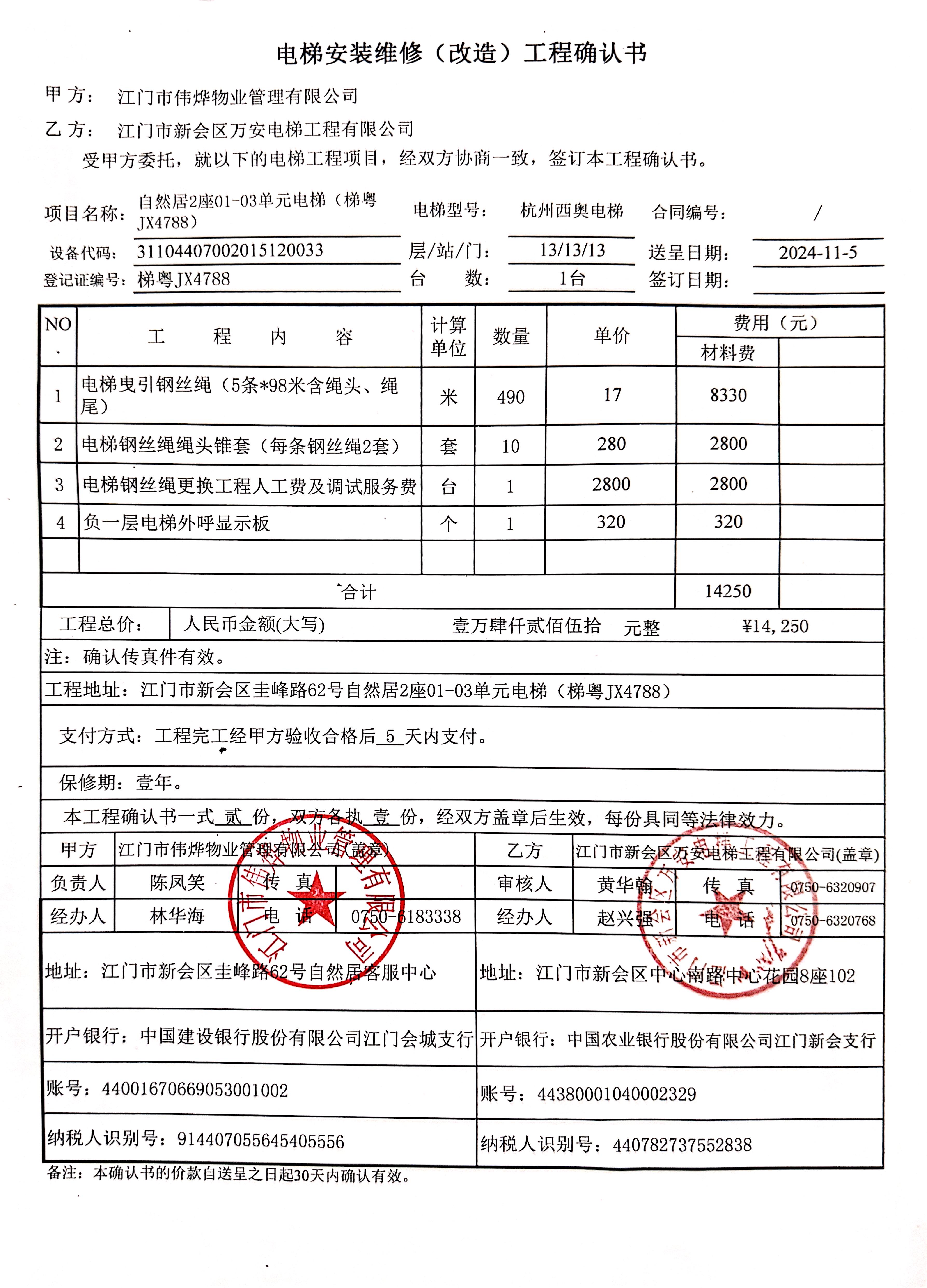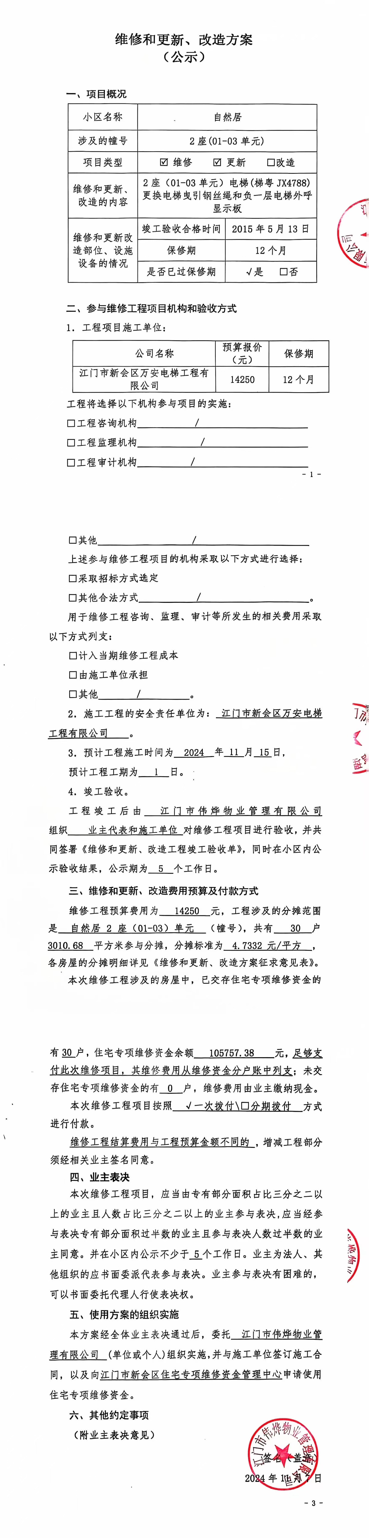 <td VALIGN="top" VALUES="" STYLE="border-width:0" BINDTYPE="0" ROWSPAN="19" COLSPAN="7" DATASOURCE="投票结果" ><font style="font-size:14pt;"><p style="white-space: normal; font-family: 宋体; line-height: 1.75em;">自然居自然居2座全体业主:</p><p style="white-space: normal; font-family: 宋体; line-height: 1.75em; text-indent: 2em;">本小区关于自然居2座01-03单元电梯(梯粤JX4788)更换曳引钢丝绳和负一层电梯外呼显示板使用维修资金的投票的投票已表决结束,询异时间从2024年11月11日开始,投票询异公示期间,业主可通过微信查询自己的表决情况或可凭身份证件申请查询自己的表决情况;如公示的业主表决情况与查询的本人表决意见不一致的,可以以书面形式向投票组织机构申诉,投票组织机构予以纠正并重新公示表决结果。异议提出人对投票组织机构的处理仍有异议的,可以向街道办事处(镇人民政府)反映处理,涉及住宅专项维修资金的,可向属地住宅专项维修资金管理中心反映处理。</p><p style="white-space: normal;"><br/></p><p style="white-space: normal; font-family: 宋体; line-height: 1.75em;"><strong>附件:</strong></p><p style="white-space: normal; font-family: 宋体; line-height: 1.75em;"><strong>一、投票范围</strong></p><p style="white-space: normal; font-family: 宋体; line-height: 1.75em; text-indent: 2em;">自然居自然居2座</p><p style="white-space: normal; font-family: 宋体; line-height: 1.75em; text-indent: 2em;">总人数(专有部分人数之和):30</p><p style="white-space: normal; font-family: 宋体; line-height: 1.75em; text-indent: 2em;"><span style="font-family: 宋体, SimSun;"><span style="font-family: 宋体; text-indent: 32px;"><span style="font-family: 宋体; text-indent: 32px;">总户数:30</span></span></span></p><p style="white-space: normal; font-family: 宋体; line-height: 1.75em; text-indent: 2em;">建筑物总面积(专有部分面积之和):3010.68㎡</p><p style="white-space: normal; font-family: 宋体; line-height: 1.75em;"><strong>二、询异公示起止时间</strong></p><p dir="ltr" style="white-space: normal; font-family: 宋体; line-height: 1.75em; text-indent: 2em;"><span style="text-indent: 36px;">2024年11月11日至2024年11月21日</span></p><p style="white-space: normal; font-family: 宋体; line-height: 1.75em;"><strong>三、投票详细描述</strong></p><p style="white-space: normal; font-family: 宋体; line-height: 1.75em; text-indent: 2em;"><p><span style="font-family: 宋体; font-size: 14px; text-wrap: wrap; background-color: rgb(255, 255, 255);"> </span><span style="font-family: 宋体; font-size: 14px; text-wrap: wrap; background-color: rgb(255, 255, 255);"> 自然居2座01-03单元(梯粤JX4788)电梯日常运行时出现异响,负一层电梯外呼显示板老化故障,将会影响正常使用,已无法修复,经检查,是由于电梯曳引钢丝绳有断股现象,<span style="font-family: 宋体; font-size: 14px; text-wrap: wrap; background-color: rgb(255, 255, 255);">存在安全隐患</span>导致不能运行。</span></p><p><span style="font-family: 宋体; font-size: 14px; text-wrap: wrap; background-color: rgb(255, 255, 255);"> 现对2座01-03单元电梯曳引钢丝绳和负一层外呼显示板进行更换维修,工程维修预算金额为14250元,项目最终费用以施工合同签订金额为准。因已过保修期,维修费用由相关业主按建筑面积分摊,每平方约4.7332 元/平方。详见公示附件。如业主手机不能正常通过微信投票,请联系物业公司进行线下纸质投票,物业电话:0750-6183338</span></p><p><br/></p></p><p style="white-space: normal; font-family: 宋体; line-height: 1.75em;"><strong>四、计票规则</strong></p><p style="white-space: normal; font-family: 宋体; line-height: 1.75em; text-indent: 2em;">表决事项:使用建筑物及其附属设施的维修资金<br /><p style='text-align: left; font-family: 宋体; font-size: 16px; line-height: 1.75em; text-indent: 2em;'>计票规则:弃权票不并入其它项 未表决票不并入其它项</p></p><p style="white-space: normal; font-family: 宋体; line-height: 1.75em;"><strong>五、通过规则</strong></p><p style="white-space: normal; font-family: 宋体; line-height: 1.75em;"><strong><strong style="white-space: normal;"><span style="font-family: 宋体, SimSun;"> 根据《中华人民共和国民法典》第二百七十八条规定:业主共同决定事项,应当由专有部分面积占比三分之二以上的业主且人数占比三分之二以上的业主参与表决。</span></strong></strong></p><p style="white-space: normal; font-family: 宋体; line-height: 1.75em; text-indent: 2em;">表决事项:使用建筑物及其附属设施的维修资金<br /><p style='text-align: left; font-family: 宋体; font-size: 16px; line-height: 1.75em; text-indent: 2em;'>通过规则:双2/3以上参与表决,参与表决双过半同意</p></p><p style="white-space: normal; font-family: 宋体; line-height: 1.75em;"><strong>六、投票结果</strong></p><p style="white-space: normal; font-family: 宋体; line-height: 1.75em; text-indent: 2em;"><div id='resultTable'><table style='table-layout: fixed; font-size:12px; margin-top:10px' width='100%' border='0' cellspacing='0' cellpadding='0'><tr><td height='28' colspan='10' align='center' style='border: 1px solid #666'><strong style='font-size: 14px;'> 使用建筑物及其附属设施的维修资金</strong></td> </tr><tr id='trfirst'><td height='28' colspan='4' style='border-left: 1px solid #666; border-bottom: 1px solid #666'><strong> 申报单位:</strong> 江门市伟烨物业管理有限公司</td><td colspan='3' style='border-left: 1px solid #666; border-bottom: 1px solid #666'><strong> 联系方式:</strong> 0750-6123828 </td><td colspan='3' style='border-left: 1px solid #666; border-bottom: 1px solid #666; border-right: 1px solid #666'><strong> 申报日期:</stro