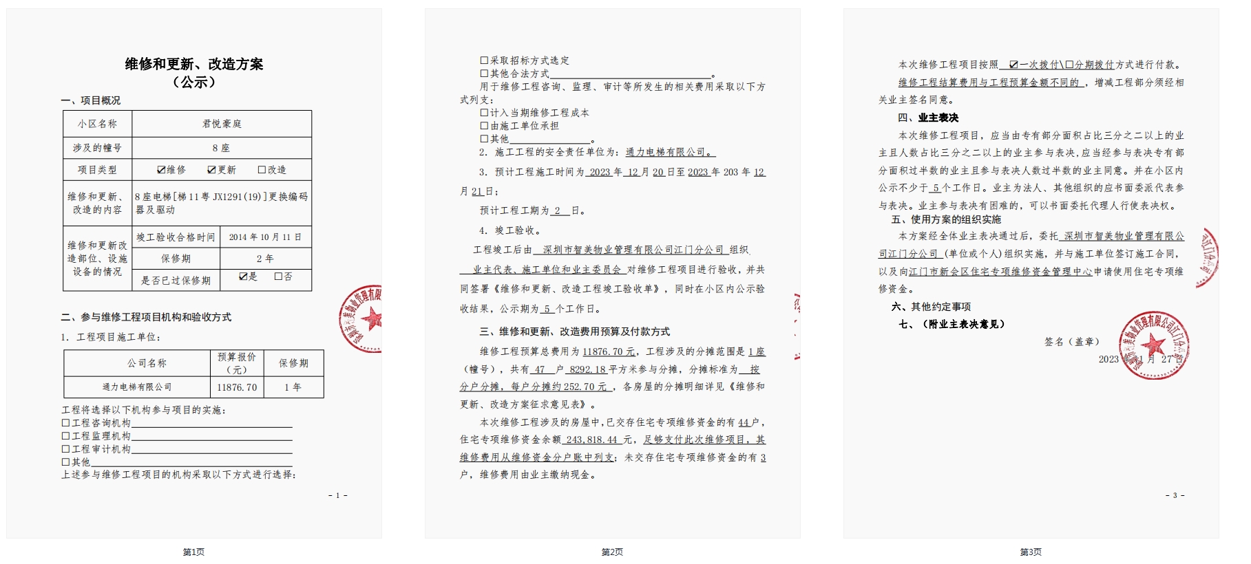 <td VALIGN="top" VALUES="" STYLE="border-width:0" BINDTYPE="0" ROWSPAN="19" COLSPAN="7" DATASOURCE="投票结果" ><font style="font-size:14pt;"><p style="white-space: normal; font-family: 宋体; line-height: 1.75em;">君悦豪庭君悦豪庭8座全体业主:</p><p style="white-space: normal; font-family: 宋体; line-height: 1.75em; text-indent: 2em;">本小区关于君悦豪庭8座电梯[梯11粤JX1291(19)]更换编码器及驱动使用维修资金的投票的投票已表决结束,询异时间从2023年12月09日开始,投票询异公示期间,业主可通过微信查询自己的表决情况或可凭身份证件申请查询自己的表决情况;如公示的业主表决情况与查询的本人表决意见不一致的,可以以书面形式向投票组织机构申诉,投票组织机构予以纠正并重新公示表决结果。异议提出人对投票组织机构的处理仍有异议的,可以向街道办事处(镇人民政府)反映处理,涉及住宅专项维修资金的,可向属地住宅专项维修资金管理中心反映处理。</p><p style="white-space: normal;"><br/></p><p style="white-space: normal; font-family: 宋体; line-height: 1.75em;"><strong>附件:</strong></p><p style="white-space: normal; font-family: 宋体; line-height: 1.75em;"><strong>一、投票范围</strong></p><p style="white-space: normal; font-family: 宋体; line-height: 1.75em; text-indent: 2em;">君悦豪庭君悦豪庭8座</p><p style="white-space: normal; font-family: 宋体; line-height: 1.75em; text-indent: 2em;">总人数(专有部分人数之和):47</p><p style="white-space: normal; font-family: 宋体; line-height: 1.75em; text-indent: 2em;"><span style="font-family: 宋体, SimSun;">总户数:47</span></p><p style="white-space: normal; font-family: 宋体; line-height: 1.75em; text-indent: 2em;">建筑物总面积(专有部分面积之和):8292.18㎡</p><p style="white-space: normal; font-family: 宋体; line-height: 1.75em;"><strong>二、询异公示起止时间</strong></p><p dir="ltr" style="white-space: normal; font-family: 宋体; line-height: 1.75em; text-indent: 2em;"><span style="text-indent: 36px;">2023年12月09日至2023年12月15日</span></p><p style="white-space: normal; font-family: 宋体; line-height: 1.75em;"><strong>三、投票详细描述</strong></p><p style="white-space: normal; font-family: 宋体; line-height: 1.75em; text-indent: 2em;"><p>本小区8座电梯[梯11粤JX1291(19)]故障停梯,经检查为编码器和驱动损坏,电梯已过保修期。现需申请使用维修资紧对本小区8座电梯[梯11粤JX1291(19)]编码器及驱动进行更新维修,工程维修预算金额为11876.70 元,项目最终费用以施工合同签订金额为准。维修费用的分摊标准为按分户分摊,楼栋共47户,每户分摊约252.70元,详见公示附件。物业服务热线:0750-6677009,管家号码: 18128218709。</p></p><p style="white-space: normal; font-family: 宋体; line-height: 1.75em;"><strong>四、计票规则</strong></p><p style="white-space: normal; font-family: 宋体; line-height: 1.75em; text-indent: 2em;">表决事项:使用建筑物及其附属设施的维修资金<br /><p style='text-align: left; font-family: 宋体; font-size: 16px; line-height: 1.75em; text-indent: 2em;'>计票规则:弃权票不并入其它项 未表决票不并入其它项</p></p><p style="white-space: normal; font-family: 宋体; line-height: 1.75em;"><strong>五、通过规则</strong></p><p style="white-space: normal; font-family: 宋体; line-height: 1.75em;"><strong><strong style="white-space: normal;"><span style="font-family: 宋体, SimSun;">&nbsp; 根据《中华人民共和国民法典》第二百七十八条规定:业主共同决定事项,应当由专有部分面积占比三分之二以上的业主且人数占比三分之二以上的业主参与表决。</span></strong></strong></p><p style="white-space: normal; font-family: 宋体; line-height: 1.75em; text-indent: 2em;">表决事项:使用建筑物及其附属设施的维修资金<br /><p style='text-align: left; font-family: 宋体; font-size: 16px; line-height: 1.75em; text-indent: 2em;'>通过规则:参与表决专有部分面积过半数的业主且参与表决人数过半数的业主同意</p></p><p style="white-space: normal; font-family: 宋体; line-height: 1.75em;"><strong>六、投票结果</strong></p><p style="white-space: normal; font-family: 宋体; line-height: 1.75em; text-indent: 2em;"><div id='resultTable'><table style='table-layout: fixed; font-size:12px; margin-top:10px' width='100%' border='0' cellspacing='0' cellpadding='0'><tr><td height='28' colspan='10' align='center' style='border: 1px solid #666'><strong style='font-size: 14px;'> 使用建筑物及其附属设施的维修资金</strong></td> </tr><tr id='trfirst'><td height='28' colspan='4' style='border-left: 1px solid #666; border-bottom: 1px solid #666'><strong> 申报单位:</strong> 深圳市智美物业管理有限公司江门分公司</td><td colspan='3' style='border-left: 1px solid #666; border-bottom: 1px solid #666'><strong> 联系方式:</strong> </td><td colspan='3' style='border-left: 1px solid #666; border-bottom: 1px solid #666; border-right: 1px solid #666'><strong> 申报日期:</strong> 2023年11月26日 </td></tr><tr> <td height='28' colspan='5' style='border-left: 1px solid #666; border-bottom: 1px solid #666'><strong> 总人数(专有部分人数之和):</strong>47人 </td><td colspan='5' style='border-left: 1px solid #666; border-bottom: 1px solid #666; border-right: 1px solid #666'><strong> 建筑物总面积(专有部分面积之和):</strong>8292.18㎡ </td> </tr><tr><td height='28' colspan='10' bgcolor='#F3F3F3' style='border-left: 1px solid #666;border-bottom: 1px solid #666;border-right: 1px solid #666'><strong> 参与人数及面积统计</strong></td></tr><tr><td height='28' colspan='5' style='border-left: 1px solid #666; border-bottom: 1px solid #666'><strong> 参与表决专有部分人数之和:</strong>34人