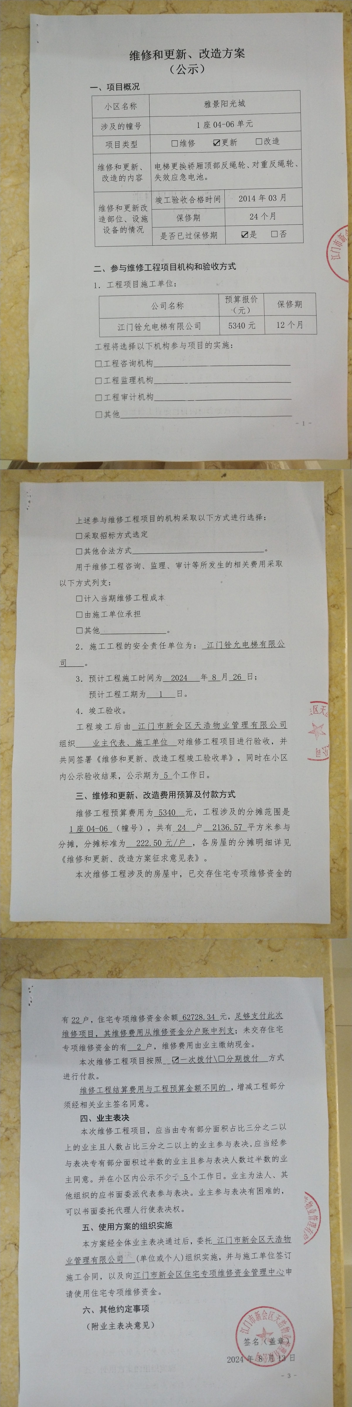 <td VALIGN="top" VALUES="" STYLE="border-width:0" BINDTYPE="0" ROWSPAN="17" COLSPAN="7" DATASOURCE="投票结果" ><font style=" font-family:方正小标宋简体;font-size:14pt;"><p style="line-height: 1.75em;"><span style="font-family: 宋体, SimSun;">各位尊敬的业主:</span><br/></p><p style="text-indent: 2em; line-height: 1.75em;"><span style="font-family: 宋体, SimSun;">根据法律法规的规定,本小区业主利用“江门市物业事项表决管理系统”已对本小区公共事务决策事项进行了表决,在经过7日的询异公示期后,未收到业主有效的异议。现将投票结果公告,并就产生的法律效力说明如下:</span></p><p style="line-height: 1.75em; text-indent: 0em;"><strong style="text-indent: 2em;"><span style="font-family: 宋体, SimSun;">一、投票范围</span></strong></p><p style="text-indent: 2em; line-height: 1.75em;"><span style="font-family: 宋体, SimSun;">雅景阳光城1座</span></p><p style="text-indent: 2em; line-height: 1.75em;"><span style="font-family: 宋体, SimSun;">总人数(专有部分人数之和):24</span></p><p style="text-indent: 2em; line-height: 1.75em;"><span style="font-family: 宋体, SimSun;"><span style="font-family: 宋体, SimSun; text-indent: 32px;"><span style="font-family: 宋体; text-indent: 32px;"><span style="font-family: 宋体; text-indent: 32px;">总户数:24</span></span></span></span></p><p style="text-indent: 2em; line-height: 1.75em;"><span style="font-family: 宋体, SimSun;">建筑物总面积(专有部分面积之和):2136.57㎡</span></p><p style="line-height: 1.75em;"><strong><span style="font-family: 宋体, SimSun;">二、投票结果公告时间</span></strong></p><p style="text-indent: 2em; line-height: 1.75em;"><span style="font-family: 宋体, SimSun;"><span style="font-family: 宋体, SimSun; text-indent: 32px;">从2024年08月28日开始</span></span></p><p style="line-height: 1.75em;"><strong><span style="font-family: 宋体, SimSun;">三、计票规则</span></strong></p><p style="text-indent: 2em; line-height: 1.75em;"><span style="font-family: 宋体, SimSun;">表决事项:使用建筑物及其附属设施的维修资金<br /><p style='font-family: 宋体, SimSun;line-height: 1.75em; text-indent: 2em;'>计票规则:弃权票不并入其它项&nbsp;&nbsp;&nbsp;&nbsp;未表决票不并入其它项</p></span></p><p style="line-height: 1.75em;"><strong><span style="font-family: 宋体, SimSun;">四、通过规则</span></strong></p><p style="line-height: 1.75em;"><strong><span style="font-family: 宋体, SimSun;">&nbsp; 根据《中华人民共和国民法典》第二百七十八条规定:业主共同决定事项,应当由专有部分面积占比三分之二以上的业主且人数占比三分之二以上的业主参与表决。</span></strong></p><p style="text-indent: 2em; line-height: 1.75em;"><span style="font-family: 宋体, SimSun;"><span style="font-family: 宋体, SimSun; text-indent: 32px;">表决事项:使用建筑物及其附属设施的维修资金<br /><p style='font-family: 宋体, SimSun;line-height: 1.75em; text-indent: 2em;'>通过规则:双2/3以上参与表决,参与表决双过半同意</p></span></span></p><p style="line-height: 1.75em;"><strong><span style="font-family: 宋体, SimSun;">五、投票结果</span></strong></p><p style="line-height: 1.75em; text-indent: 2em;"><span style="font-family: 宋体, SimSun; text-indent: 2em;"><div id='resultTable'><table style='table-layout: fixed; font-size:12px; margin-top:10px' width='100%' border='0' cellspacing='0' cellpadding='0'><tr><td height='28' colspan='10' align='center' style='border: 1px solid #666'><strong style='font-size: 14px;'> 使用建筑物及其附属设施的维修资金</strong></td> </tr><tr id='trfirst'><td height='28' colspan='4' style='border-left: 1px solid #666; border-bottom: 1px solid #666'><strong>&nbsp;申报单位:</strong> 江门市新会区天浩物业管理有限公司</td><td colspan='3' style='border-left: 1px solid #666; border-bottom: 1px solid #666'><strong>&nbsp;联系方式:</strong> </td><td colspan='3' style='border-left: 1px solid #666; border-bottom: 1px solid #666; border-right: 1px solid #666'><strong>&nbsp;申报日期:</strong> 2024年8月15日 </td></tr><tr> <td height='28' colspan='5' style='border-left: 1px solid #666; border-bottom: 1px solid #666'><strong>&nbsp;总人数(专有部分人数之和):</strong>24人 </td><td colspan='5' style='border-left: 1px solid #666; border-bottom: 1px solid #666; border-right: 1px solid #666'><strong>&nbsp;建筑物总面积(专有部分面积之和):</strong>2136.57㎡ </td> </tr><tr><td height='28' colspan='10' bgcolor='#F3F3F3' style='border-left: 1px solid #666;border-bottom: 1px solid #666;border-right: 1px solid #666'><strong>&nbsp;参与表决人数及面积统计</strong></td></tr><tr><td height='28' colspan='5' style='border-left: 1px solid #666; border-bottom: 1px solid #666'><strong>&nbsp;参与表决人数:</strong>17人</td><td colspan='5' style='border-left: 1px solid #666; border-bottom: 1px solid #666; border-right: 1px solid #666'><strong>&nbsp;参与表决人数占总人数比例:</strong>70.83%</td></tr><tr><td height='28' colspan='5' style='border-left: 1px solid #666; border-bottom: 1px solid #666'><strong>&nbsp;参与表决面积:</strong>1516.50㎡</td><td colspan='5' style='border-left: 1px solid #666; border-bottom: 1px solid #666; border-right: 1px solid #666'><strong>&nbsp;参与表决面积占总面积比例:</strong>70.98%</td></tr><tr><td height='28' colspan='10' bgcolor='#F3F3F3' style='border-left: 1px solid #666; border-bottom: 1px solid #666;border-right: 1px solid #666'> <strong>&nbsp;参与表决同意人数及面积统计</strong></td> </tr><tr><td height='28' colspan='5' style='border-left: 1px solid #666; border-bottom: 1px solid #666'><strong>&nbsp;参与表决同意人数:</strong>17人 </td><td colspan='5' style='border-left: 1px solid #666; border-bottom: 1px solid #666; 