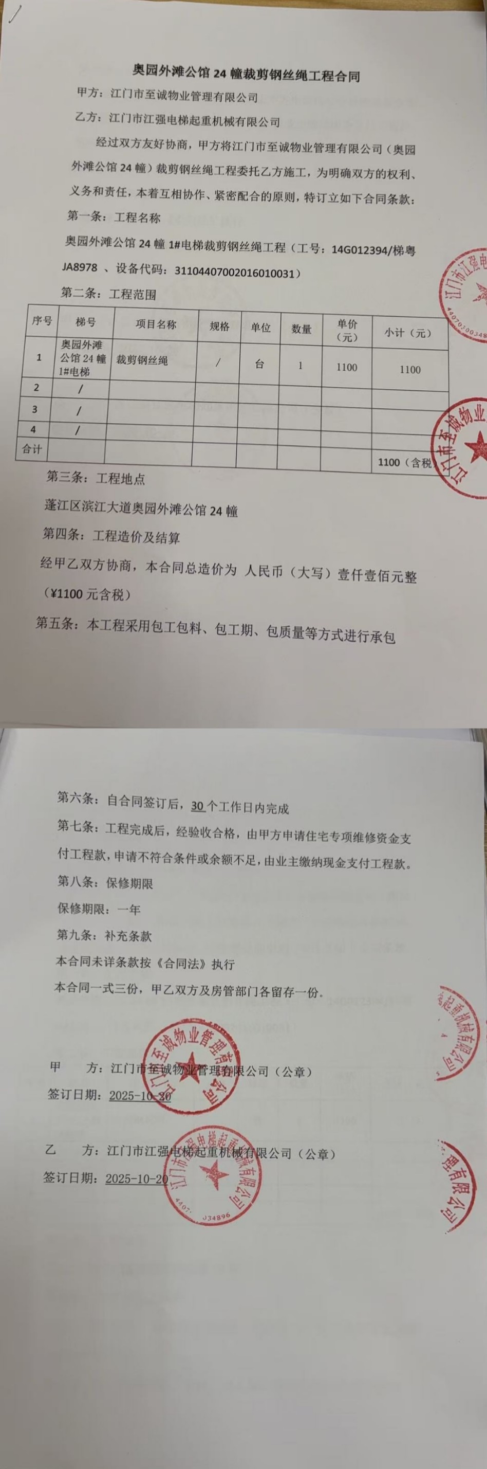 <td VALIGN="top" VALUES="" STYLE="border-width:0" BINDTYPE="0" ROWSPAN="19" COLSPAN="7" DATASOURCE="投票结果" ><font style="font-size:14pt;"><p style="white-space: normal; font-family: 宋体; line-height: 1.75em;">奥园外滩公馆蓬江区棠下镇奥园外滩公馆24幢全体业主:</p><p style="white-space: normal; font-family: 宋体; line-height: 1.75em; text-indent: 2em;">本小区关于奥园外滩公馆24幢1#电梯裁剪钢丝绳使用维修资金的投票的投票已表决结束,询异时间从2025年12月03日开始,投票询异公示期间,业主可通过微信查询自己的表决情况或可凭身份证件申请查询自己的表决情况;如公示的业主表决情况与查询的本人表决意见不一致的,可以以书面形式向投票组织机构申诉,投票组织机构予以纠正并重新公示表决结果。异议提出人对投票组织机构的处理仍有异议的,可以向街道办事处(镇人民政府)反映处理,涉及住宅专项维修资金的,可向属地住宅专项维修资金管理中心反映处理。</p><p style="white-space: normal;"><br/></p><p style="white-space: normal; font-family: 宋体; line-height: 1.75em;"><strong>附件:</strong></p><p style="white-space: normal; font-family: 宋体; line-height: 1.75em;"><strong>一、投票范围</strong></p><p style="white-space: normal; font-family: 宋体; line-height: 1.75em; text-indent: 2em;">奥园外滩公馆蓬江区棠下镇奥园外滩公馆24幢</p><p style="white-space: normal; font-family: 宋体; line-height: 1.75em; text-indent: 2em;">总人数(专有部分人数之和):122</p><p style="white-space: normal; font-family: 宋体; line-height: 1.75em; text-indent: 2em;"><span style="font-family: 宋体, SimSun;"><span style="font-family: 宋体; text-indent: 32px;"><span style="font-family: 宋体; text-indent: 32px;">总户数:123</span></span></span></p><p style="white-space: normal; font-family: 宋体; line-height: 1.75em; text-indent: 2em;">建筑物总面积(专有部分面积之和):11691.75㎡</p><p style="white-space: normal; font-family: 宋体; line-height: 1.75em;"><strong>二、询异公示起止时间</strong></p><p dir="ltr" style="white-space: normal; font-family: 宋体; line-height: 1.75em; text-indent: 2em;"><span style="text-indent: 36px;">2025年12月03日至2025年12月13日</span></p><p style="white-space: normal; font-family: 宋体; line-height: 1.75em;"><strong>三、投票详细描述</strong></p><p style="white-space: normal; font-family: 宋体; line-height: 1.75em; text-indent: 2em;"><p>小区24幢的电梯日常维保期间,维保发现1#电梯限速器钢丝绳老化,钢丝绳拉长严重,因使用时间较长,不能正常运行。</p><p> 现对24幢1#电梯进行维修,工程维修预算金额为1100元,项目最终费用以施工合同签订金额为准。因已过保修期,维修费用由相关业主按建筑面积分摊,每平方约0.094元,详见公示附件。如业主手机不能正常通过微信投票,请联系物业公司进行线下纸质投票,物业电话:0750-3851968。</p><p><br/></p></p><p style="white-space: normal; font-family: 宋体; line-height: 1.75em;"><strong>四、计票规则</strong></p><p style="white-space: normal; font-family: 宋体; line-height: 1.75em; text-indent: 2em;">表决事项:使用建筑物及其附属设施的维修资金<br /><p style='text-align: left; font-family: 宋体; font-size: 16px; line-height: 1.75em; text-indent: 2em;'>计票规则:弃权票不并入其它项 未表决票不并入其它项</p></p><p style="white-space: normal; font-family: 宋体; line-height: 1.75em;"><strong>五、通过规则</strong></p><p style="white-space: normal; font-family: 宋体; line-height: 1.75em;"><strong><strong style="white-space: normal;"><span style="font-family: 宋体, SimSun;"> 根据《中华人民共和国民法典》第二百七十八条规定:业主共同决定事项,应当由专有部分面积占比三分之二以上的业主且人数占比三分之二以上的业主参与表决。</span></strong></strong></p><p style="white-space: normal; font-family: 宋体; line-height: 1.75em; text-indent: 2em;">表决事项:使用建筑物及其附属设施的维修资金<br /><p style='text-align: left; font-family: 宋体; font-size: 16px; line-height: 1.75em; text-indent: 2em;'>通过规则:双2/3以上参与表决,参与表决双过半同意</p></p><p style="white-space: normal; font-family: 宋体; line-height: 1.75em;"><strong>六、投票结果</strong></p><p style="white-space: normal; font-family: 宋体; line-height: 1.75em; text-indent: 2em;"><div id='resultTable'><table style='table-layout: fixed; font-size:12px; margin-top:10px' width='100%' border='0' cellspacing='0' cellpadding='0'><tr><td height='28' colspan='10' align='center' style='border: 1px solid #666'><strong style='font-size: 14px;'> 使用建筑物及其附属设施的维修资金</strong></td> </tr><tr id='trfirst'><td height='28' colspan='4' style='border-left: 1px solid #666; border-bottom: 1px solid #666'><strong> 申报单位:</strong> 江门市至诚物业管理有限公司</td><td colspan='3' style='border-left: 1px solid #666; border-bottom: 1px solid #666'><strong> 联系方式:</strong> 3851968 </td><td colspan='3' style='border-left: 1px solid #666; border-bottom: 1px solid #666; border-right: 1px solid #666'><strong> 申报日期:</strong> 2025年10月24日 </td></tr><tr> <td height='28' colspan='5' style='border-left: 1px solid #666; border-bottom: 1px solid #666'><strong> 总人数(专有部分人数之和):</strong>122人 </td><td colspan='5' style='border-left: 1px solid #666; border-bottom: 1px solid #666; border-right: 1px solid #666'><strong> 建筑物总面积(专有部分面积之和):</strong>11691.75㎡ </td> </tr><tr><td height='28' colspan='10' bgcolor='#F3F3F3' style='border-left: 1px solid #666;border-bottom: 1px solid #666;border-right: 1px solid #666'><strong> 参与人数及面积统计</strong></td></tr><tr><td