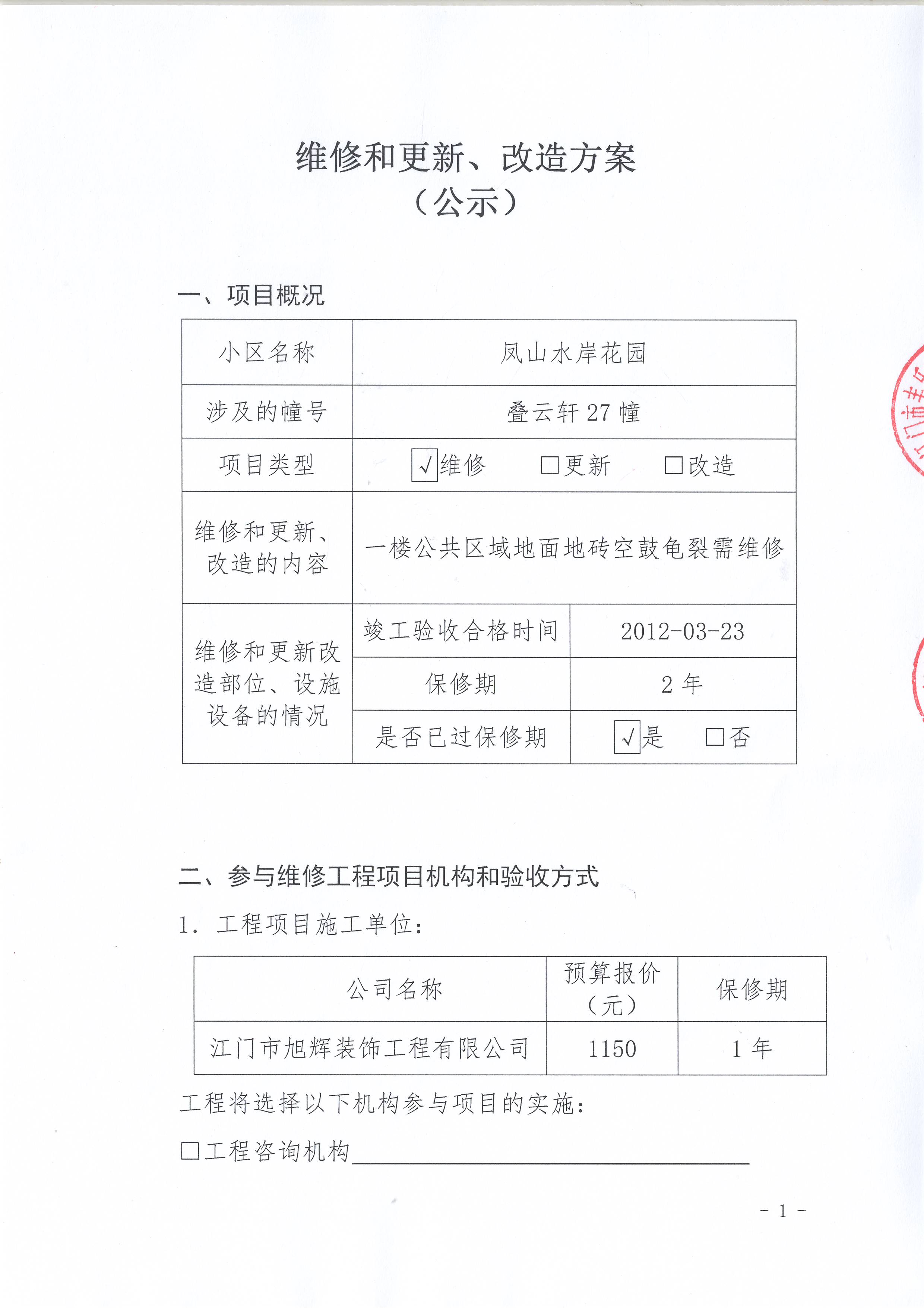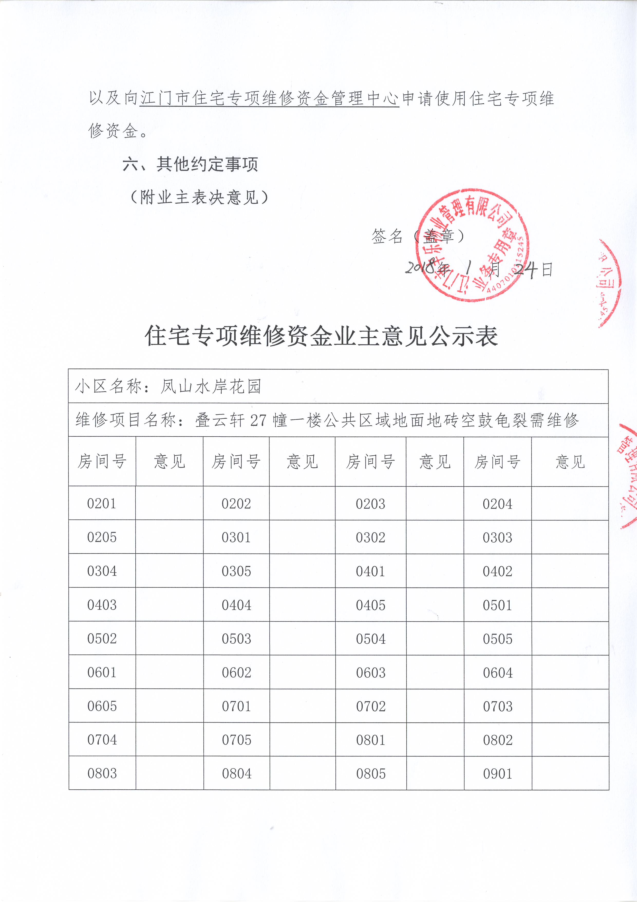 <span style="font-family: 宋体;"> 本小区关于凤山水岸花园叠云轩27幢一楼公共区域地面地砖空鼓龟裂需维修的投票<span style="font-family: 宋体; font-size: 16px;">已表决结束</span>,</span><span style="font-family: 宋体;">询异时间从2018年02月12日开始,投票询异公示期间,业主可进行以下操作:</span></p><p style="text-align: left; line-height: 1.75em; font-family: 宋体; font-size: 16px;"><span style="font-family: 宋体;"></span></p><p style="text-align: left;"><span style="font-family: 宋体;"> </span><span style="font-family: 宋体;"> </span>一、查询表决情况</p><p style="text-align: left;"><span style="font-family: 宋体;"> </span><span style="font-family: 宋体;"> </span>业主可通过微信服务平台、或江门市物业管理公众服务平台(网址:wygl.jmzjj.gov.cn/)登录查询自己的表决情况。如需到管理部门查询的,投票事项属于“决定维修资金使用、管理、续筹方案”的,业主可凭身份证件到所属维修资金管理中心查询;非涉及维修资金的投票事项,业主可凭身份证件到所属区住建部门、或街道办事处(镇人民政府)、居(村)民委员会申请查询自己的表决情况。</p><p style="text-align: left;"><span style="font-family: 宋体;"> </span><span style="font-family: 宋体;"> </span>二、申诉变更投票表决意见</p><p style="text-align: left;"><span style="font-family: 宋体;"> </span><span style="font-family: 宋体;"> </span>如业主意见与查询到的表决意见不一致的,投票事项属于“决定维修资金使用、管理、续筹方案”的,业主可以书面形式向所属维修资金管理中心申诉;非涉及维修资金的投票事项,业主可以书面形式向所属区住建部门、或街道办事处(镇人民政府)、居(村)民委员会申诉。经核查业主反映情况属实的,予以纠正并重新公示表决结果。</p><p style="text-align: left; line-height: 1.75em; font-family: 宋体; font-size: 16px;"><span style="font-family: sans-serif;"> </span></p><p style="text-align: left; line-height: 1.75em; font-family: 宋体; font-size: 16px;"><strong><span style="font-family: 宋体;">附件:</span></strong></p><p style="text-align: left; line-height: 1.75em; font-family: 宋体; font-size: 16px;"><strong>一、投票范围</strong></p><p style="text-align: left; line-height: 1.75em; font-family: 宋体; font-size: 16px;"> 凤山水岸花园叠云轩27幢<br/>