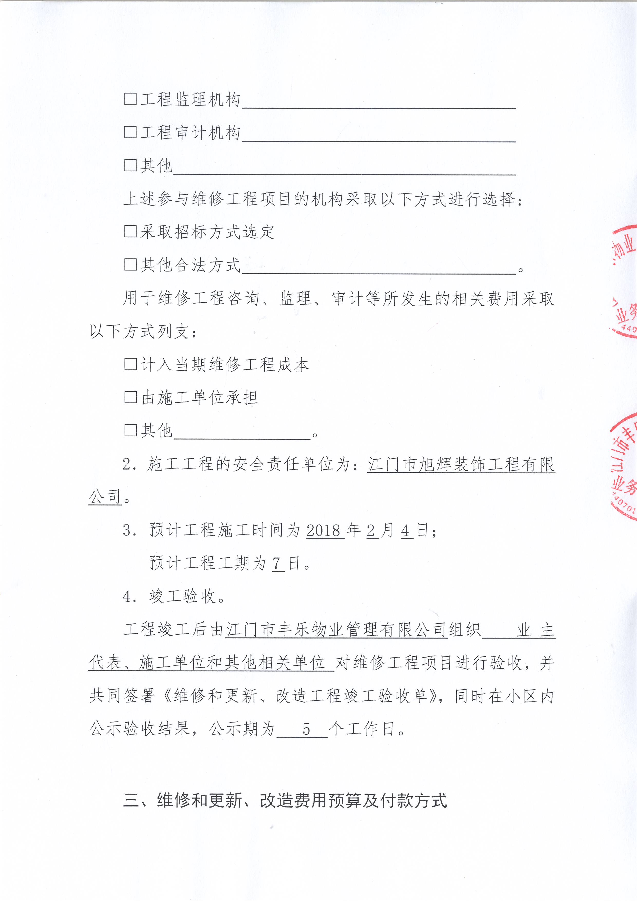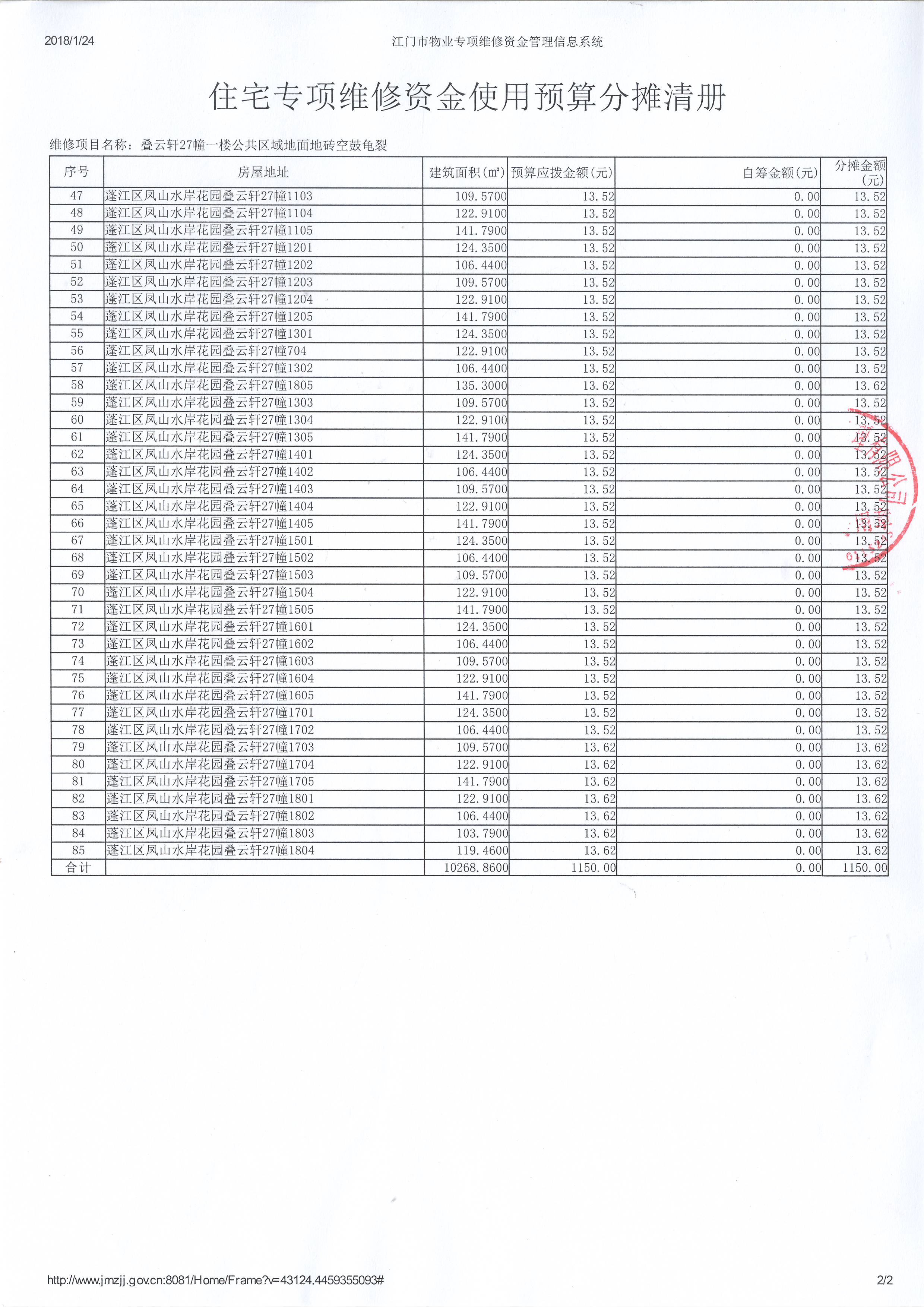 投票结果通知公告时间:从2018年02月19日开始<br/></p><p style="text-align: left; line-height: 1.75em; font-family: 宋体; font-size: 16px;"><strong>三、投票详细描述</strong> </p><p style="text-align: left; line-height: 1.75em; font-family: 宋体; font-size: 16px;"><span style="line-height: 28px; font-family: 宋体;"> </span><p><span style="font-family: "Helvetica Neue", Helvetica, Arial, sans-serif; font-size: 14px; background-color: rgb(255, 255, 255);">本小区叠云轩27幢一楼公共区域地面地砖空鼓龟裂需维修,已过保修期。</span><br style="font-family: "Helvetica Neue", Helvetica, Arial, sans-serif; font-size: 14px; white-space: normal; background-color: rgb(255, 255, 255);"/><span style="font-family: "Helvetica Neue", Helvetica, Arial, sans-serif; font-size: 14px; background-color: rgb(255, 255, 255);">现需申请使用维修资金对<span style="font-family: "Helvetica Neue", Helvetica, Arial, sans-serif; font-size: 14px; background-color: rgb(255, 255, 255);">叠云轩27幢一楼公共区域空鼓龟裂的地面地砖进行</span>维修,工程维修预算金额为1150元,项目最终费用以施工合同签订金额为准。维修费用的分摊标准为每户13.52元,详见附件。</span></p></p><p style="text-align: left; line-height: 1.75em; font-family: 宋体; font-size: 16px;"><strong>四、投票结果</strong> </p><p style="text-align: left; line-height: 1.75em; font-family: 宋体; font-size: 16px;"><table style='table-layout: fixed; font-size:12px; margin-top:10px' width='100%' border='0' cellspacing='0' cellpadding='0'><tr><td height='28' colspan='10' align='center' style='border: 1px solid #666'><strong style='font-size: 14px;'> 叠云轩27幢一楼公共区域地面地砖空鼓龟裂需维修</strong></td> </tr><tr><td height='28' colspan='4' style='border-left: 1px solid #666; border-bottom: 1px solid #666'><strong> 申报单位:</strong> 江门市丰乐物业管理有限公司</td><td colspan='3' style='border-left: 1px solid #666; border-bottom: 1px solid #666'><strong> 联系方式:</strong> 13512344321 </td><td colspan='3' style='border-left: 1px solid #666; border-bottom: 1px solid #666; border-right: 1px solid #666'><strong> 申报日期:</strong> 2018年1月24日 </td></tr><tr> <td height='28' colspan='5' style='border-left: 1px solid #666; border-bottom: 1px solid #666'><strong> 总人数(专有部分人数之和):</strong>85人 </td><td colspan='5' style='border-left: 1px solid #666; border-bottom: 1px solid #666; border-right: 1px solid #666'><strong> 建筑物总面积(专有部分面积之和):</strong>10268.86㎡ </td> </tr><tr><td height='28' colspan='10' bgcolor='#F3F3F3' style='border-left: 1px solid #666;border-bottom: 1px solid #666;border-right: 1px solid #666'><strong> 参与人数及面积统计</strong></td></tr><tr><td height='28' colspan='5' style='border-left: 1px solid #666; border-bottom: 1px solid #666'><strong> 参与表决专有部分人数之和:</strong>13人</td><td colspan='5' style='border-left: 1px solid #666; border-bottom: 1px solid #666; border-right: 1px solid #666'><strong> 参与表决占有表决权总人数比例:</strong>15.29%</td></tr><tr><td height='28' colspan='5' style='border-left: 1px solid #666; border-bottom: 1px solid #666'><strong> 参与表决专有部分面积之和:</strong>1505.42㎡</td><td colspan='5' style='border-left: 1px solid #666; border-bottom: 1px solid #666; border-right: 1px solid #666'><strong> 参与表决占有表决权总面积比例:</strong>14.66%</td></tr><tr><td height='28' colspan='10' bgcolor='#F3F3F3' style='border-left: 1px solid #666; border-bottom: 1px solid #666;border-right: 1px solid #666'> <strong> 未参与人数及面积统计</strong></td> </tr><tr><td height='28' colspan='5' style='border-left: 1px solid #666; border-bottom: 1px solid #666'><strong> 未参与表决专有部分人数之和:</strong>72人 </td><td colspan='5' style='border-left: 1px solid #666; border-bottom: 1px solid #666; border-right: 1px solid #666'><strong> 未参与表决占有表决权总人数比例:</strong>84.71%</td></tr><tr><td height='28' colspan='5' style='border-left: 1px solid #666; border-bottom: 1px solid #666'><strong> 未参与表决专有部分面积之和:</strong>8763.44㎡</td><td colspan='5' style='border-left: 1px solid #666; border-bottom: 1px solid #666; border-right: 1px solid #666'><strong> 未参与表决占有表决权总面积比例:</strong>85.34% </td> </tr><tr><td width='6%' rowspan='2' align='center' bgcolor='#F3F3F3' style='border-left: 1px solid #666; border-bottom: 1px solid #666'><strong>序号</strong></td><td width='11%' rowspan='2' align='center' bgcolor='#F3F3F3' style='border-left: 1px solid #666; border-bottom: 1px solid #666'><strong>候选项</strong></td><td height='28' colspan='2' align='center' bgcolor='#F3F3F3' style='border-left: 1px solid #666; border-bottom: 1px solid #666'><strong>表决人数情况</strong> </td><td colspan='2' align='center' bgcolor='#F3F3F3' style='border-left: 1px solid #666; border-bottom: 1px solid #666'><strong>表决面积情况</strong></td><td colspan='4' align='center' bgcolor='#F3F3F3' style='border-left: 1px solid #666; border-bottom: 1px solid #666; border-right: 1px solid #666'><strong>表决方式</strong></td></tr><tr><td width='11%' height='28' align='center' bgcolor='#F3F3F3' style='border-left: 1px solid #666;border-bottom: 1px solid #666'><strong>参与表决<br />专有部分<br />人数之和</strong> </td><td width='11%' align='center' bgcolor='#F3F3F3' style='border-left: 1px solid #666; border-bottom: 1px solid #666'><strong>占有<br /> 表决权<br /> 总人数比例<br /> </strong></td><td width='11%' align='center' bgcolor='#F3F3F3' style='border-left: 1px solid #666; border-bottom: 1px solid #666'><strong>参与表决<br /> 专有部分<br /> 面积之和<br /> </strong></td><td width='13%' align='center' bgcolor='#F3F3F3' style='border-left: 1px solid #666; bo