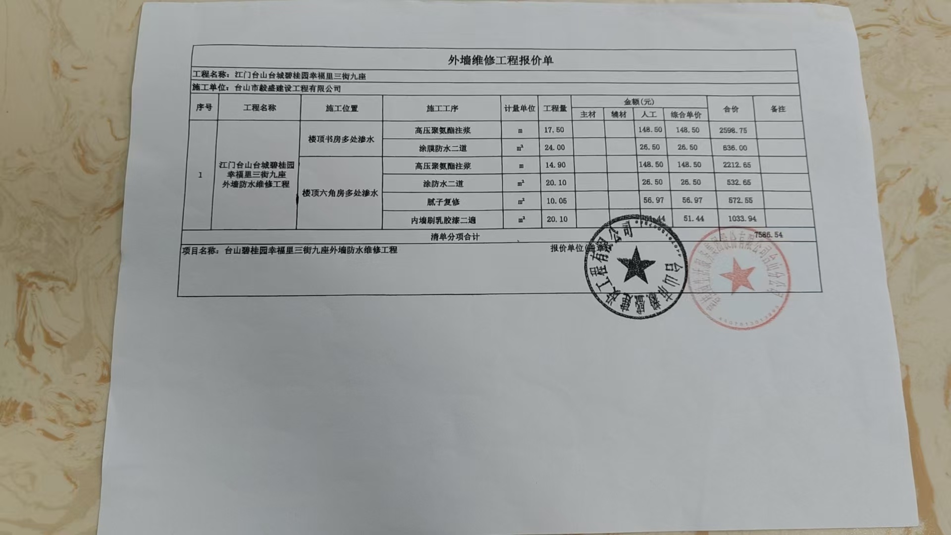 <td VALIGN="top" VALUES="" STYLE="border-width:0" BINDTYPE="0" ROWSPAN="19" COLSPAN="7" DATASOURCE="投票结果" ><font style="font-size:14pt;"><p style="white-space: normal; font-family: 宋体; line-height: 1.75em;">台山碧桂园台山碧桂园幸福里6号楼全体业主:</p><p style="white-space: normal; font-family: 宋体; line-height: 1.75em; text-indent: 2em;">本小区关于碧桂园幸福里三街9座01户型外墙防水维修的使用维修资金表决的投票已表决结束,询异时间从2025年09月16日开始,投票询异公示期间,业主可通过微信查询自己的表决情况或可凭身份证件申请查询自己的表决情况;如公示的业主表决情况与查询的本人表决意见不一致的,可以以书面形式向投票组织机构申诉,投票组织机构予以纠正并重新公示表决结果。异议提出人对投票组织机构的处理仍有异议的,可以向街道办事处(镇人民政府)反映处理,涉及住宅专项维修资金的,可向属地住宅专项维修资金管理中心反映处理。</p><p style="white-space: normal;"><br/></p><p style="white-space: normal; font-family: 宋体; line-height: 1.75em;"><strong>附件:</strong></p><p style="white-space: normal; font-family: 宋体; line-height: 1.75em;"><strong>一、投票范围</strong></p><p style="white-space: normal; font-family: 宋体; line-height: 1.75em; text-indent: 2em;">台山碧桂园台山碧桂园幸福里6号楼</p><p style="white-space: normal; font-family: 宋体; line-height: 1.75em; text-indent: 2em;">总人数(专有部分人数之和):14</p><p style="white-space: normal; font-family: 宋体; line-height: 1.75em; text-indent: 2em;"><span style="font-family: 宋体, SimSun;"><span style="font-family: 宋体; text-indent: 32px;"><span style="font-family: 宋体; text-indent: 32px;">总户数:14</span></span></span></p><p style="white-space: normal; font-family: 宋体; line-height: 1.75em; text-indent: 2em;">建筑物总面积(专有部分面积之和):2048.08㎡</p><p style="white-space: normal; font-family: 宋体; line-height: 1.75em;"><strong>二、询异公示起止时间</strong></p><p dir="ltr" style="white-space: normal; font-family: 宋体; line-height: 1.75em; text-indent: 2em;"><span style="text-indent: 36px;">2025年09月16日至2025年09月26日</span></p><p style="white-space: normal; font-family: 宋体; line-height: 1.75em;"><strong>三、投票详细描述</strong></p><p style="white-space: normal; font-family: 宋体; line-height: 1.75em; text-indent: 2em;"><p>幸福里3街9座1401房的业主在2024年3月发现房间的墙身和地板都出现渗水情况,地板基本全部烂掉,经专业师傅上门检查发现是房间外面的花坛还有旁边的墙体有裂缝故雨水渗入墙身导致的,目前维修方案是需在外墙修补墙身裂缝涂抹防水材料。</p><p><font face="宋体"><span style="font-size: 14px; background-color: rgb(255, 255, 255);">现对01户型外墙进行维修,工程预算金额为7586.54元,项目<span style="font-size: 14px; text-wrap-mode: wrap; background-color: rgb(255, 255, 255); font-family: 宋体;">最终费用以施工合同签订金额为准。因已过保修期,维修费用由相关业主按</span><span style="font-size: 14px; text-wrap-mode: wrap; font-family: 宋体; background: rgb(255, 255, 0);">建筑面积</span><span style="font-size: 14px; text-wrap-mode: wrap; background-color: rgb(255, 255, 255); font-family: 宋体;">分摊,</span><span style="font-size: 14px; text-wrap-mode: wrap; font-family: 宋体; background: rgb(255, 255, 0);">每平方约<span style="font-family: Calibri;">3.70</span>元</span><span style="font-size: 14px; text-wrap-mode: wrap; background-color: rgb(255, 255, 255); font-family: 宋体;">,<span style="font-size: 14px; text-wrap-mode: wrap; background-color: rgb(255, 255, 255); font-family: 宋体;">详见公示附件。如业主手机不能正常通过微信投票,请联系物业公司进行线下纸质投票,物业电话</span><span style="font-size: 14px; text-wrap-mode: wrap; font-family: 宋体; background: rgb(255, 255, 0);">:<span style="font-family: Calibri;">0750-5688135</span></span><span style="font-size: 14px; text-wrap-mode: wrap; background-color: rgb(255, 255, 255); font-family: 宋体;">。</span></span></span></font></p></p><p style="white-space: normal; font-family: 宋体; line-height: 1.75em;"><strong>四、计票规则</strong></p><p style="white-space: normal; font-family: 宋体; line-height: 1.75em; text-indent: 2em;">表决事项:使用建筑物及其附属设施的维修资金<br /><p style='text-align: left; font-family: 宋体; font-size: 16px; line-height: 1.75em; text-indent: 2em;'>计票规则:弃权票不并入其它项 未表决票不并入其它项</p></p><p style="white-space: normal; font-family: 宋体; line-height: 1.75em;"><strong>五、通过规则</strong></p><p style="white-space: normal; font-family: 宋体; line-height: 1.75em;"><strong><strong style="white-space: normal;"><span style="font-family: 宋体, SimSun;"> 根据《中华人民共和国民法典》第二百七十八条规定:业主共同决定事项,应当由专有部分面积占比三分之二以上的业主且人数占比三分之二以上的业主参与表决。</span></strong></strong></p><p style="white-space: normal; font-family: 宋体; line-height: 1.75em; text-indent: 2em;">表决事项:使用建筑物及其附属设施的维修资金<br /><p style='text-align: left; font-family: 宋体; font-size: 16px; line-height: 1.75em; text-indent: 2em;'>通过规则:双2/3以上参与表决,参与表决双过半同意</p></p><p style="white-space: normal; font-family: 宋体; line-height: 1.75em;"><strong>六、投票结果</strong></p><p style="white-space: normal; font-family: 宋体; line-height: 1.75em; text-indent: 2em;"><div id='resultTable'><table style='table-layout: fixed; font-size:12px; margin-top:10px' width='100%' border='0' cellspacing='0' cellpadding='0